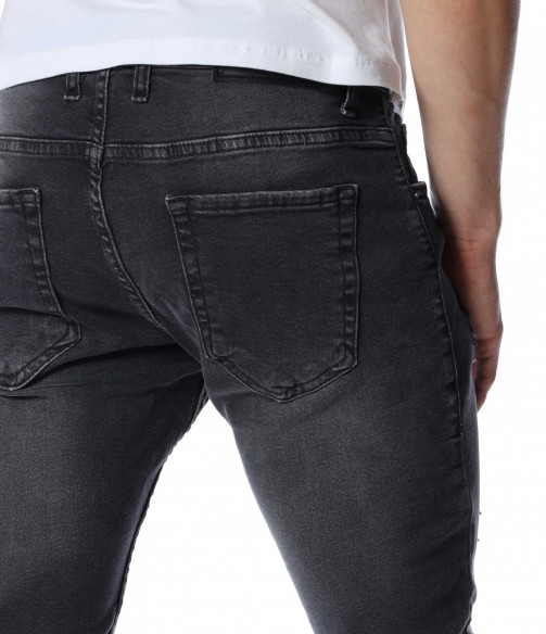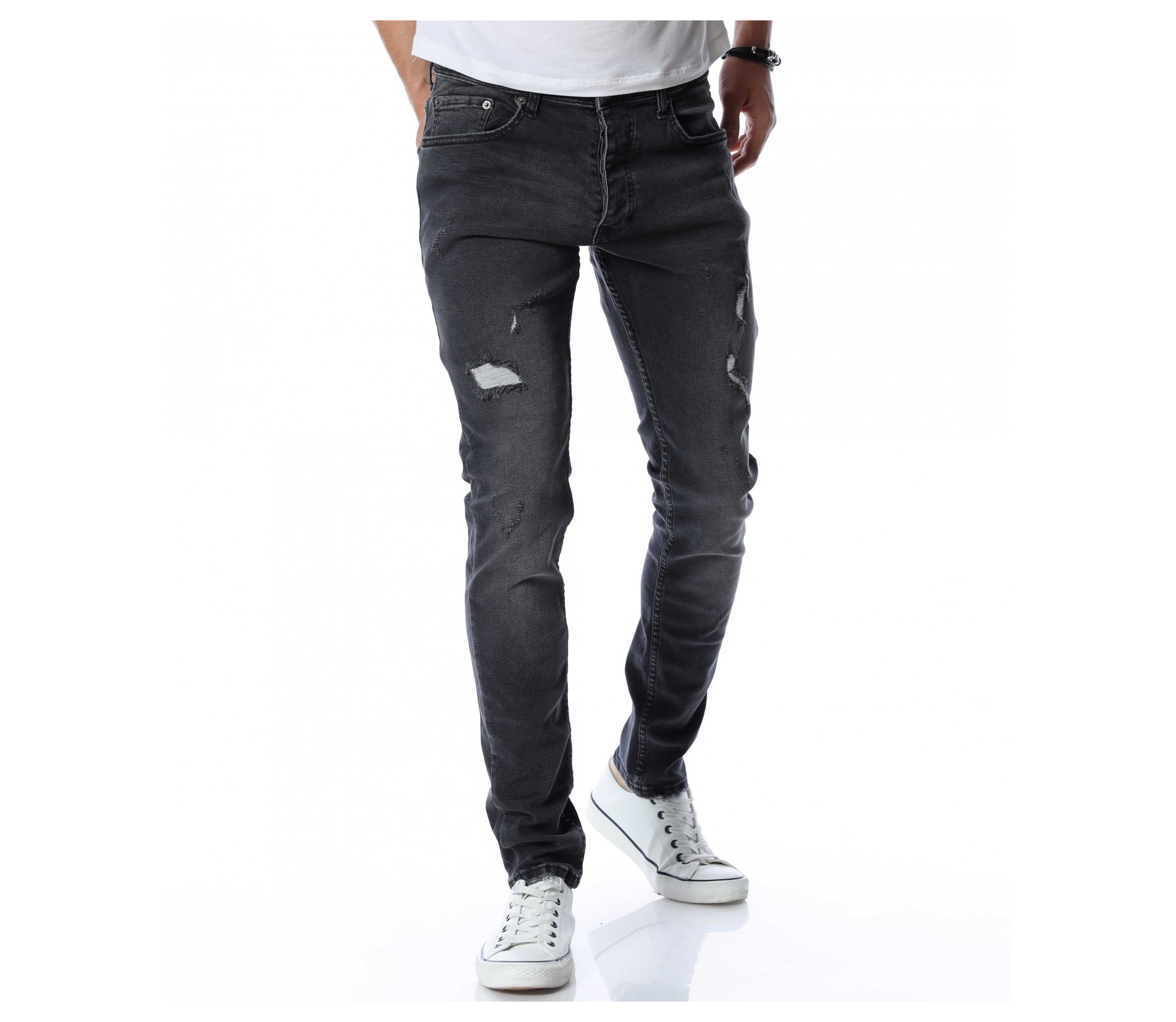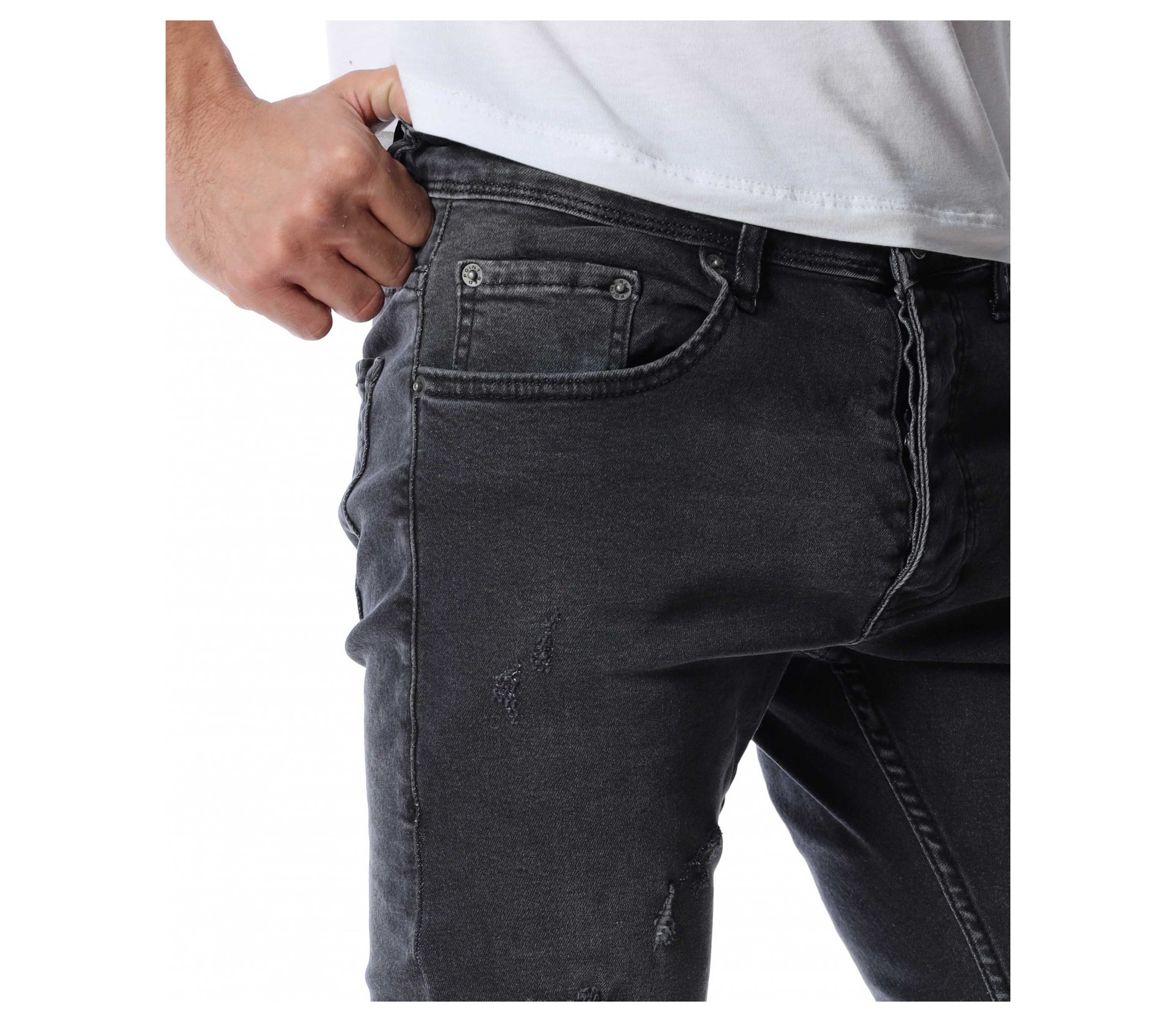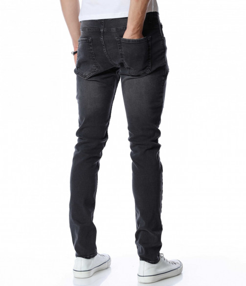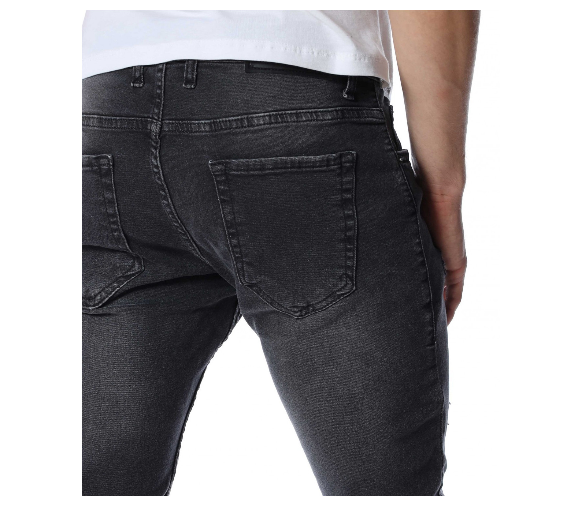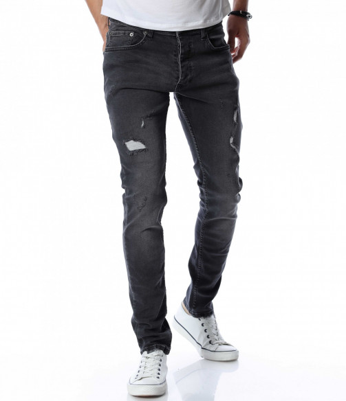 Мъжки, дълъг, сив дънков панталон с кройка във вариант slimfit, който следва линиите на тялото. Моделът акцентира с кръпки с бели нишки по цялата част и леко надрани ефекти. Забелязваме стандартните, отворени джобове, както в предната, така и в задната част. Закопчаването се състои в цип и копче, а на талията са разположени гайки, към които може да добавите колан. Комбинирайте с блуза и кецове.