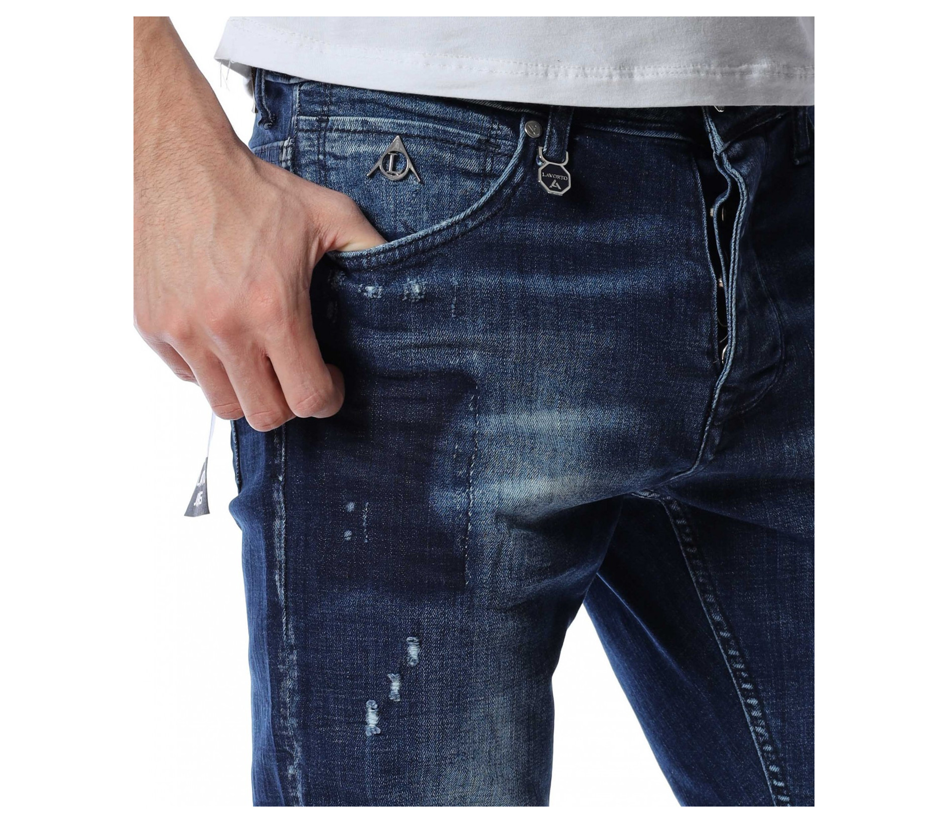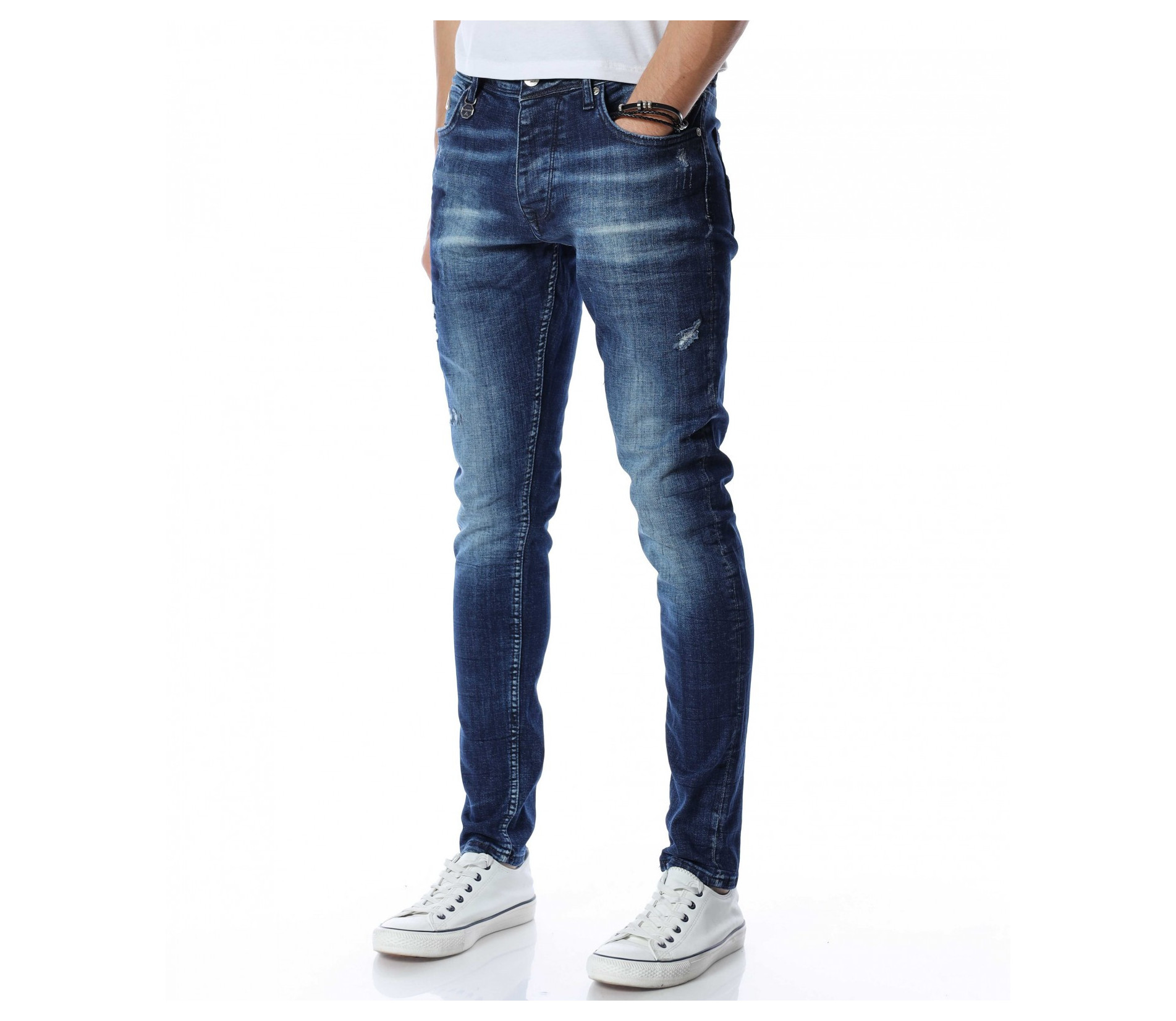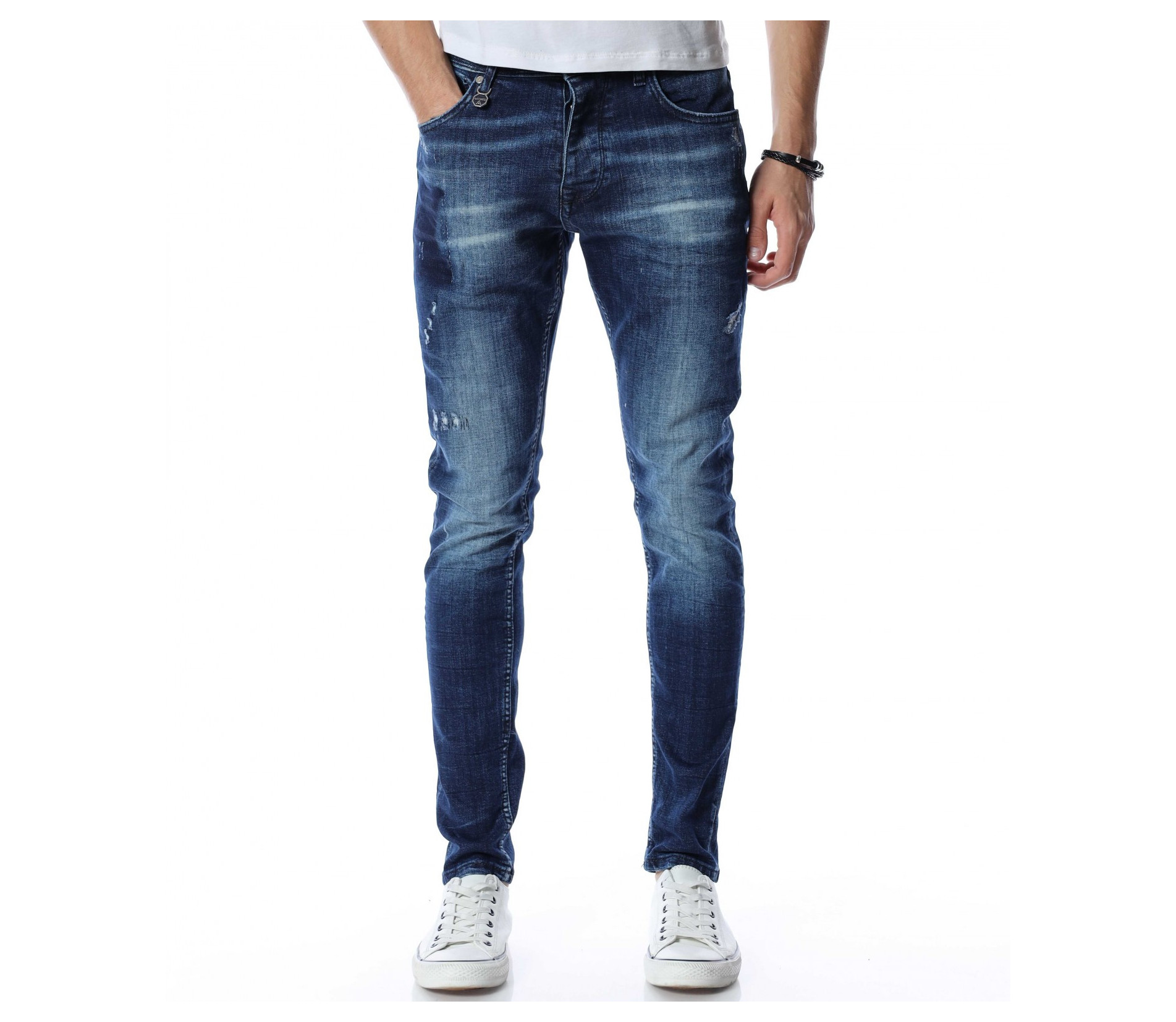 Мъжки, дълъг, син дънков панталон във slim fit вариант и кройка, която осигурява достатъчна свобода на движение и комфорт на тялото. Дизайнът е поверен на силно изсветлени мотиви и небрежно надрани мотиви отпред. Закопчаването е разпределено в четири метални копчета, а на талията са разположени гайки, към които да добавите колан, ако желаете. Джобовете са стандартни в предната и в задната част. Комбинирайте с блуза и кецове и създайте вашият завършен аутфит.