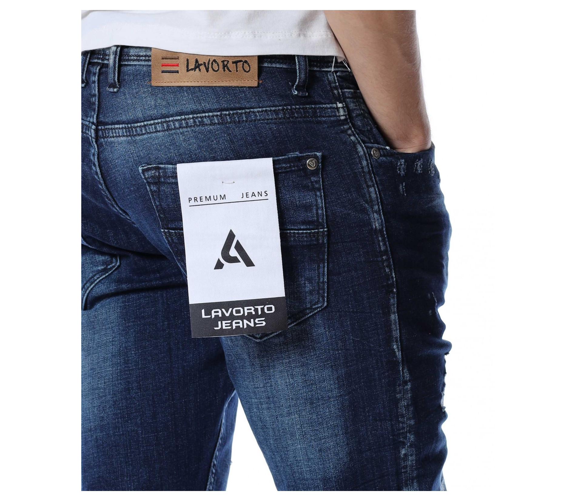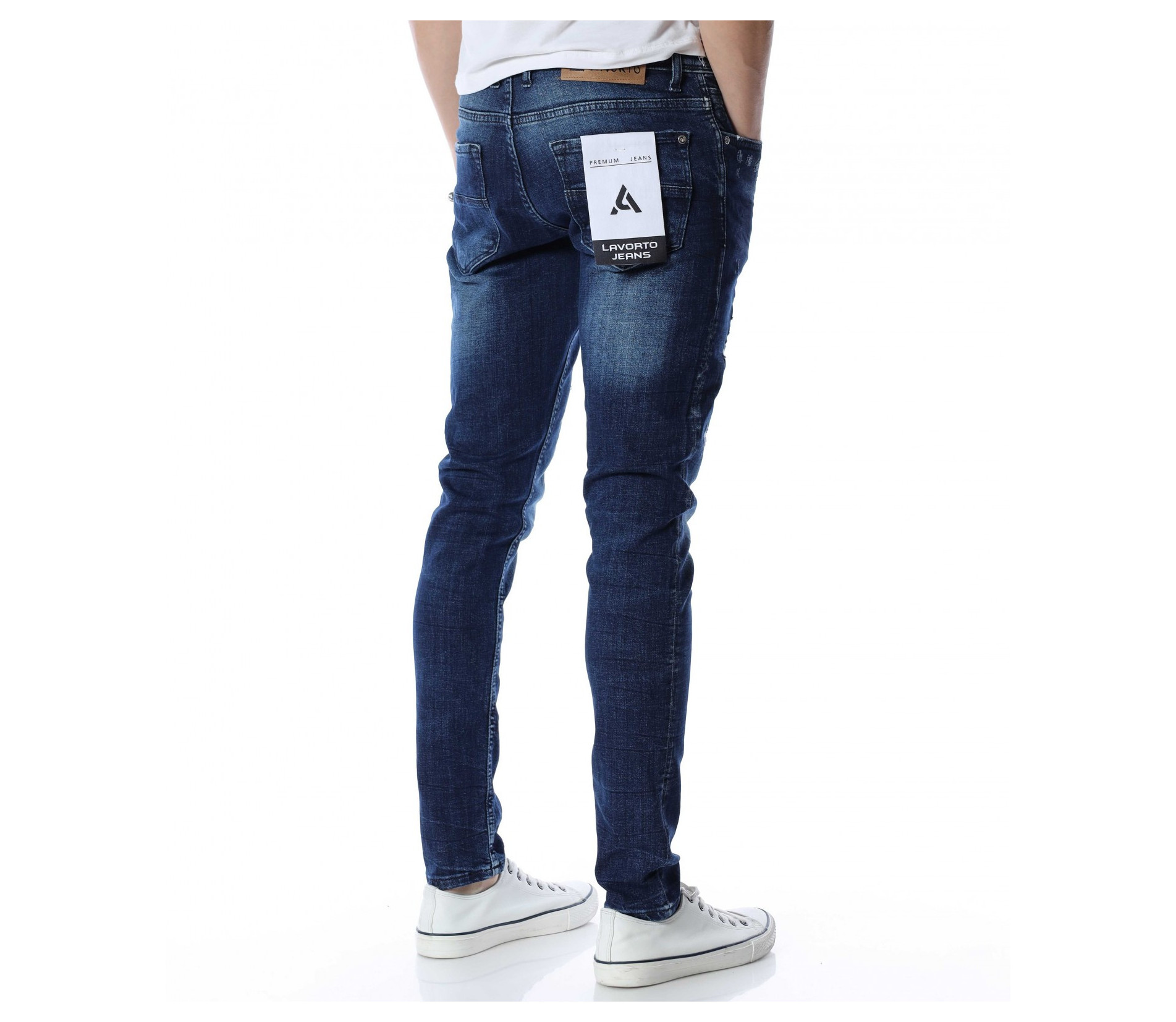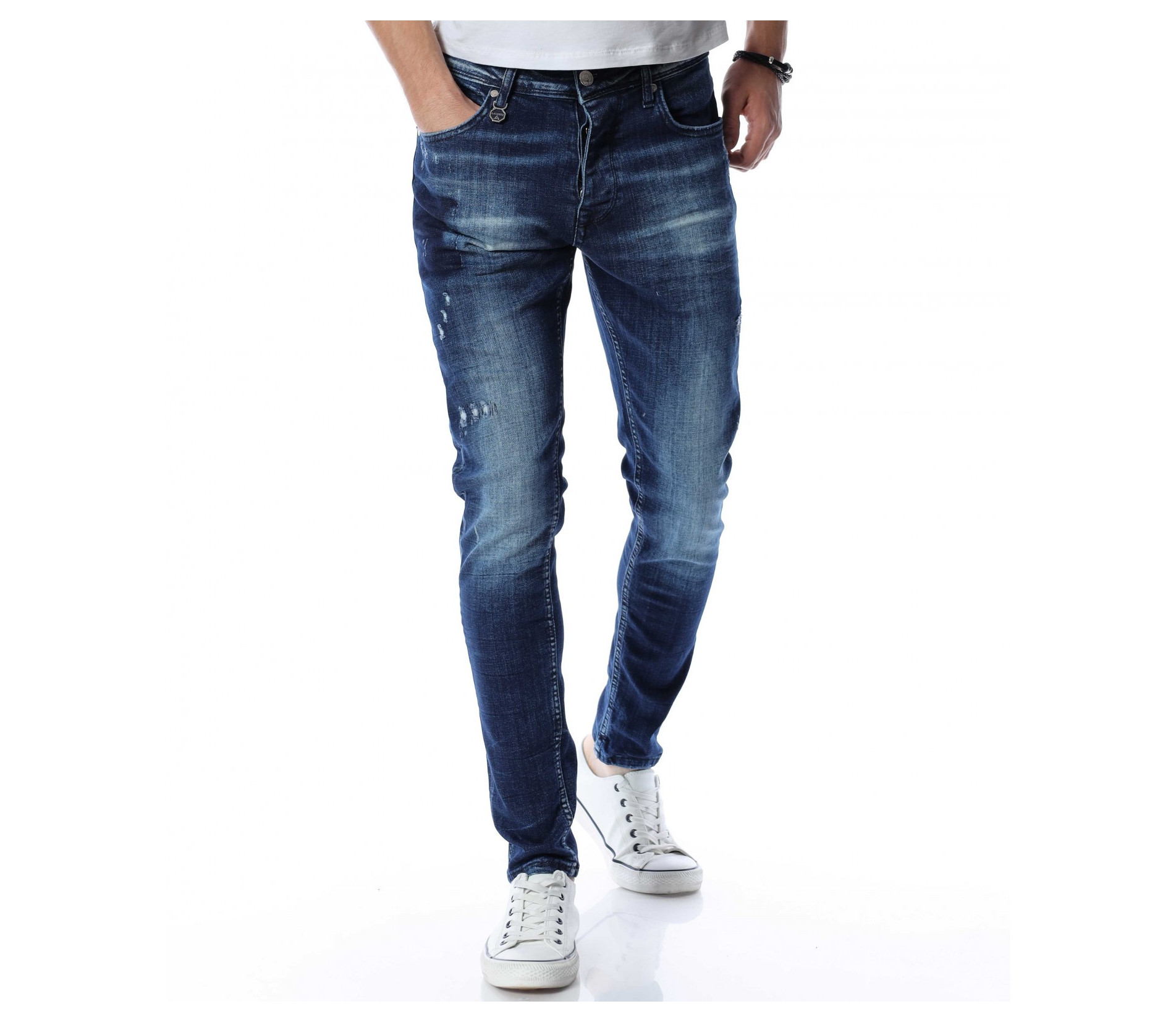 Мъжки, дълъг, син дънков панталон във slim fit вариант и кройка, която осигурява достатъчна свобода на движение и комфорт на тялото. Дизайнът е поверен на силно изсветлени мотиви и небрежно надрани мотиви отпред. Закопчаването е разпределено в четири метални копчета, а на талията са разположени гайки, към които да добавите колан, ако желаете. Джобовете са стандартни в предната и в задната част. Комбинирайте с блуза и кецове и създайте вашият завършен аутфит.