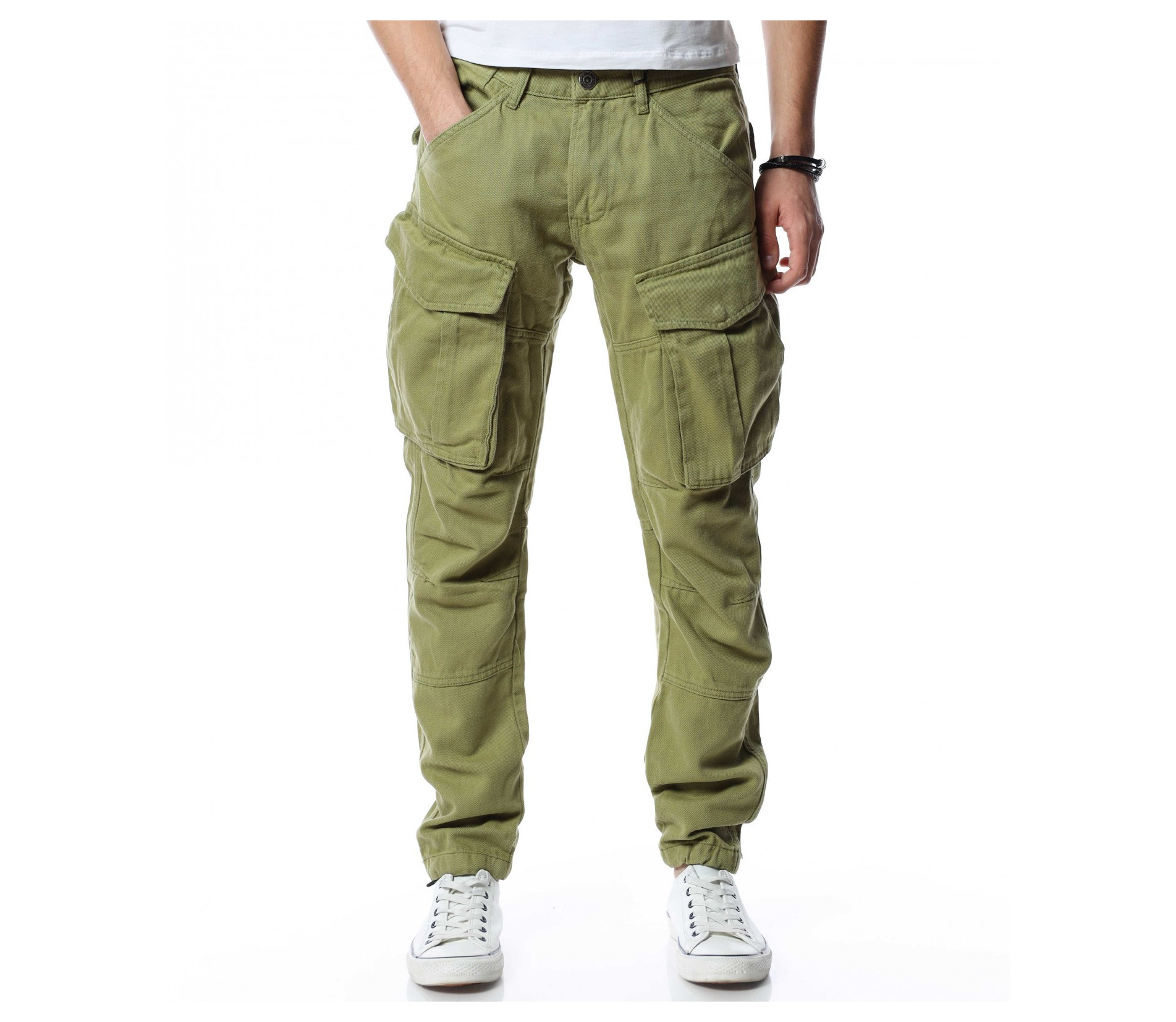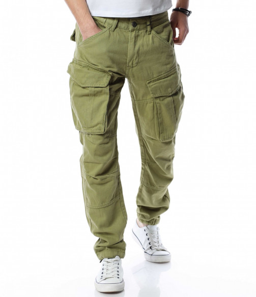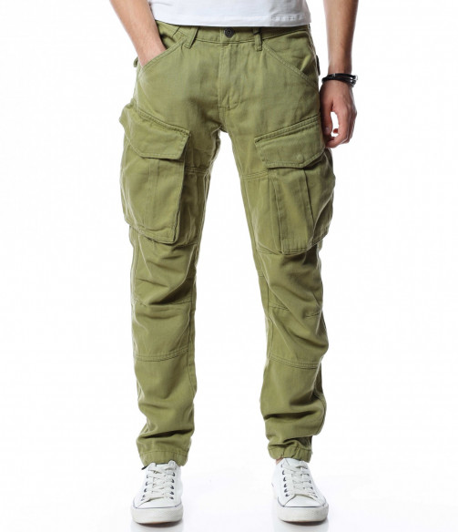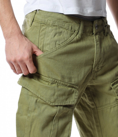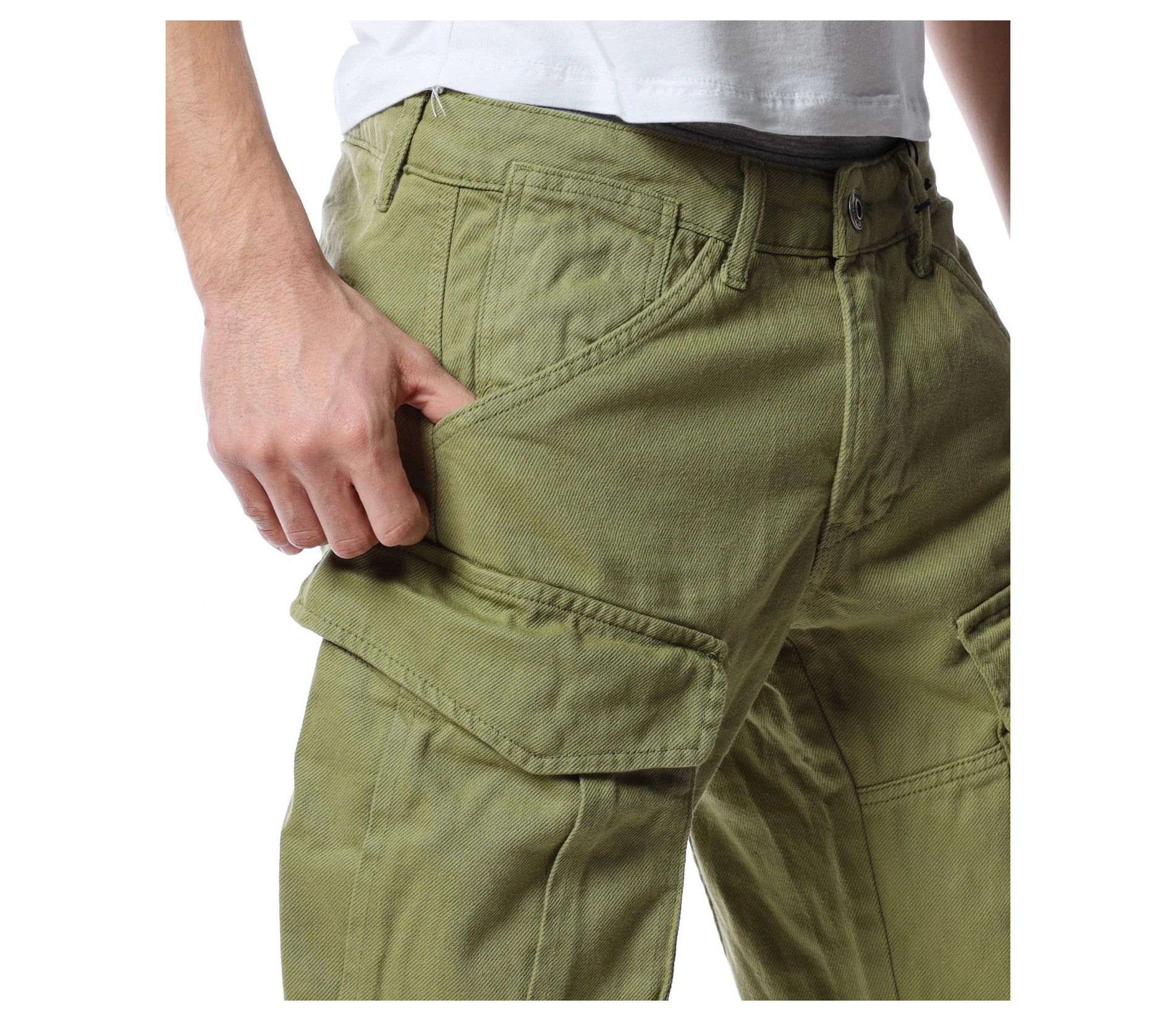 Мъжки джинси от дънкова материя, подходящи за есенно-зимният сезон. В предната част, над коленете се открояват дълбоки, големи джобове с капаче, а в допълнение забелязваме и италиански джоб. Закопчаването се състои в цип и копче. На талията са поставени гайки за колан, а кройката е достатъчно просторна, без да изглежда широка.
