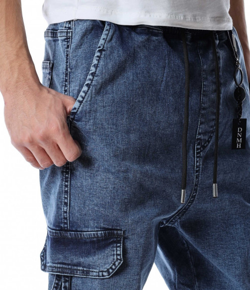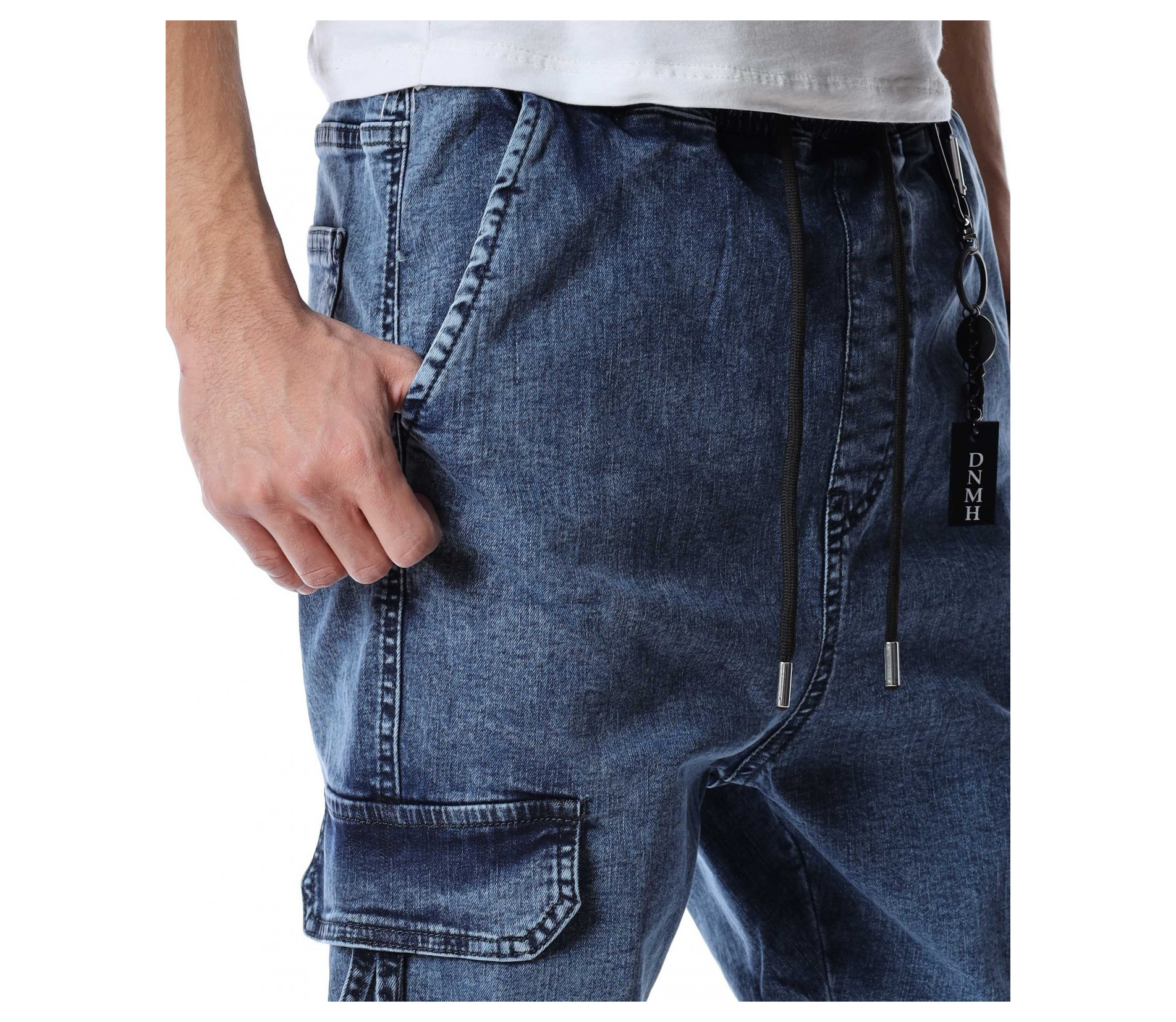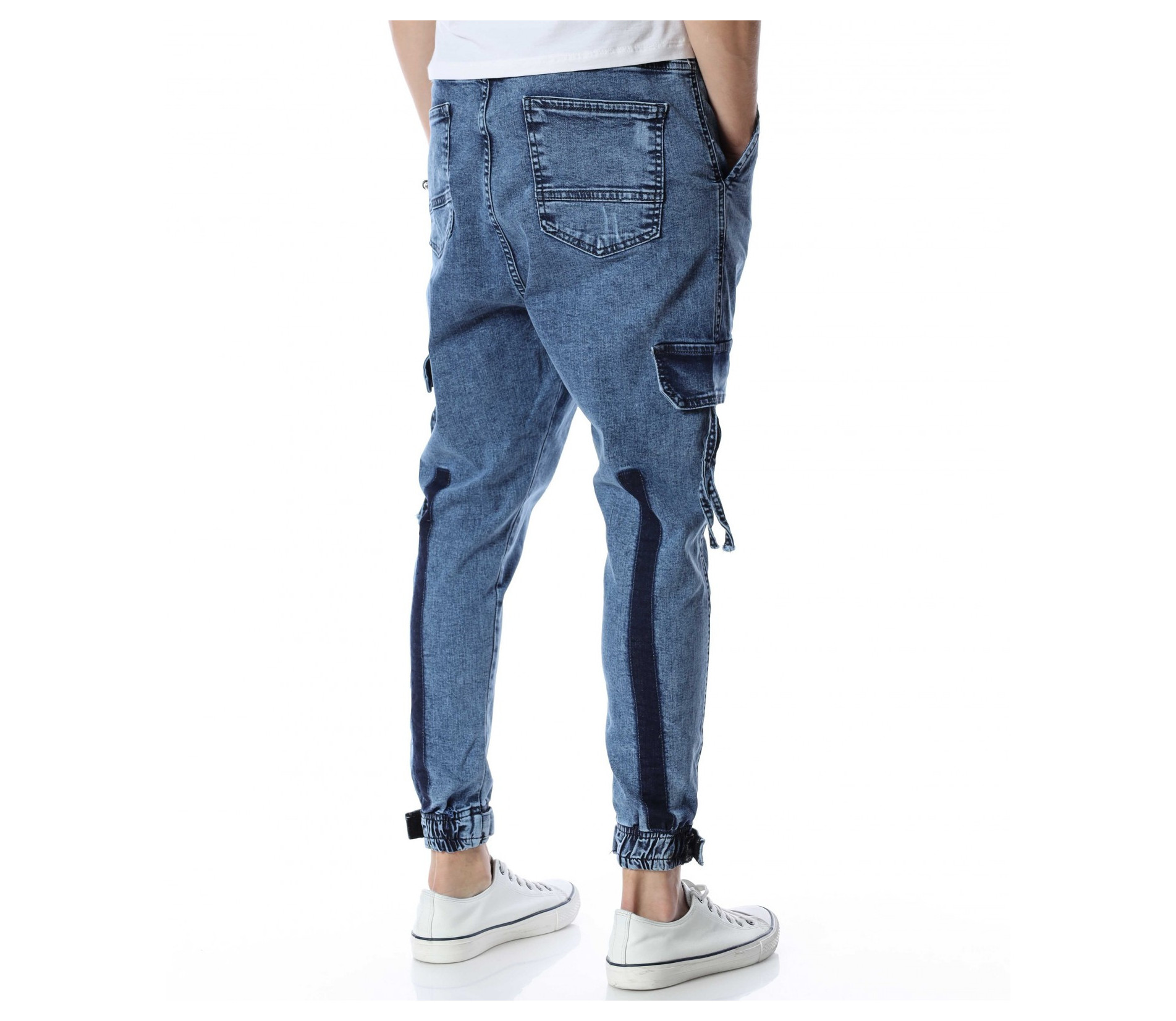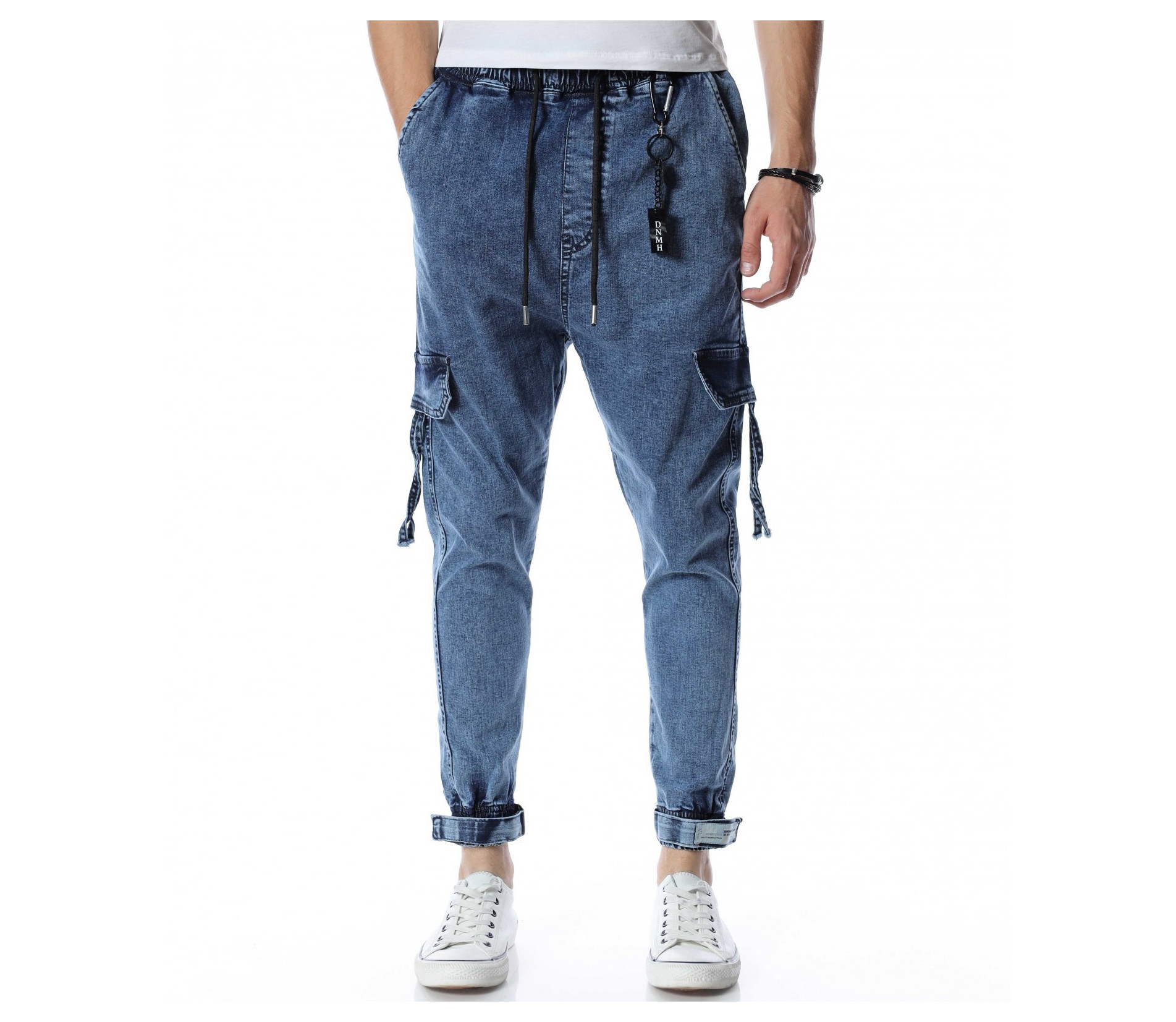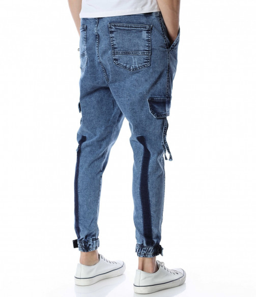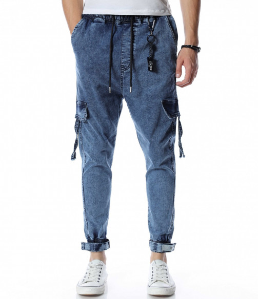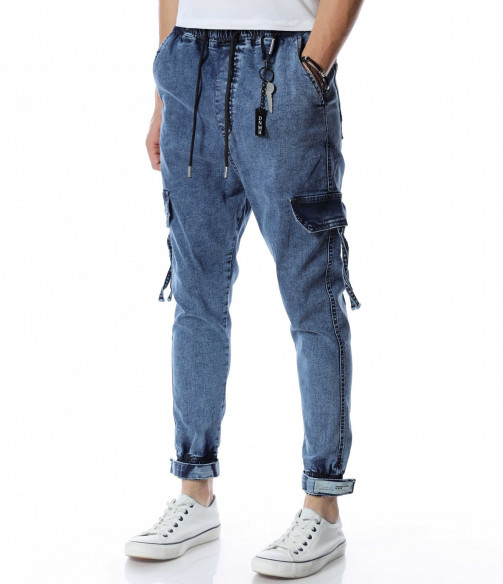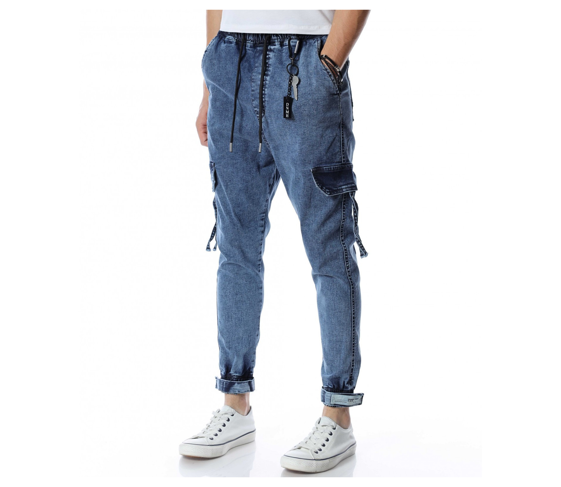 Мъжки, дълъг, дънков панталон с леко паднало дъно във slim fit вариант и кройка, която осигурява достатъчна свобода на движение и комфорт на тялото. Дизайнът е поверен на големите, карго джобове с капаче, силно оребрерни шевове и ластик при глезена, който прилежно прибира крачола. Моделът е без закопчаване, а на талията са разположени ластик и връзки за регулиране на ширината. Комбинирайте с блуза и кецове и създайте вашият завършен аутфит.