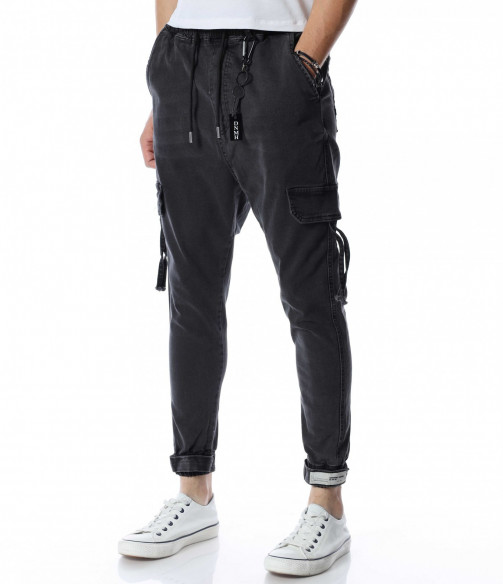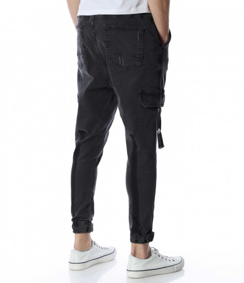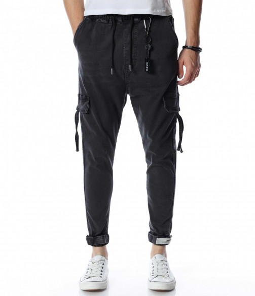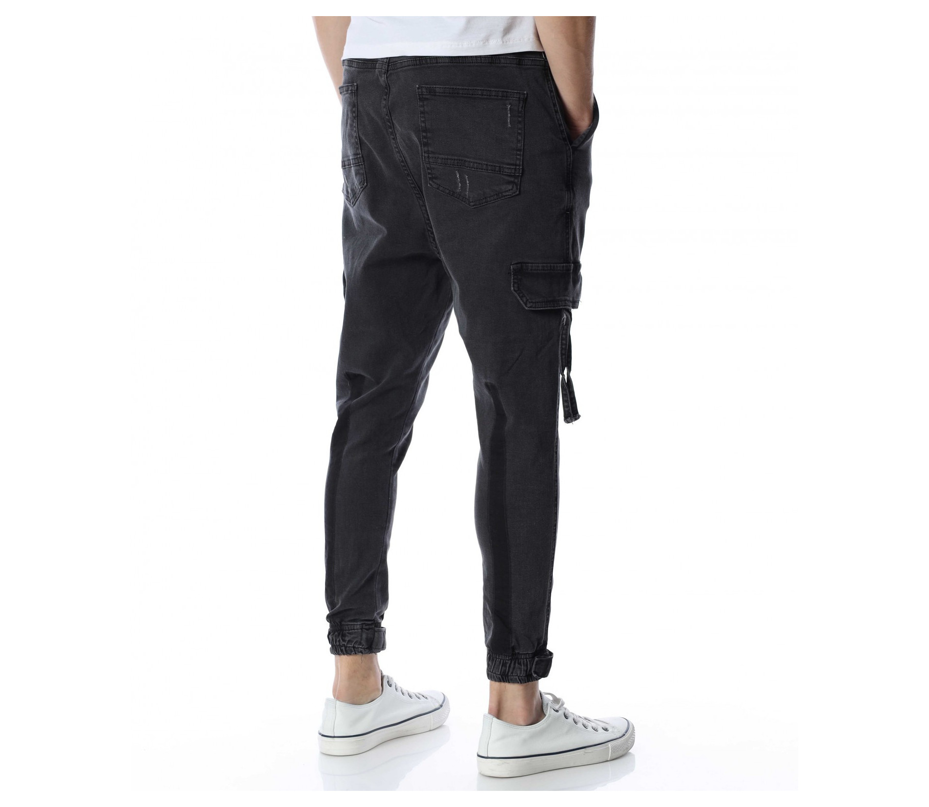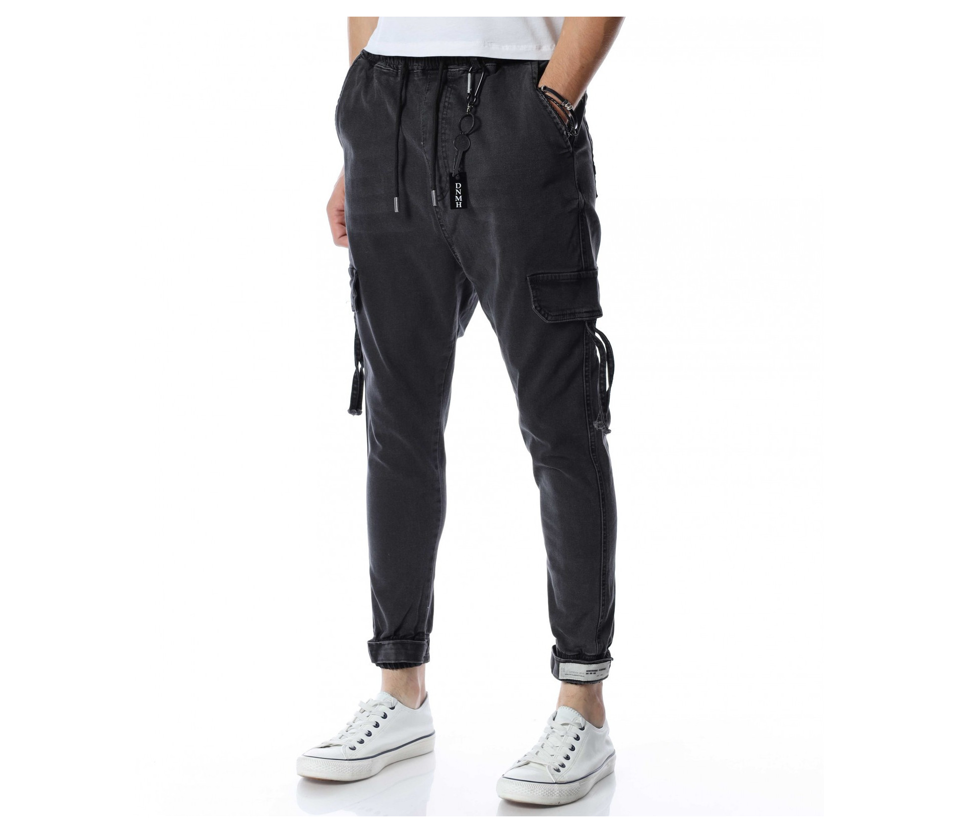 Мъжки, дълъг, дънков панталон с леко паднало дъно във slim fit вариант и кройка, която осигурява достатъчна свобода на движение и комфорт на тялото. Дизайнът е поверен на големите, карго джобове с капаче, силно оребрерни шевове и ластик при глезена, който прилежно прибира крачола. Моделът е без закопчаване, а на талията са разположени ластик и връзки за регулиране на ширината. Комбинирайте с блуза и кецове и създайте вашият завършен аутфит.
