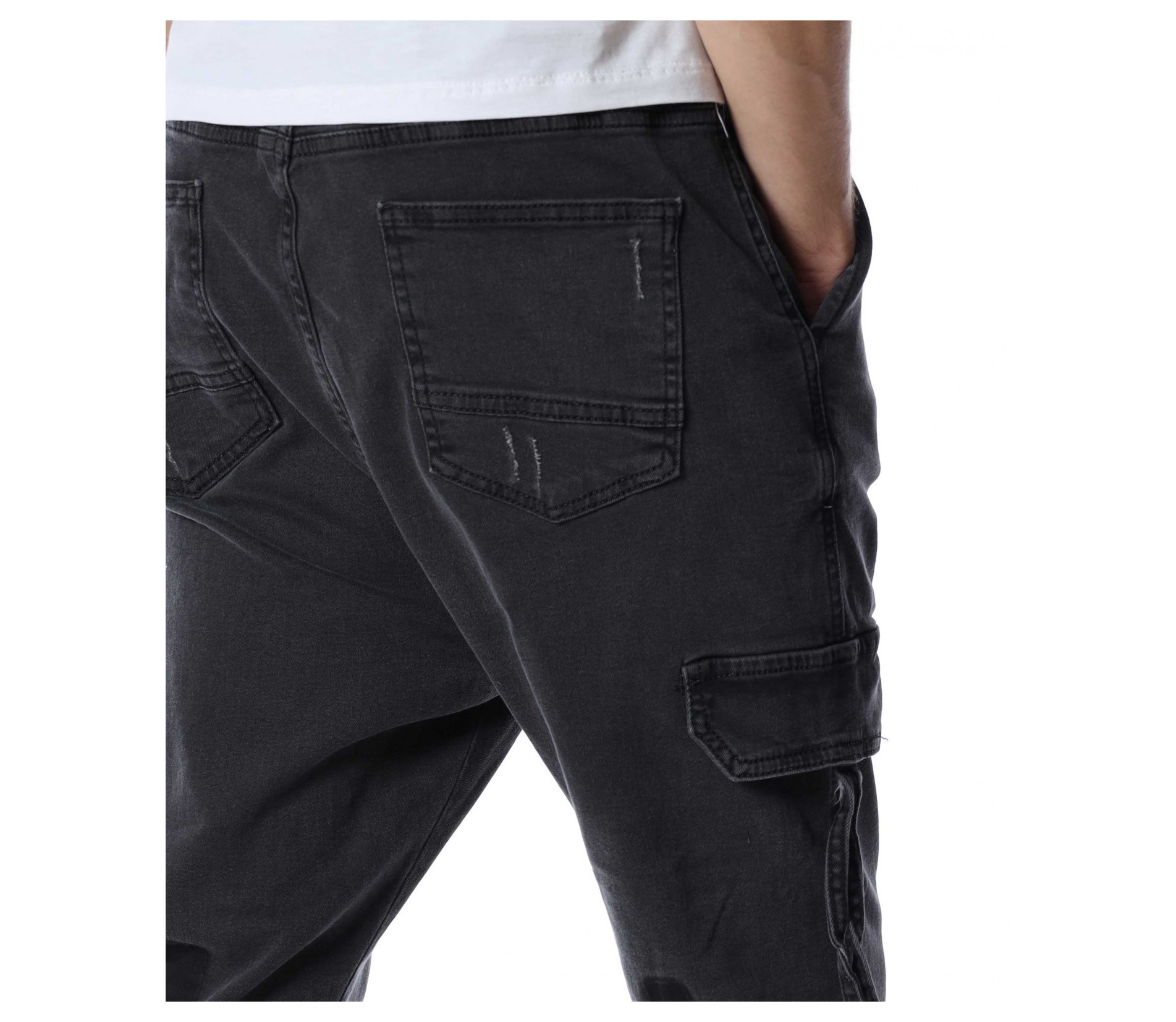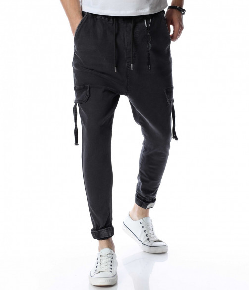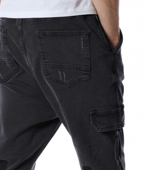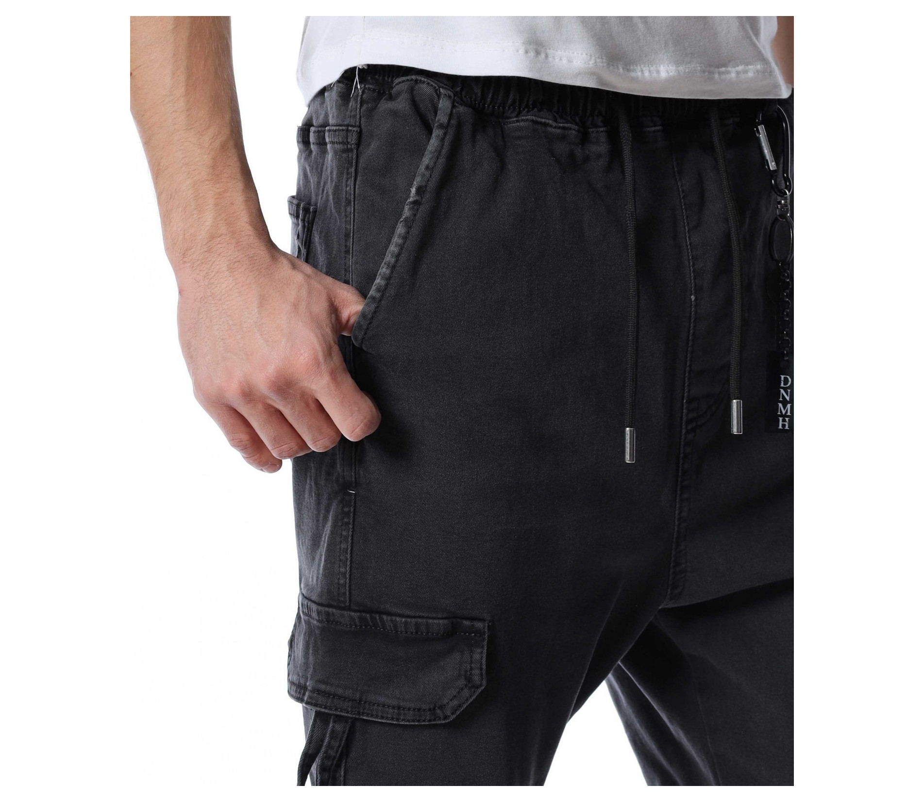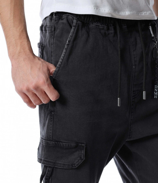Мъжки, дълъг, дънков панталон с леко паднало дъно във slim fit вариант и кройка, която осигурява достатъчна свобода на движение и комфорт на тялото. Дизайнът е поверен на големите, карго джобове с капаче, силно оребрерни шевове и ластик при глезена, който прилежно прибира крачола. Моделът е без закопчаване, а на талията са разположени ластик и връзки за регулиране на ширината. Комбинирайте с блуза и кецове и създайте вашият завършен аутфит.