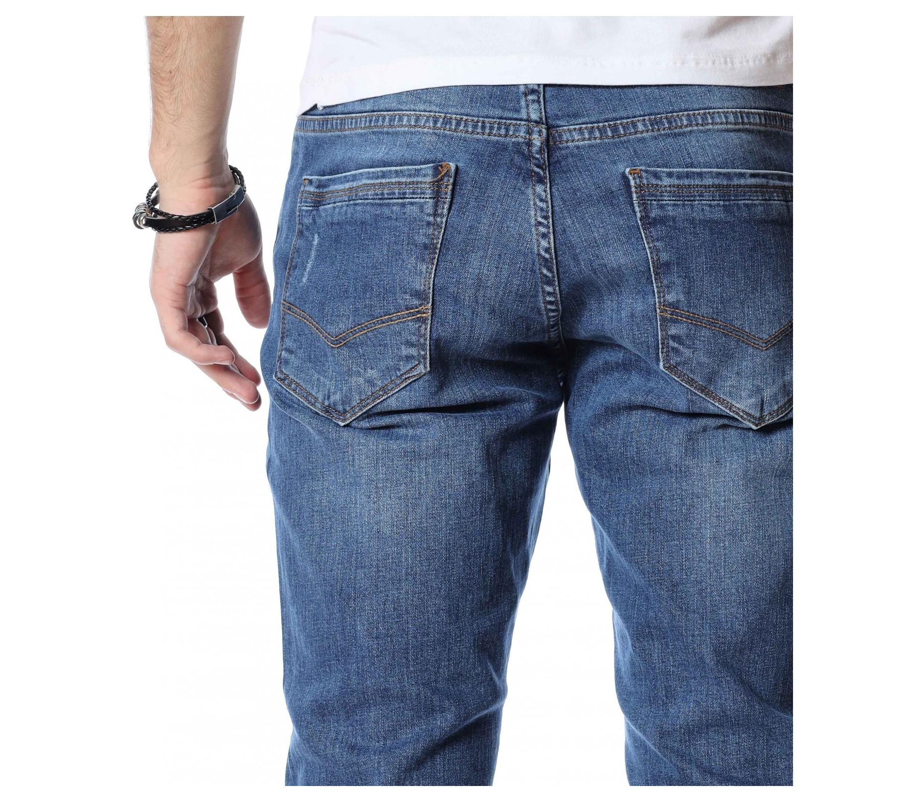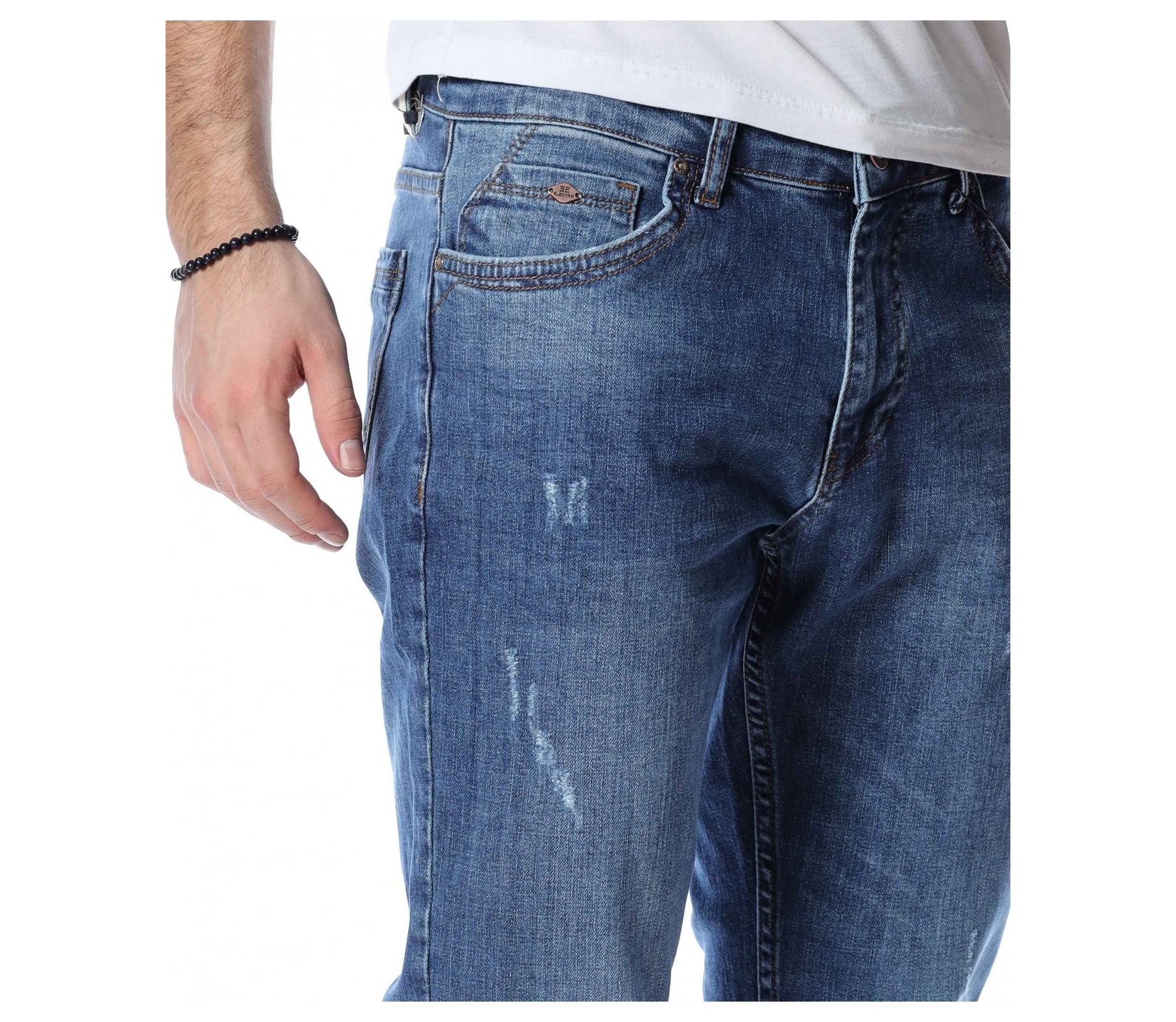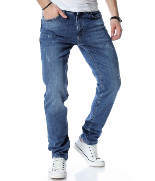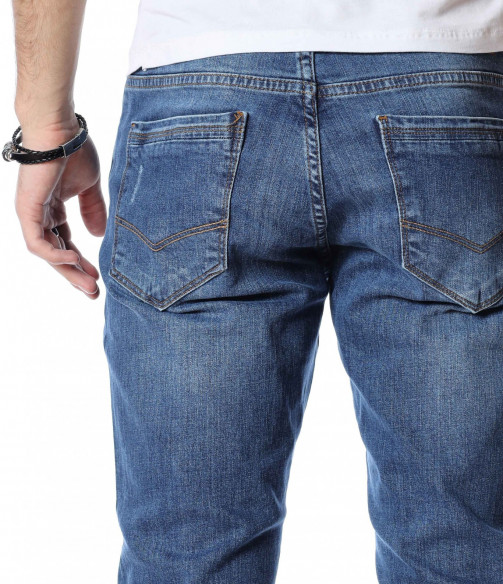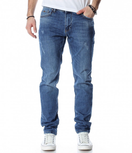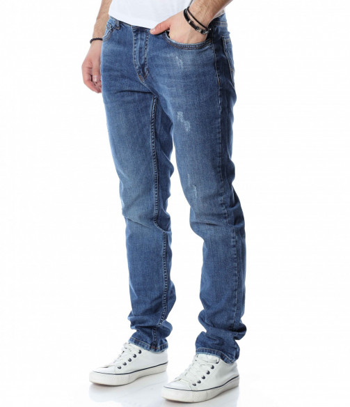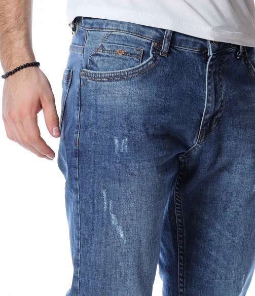 ОПИСАНИЕ НА ПРОДУКТА: Светли мъжки дълги дънки в изключително приятен и модерен цвят. Дънките са в светъл деним, което ги прави толкова интересни. Като акцент на моделът е поставен изсветлял ефект, които разчупва допълнително визията, както и асиметрични прокъсвания по дължината на крачолите. Дънките разполагат с два задни джоба с с веобразен тигел по тях и два предни джоба, които са декорирани с по-малък такъв. На малкият преден джоб е поставена дискретна метална емблема на марката. Комбинирайте смело с по-светли или по-тъмни блузи, заедно с чифт кецове и спортно яке за уникална визия с cool-излъчване.