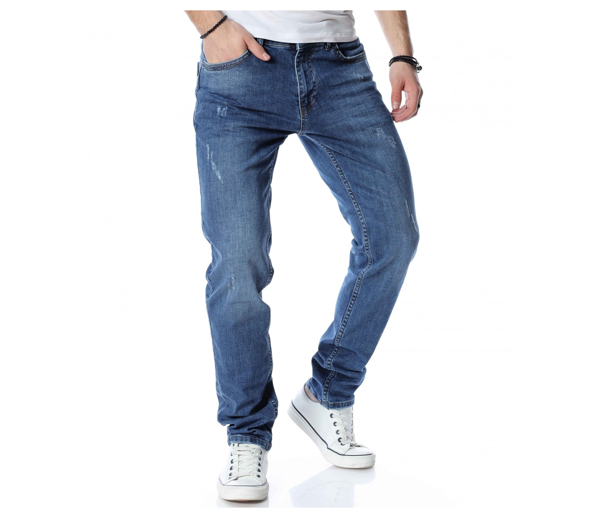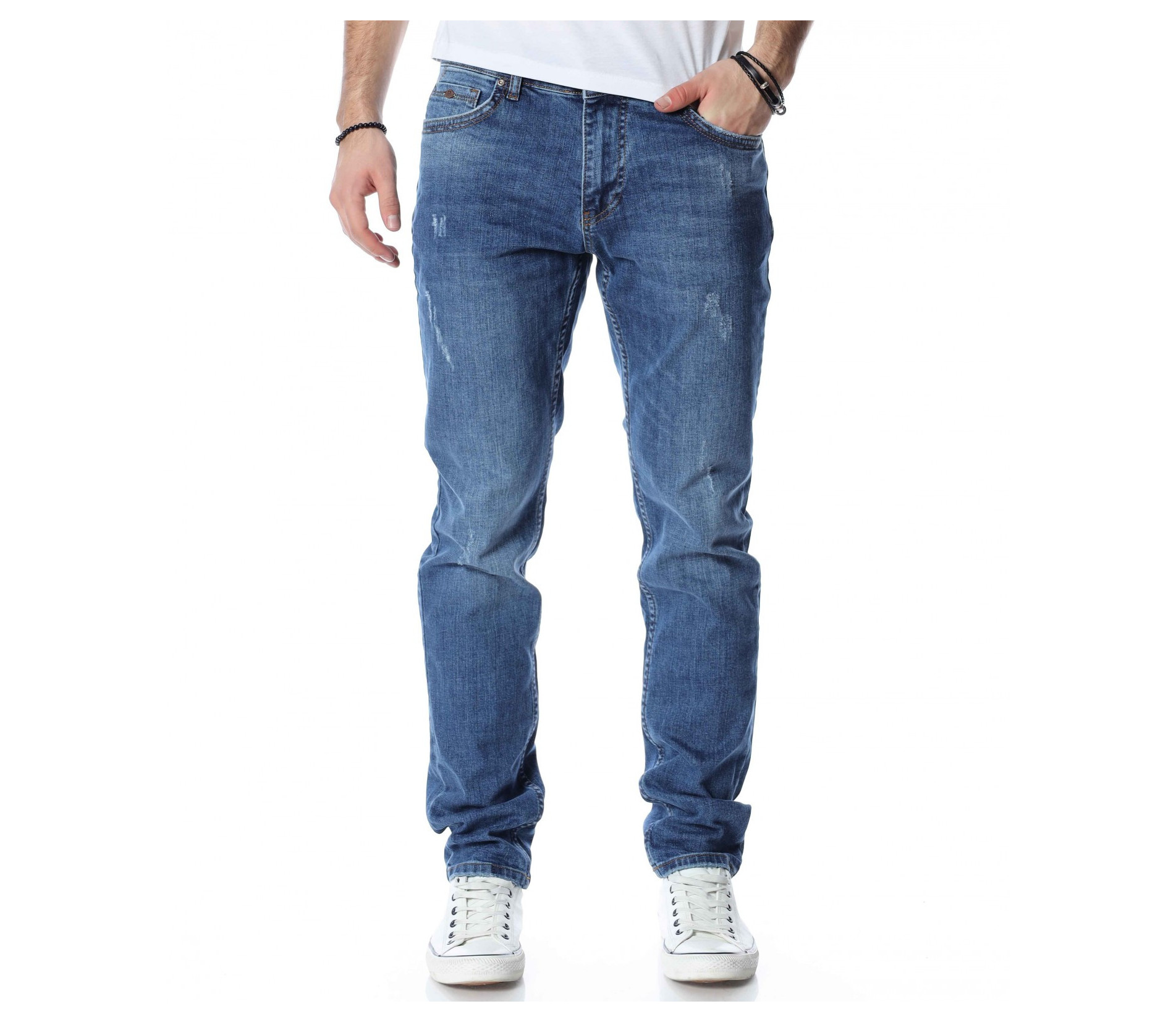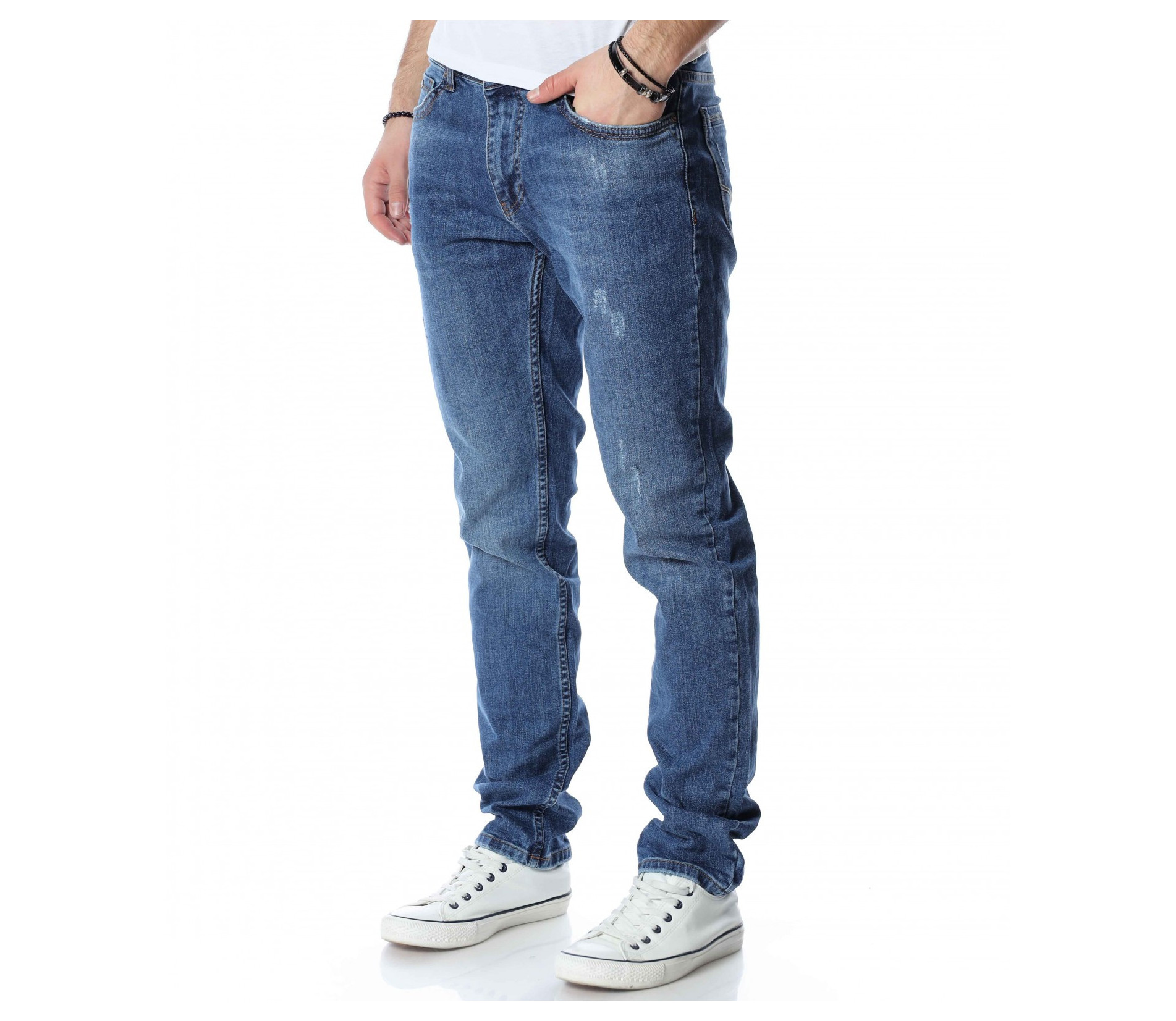 ОПИСАНИЕ НА ПРОДУКТА: Светли мъжки дълги дънки в изключително приятен и модерен цвят. Дънките са в светъл деним, което ги прави толкова интересни. Като акцент на моделът е поставен изсветлял ефект, които разчупва допълнително визията, както и асиметрични прокъсвания по дължината на крачолите. Дънките разполагат с два задни джоба с с веобразен тигел по тях и два предни джоба, които са декорирани с по-малък такъв. На малкият преден джоб е поставена дискретна метална емблема на марката. Комбинирайте смело с по-светли или по-тъмни блузи, заедно с чифт кецове и спортно яке за уникална визия с cool-излъчване.