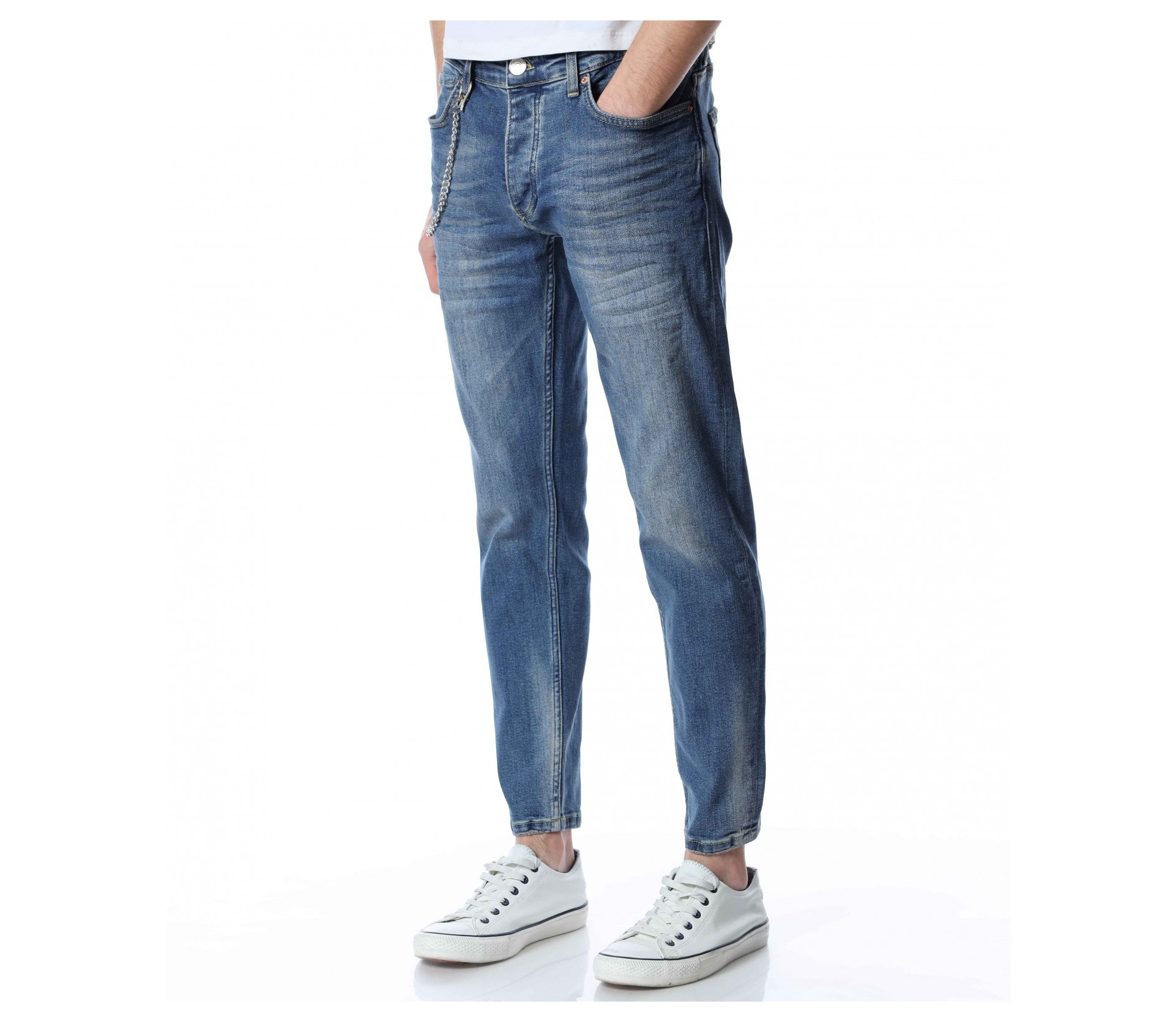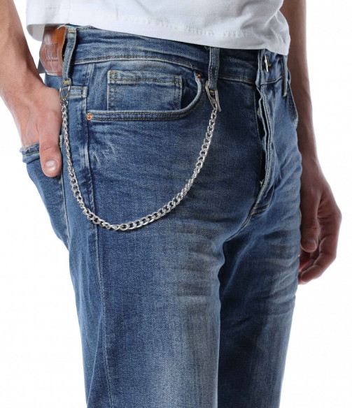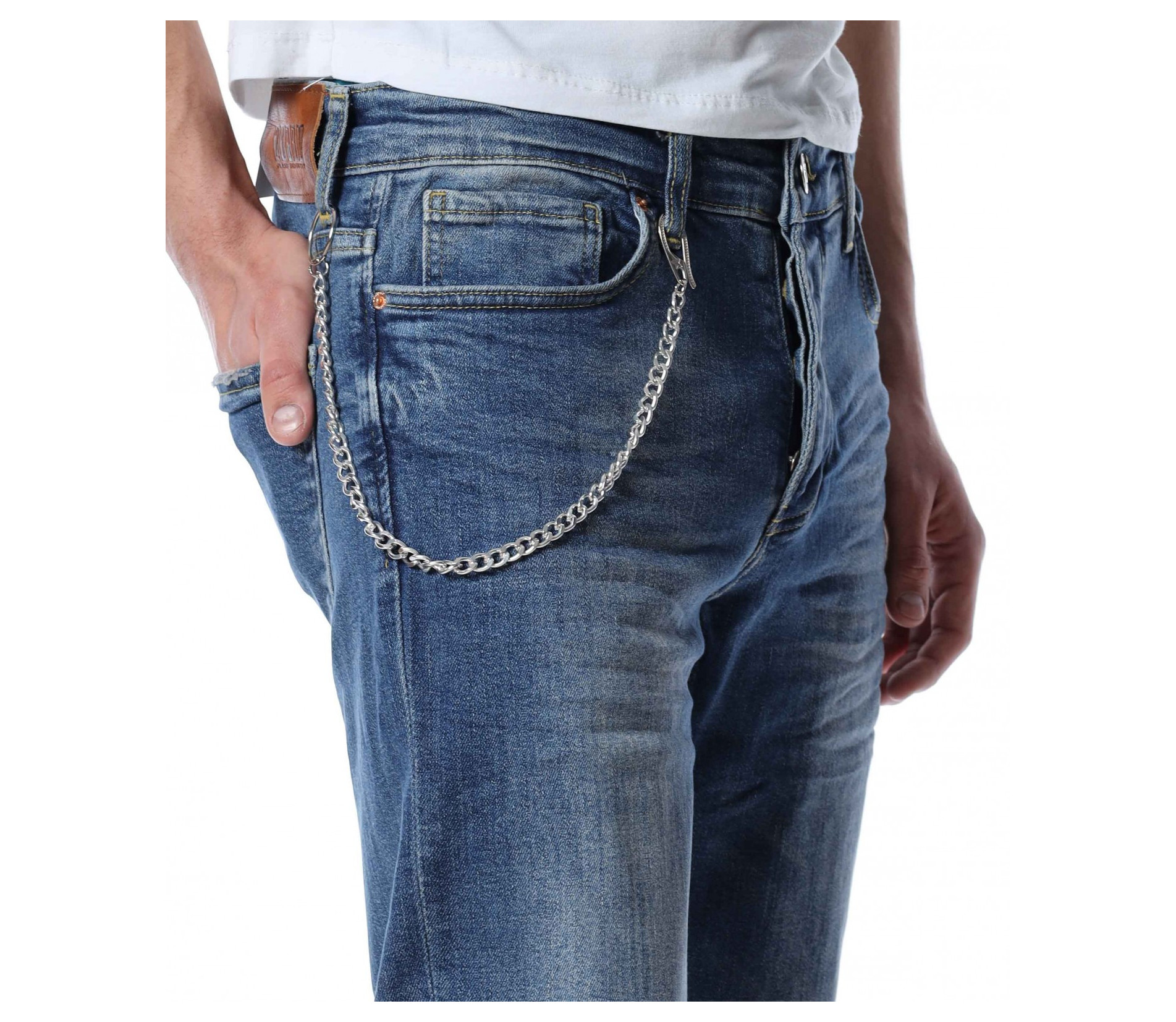 ОПИСАНИЕ НА ПРОДУКТА: Не е нужно да залагате на нестандартни дрехи, за да се отличите от \"масата\". Нужно е просто да изберете класен модел дънки, който да съчетаете със стилна блуза или тениска. Именно такъв е този модел мъжки дънки. По основата му няма декорации или силни светли части, които да привличат погледа, но има перфектна кройка, която допълва изчистения, но интересен нюанс на синия цвят. Разбира се леко просветелния плат, успява да разчупи строгия дизайн, но не променя изцяло визията. Акцентът в този модел е верига, която можете да премахвате според случая. И тук присъстват двата дълбоки предни джоба, пренесени и в задната част. Тъй като се грижим за цялостния Ви комфорт, Ви предлагаме този мъжки деним. Не подражавайте на чужд вкус, заложете на своя като му добавите още малко цвят.