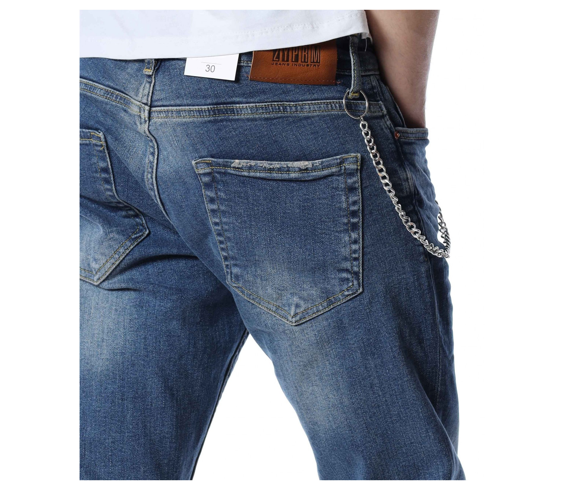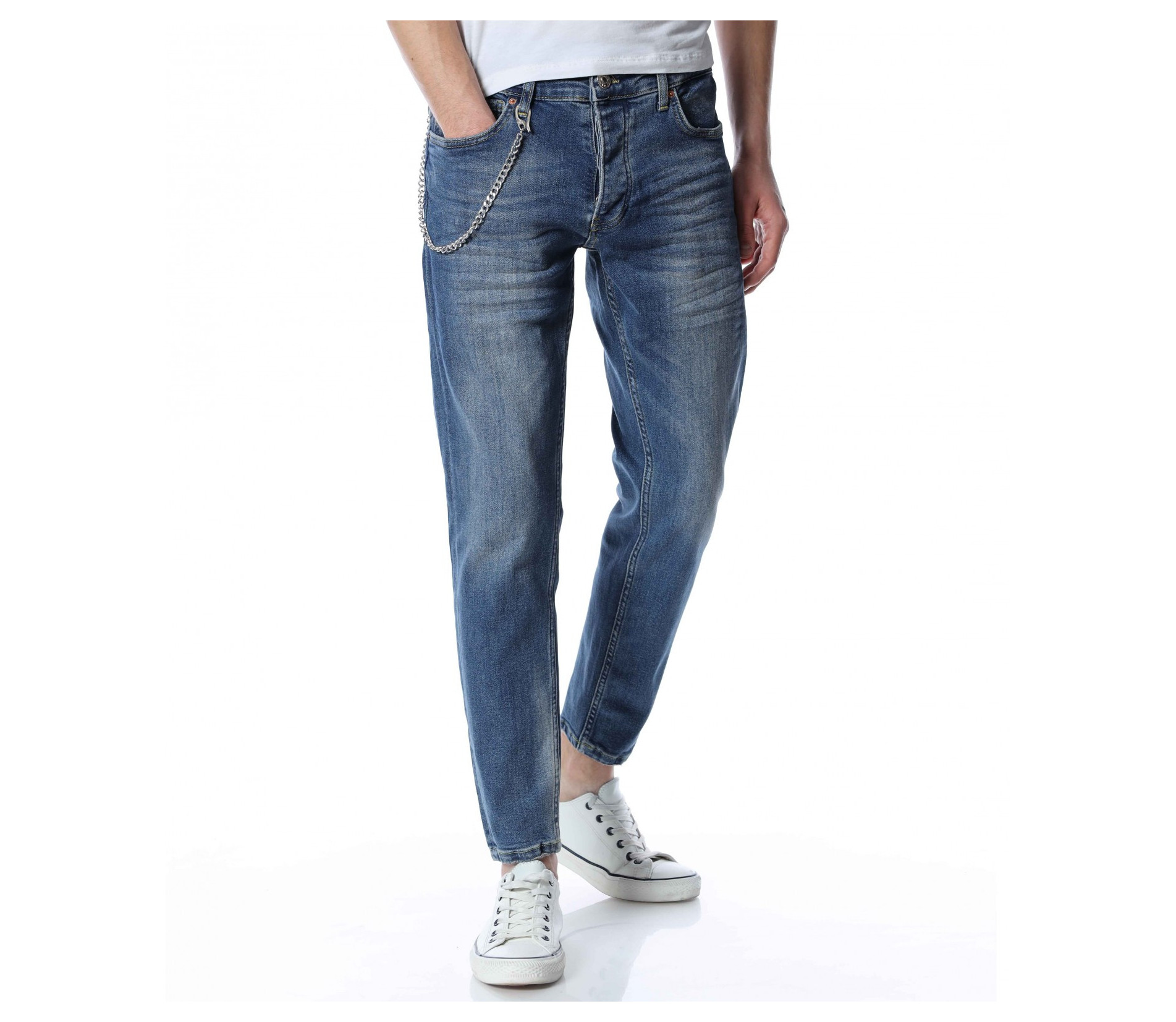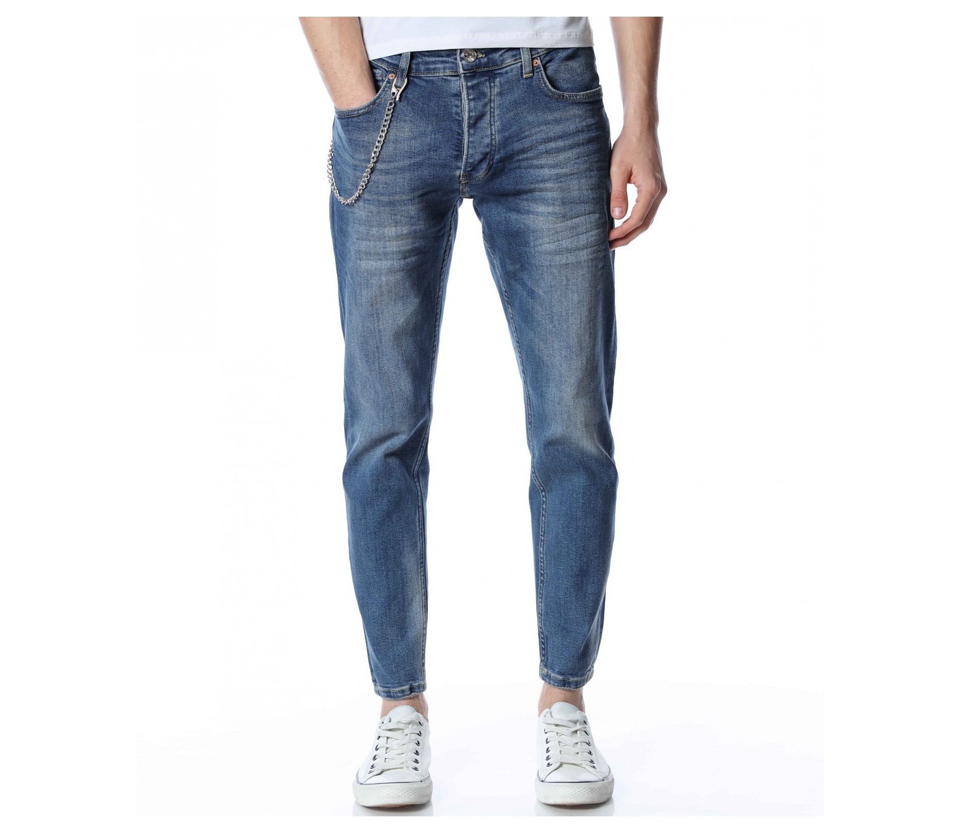 ОПИСАНИЕ НА ПРОДУКТА: Не е нужно да залагате на нестандартни дрехи, за да се отличите от \"масата\". Нужно е просто да изберете класен модел дънки, който да съчетаете със стилна блуза или тениска. Именно такъв е този модел мъжки дънки. По основата му няма декорации или силни светли части, които да привличат погледа, но има перфектна кройка, която допълва изчистения, но интересен нюанс на синия цвят. Разбира се леко просветелния плат, успява да разчупи строгия дизайн, но не променя изцяло визията. Акцентът в този модел е верига, която можете да премахвате според случая. И тук присъстват двата дълбоки предни джоба, пренесени и в задната част. Тъй като се грижим за цялостния Ви комфорт, Ви предлагаме този мъжки деним. Не подражавайте на чужд вкус, заложете на своя като му добавите още малко цвят.