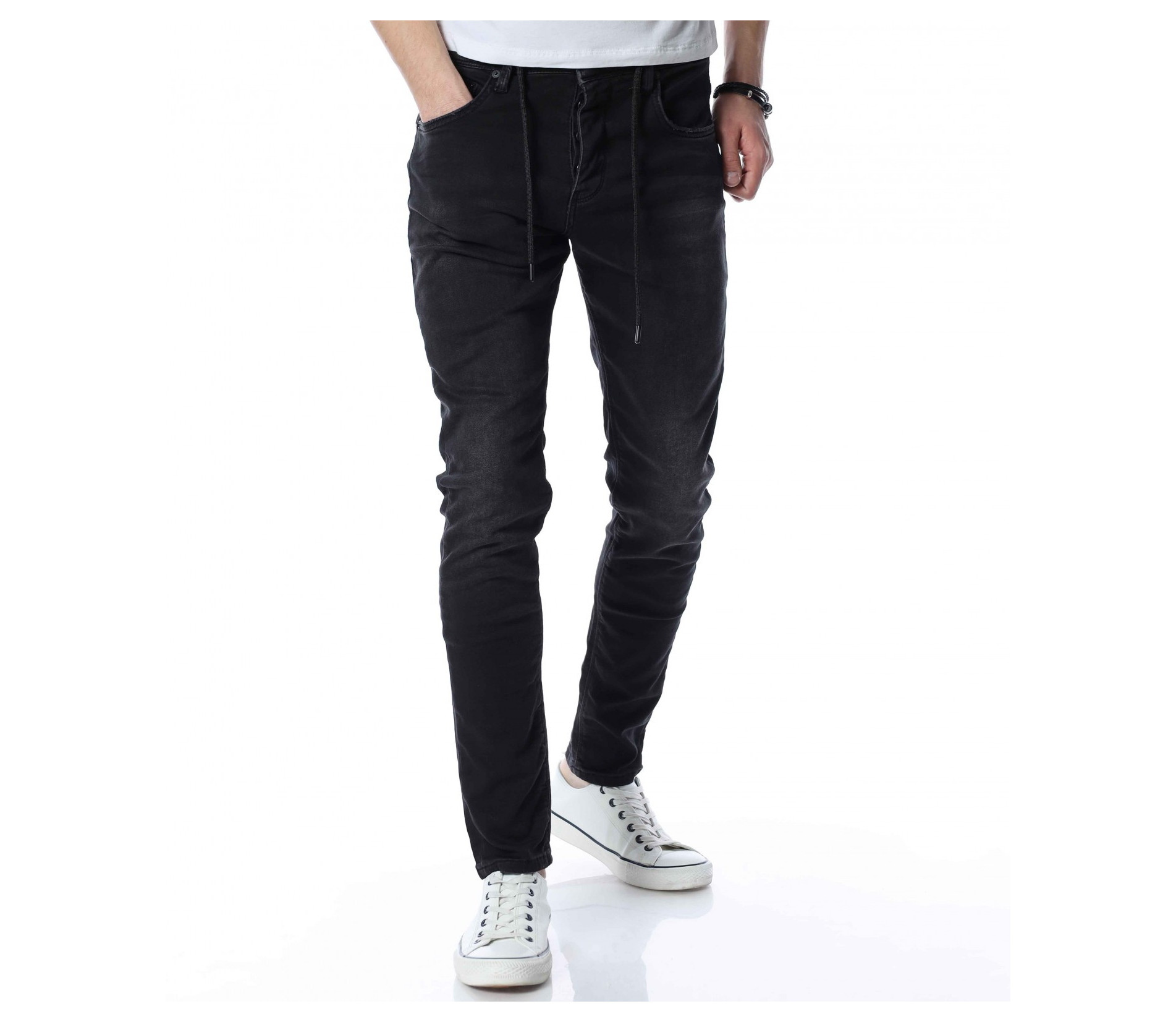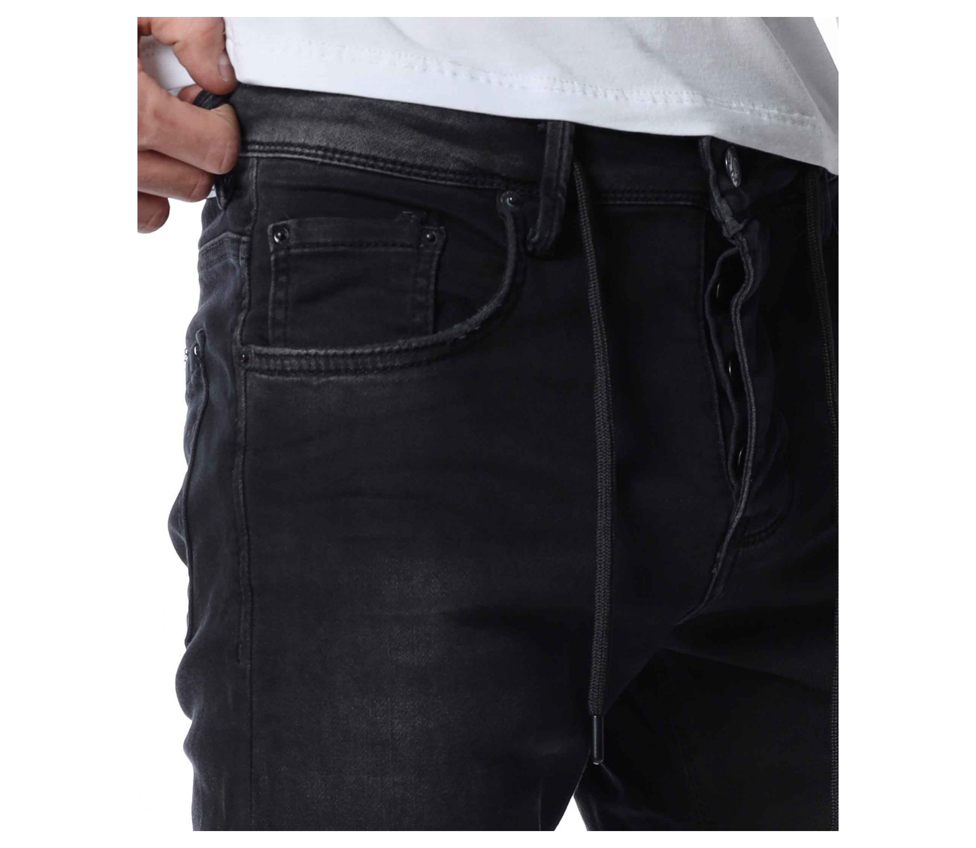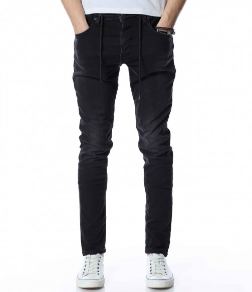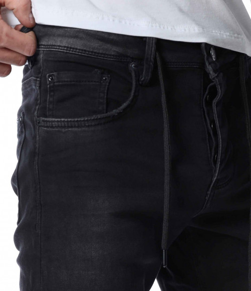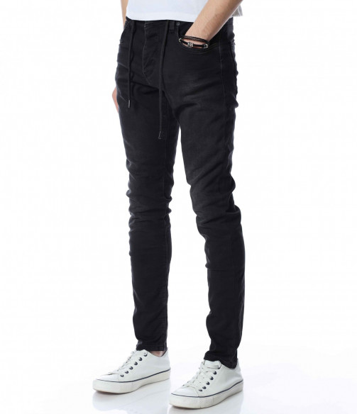 ОПИСАНИЕ НА ПРОДУКТА: Мъжки дълъг дънков панталон тип джогър. Моделът е изключително предпочитан за тази година, ако желаете да бъдете \"в крак\" с модните тенденции, това е идеалният избор за вас. На талията са поставени връзки за регулиране на ширината. Цветът е наситен с много леки просветлявания по дължината на крачолите. Закопаването е с копчета. Перфектно се съчетава с високи кецове и блуза и грейка.