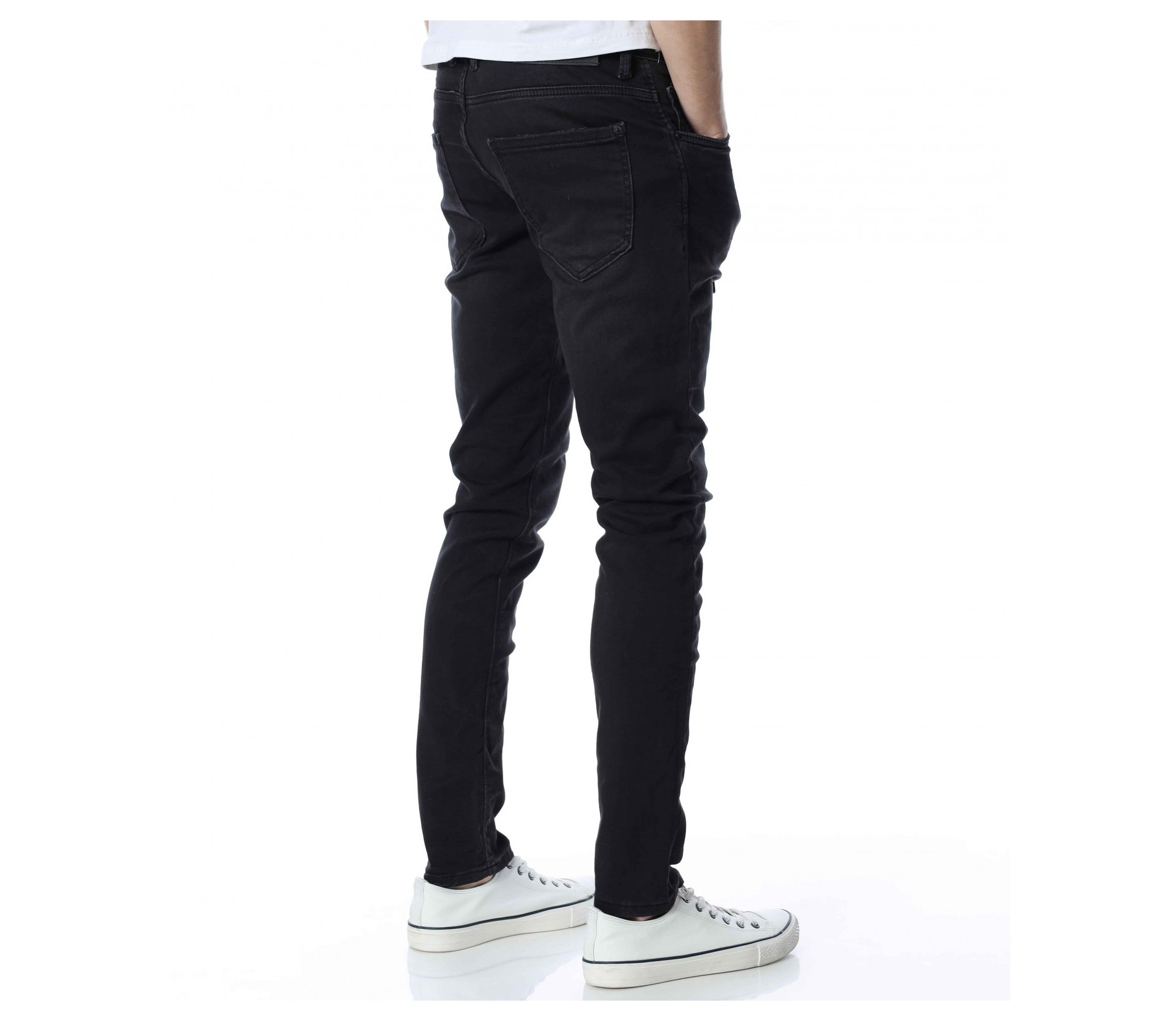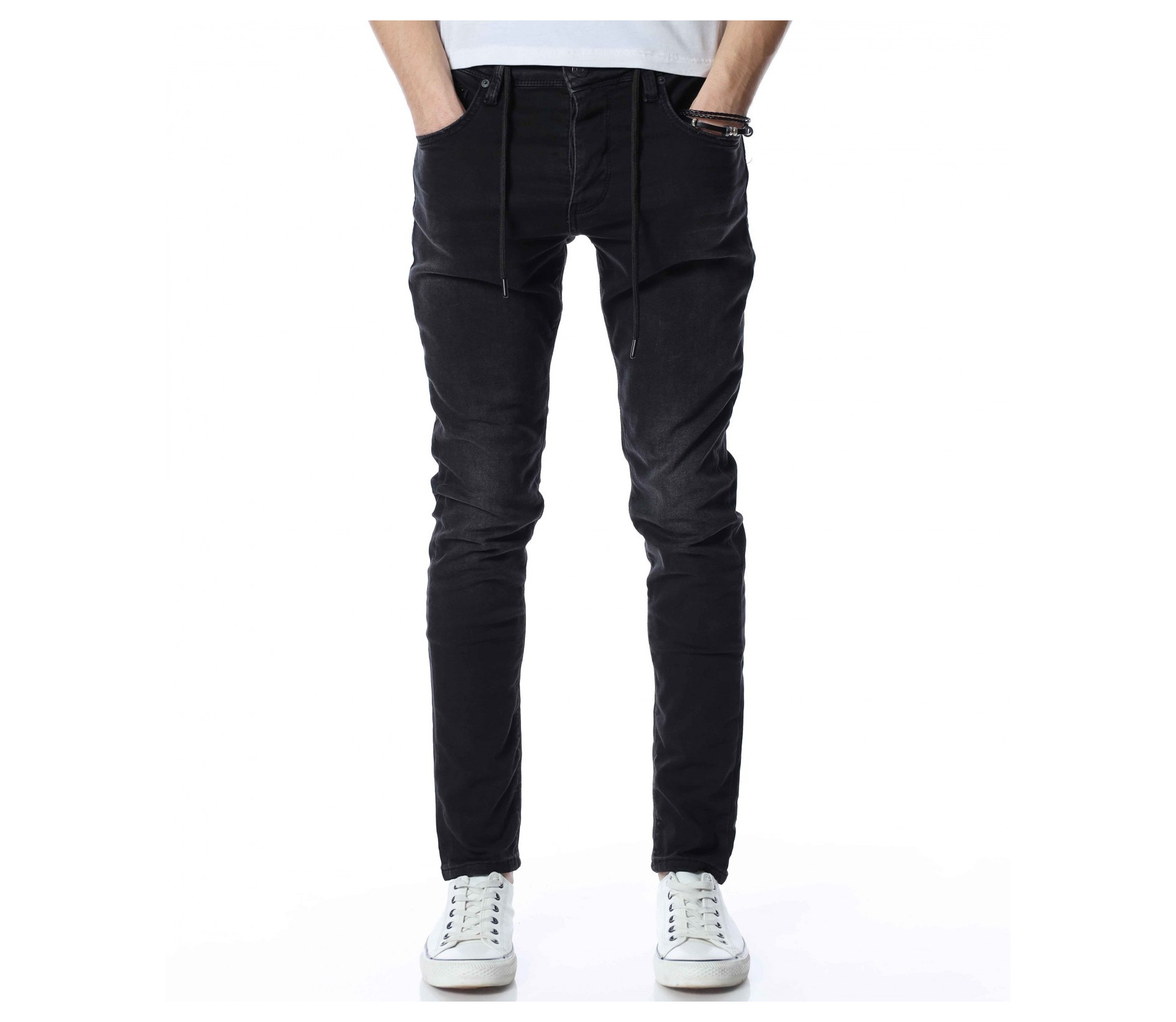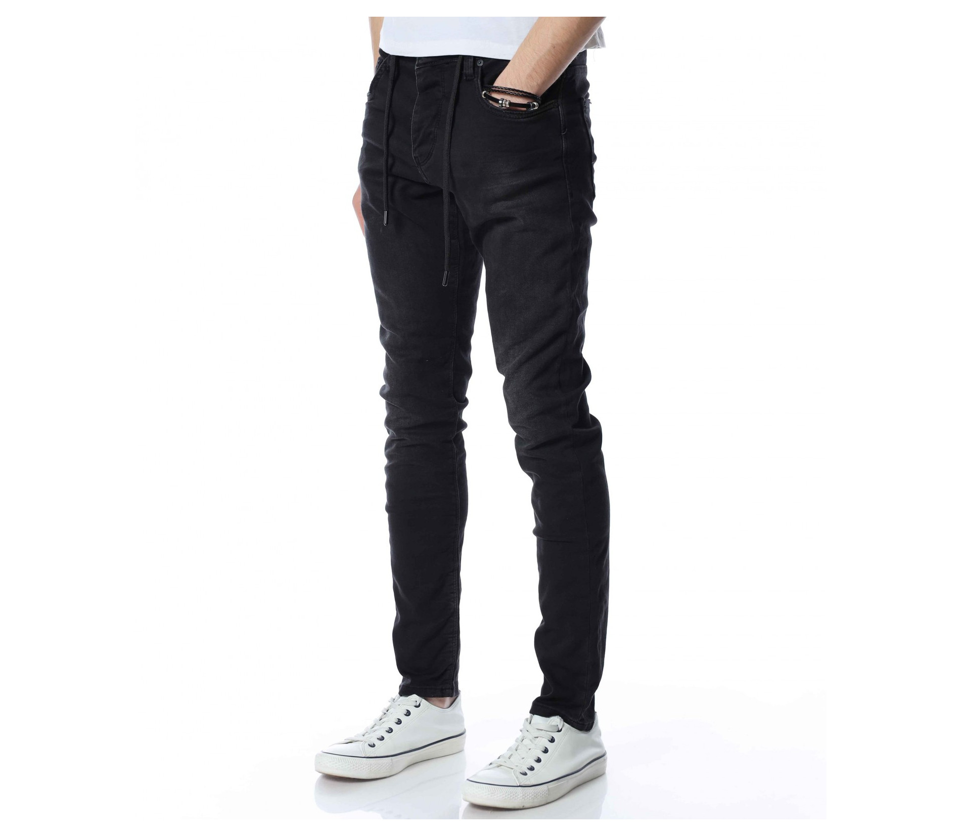 ОПИСАНИЕ НА ПРОДУКТА: Мъжки дълъг дънков панталон тип джогър. Моделът е изключително предпочитан за тази година, ако желаете да бъдете \"в крак\" с модните тенденции, това е идеалният избор за вас. На талията са поставени връзки за регулиране на ширината. Цветът е наситен с много леки просветлявания по дължината на крачолите. Закопаването е с копчета. Перфектно се съчетава с високи кецове и блуза и грейка.