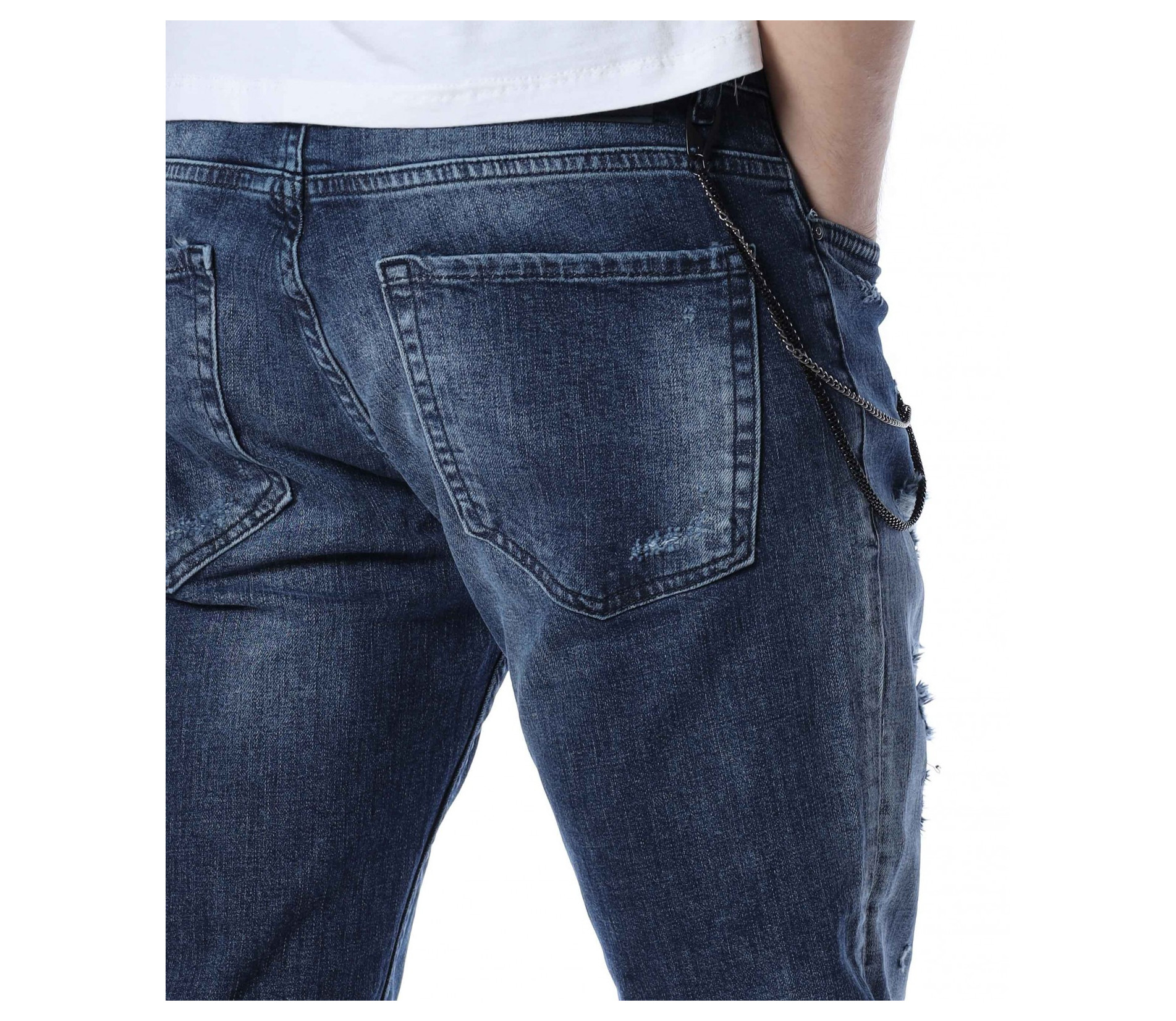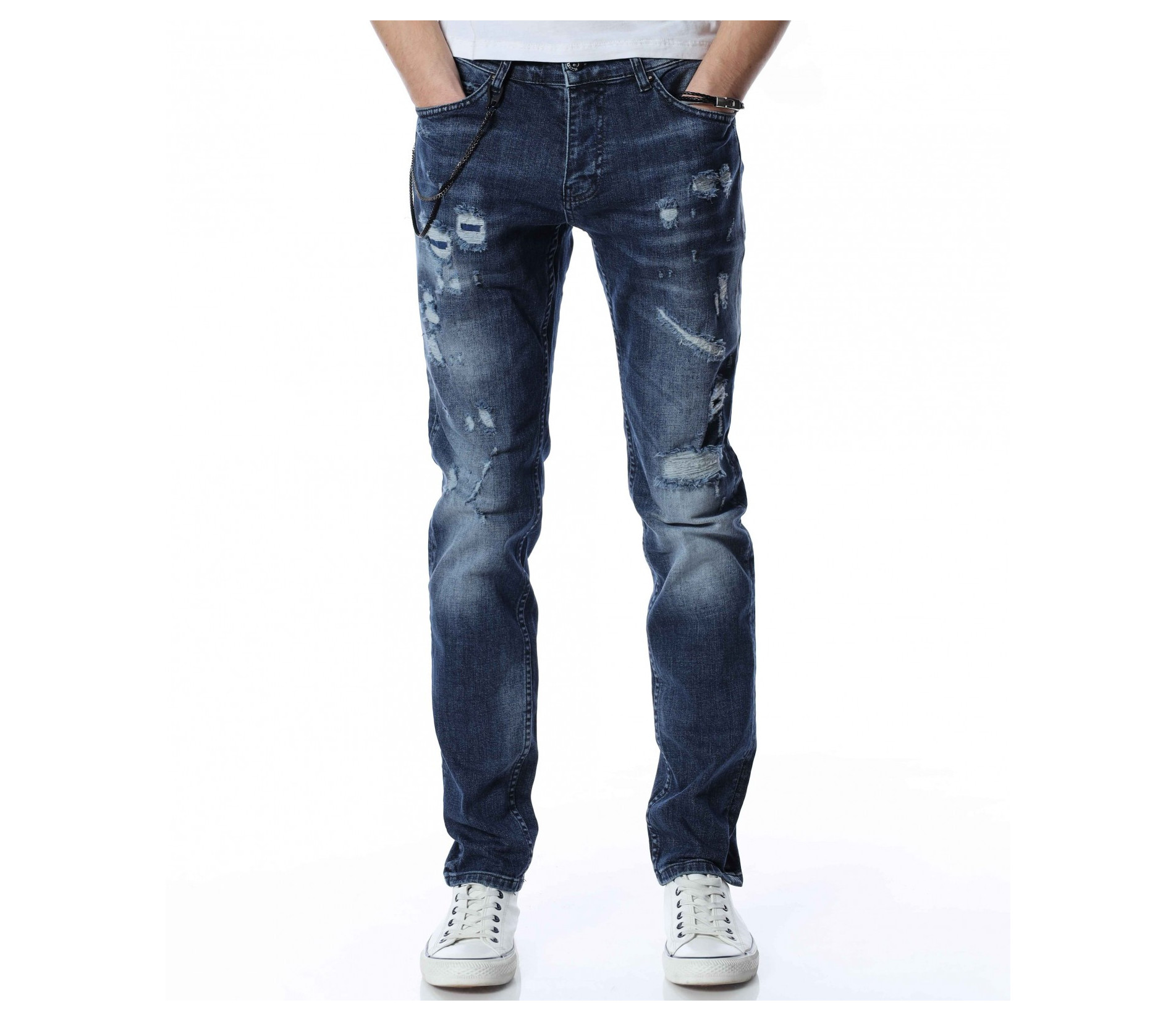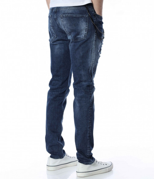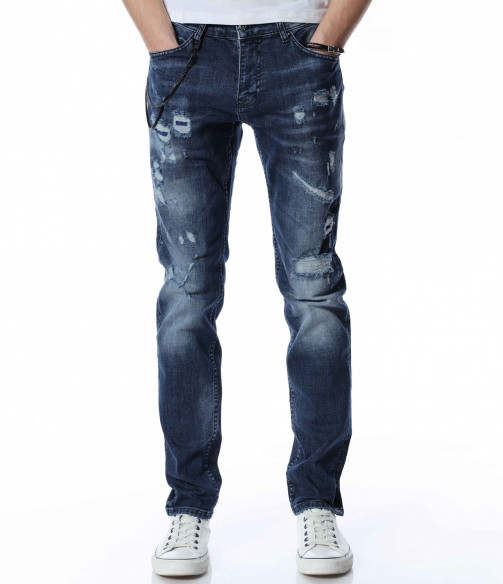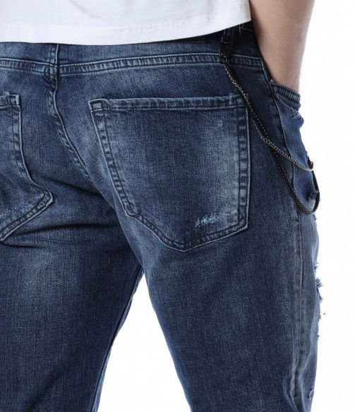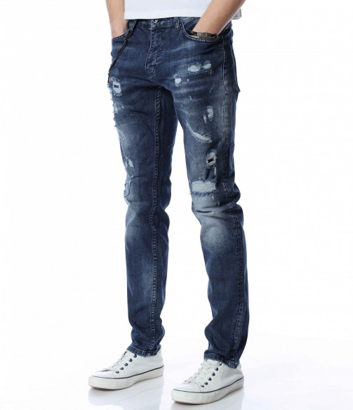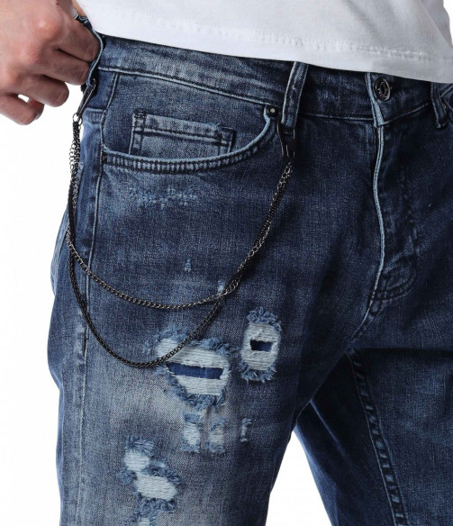 ОПИСАНИЕ НА ПРОДУКТА: За ценителите на атрактивните модели мъжки дънки представяме този спортен модел дънки, който впечатлява със своята фешън визия. Десена на панталона от дънков плат е част от тъмносинята гама, като по дължинат на крачолите има изсветлели участъци. Като най-голям акцент се явява накъсания ефект под формата на кръпки с подплата. Други по-семпли надрани детайли са разположени хаотично по цялата основа. От двете страни на модела има по два дълбоки джоба, като единия преден е декориран с един в по-малък размер. Бъди в центъра на вниманието с провокативни дънки в street форма. Добавен е и атрактивен метален елемент, който се закача на гайките за колан и може да се сваля според вашето желание. Носете ги с усмивка и самочувствие.