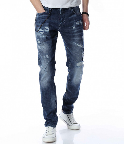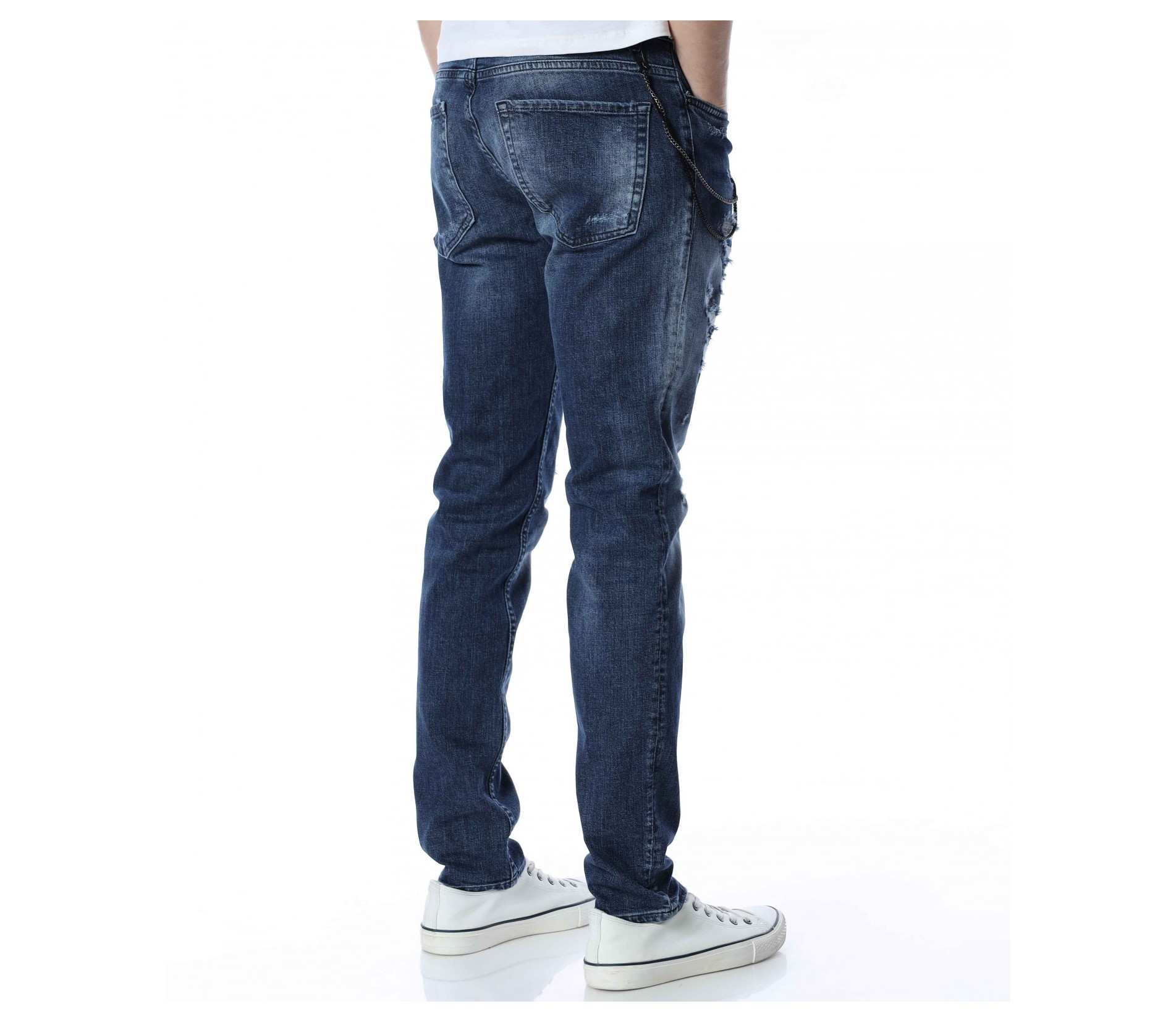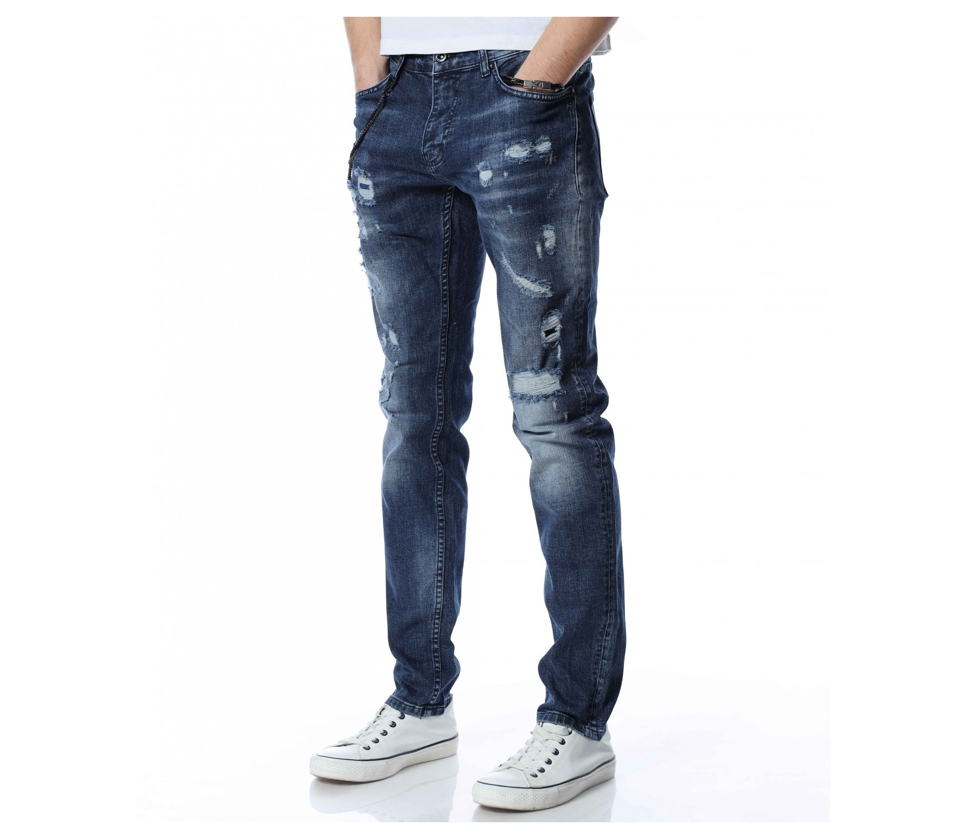ОПИСАНИЕ НА ПРОДУКТА: За ценителите на атрактивните модели мъжки дънки представяме този спортен модел дънки, който впечатлява със своята фешън визия. Десена на панталона от дънков плат е част от тъмносинята гама, като по дължинат на крачолите има изсветлели участъци. Като най-голям акцент се явява накъсания ефект под формата на кръпки с подплата. Други по-семпли надрани детайли са разположени хаотично по цялата основа. От двете страни на модела има по два дълбоки джоба, като единия преден е декориран с един в по-малък размер. Бъди в центъра на вниманието с провокативни дънки в street форма. Добавен е и атрактивен метален елемент, който се закача на гайките за колан и може да се сваля според вашето желание. Носете ги с усмивка и самочувствие.