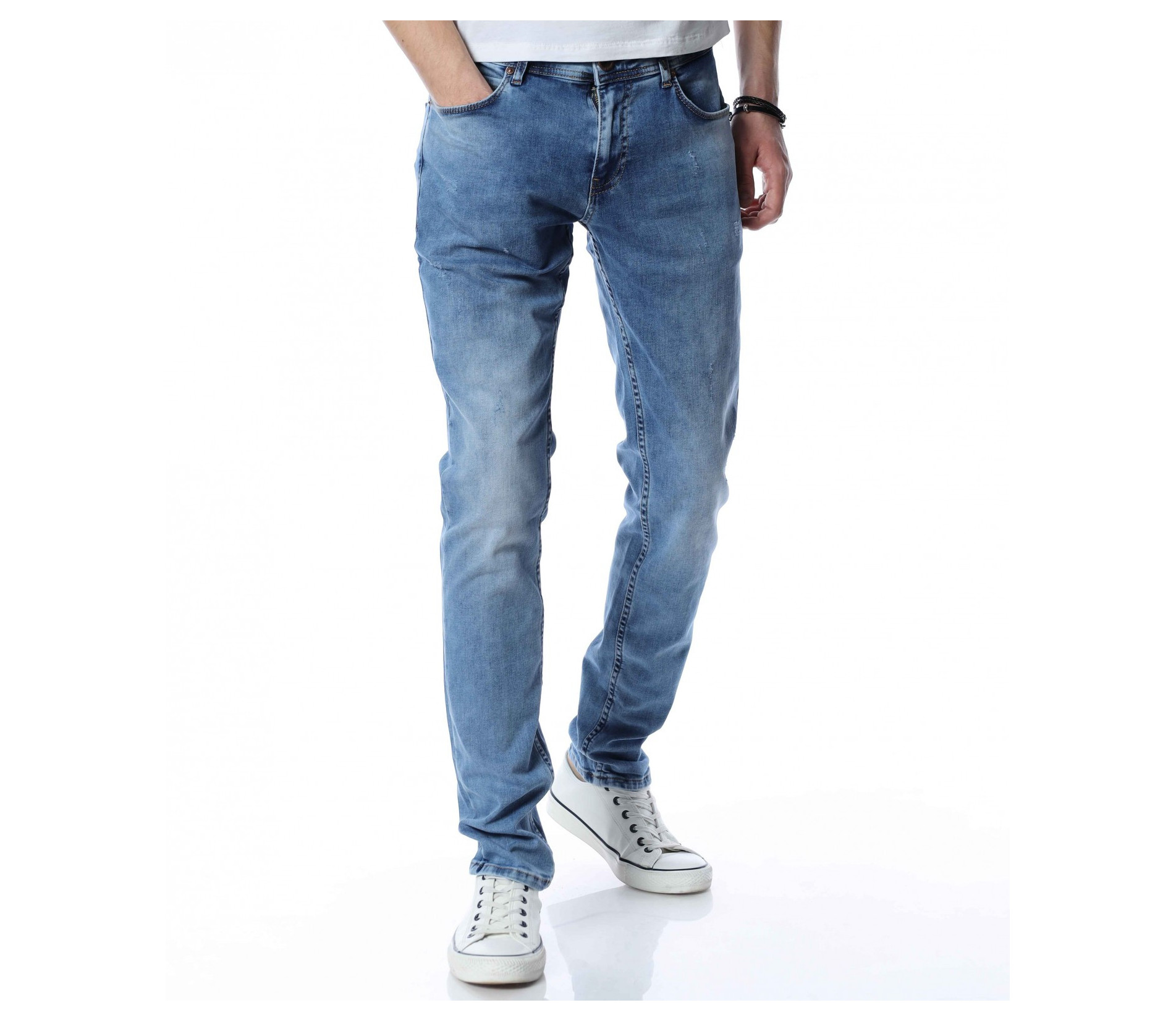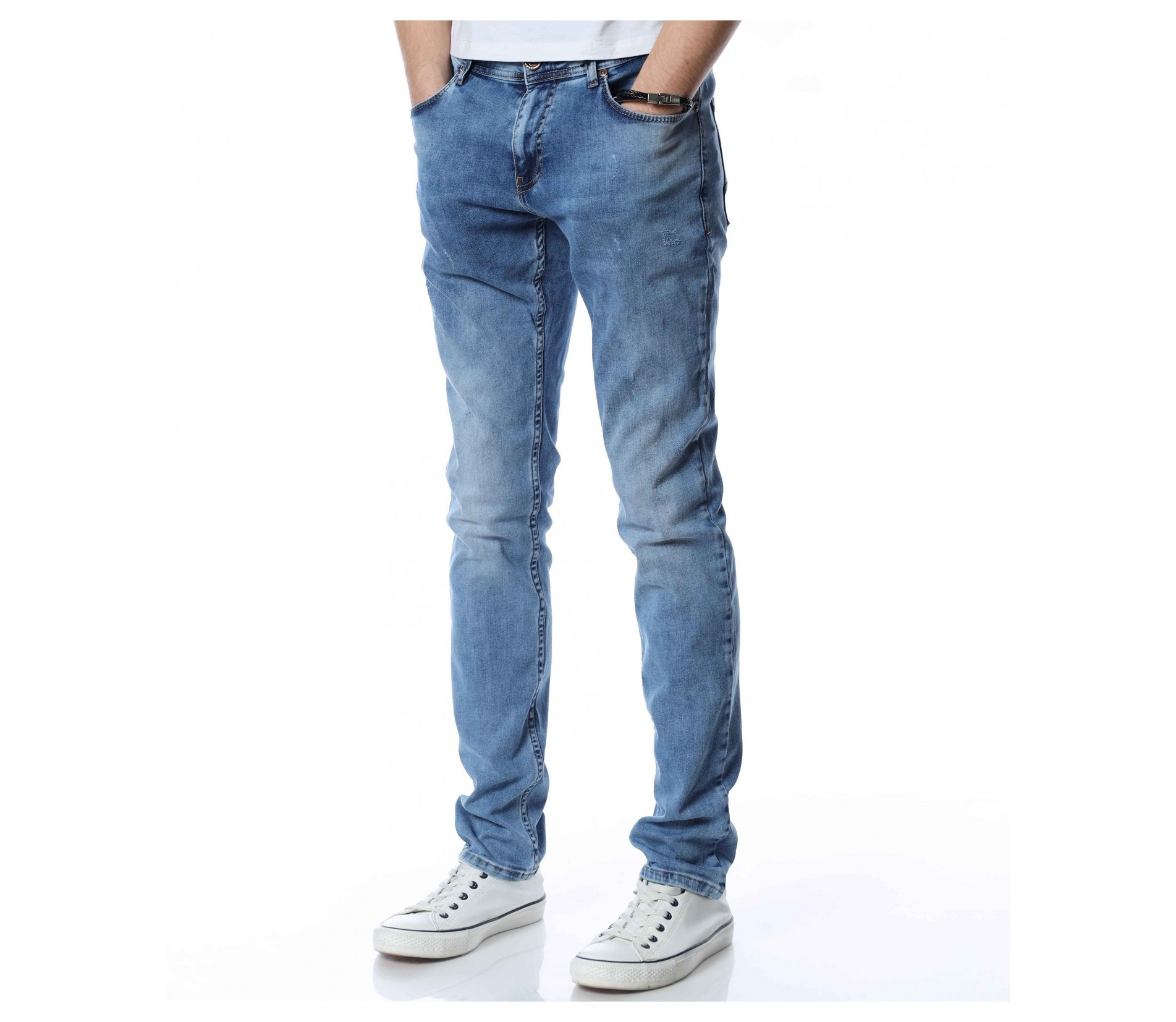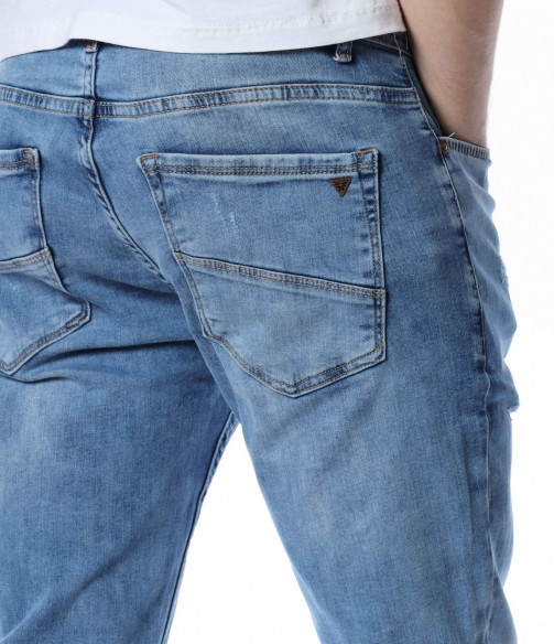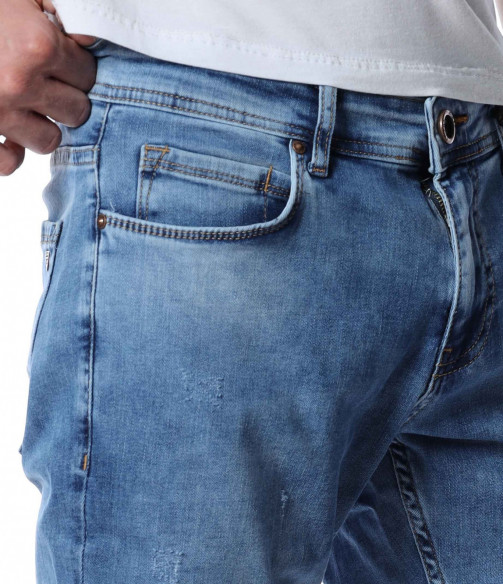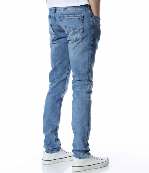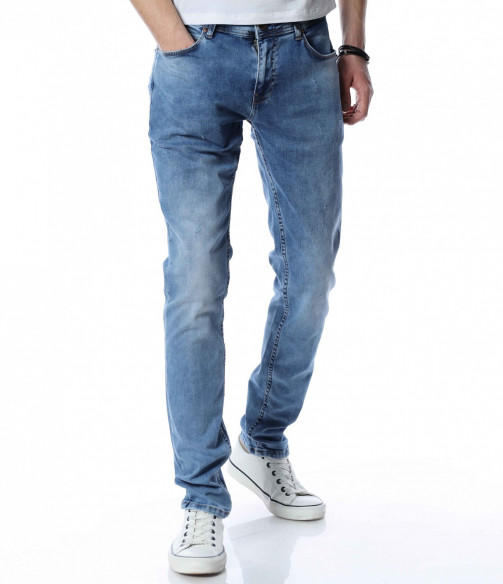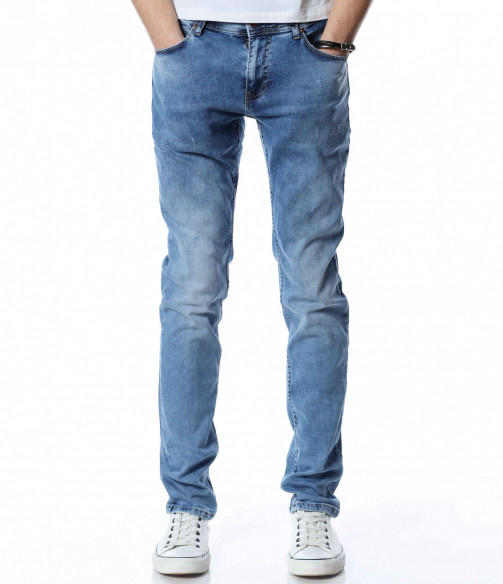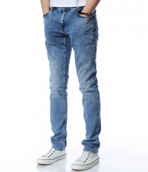ОПИСАНИЕ НА ПРОДУКТА: Мъжки стилни дълги дънки в свеж светлосин цвят. Основата на денима е напълно изчистен от орнаменти, само на места се забелязва лек протрит ефект. Този вид дънков панталон е един от най-търсените и предпочитаните при мъжете. Изключително стилен и в същото време Ви позволява чрез съчетания да го превърнете в дънките \"направени точно за Вас\". В предната и задната част са поставени по два дълбоки джоба, симетрично разположени за идеален силует на модерният Ви сет. В областта на задните джобове са поставени и акцентиращите елементи, като метална емблема изобразяваща логото на марката и ненатрапчиви светли шевове. Кройката на дънките е слим фит и е идеална за пролетно-летния сезон.