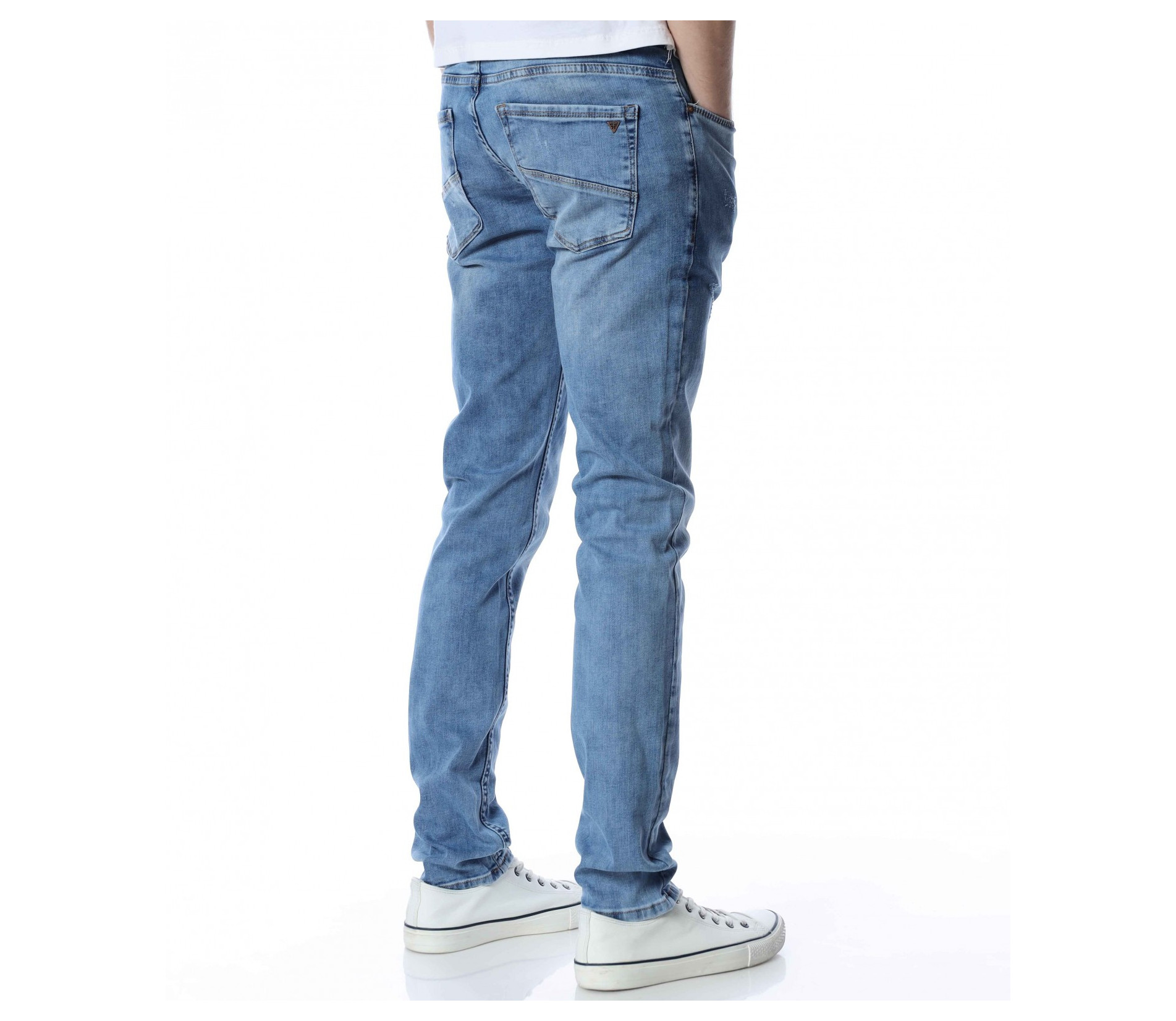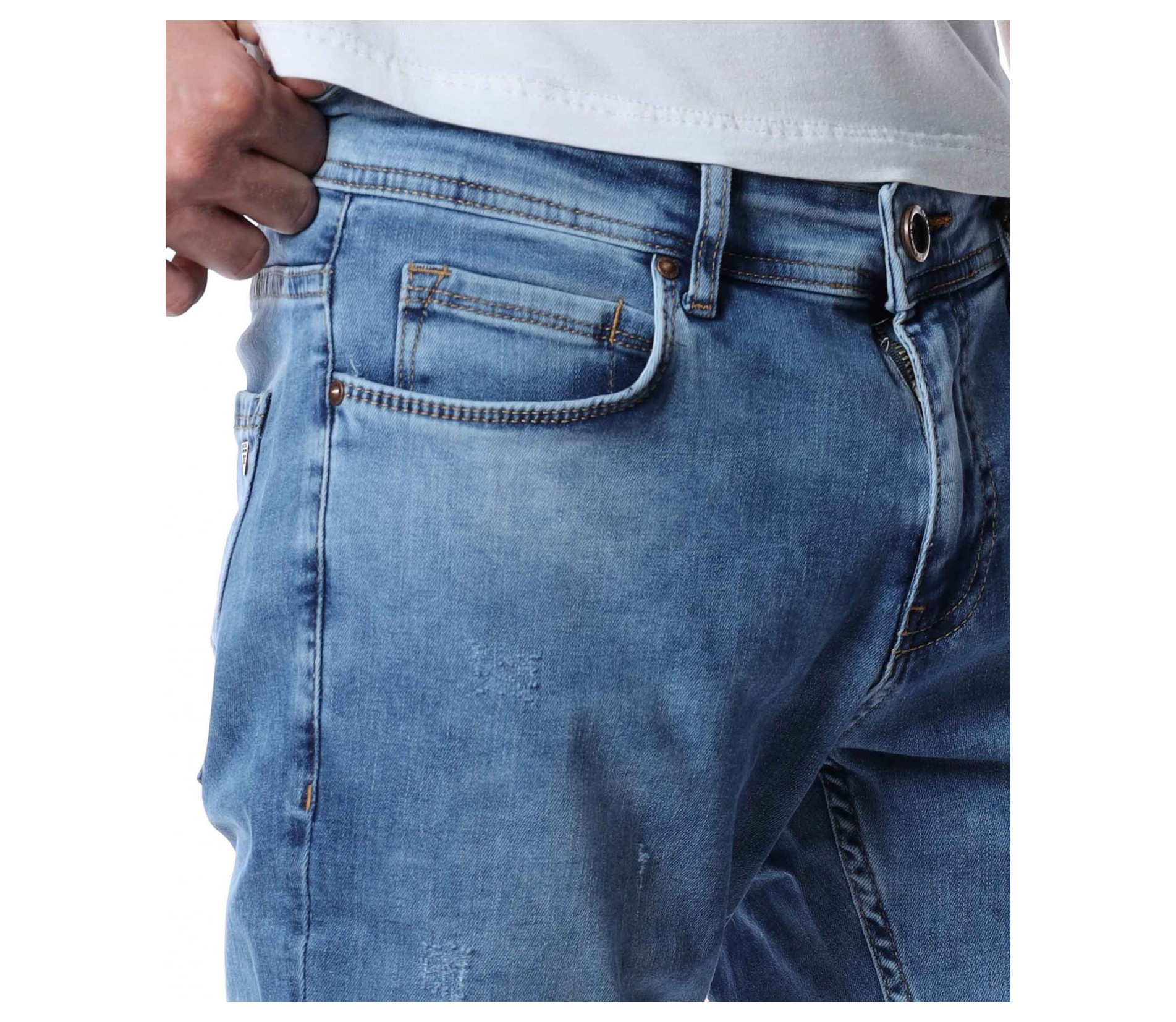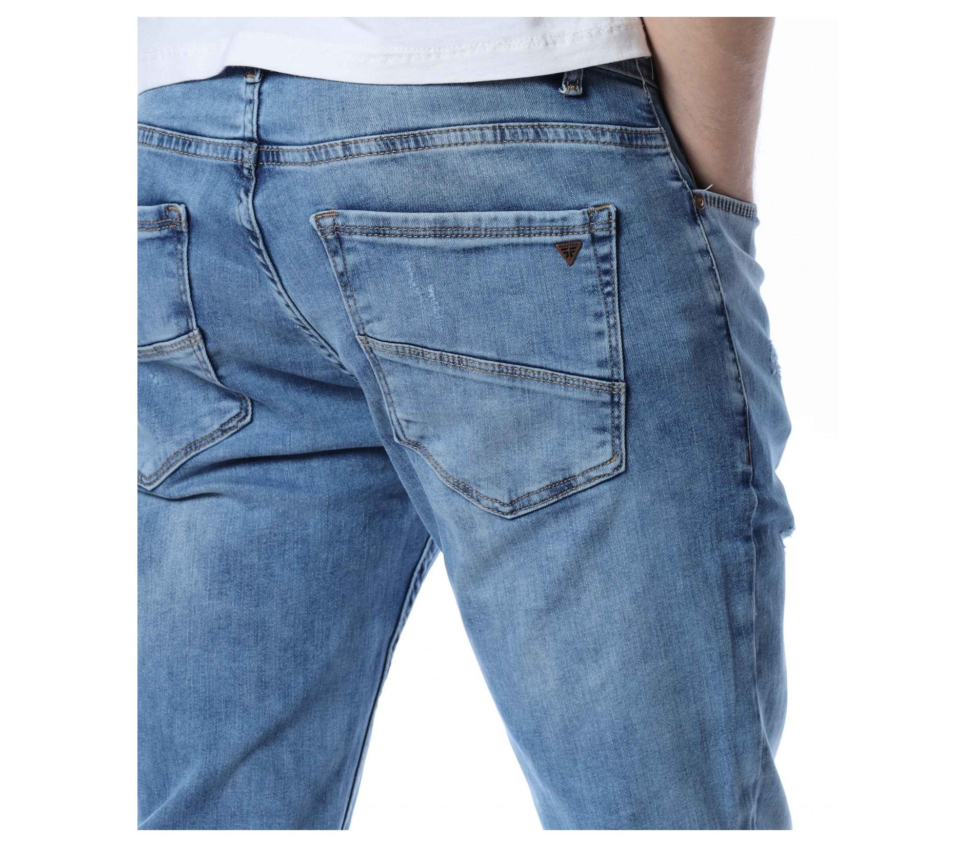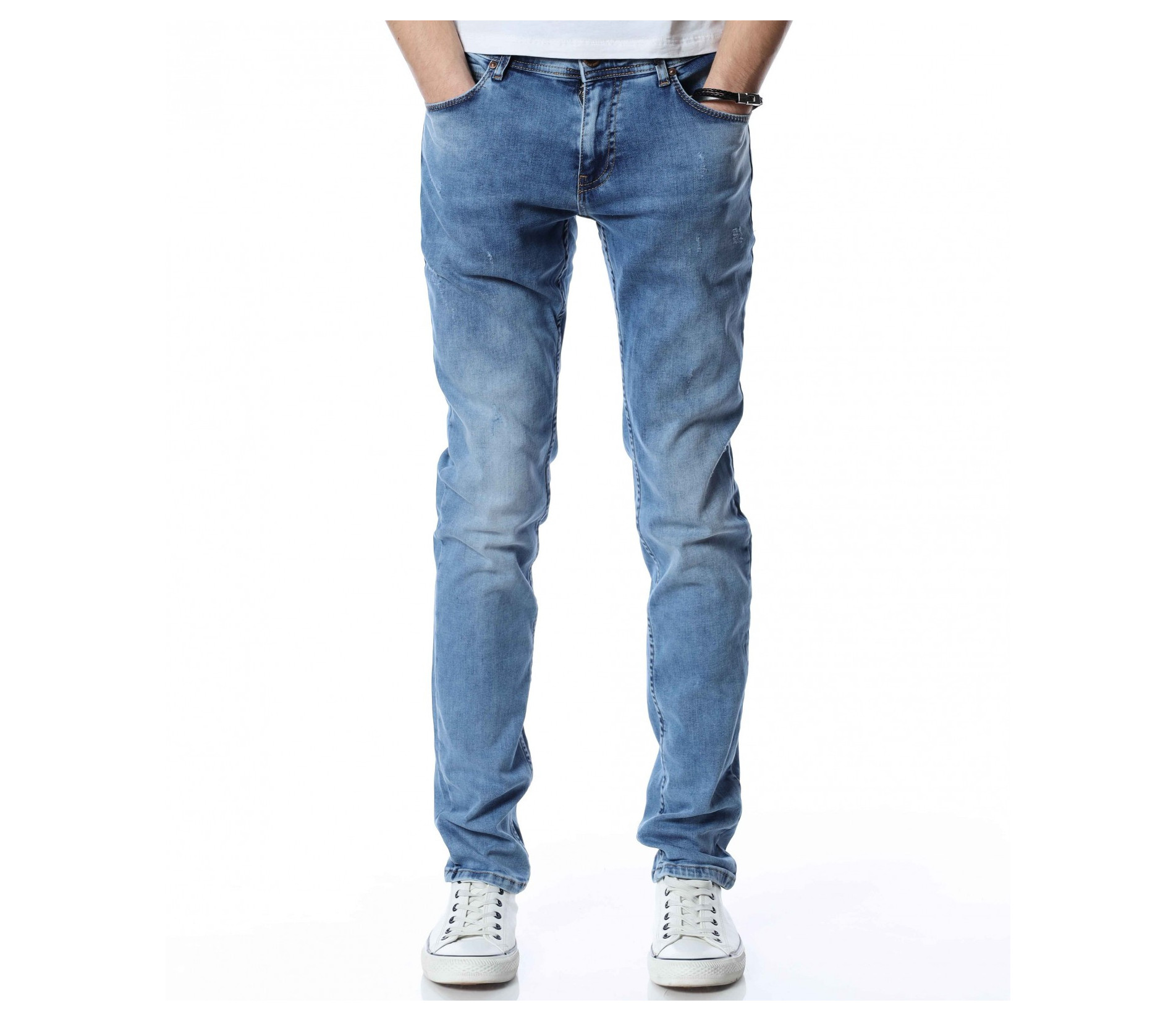 ОПИСАНИЕ НА ПРОДУКТА: Мъжки стилни дълги дънки в свеж светлосин цвят. Основата на денима е напълно изчистен от орнаменти, само на места се забелязва лек протрит ефект. Този вид дънков панталон е един от най-търсените и предпочитаните при мъжете. Изключително стилен и в същото време Ви позволява чрез съчетания да го превърнете в дънките \"направени точно за Вас\". В предната и задната част са поставени по два дълбоки джоба, симетрично разположени за идеален силует на модерният Ви сет. В областта на задните джобове са поставени и акцентиращите елементи, като метална емблема изобразяваща логото на марката и ненатрапчиви светли шевове. Кройката на дънките е слим фит и е идеална за пролетно-летния сезон.
