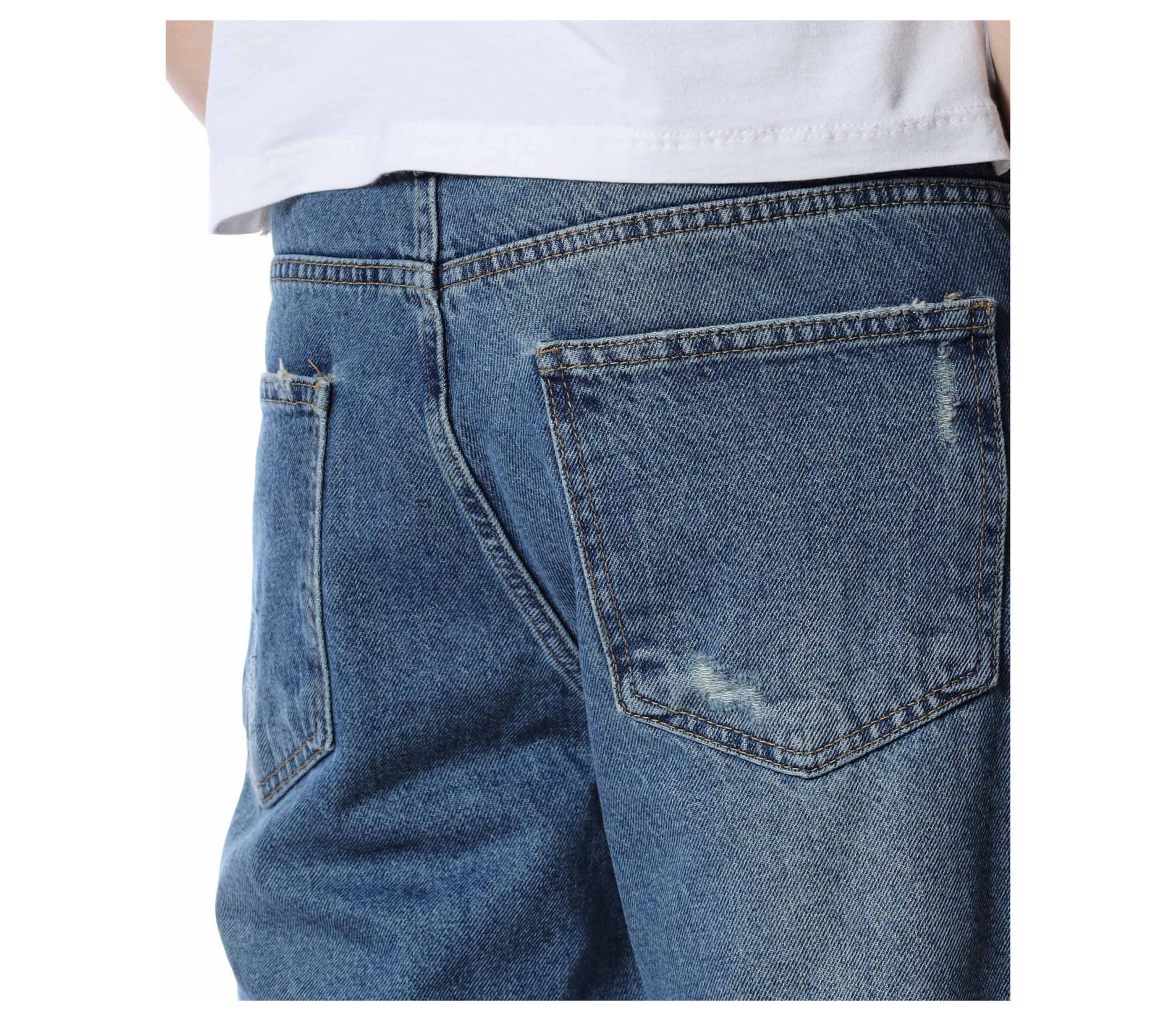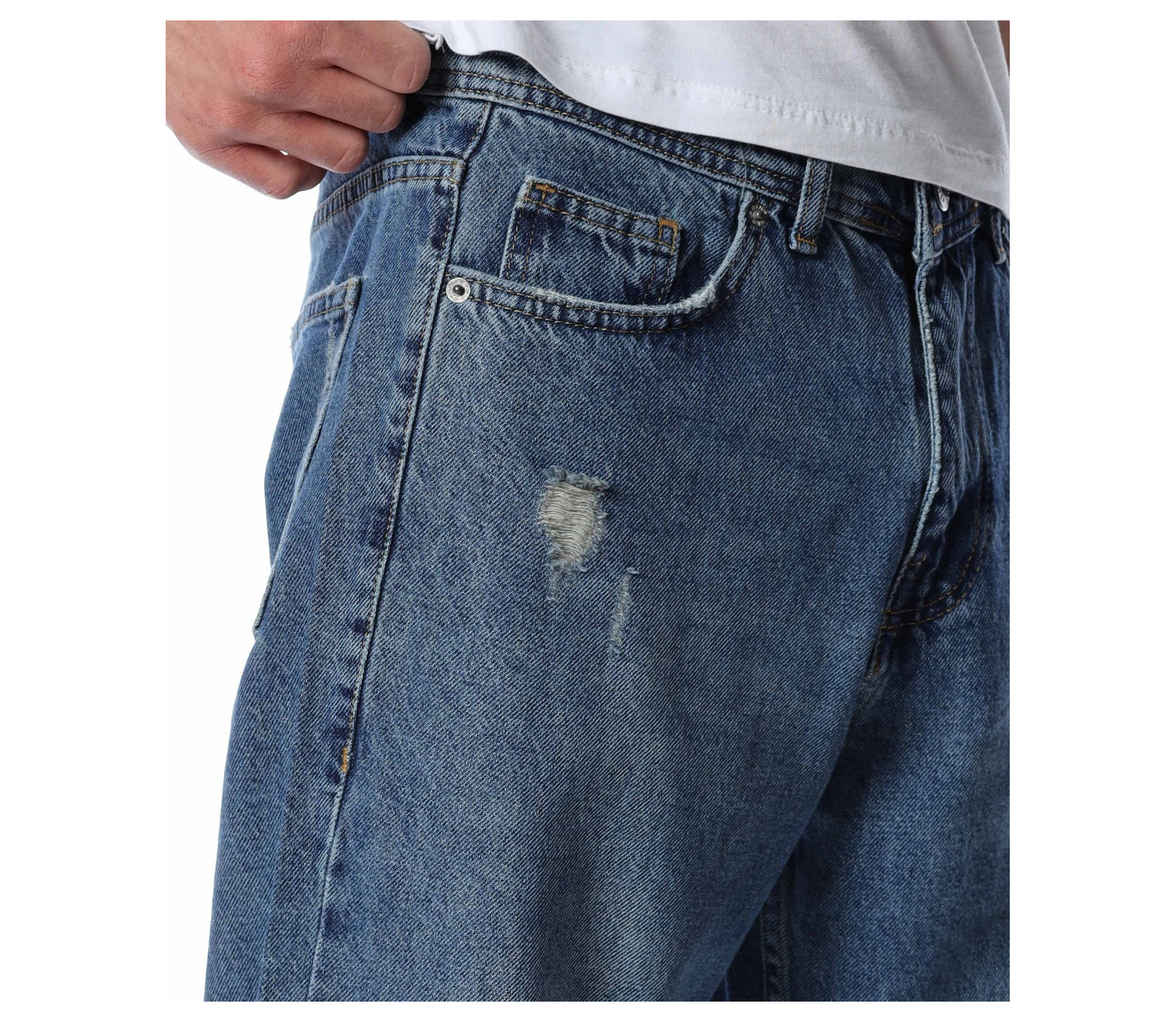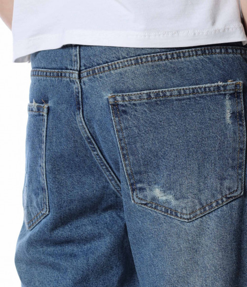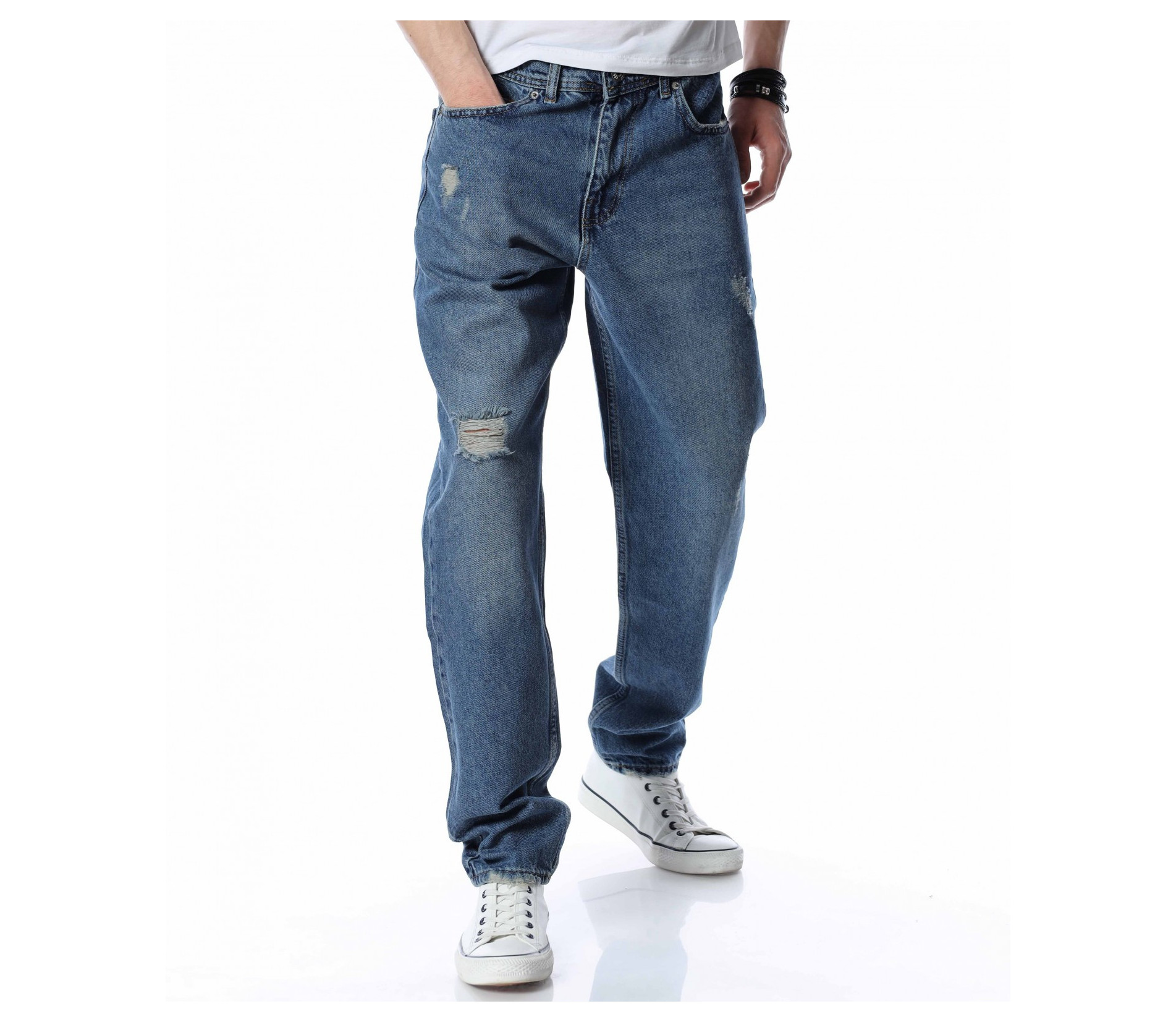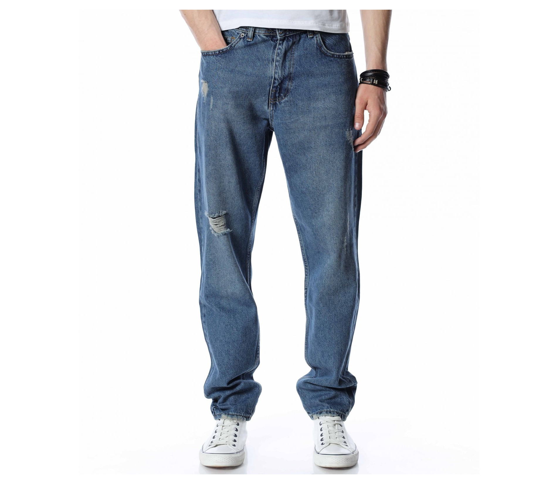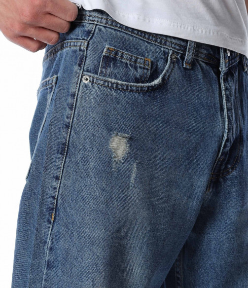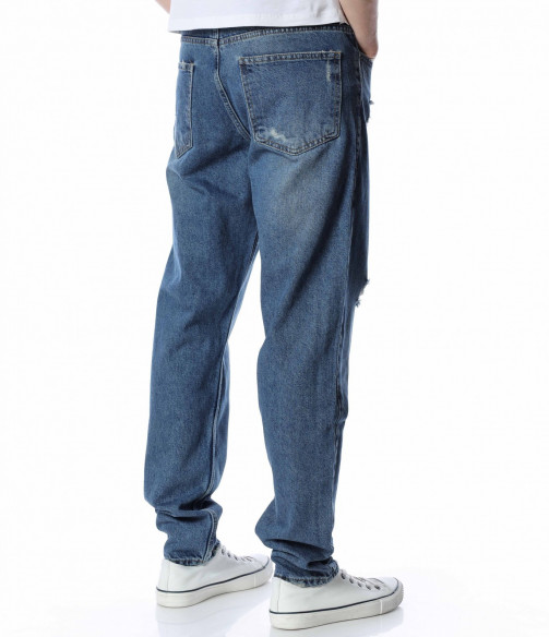 ОПИСАНИЕ НА ПРОДУКТА: Представяме Ви най-актуалната тенденция в мъжките дънки този сезон, а именно loose fit кройка. Този модел е декориран с изсветлели елементи разпръснати по предната част на модела, както и леки закъсвания по крачолите и една по-голяма кръпка на десния крачол. Закопчаването е поверено на копче и цип, а джобовете са класически. Модерно, свободно и комфортно, така ще се чувствате с този модел дънки. Съчетайте го с oversize тениска яки кецове и спортен елек и няма как да останете незабелязан.
