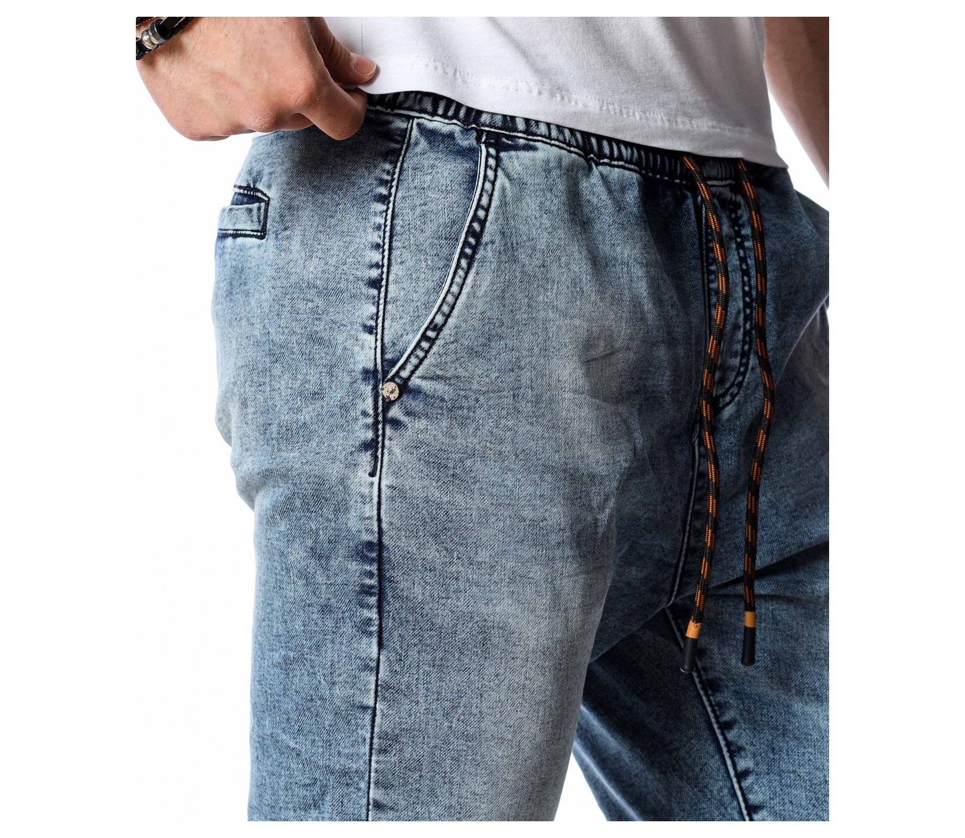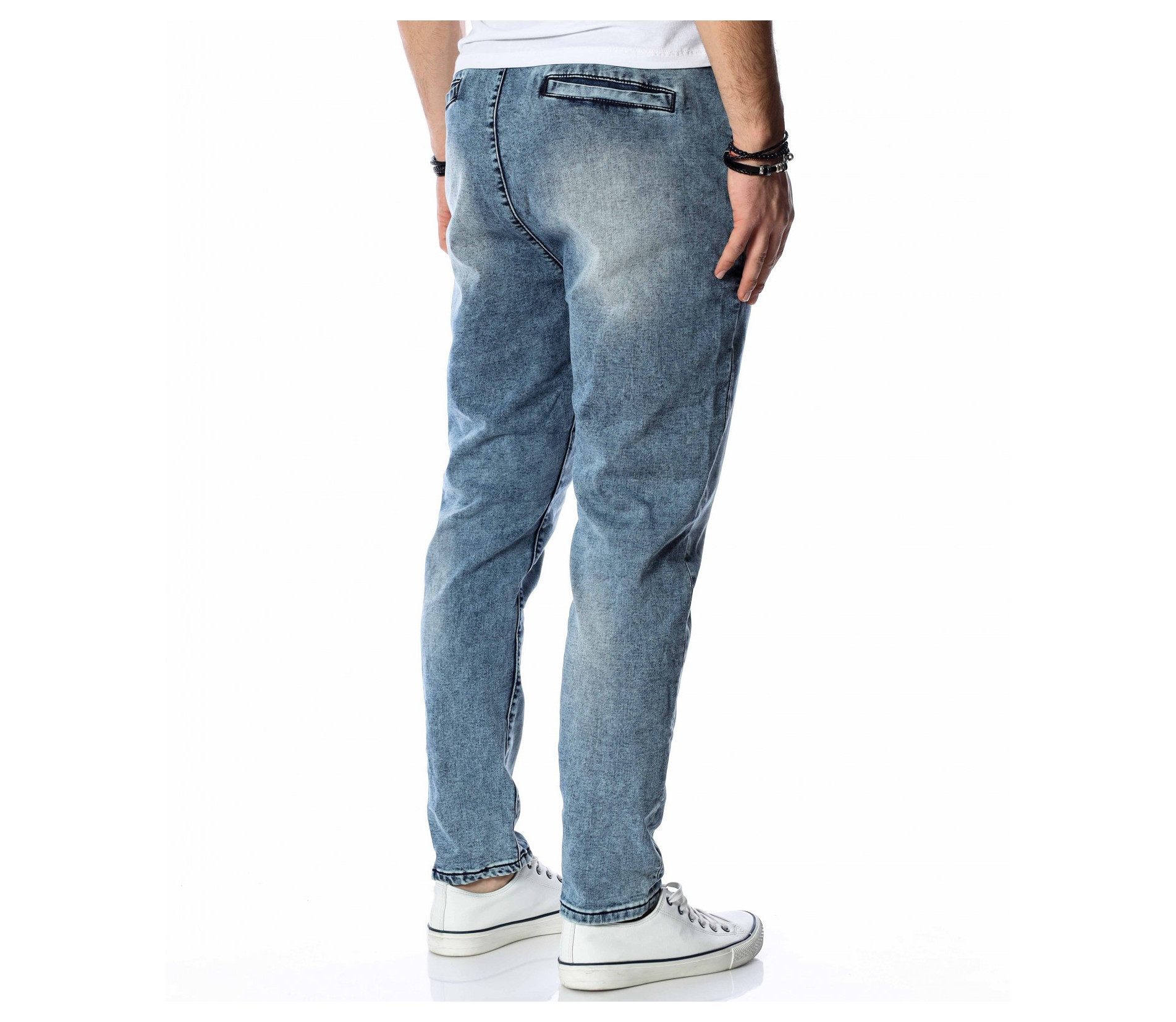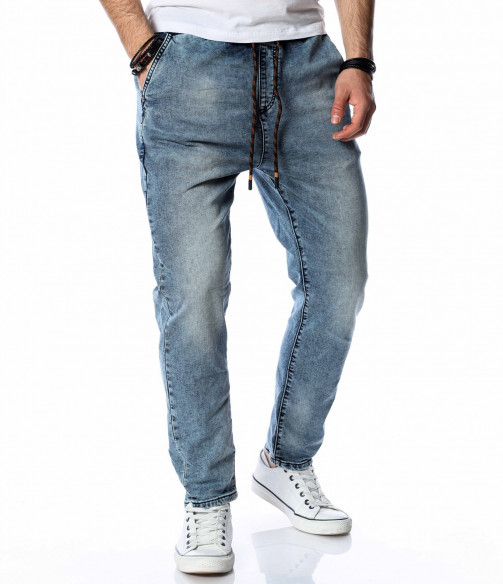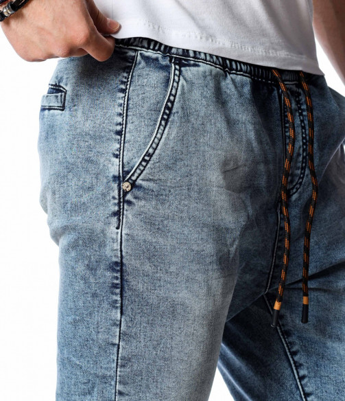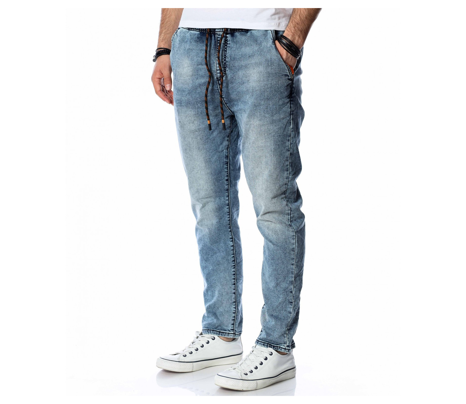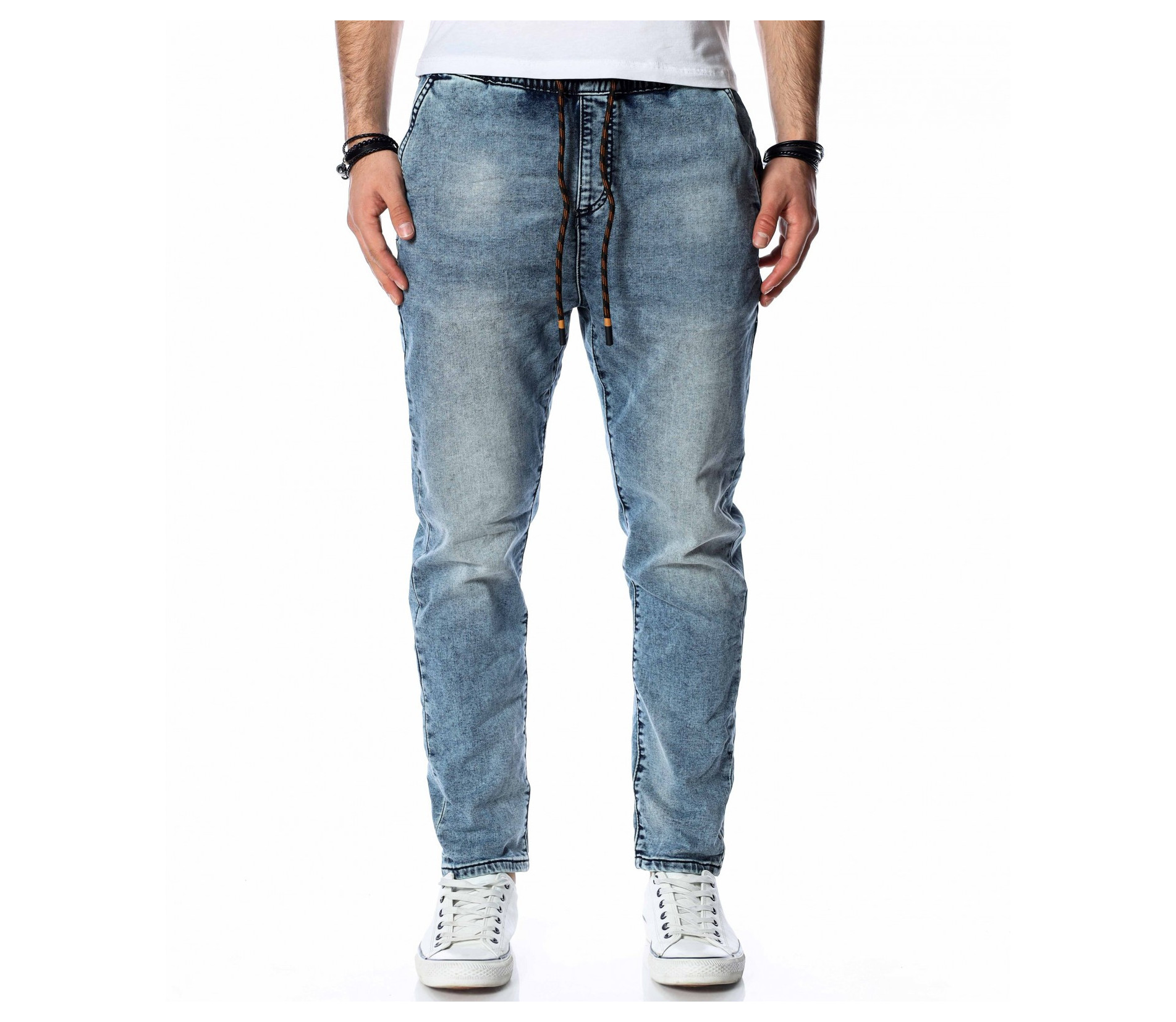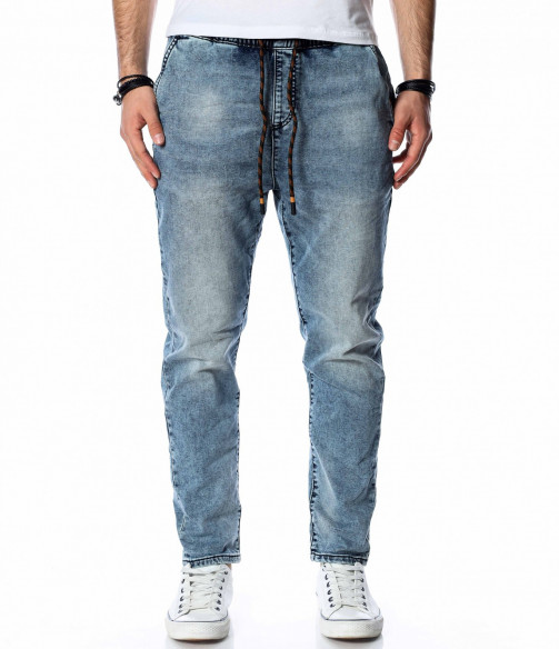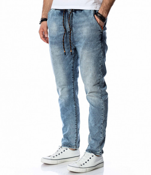 ОПИСАНИЕ НА ПРОДУКТА: Спортен модел мъжки светло сини дънки, чиято основа е леко допълнена от ненатрапчив протрит ефект. Коланът е промушен с интересна връзка, която позволява лесното регулиране на ширината, така че да на паснете модела по-свой вкус. Предните джобове са тип италиански, а задните са като на класически панталон. Всички тези елементи, класически и нестандартни успяват да създадат една изключително интересна и забележителна визия, подходяща за всеки вкус. Меката и удобна материя Ви дава възможност да замените не до там прилежните спортни долнища през почивните дни, като комбинирате дънки с удобни маратонки и актуална тениска. Бъдете по-непредвидими в избора си на дрехи, за да впечатлите себе си и околните с добрия си и иновативен вкус.