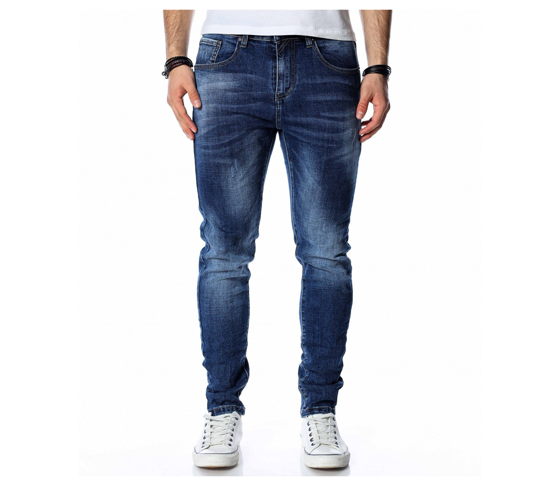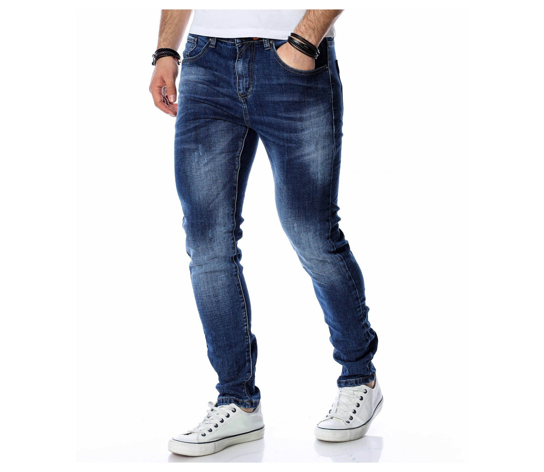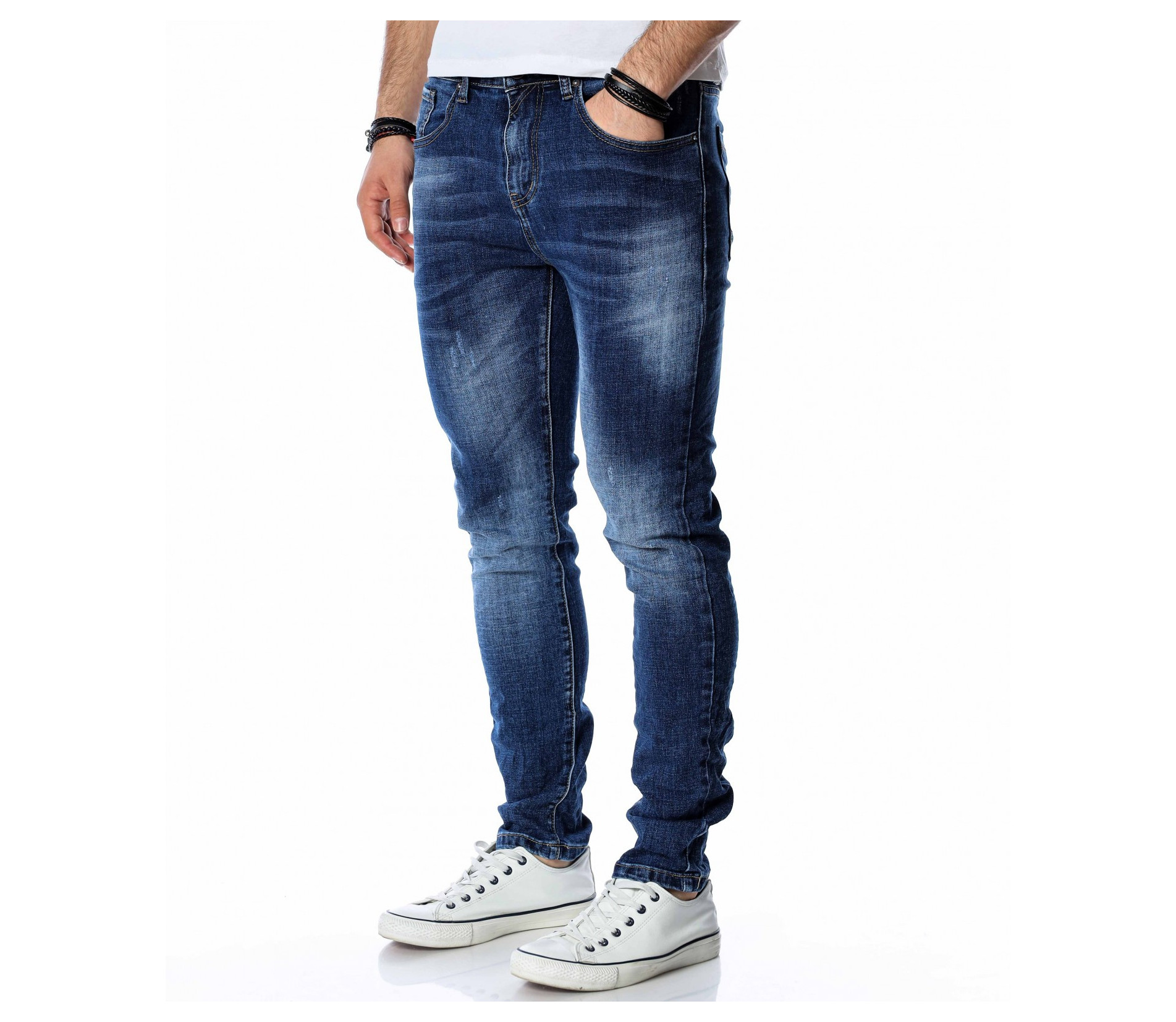 ОПИСАНИЕ НА ПРОДУКТА: Супер актуален модел мъжки дънки в класически тъмно син цвят. Както в предната, така и в задната част цветът на джинсите е атрактивно изсветлен, като се създава една модерна визия, наситена с фешън излъчване. В предната и задната част на дънките са поставени по два дълбоки джоба, като са акцентирани с хоризонтални линии в същия цвят. Като ценители на перфектния външен вид, смело Ви препоръчване този уникален дънков панталон, съчетаващ в себе си актуална slim fit кройка, наситен цвят и 100% гарантиран комфорт. За създаването на идеалният аутфит, заложете на този деним в комбинация със свежа клубна тениска, спортно-елегантни кецове и удобна връхна дреха.