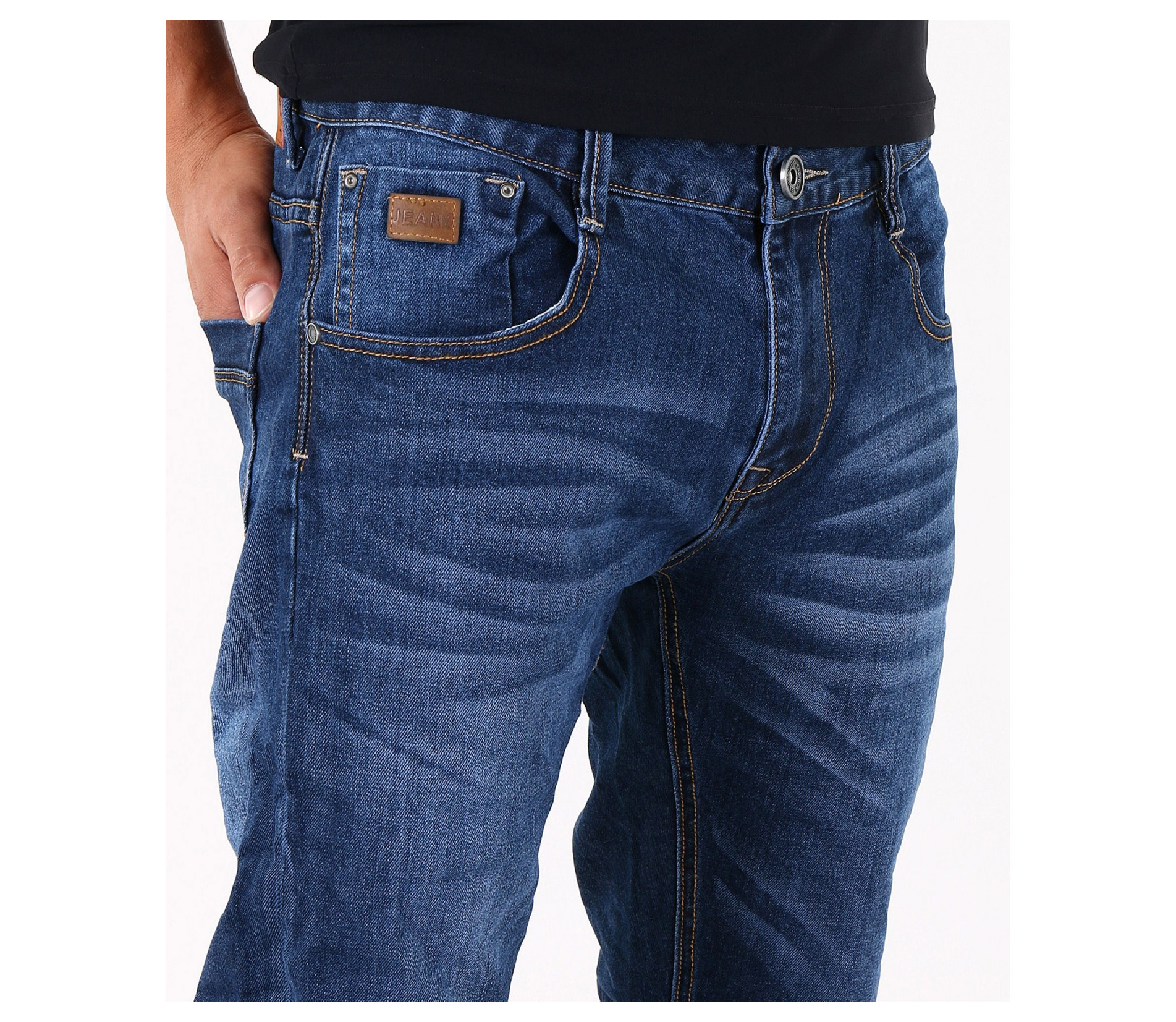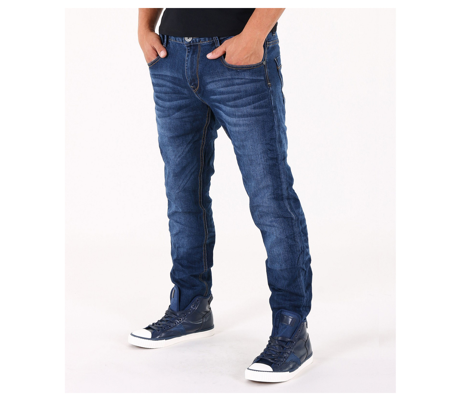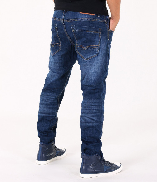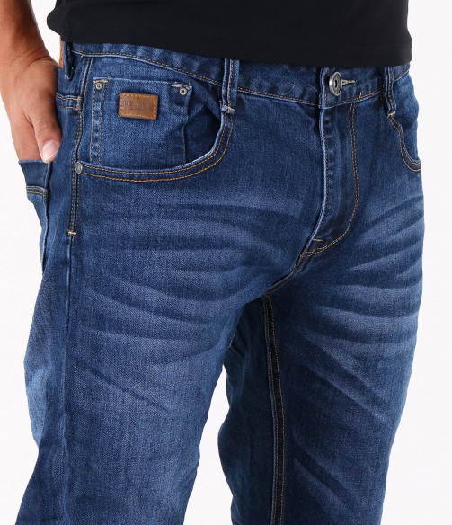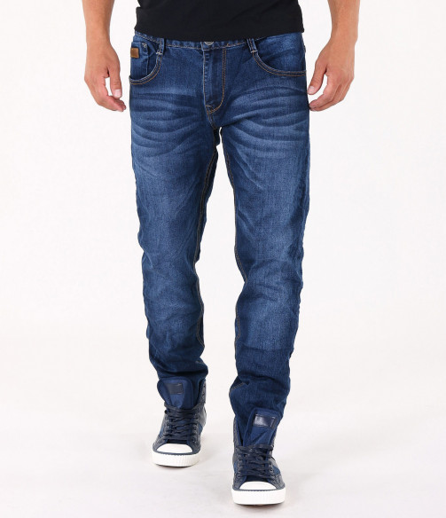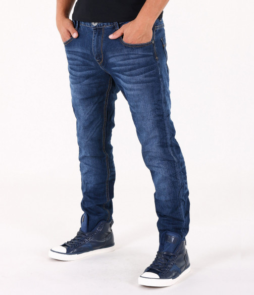 Описание на продукта: Предлагаме на вашето внимание стилен и изчистен модел мъжки дънки, подходящи както за ежедневието, така и за по-специален повод. Те са във вечно актуалния семпъл десен, в тъмно син цвят. Единствения акцентиращ елемент в този модел джинси е леко избелелия ефект, разположен по цялата дължина на крачолите, умело пресъздавайки ненатрапчиви гънки. Има удобно разположени два предни и два задни джоба, декорирани с цветни шевове. На предния десен джоб има поставен още един по-малък такъв, декориран с малко лого. Бъди в крак с модните тенденции!