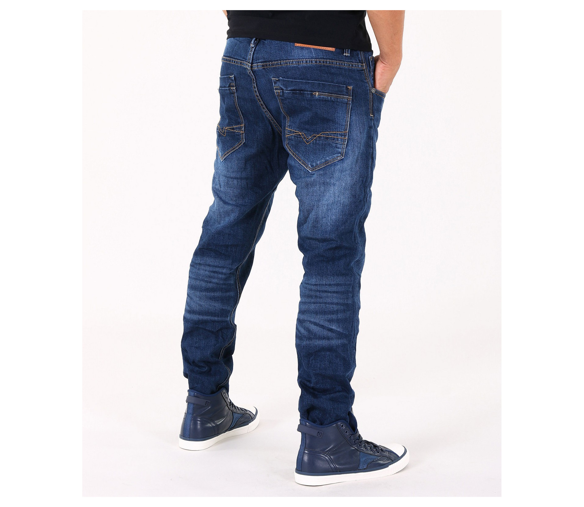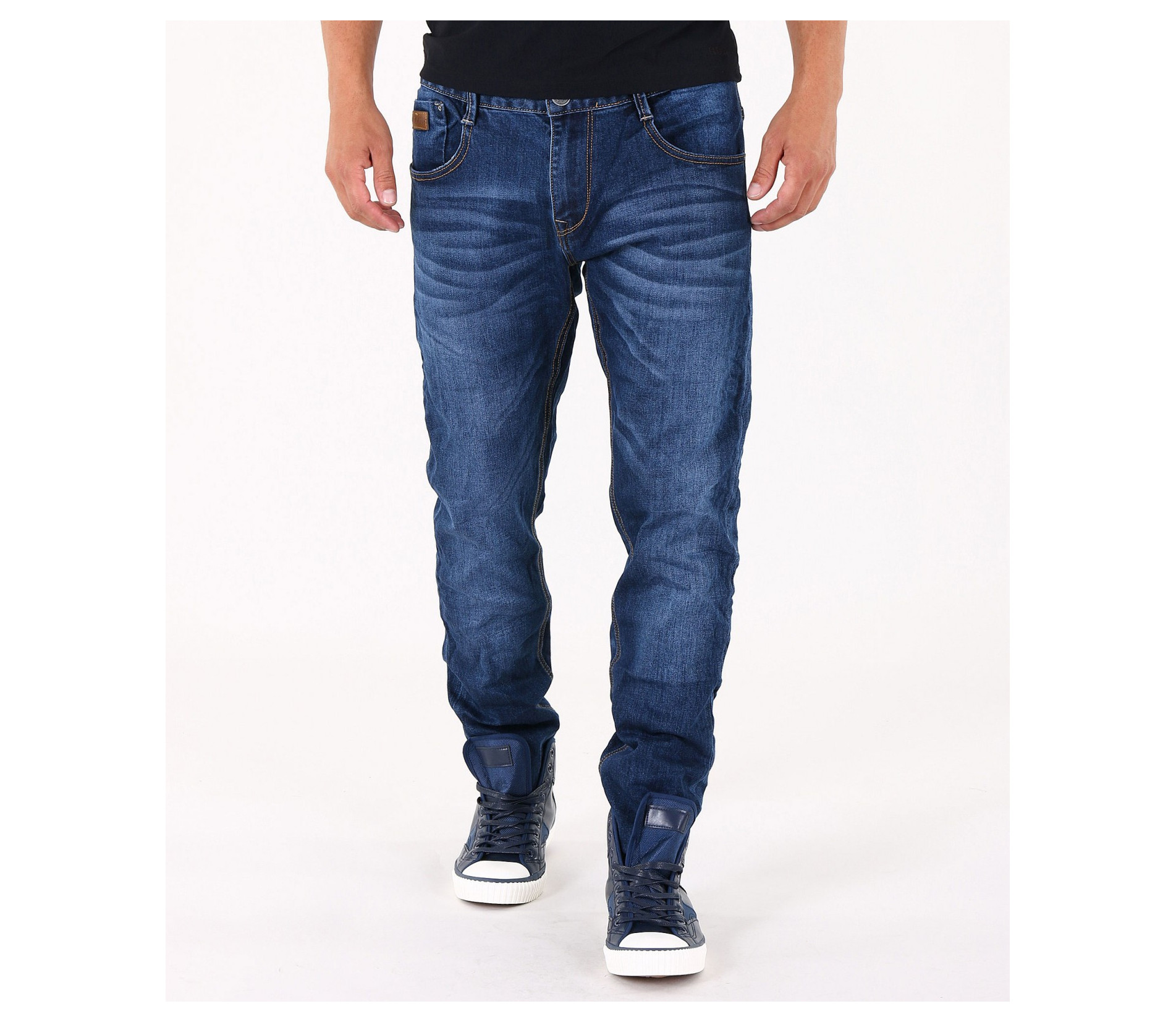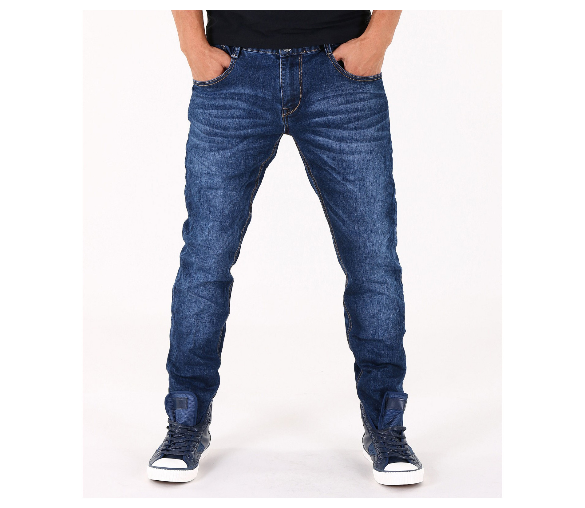 Описание на продукта: Предлагаме на вашето внимание стилен и изчистен модел мъжки дънки, подходящи както за ежедневието, така и за по-специален повод. Те са във вечно актуалния семпъл десен, в тъмно син цвят. Единствения акцентиращ елемент в този модел джинси е леко избелелия ефект, разположен по цялата дължина на крачолите, умело пресъздавайки ненатрапчиви гънки. Има удобно разположени два предни и два задни джоба, декорирани с цветни шевове. На предния десен джоб има поставен още един по-малък такъв, декориран с малко лого. Бъди в крак с модните тенденции!