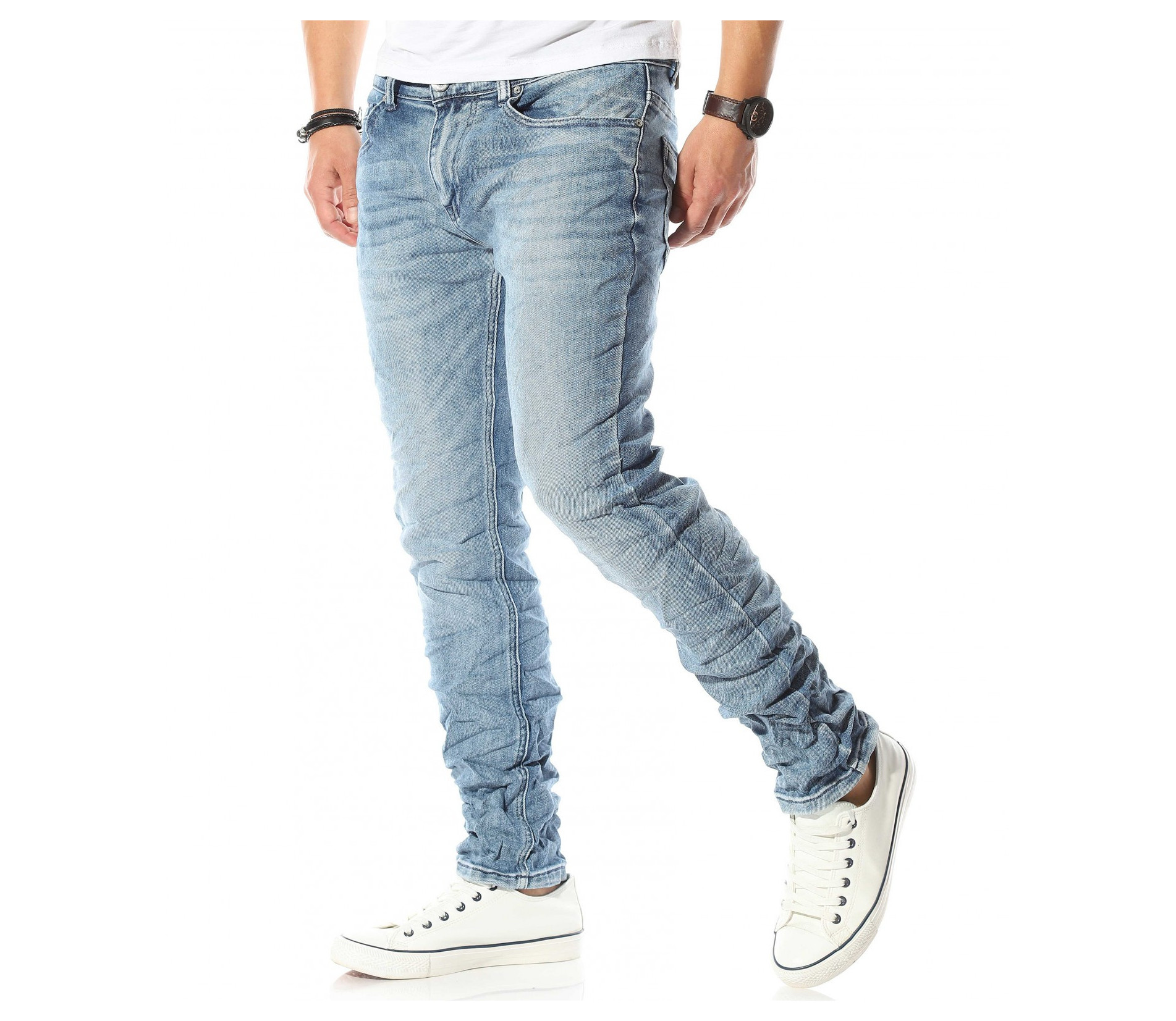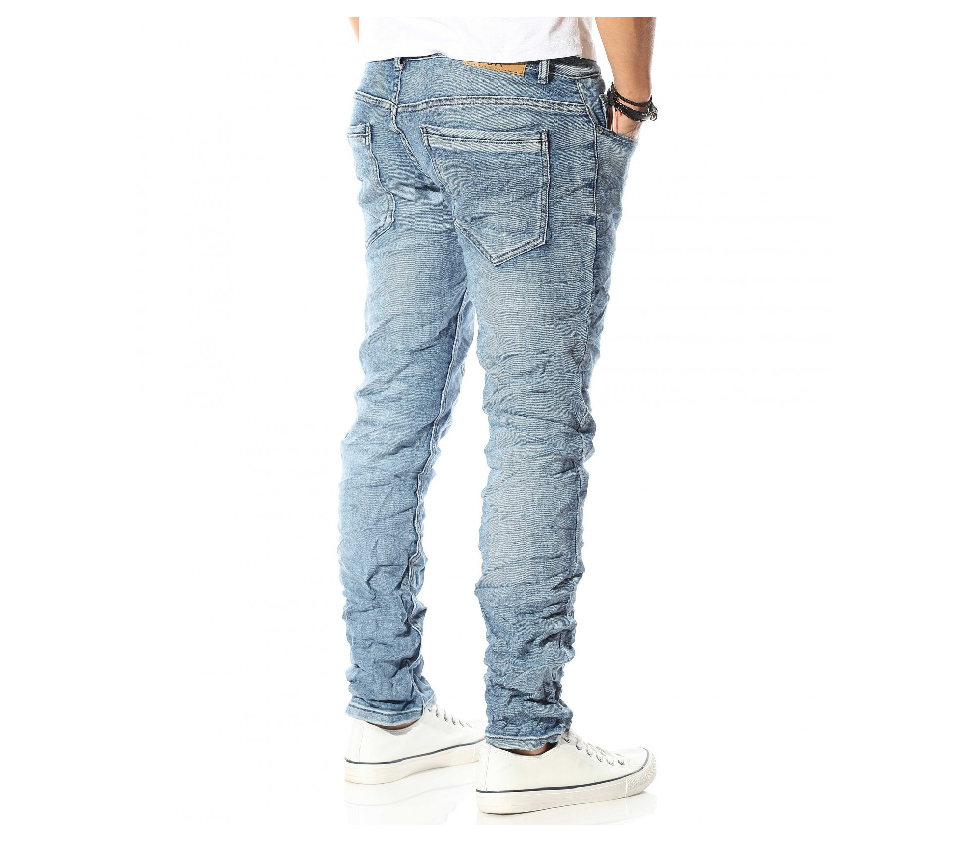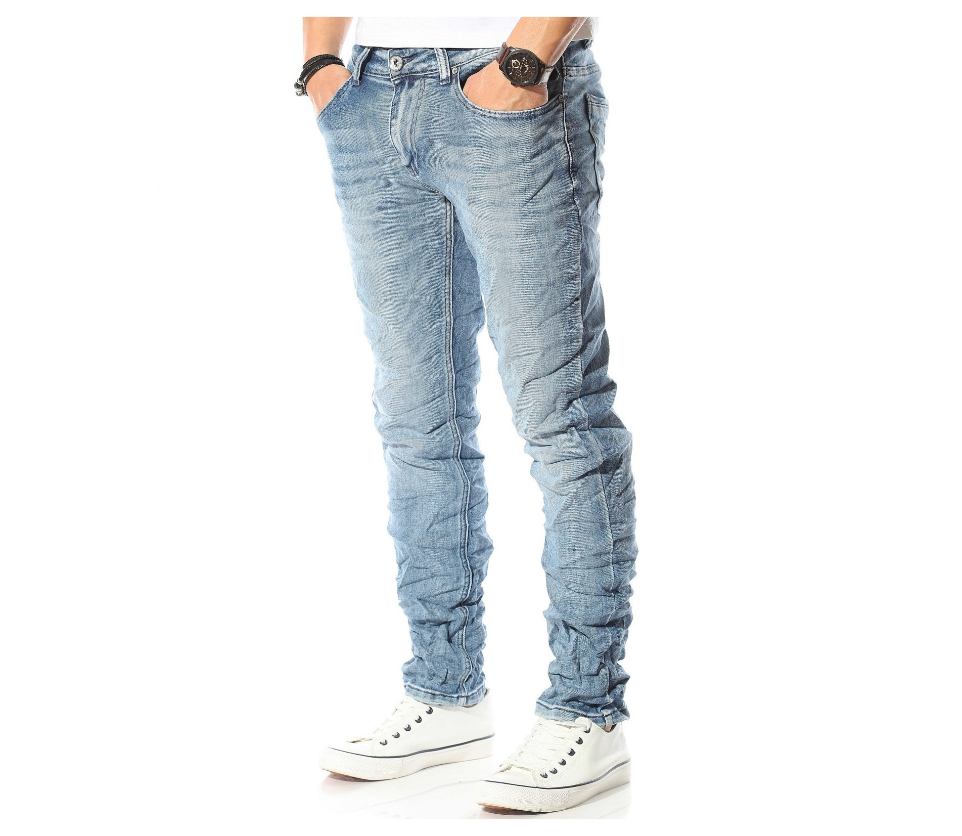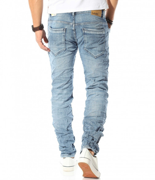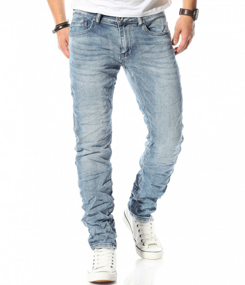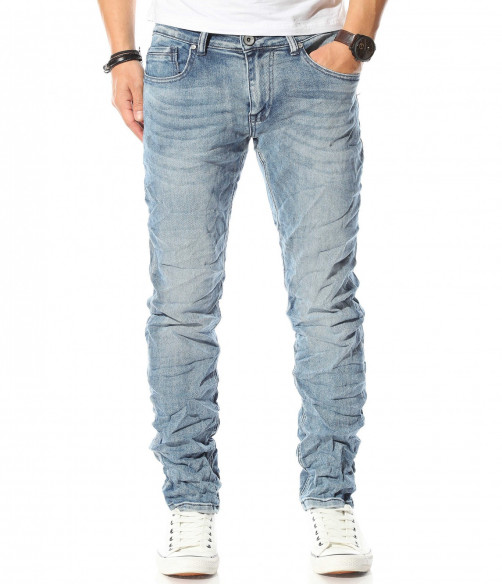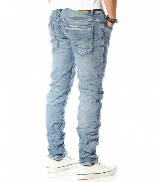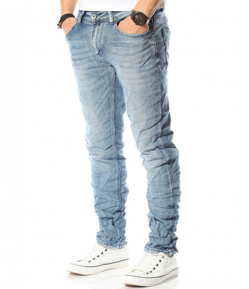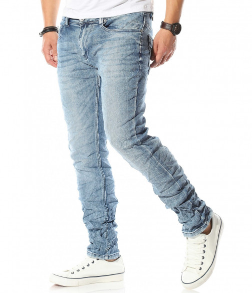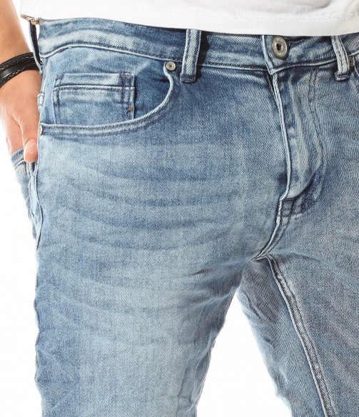 Описание на продукта: Ежедневен модел мъжки светло сини дънки, следващи линията на тялото, като изграждат перфектен силует. Благодарение на прецизно изработената кройка, прилягаща по краката в slim линия, този модел е перфектното решение за всеки имидж и стайлинг. Нюансът, подбран за основен е комбинация между светло син цвят и бели части, които смело преливат в един тон. В предната и задната част са поставени по два джоба, които са неизменна част от денимът. По основата на крачолите се подчертан и още един мотив, смело разчупващ дизайнът, а именно фабрично намачкан акцент, деликатно с лека закачка внасящ разнообразие и настроение. За комбинация може да се доверите на богата палитра в цветови аспект на тениски, блузи, връхни дрехи и обувки.