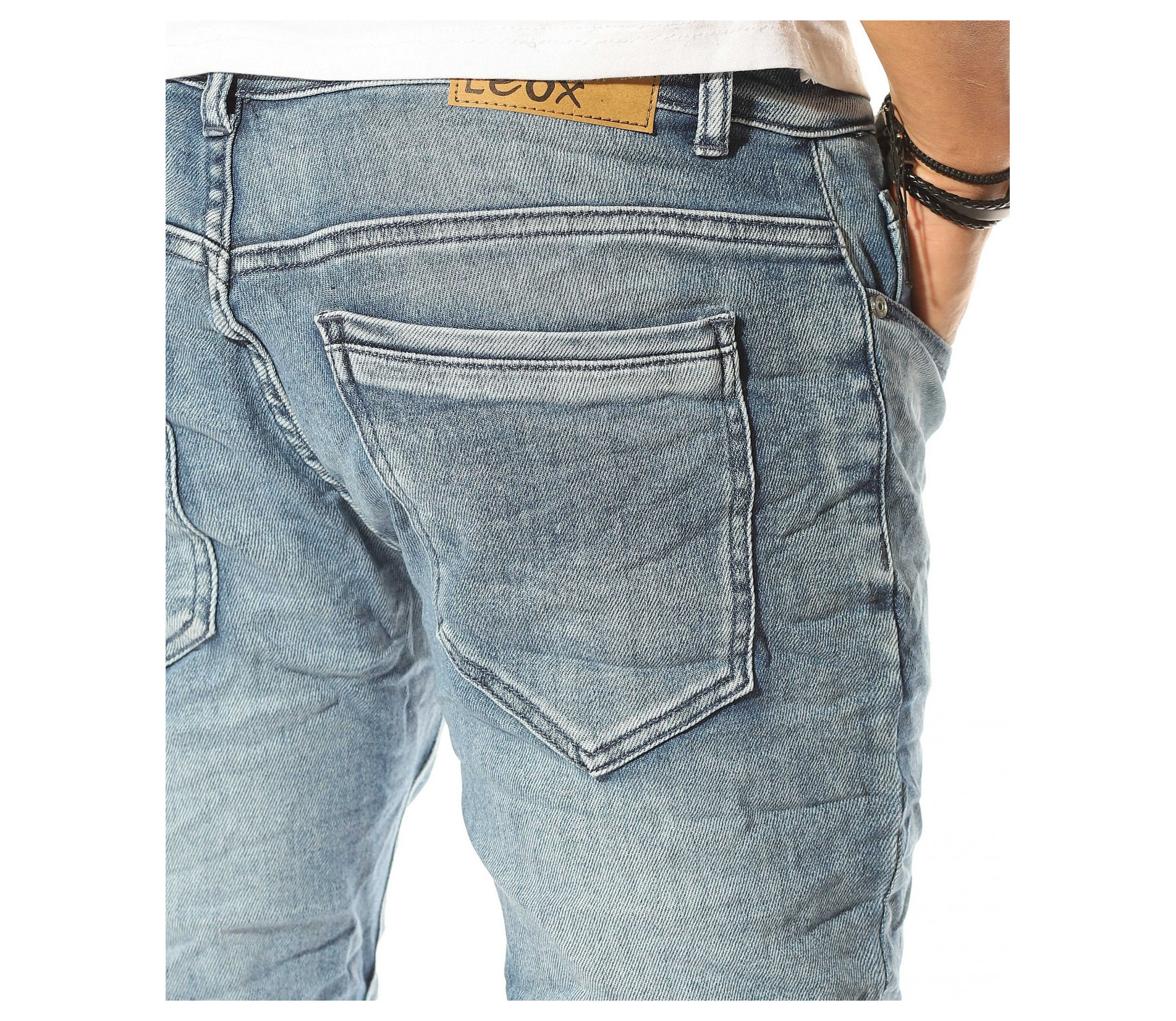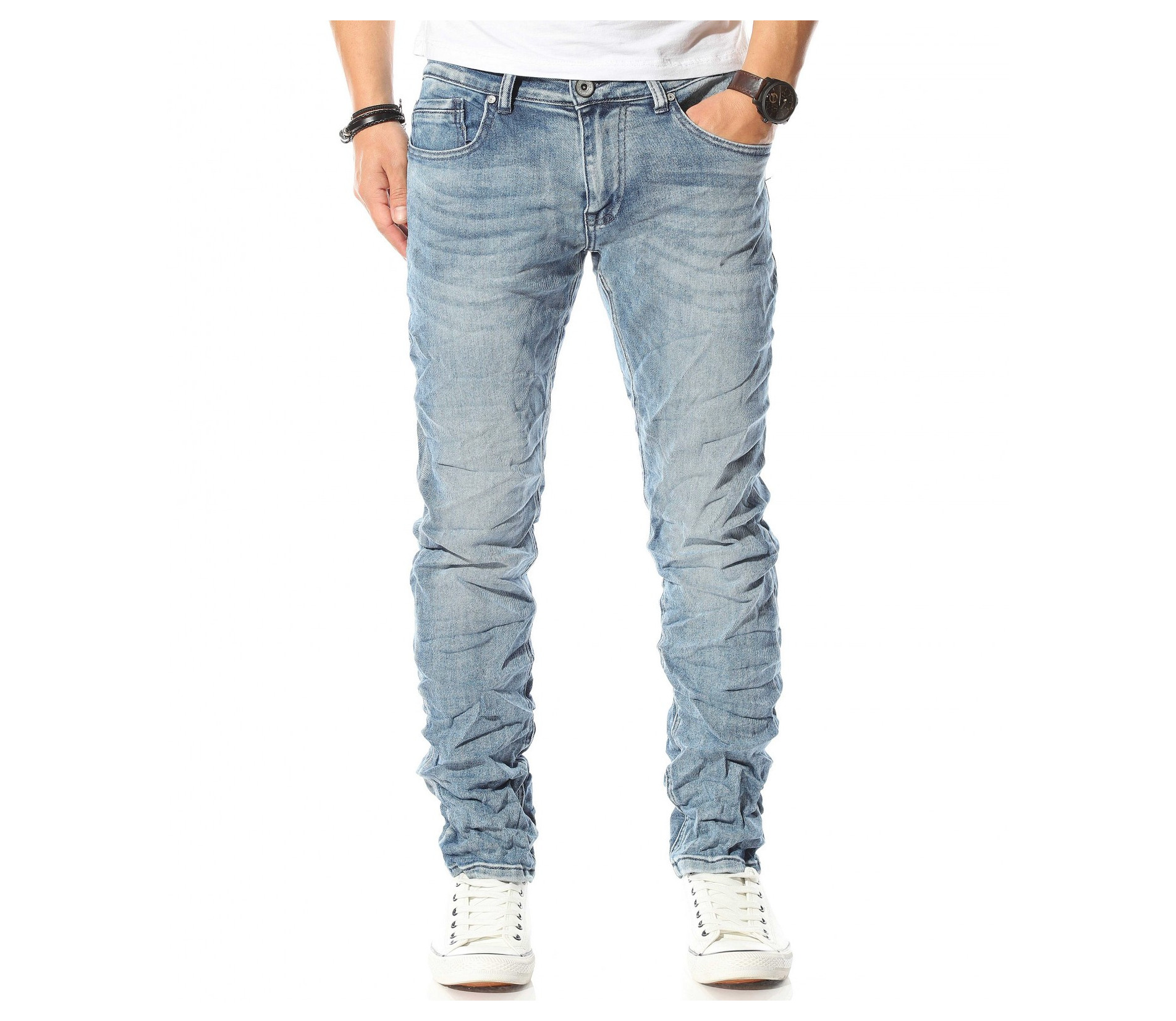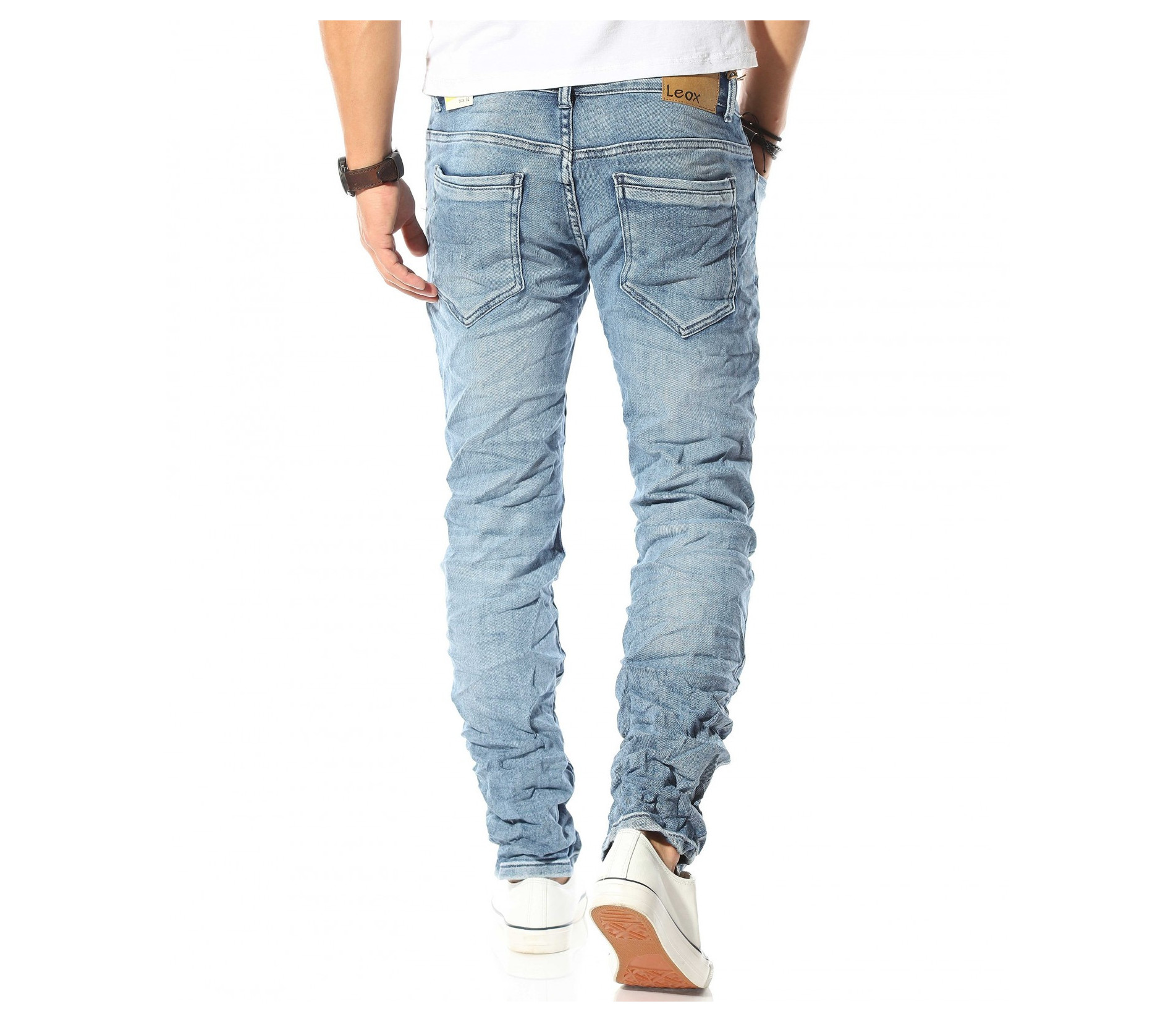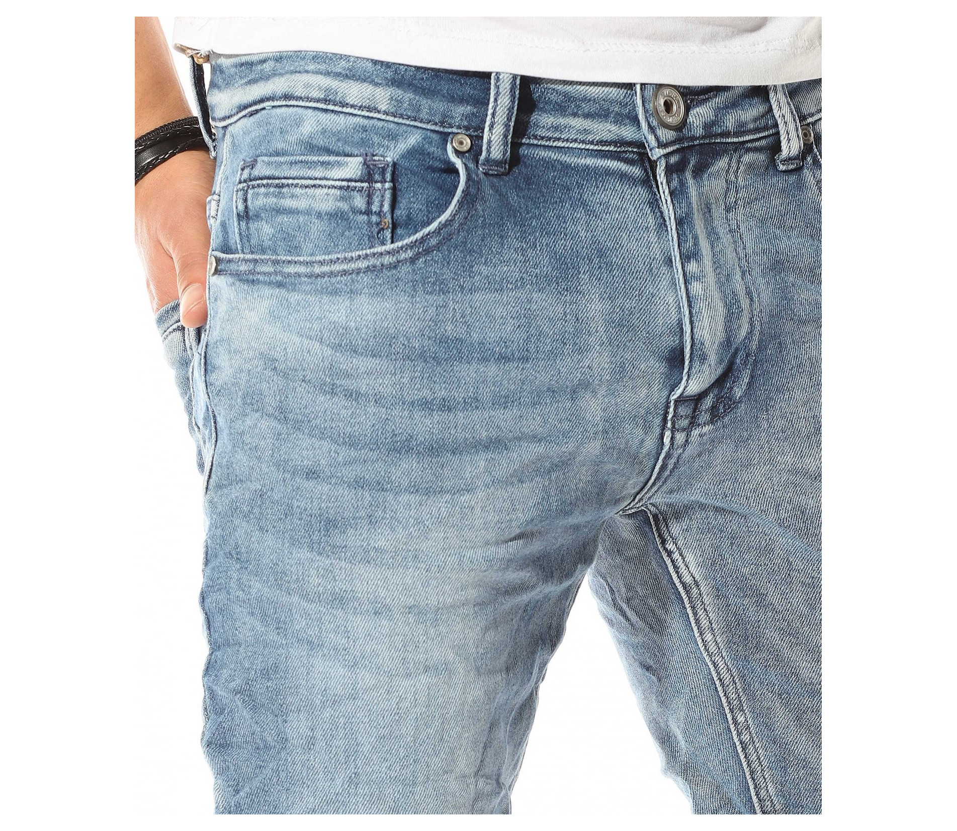 Описание на продукта: Ежедневен модел мъжки светло сини дънки, следващи линията на тялото, като изграждат перфектен силует. Благодарение на прецизно изработената кройка, прилягаща по краката в slim линия, този модел е перфектното решение за всеки имидж и стайлинг. Нюансът, подбран за основен е комбинация между светло син цвят и бели части, които смело преливат в един тон. В предната и задната част са поставени по два джоба, които са неизменна част от денимът. По основата на крачолите се подчертан и още един мотив, смело разчупващ дизайнът, а именно фабрично намачкан акцент, деликатно с лека закачка внасящ разнообразие и настроение. За комбинация може да се доверите на богата палитра в цветови аспект на тениски, блузи, връхни дрехи и обувки.