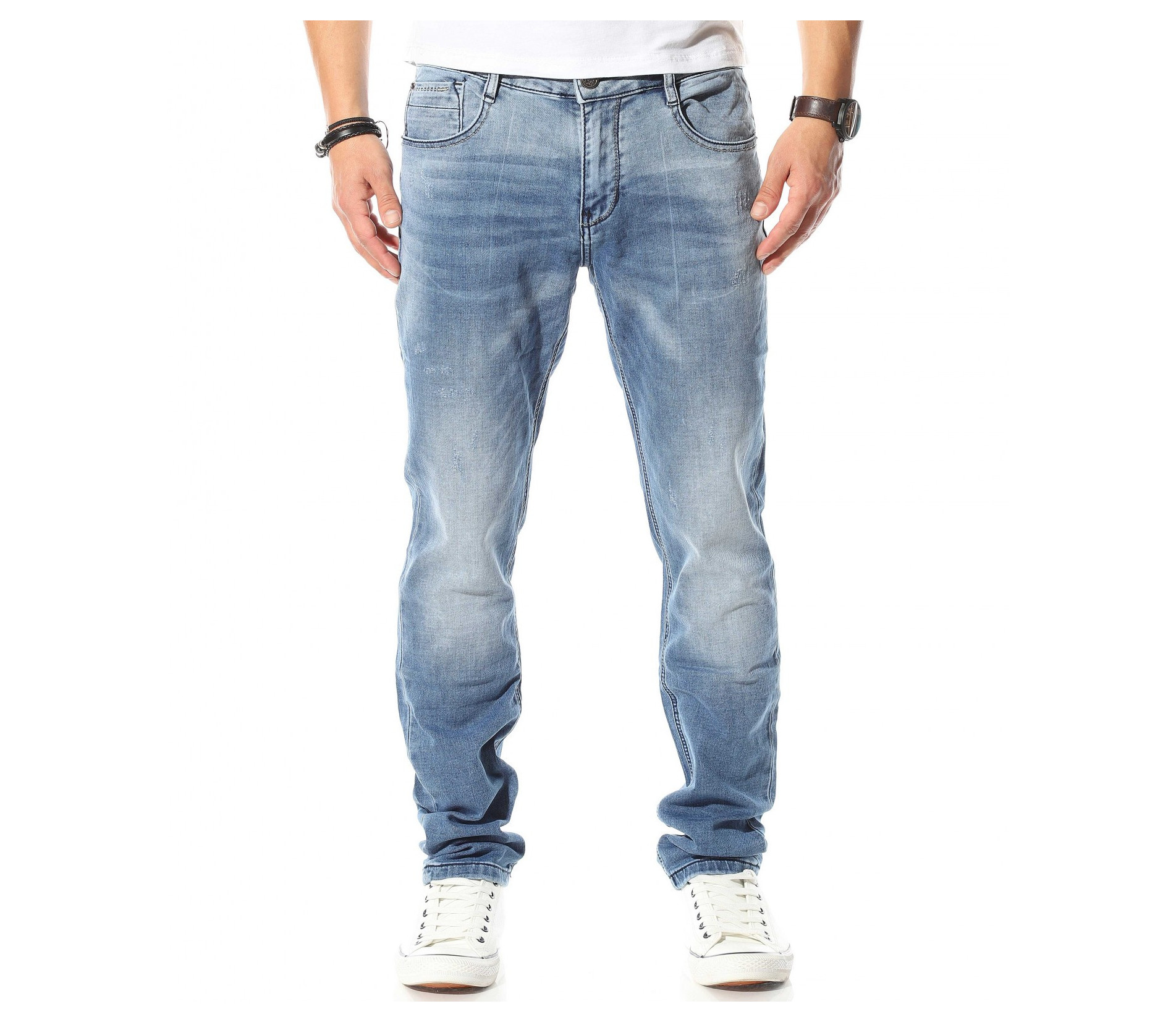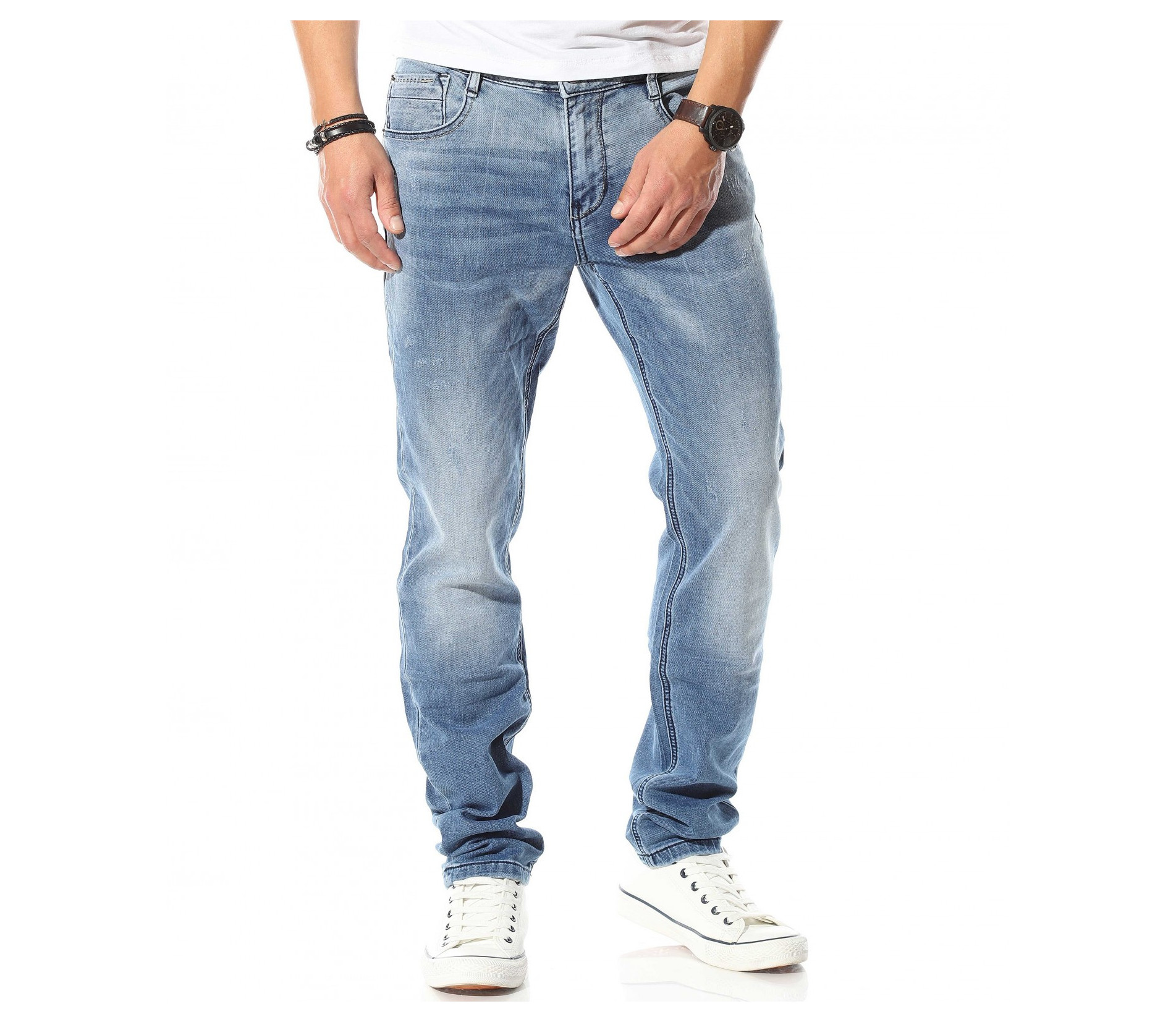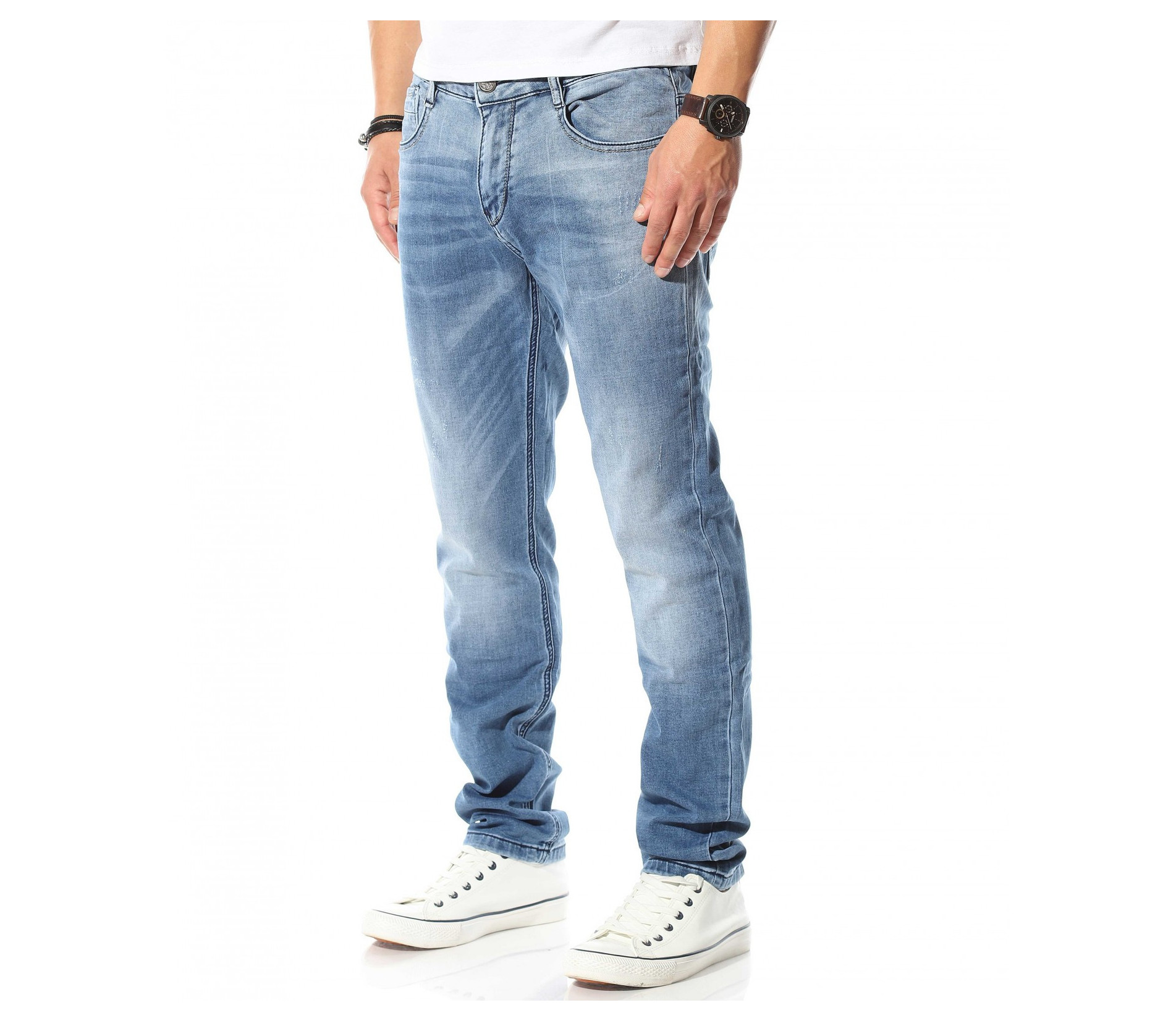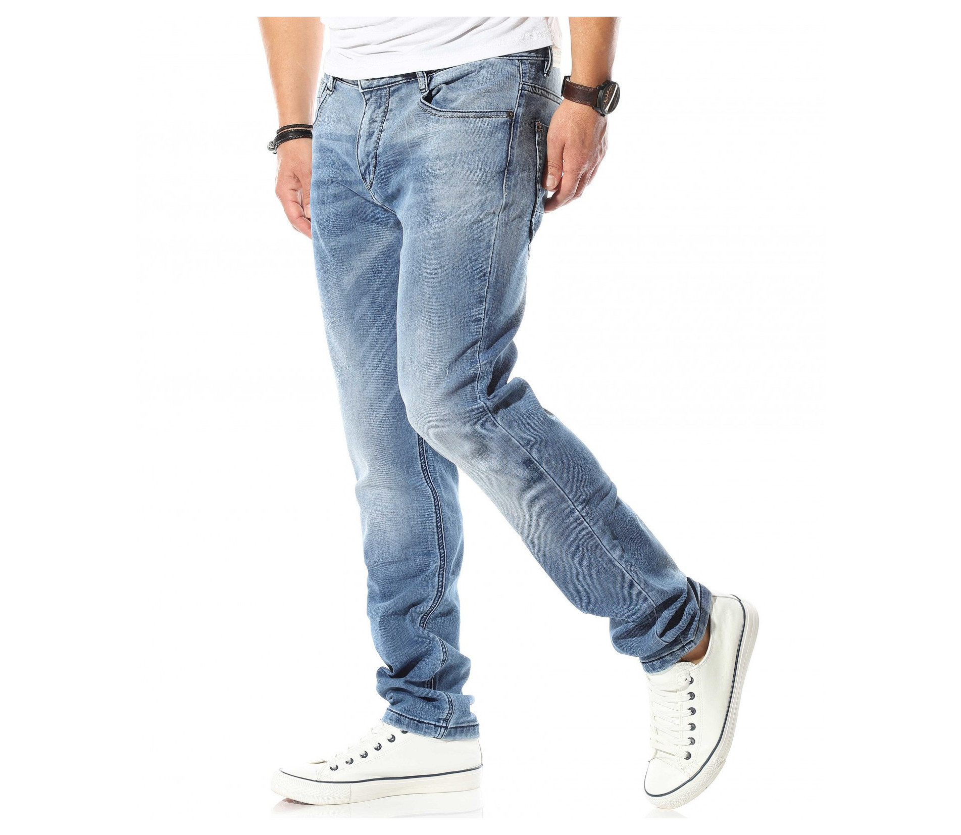 Описание на продукта: Светло син мъжи спортно-елегантен модел деним, който е идеалното решение за ценителите на „златните“ модели в лицето на панталоните. Мъжките пролетни дънки са изработени в класическа кройка, която леко се стеснява в областта на глезена, запазвайки автентичния дизайн на дънките. Цветът също е провокиран от класическия vintage стайлинг, включващ светло сини джинси, бели кецове и едноцветна фланелка, които въпреки семплостта си, в комбинация винаги са провокирали внимание. За контраст от светлия тон на плата, всички шевове, всключващи краищата на крачолите и джобовете са кантирани от тъмни конци, които създават ефектен контраст. Последния акцент, който се откроява върху единият заден джоб е деликатно прокрадваща се метална декорация, която макар и дребна, създава перфектен завършек.
