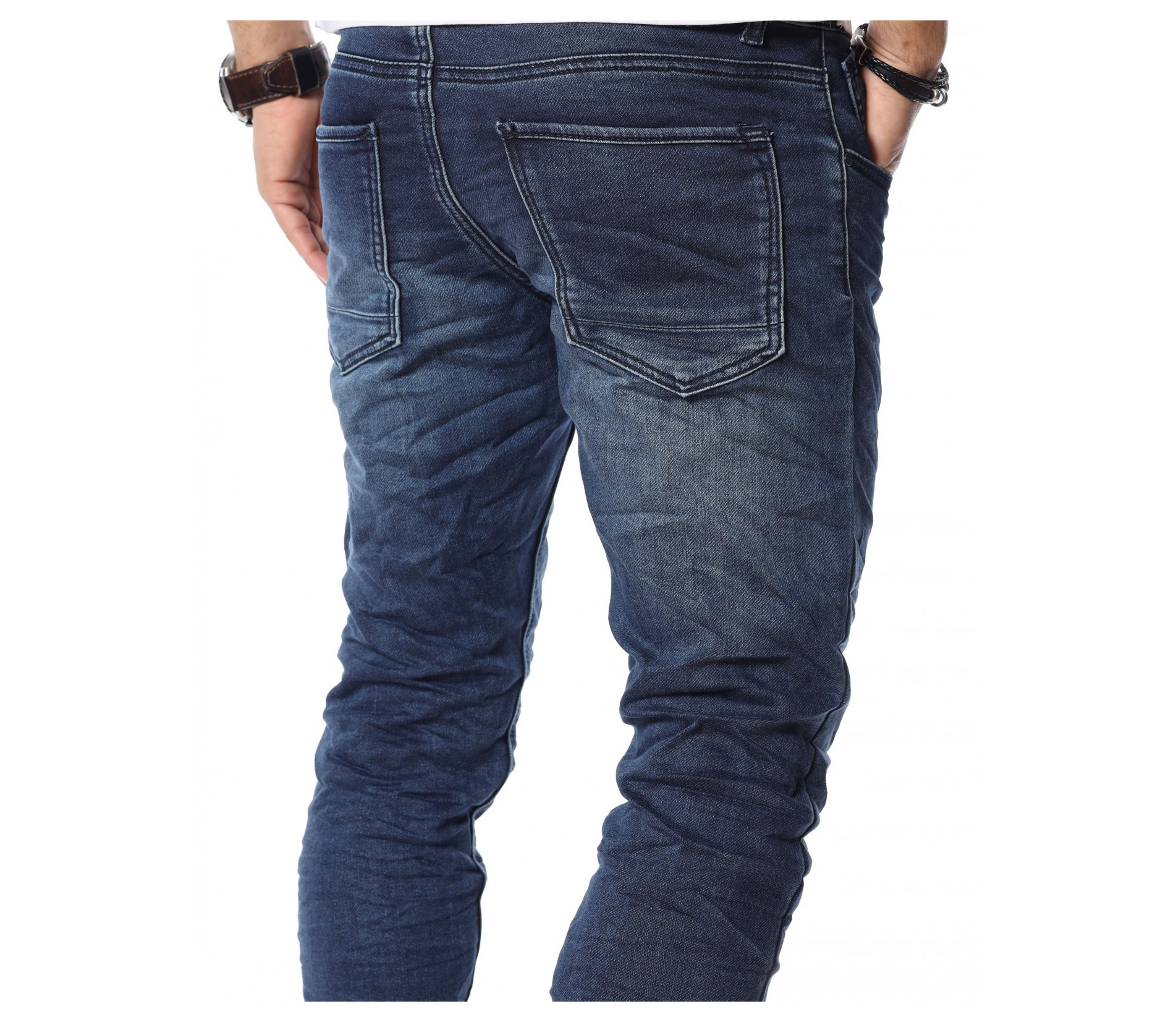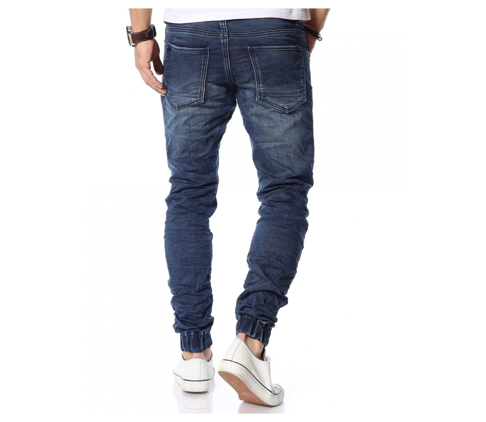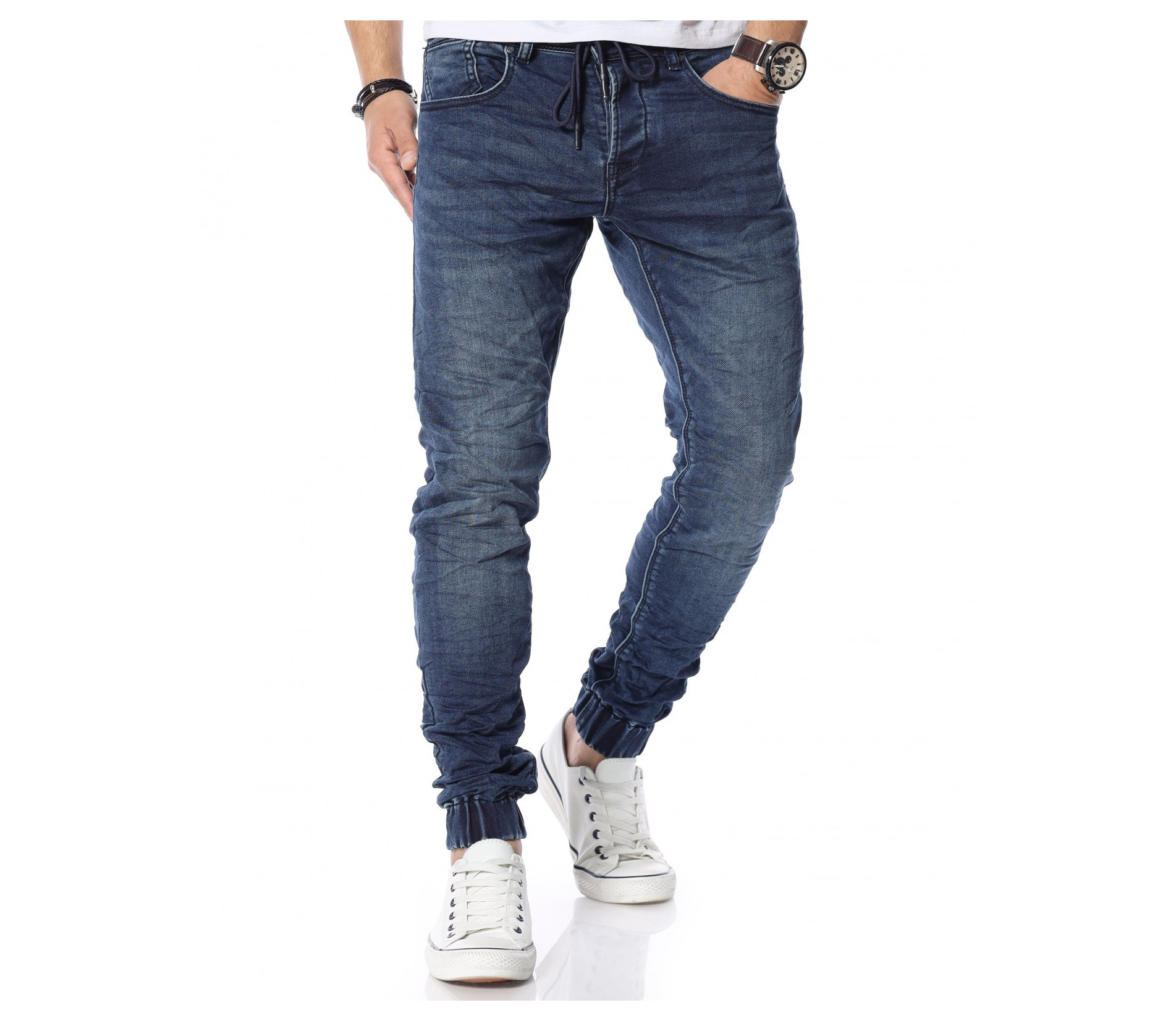 Описание на продукта: Представяме ви новият и свеж модел дънки с ластични крачоли. Много стилен, забележителен и удобен модел, който разполага с връзки на талията, които са добавени като детайл. Кройката приляга идеално на тялото ви и може да направите комбинация с любимите ви дрехи, за да се чувствате комфортно и стилно. Тъмният нюанс ви позволява да комбинирате дънките с най-различни дрехи от вашият гардероб. Моделът е с леко намачкан ефект и разполага с четири класически джоба, съответно два предни и два задни.