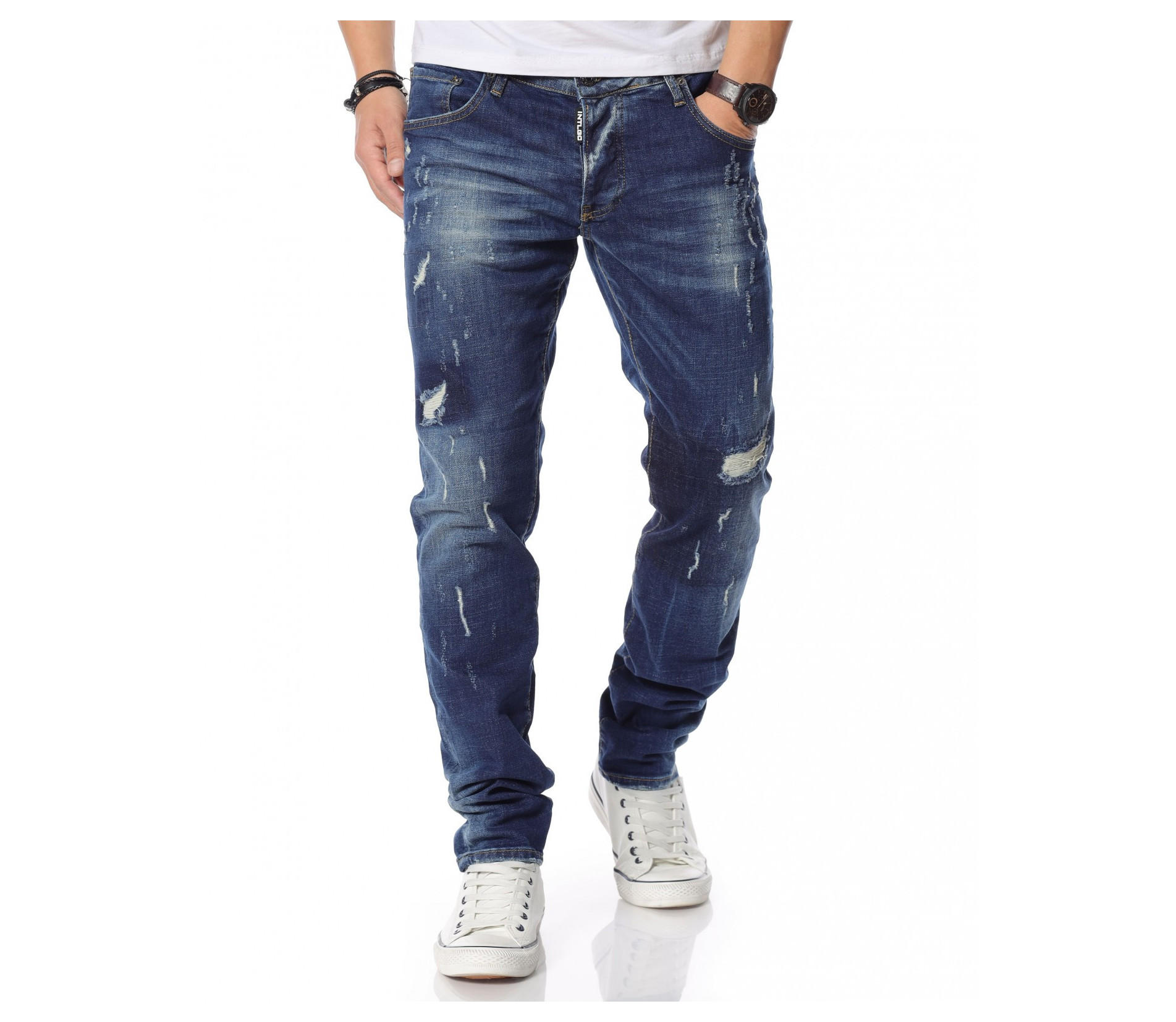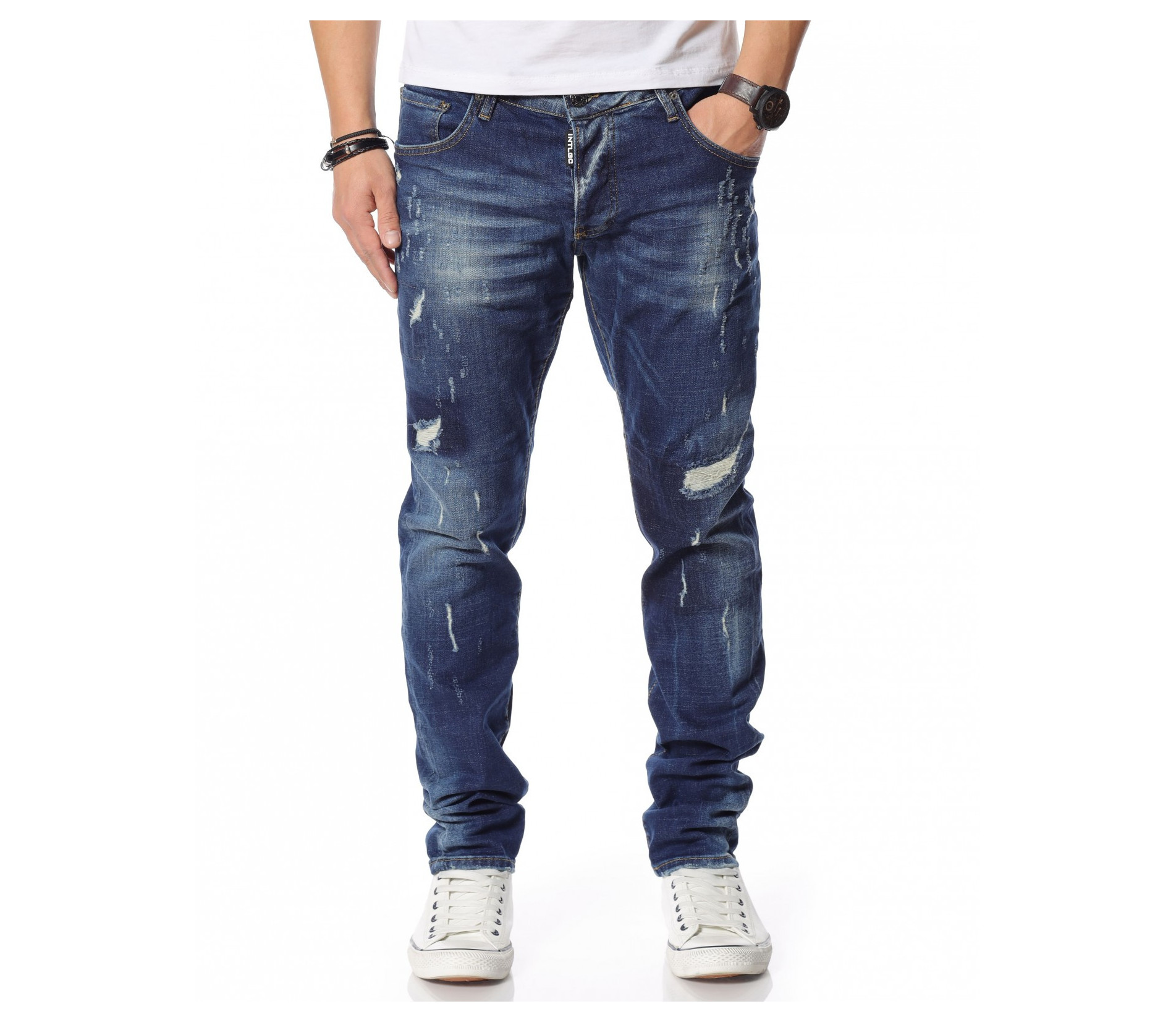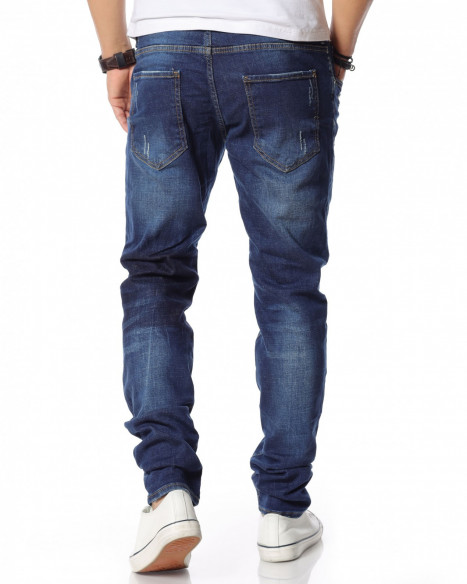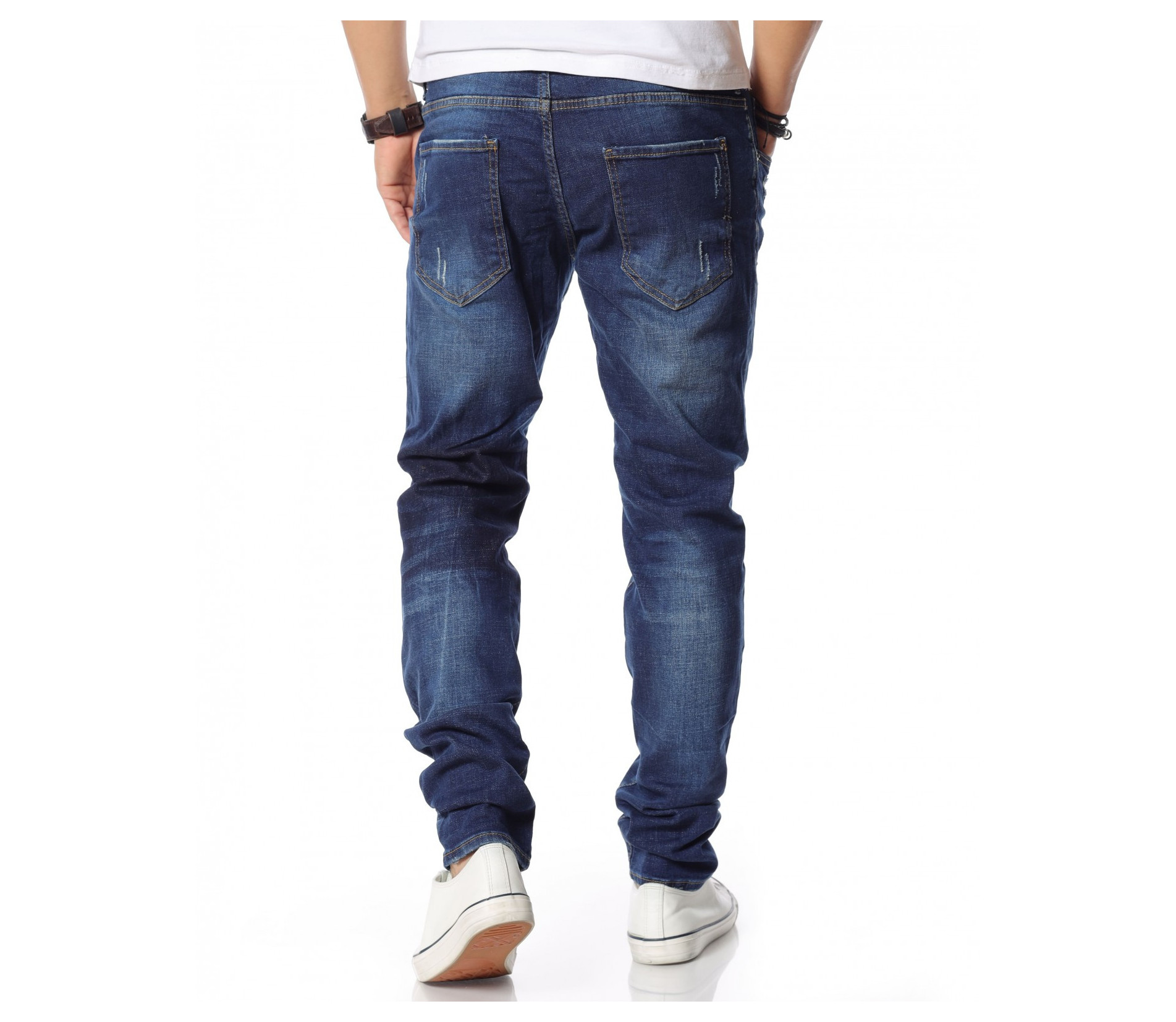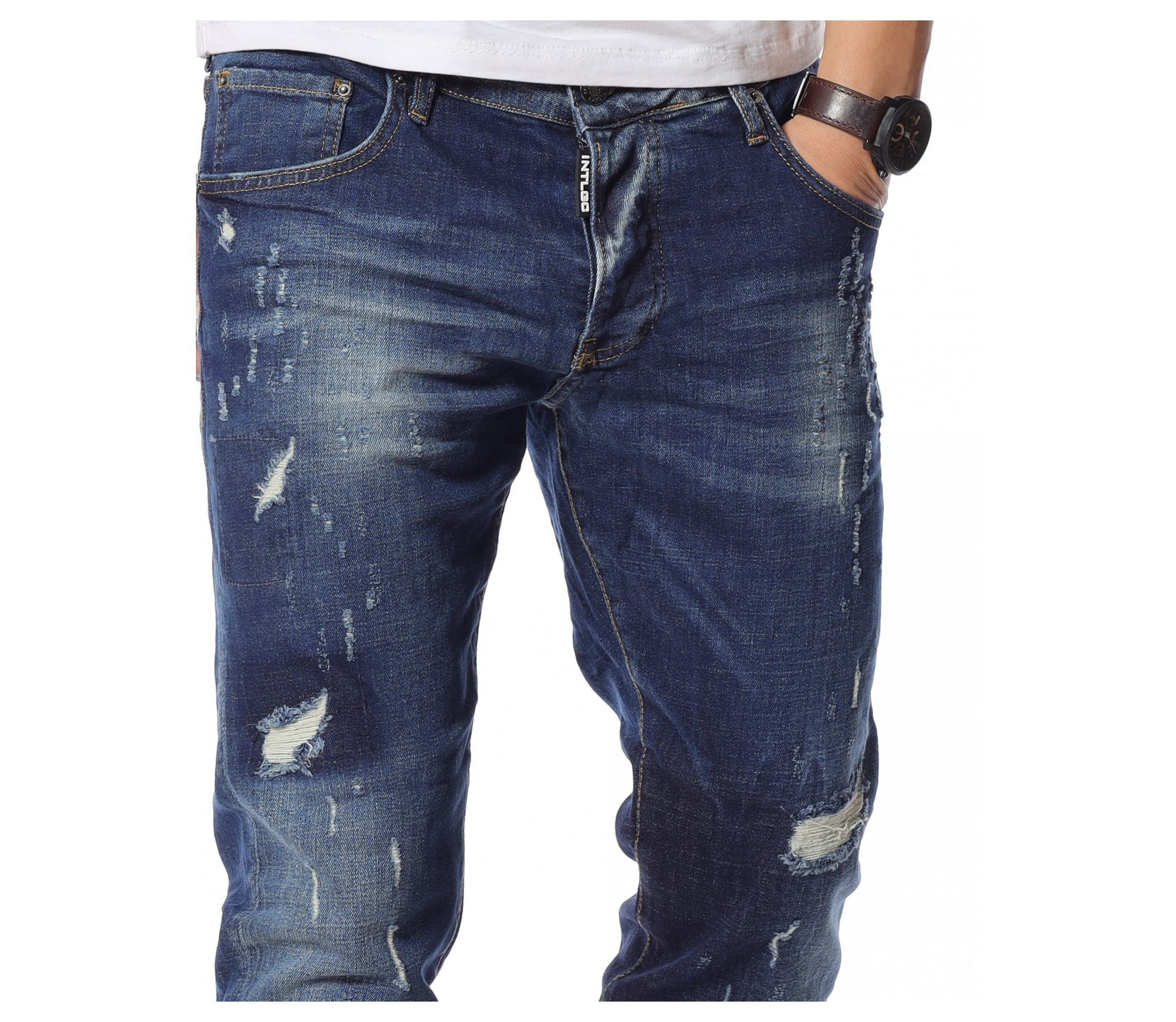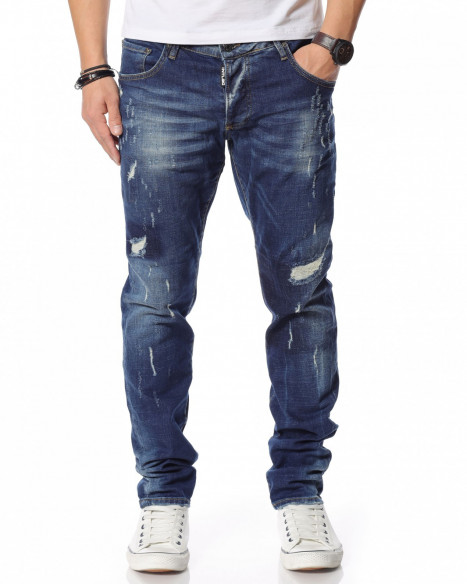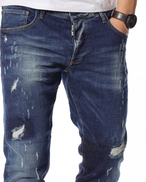 Описание на продукта: Сигнално-сини дънки, надрани на места и протрити над коленете като акцент. Моделът разполага с два класически джоба отпред и два дълбоки джоба отзад. Закопчаването е със стоманено копче и цип. Подходящ е за всеки повод и може да го носите целогодишно. Предразполага да експериментирате с тениска по ваш вкус и кецове.