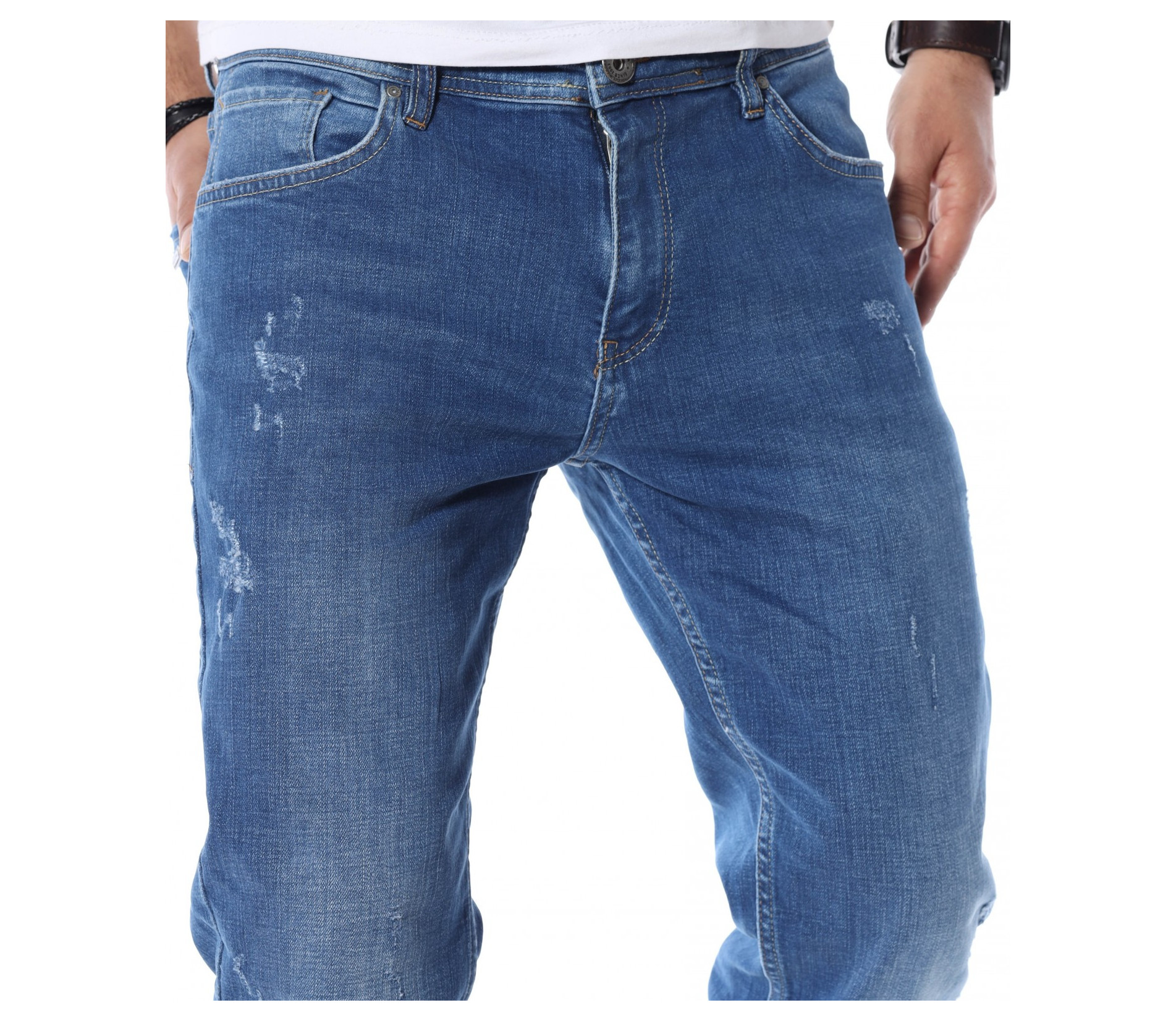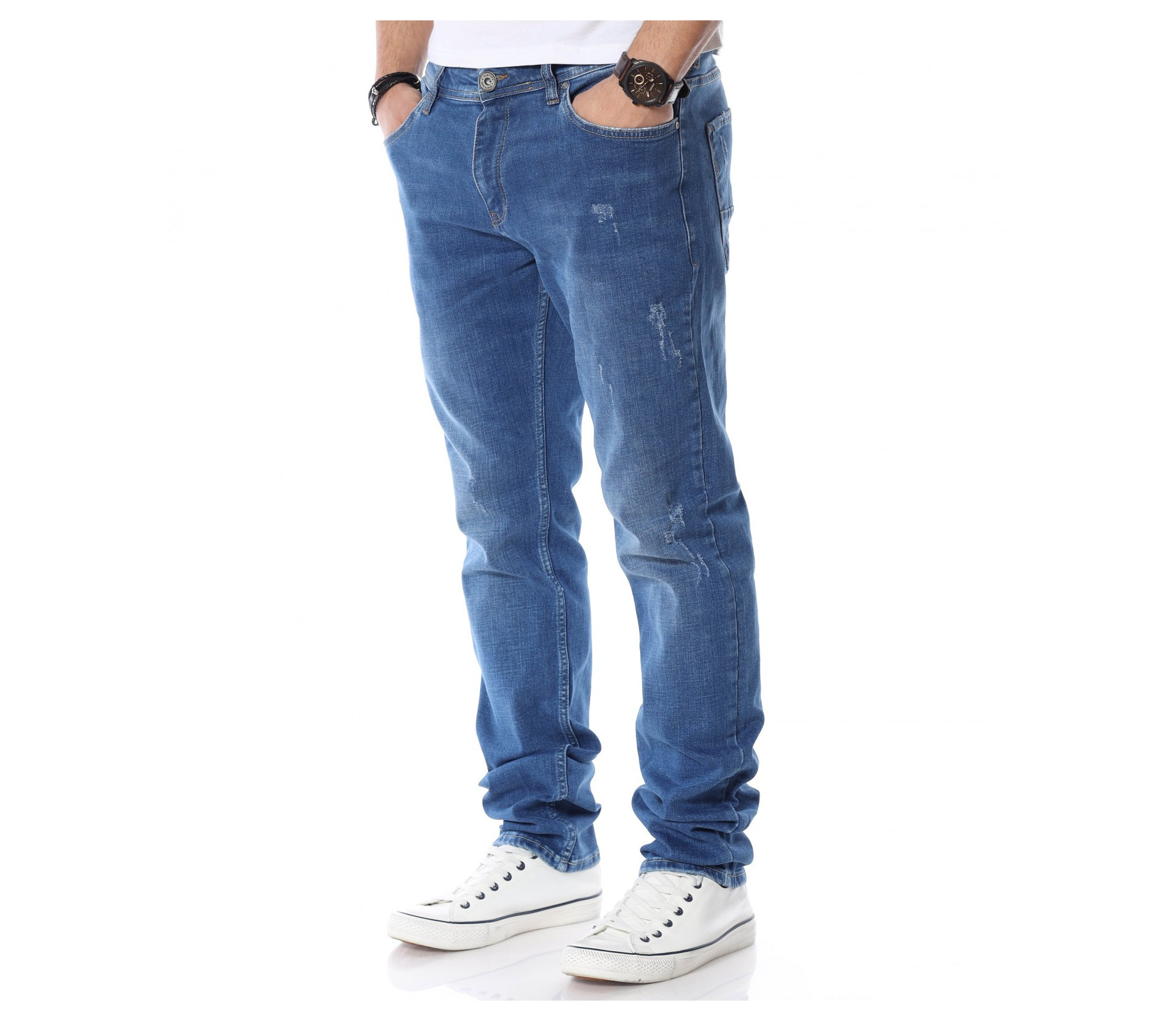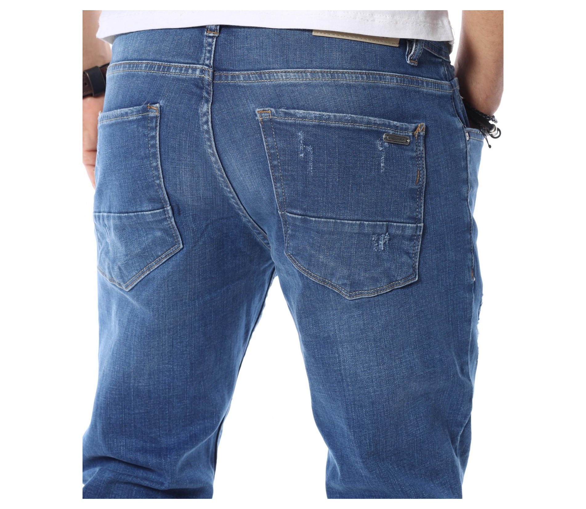 Неизменна част от всеки мъжки гардероб, това определено са дънките, независимо от цвят, декорация и вид. Бъдете актуални с най-новото ни предложение - изчистени сини дънки, в които намираме леко, на места протрити мотиви по цялата дължина. В предната част са разположени два, стандартни джоба, а над десният откриваме акцентирано малко джобче с капси. В задната част изпъкват дълбоките джобове. Кройката е права, адаптираща се към тялото. Моделът позволява широк диапазон от комбинация с високи кецове, тениски, а защо не и ризи.
