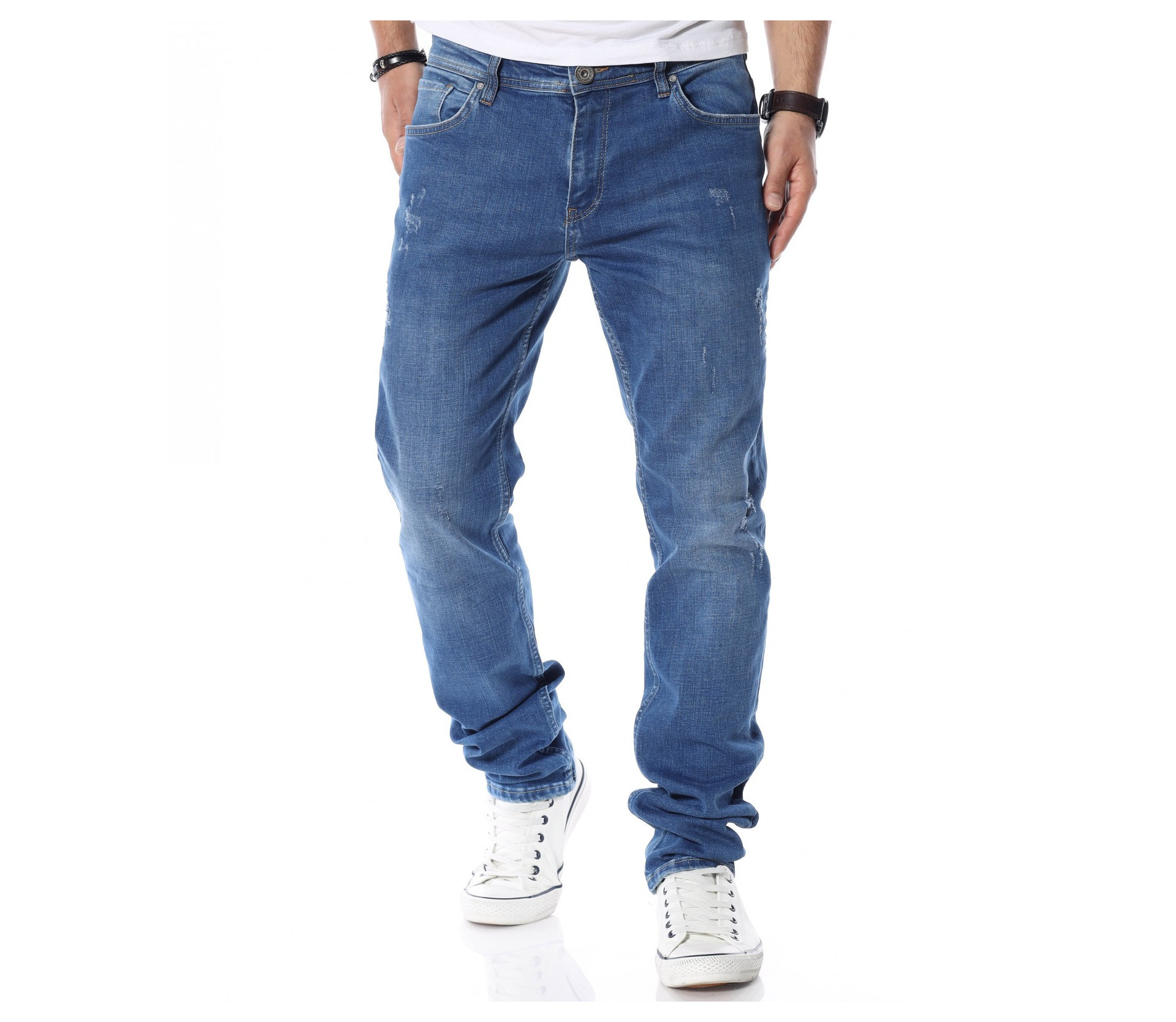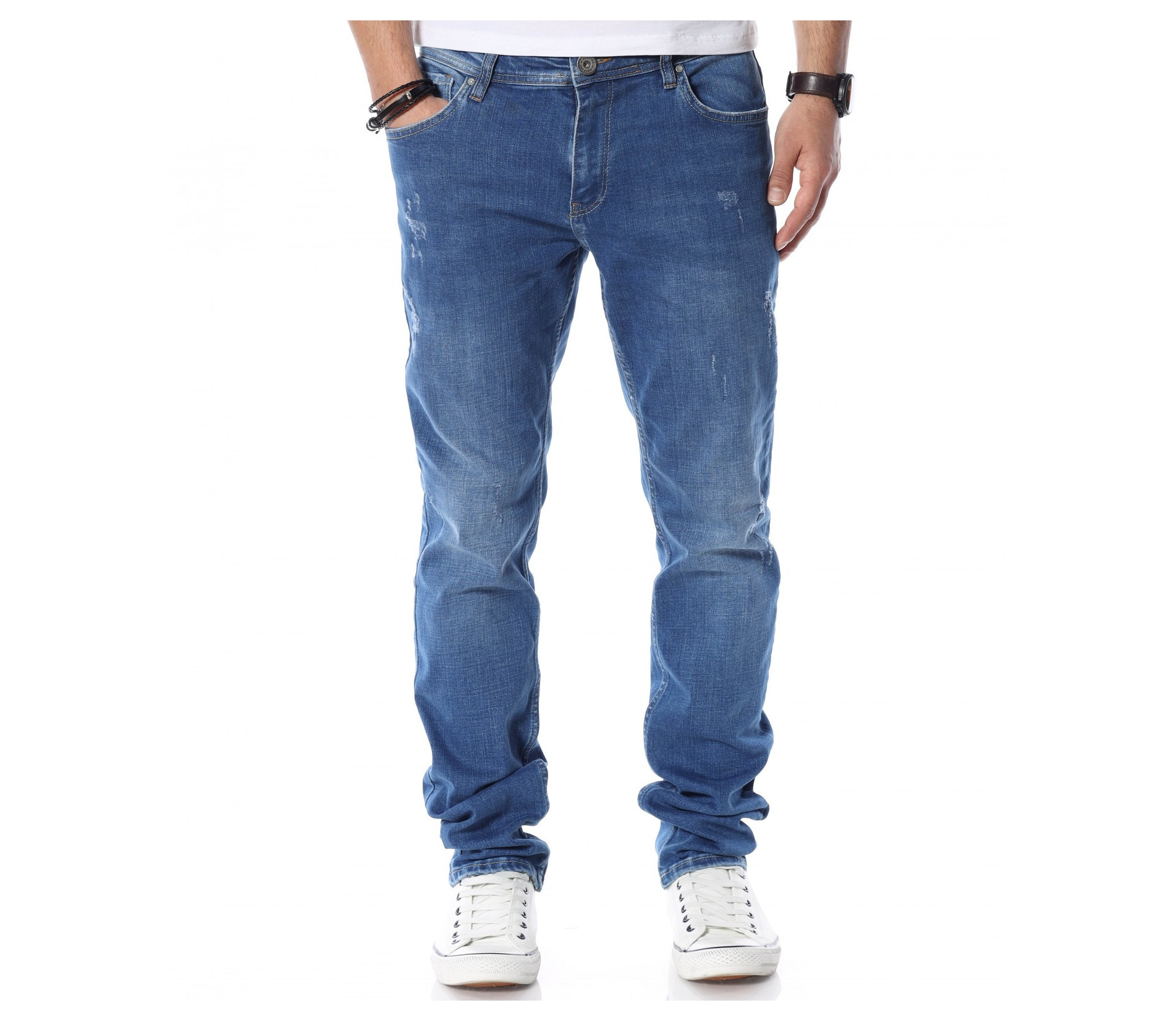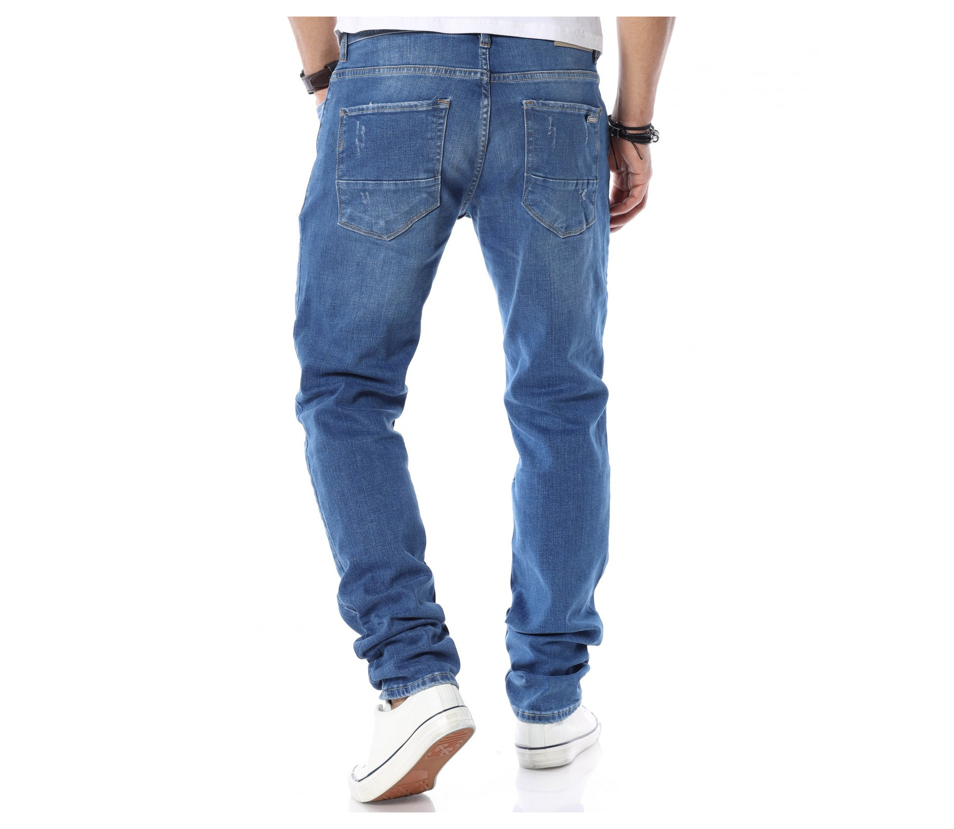 Неизменна част от всеки мъжки гардероб, това определено са дънките, независимо от цвят, декорация и вид. Бъдете актуални с най-новото ни предложение - изчистени сини дънки, в които намираме леко, на места протрити мотиви по цялата дължина. В предната част са разположени два, стандартни джоба, а над десният откриваме акцентирано малко джобче с капси. В задната част изпъкват дълбоките джобове. Кройката е права, адаптираща се към тялото. Моделът позволява широк диапазон от комбинация с високи кецове, тениски, а защо не и ризи.