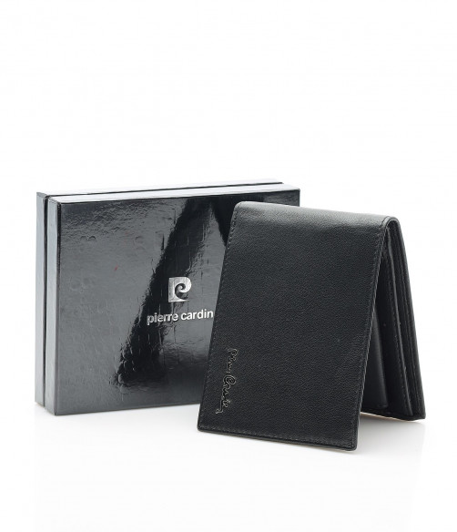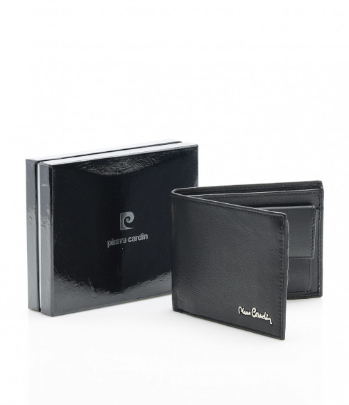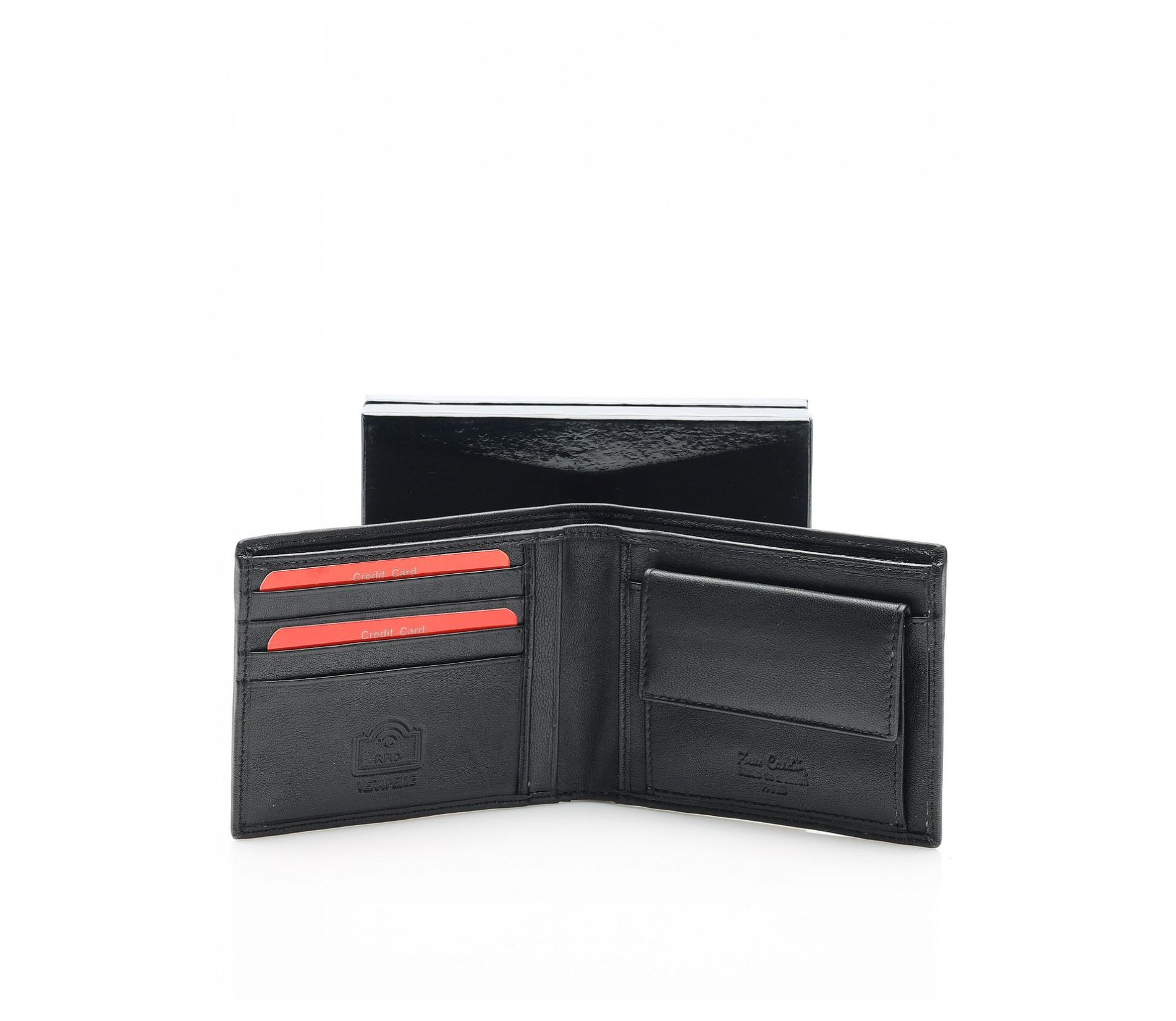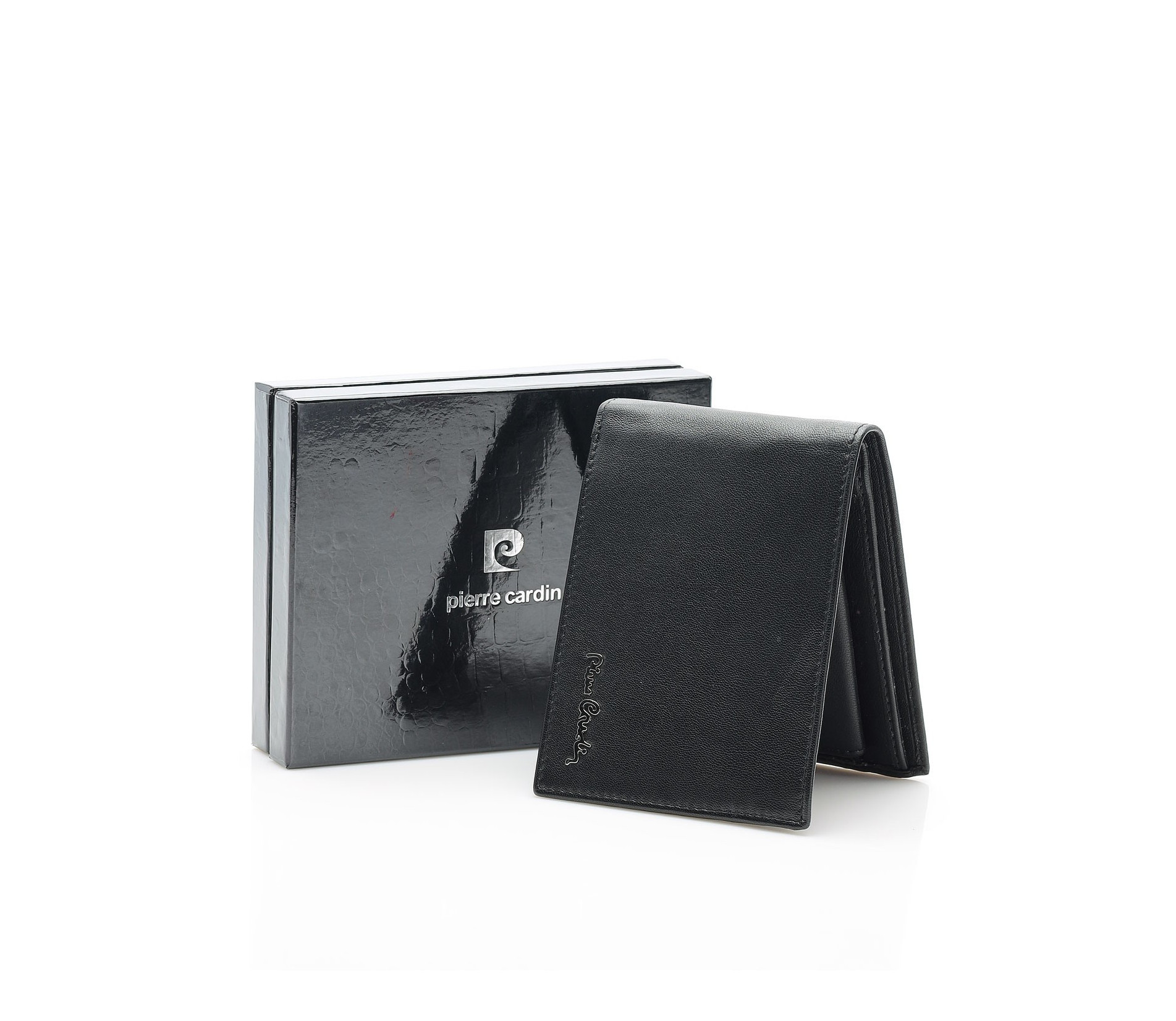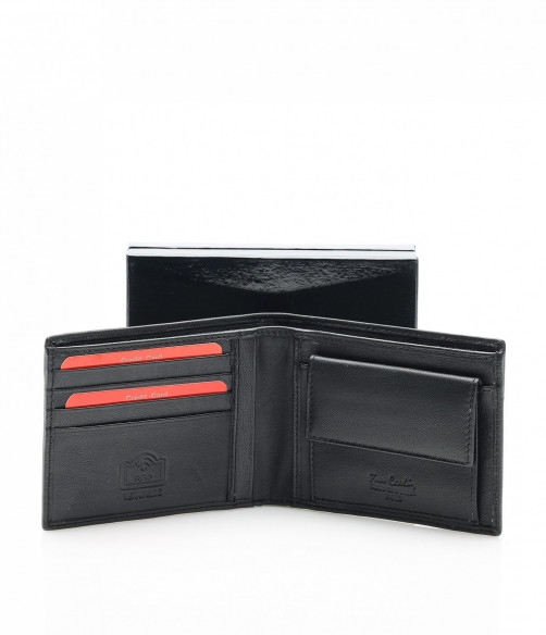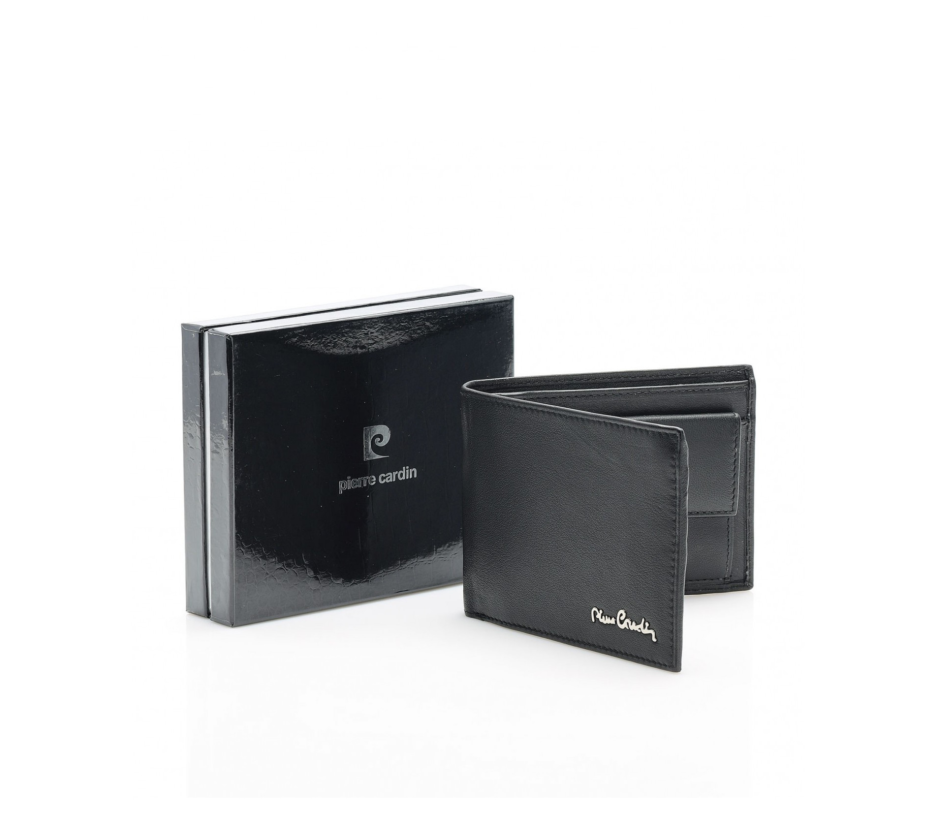 Описание на продукта: Направи специален подарък на любим човек, поднасяйки му стилно, мъжко портмоне, изработено изцяло от висококачествена, естествена кожа. Както вътрешната, така и външната част на модела са изцяло в изчистен, черен цвят. Върху лицевата част е поставено метално лого с името на марката, а във вътрешната са налице няколко прегради за банкноти, джобче за монети, закопчаващо се с кочпе и няколко отделения за карти и лични документи. Формата е квадратна, а големината е подходяща за носене в джоб или в чанта. Портмонето се предлага в стилна опаковка, тип кутия, което го превръща в ценен актив за всеки празничен повод. Довери се качествените аксесоари в лицето на този класически портфейл в черен цвят.