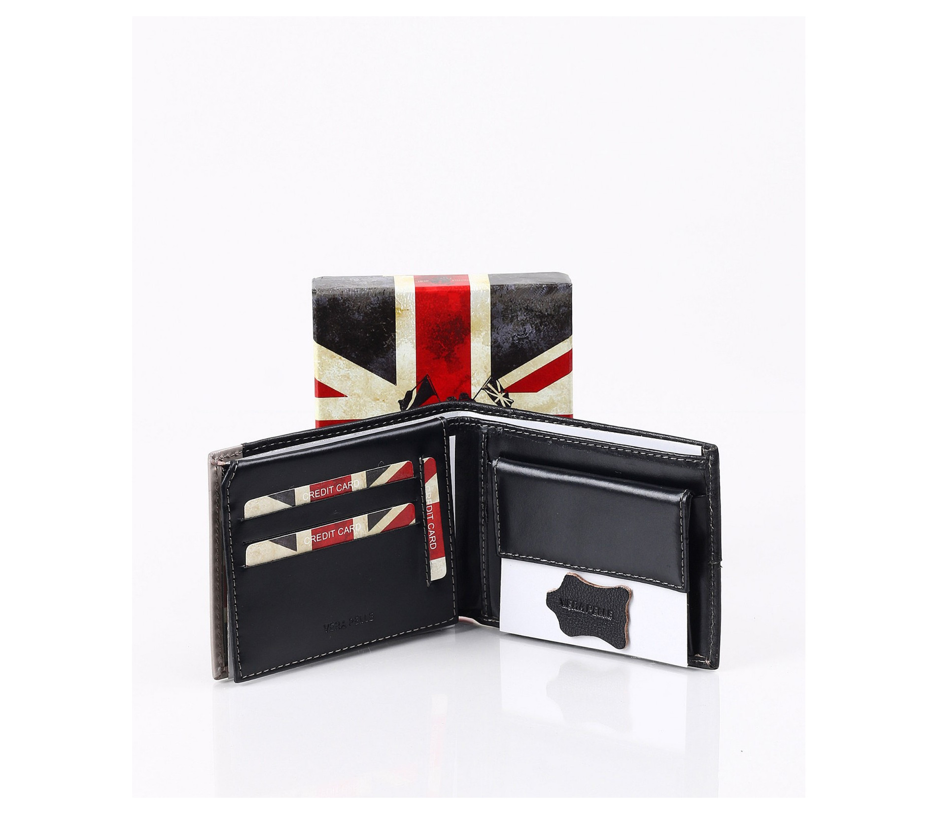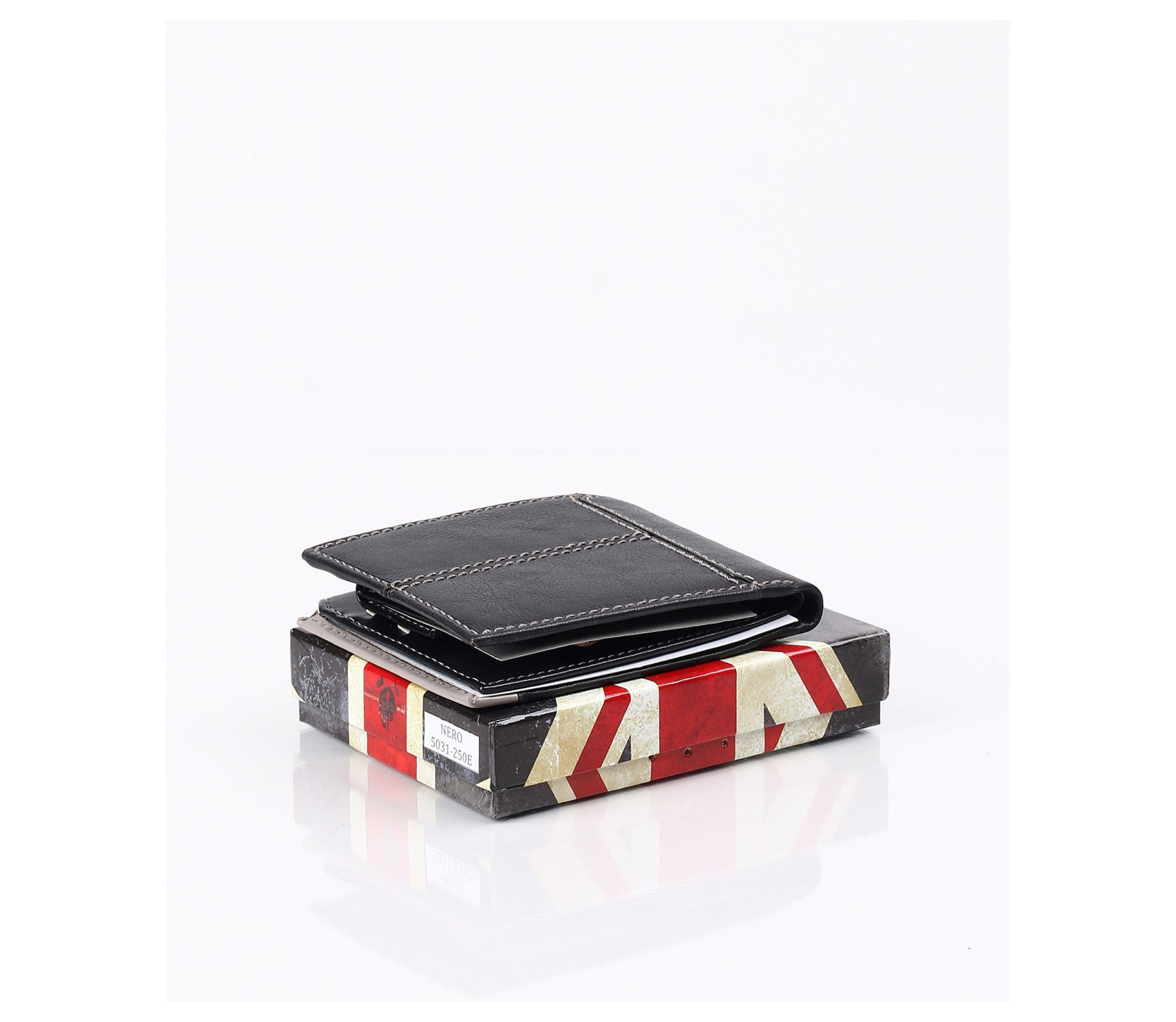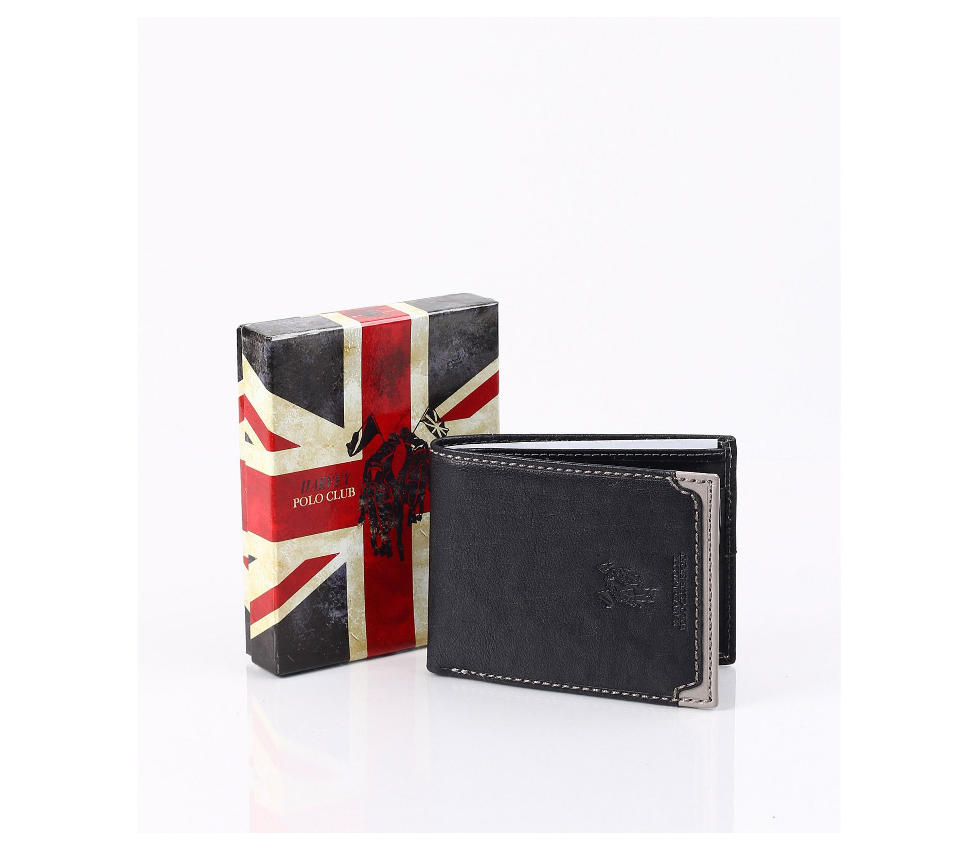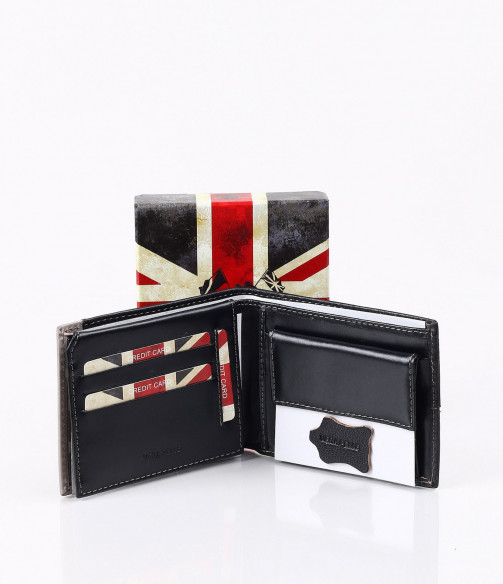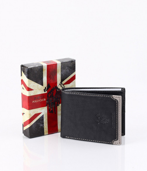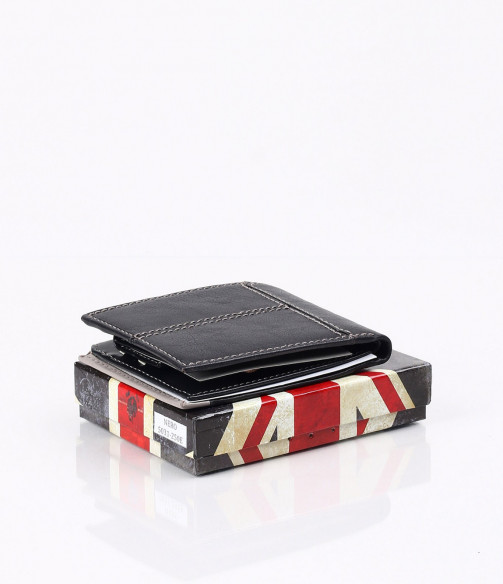 Описание на продукта: Изключително стилно и интересно портмоне с акцент в предната част. В края на модела е поставена светлосива лента, перфектно контрастираща с иначе изчистеният черен десен. Над нея е гравирано логото на марката. Вътре портфейла разполага с няколко прегради за документи, банкноти и една за монети. Перфектен избор за Вас, както и за подарък, тъй като се предлага със интересна кутия.