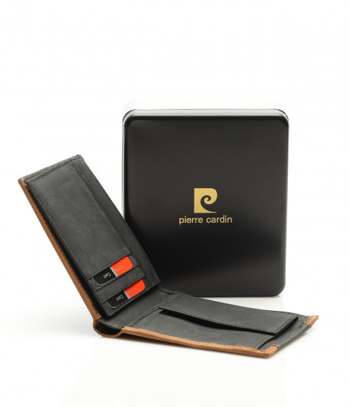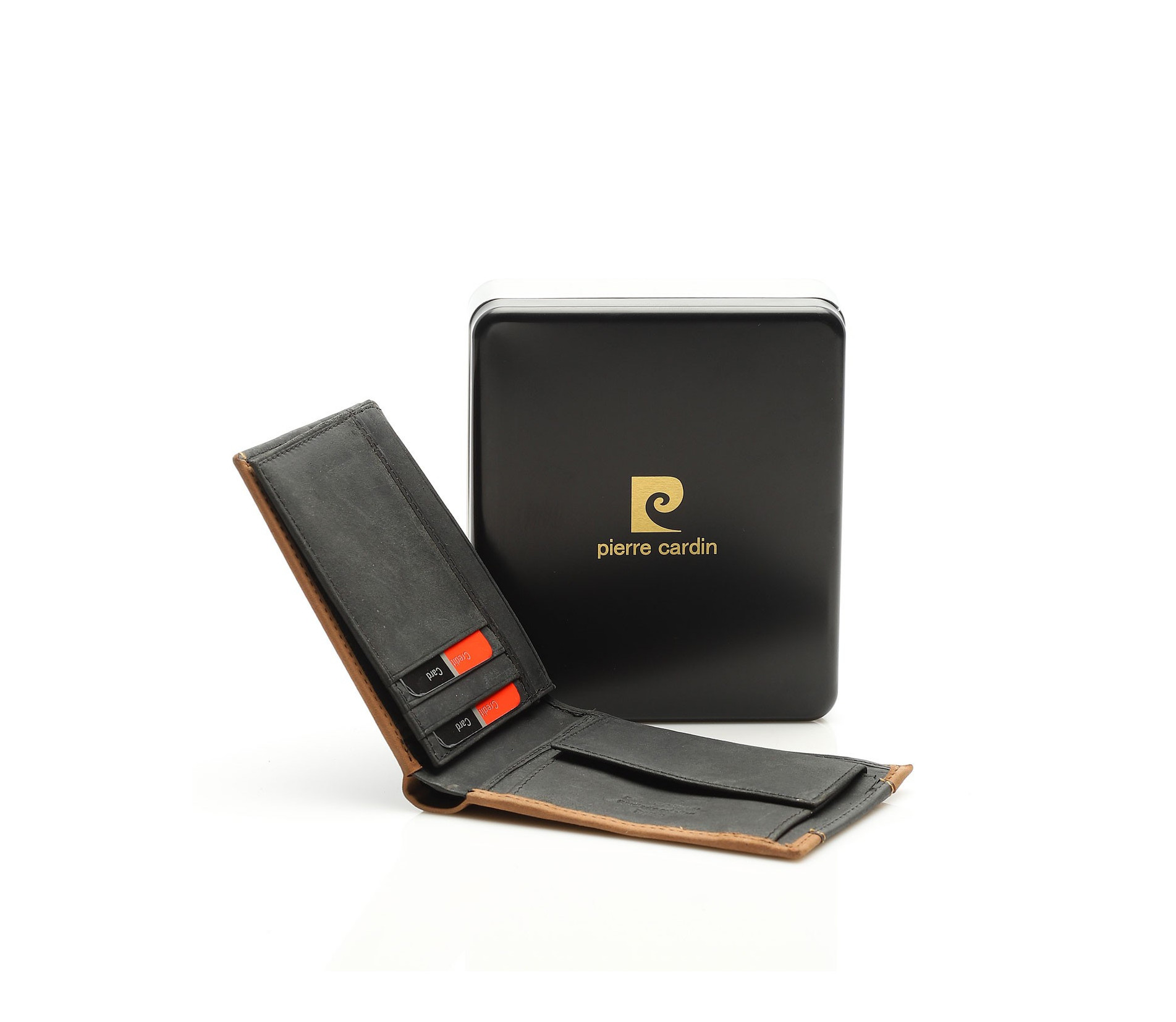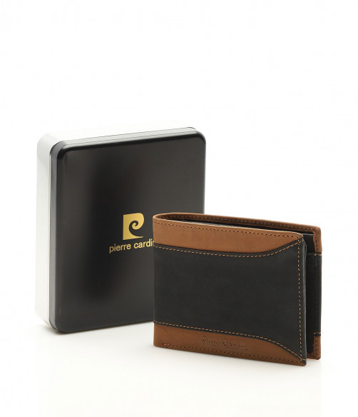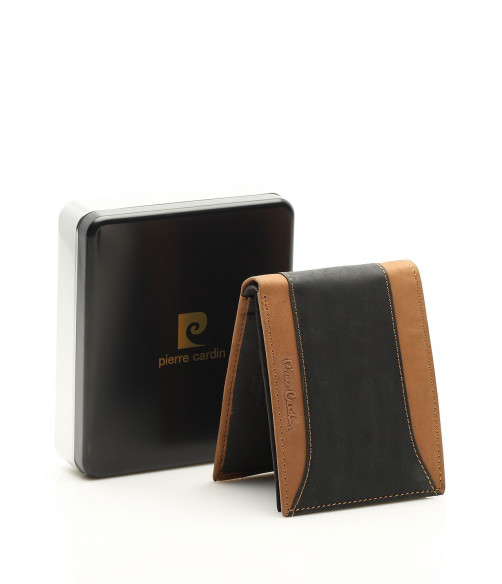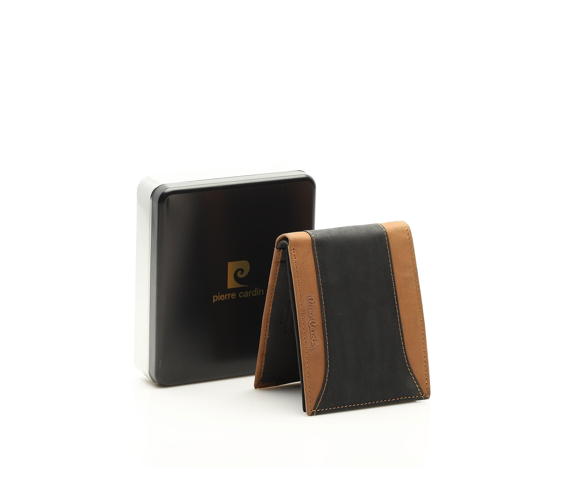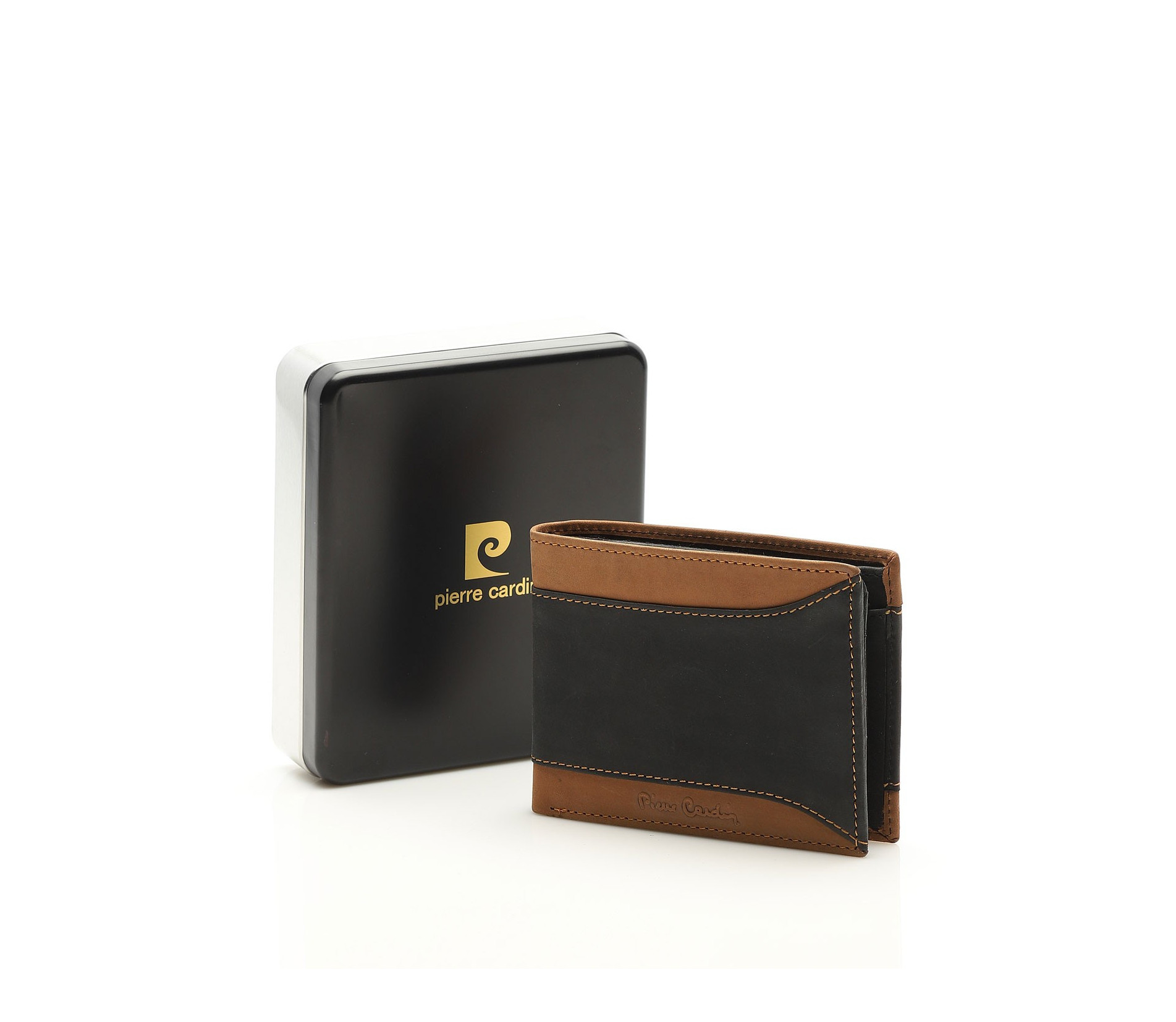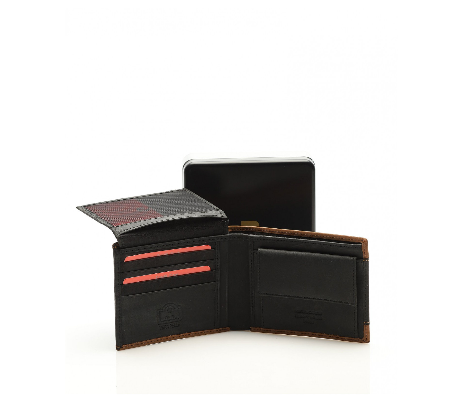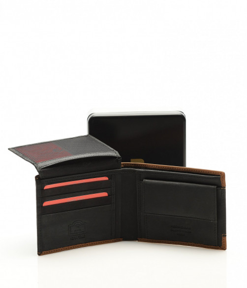 Описание на продукта: Авангарден модел мъжко кожено портмоне, чиито външен дизайн впечатлява с нетипична комбинация от светли и тъмни нюанси, които са ярко окторени един от друг. В долният ъгъл на модела е разположено и малко метално лого на бранда, което допълва стайлинга му. Вътрешността е разграфена в практичен вид, като има няколко прегрди за документи, разположени тип тефтер, в горната част са разположени преградите за банкноти, а в лявата част джобчето за монети. Освен висококачествен, стилен и удобен, този модел е перфектен подарък и заради ефектната метална кутия, в която се предлага.