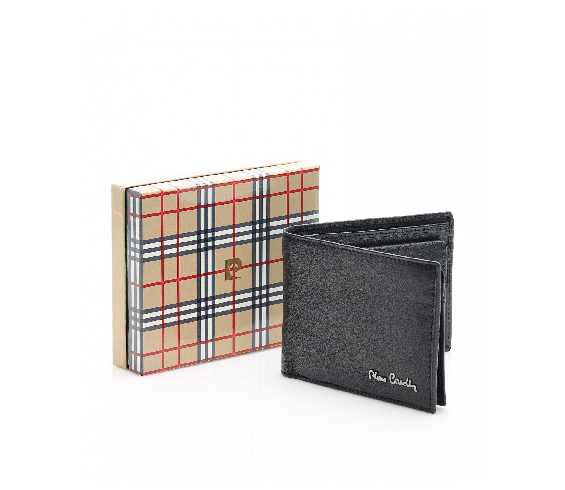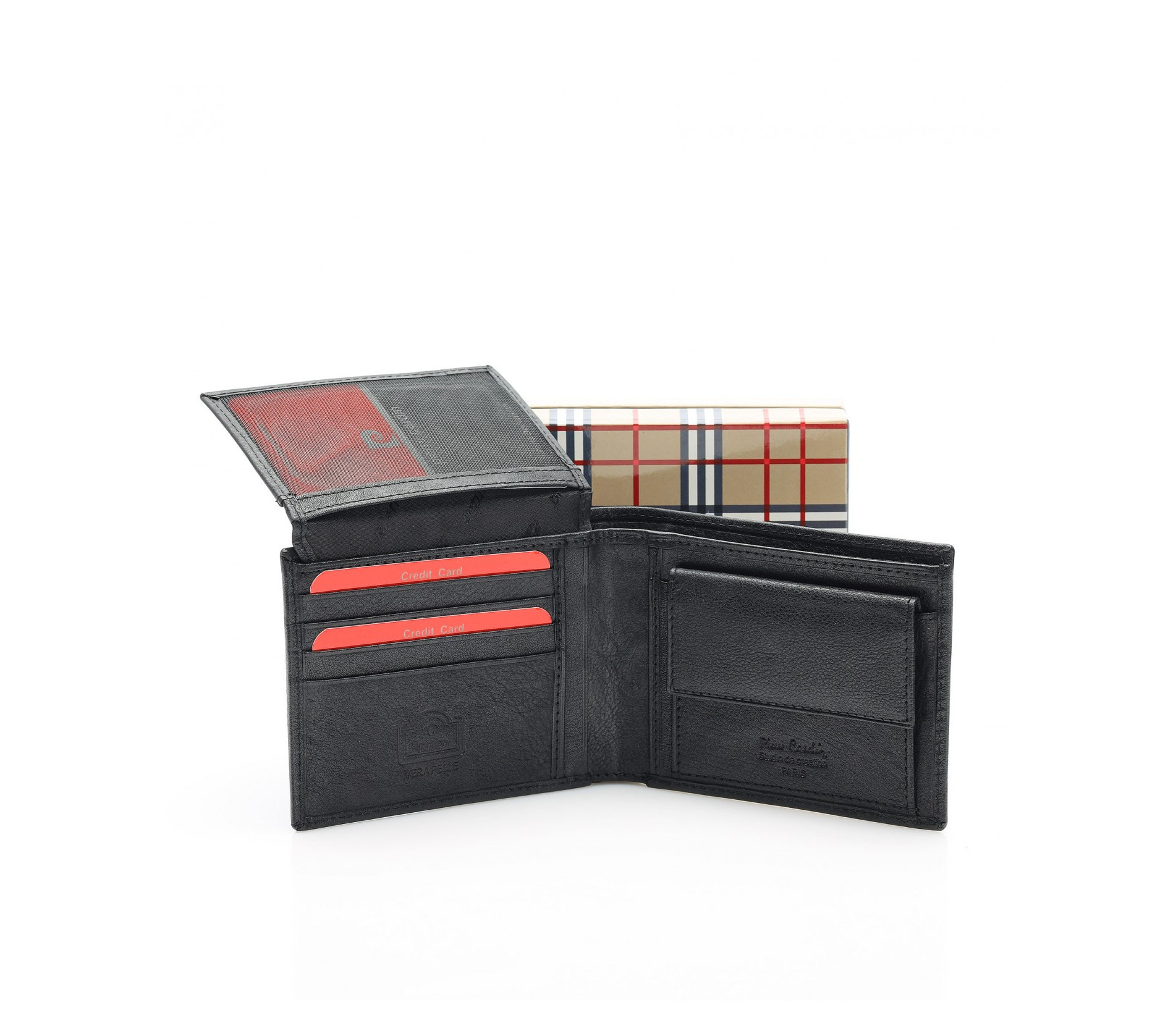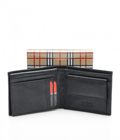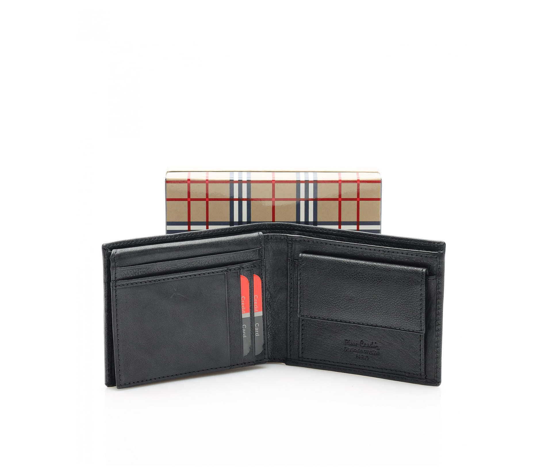 Описание на продукта: Модерен аксесоар, подходящ за всеки вкус и стил, тъй като събира в себе си качеството на естесвената кожа, свежестта от ярките цветове и практичността от прилежно подбраните детайли. Този модел портмоне е супер ефектно и неповторимо, тъй като е изградено на база контраст, създаден между двете му части. Външната е семпла и изчистена, акцентирана само от деликатен кант и малко лого, а основата изпъстрена в три различни нюанса, от които да избирате: кафяв, тъмно кафяв или черен. Вътрешната страна на портфейлът е семпла, изградена от няколко прегради за документи, две за банноти и малък моентник с капаче.