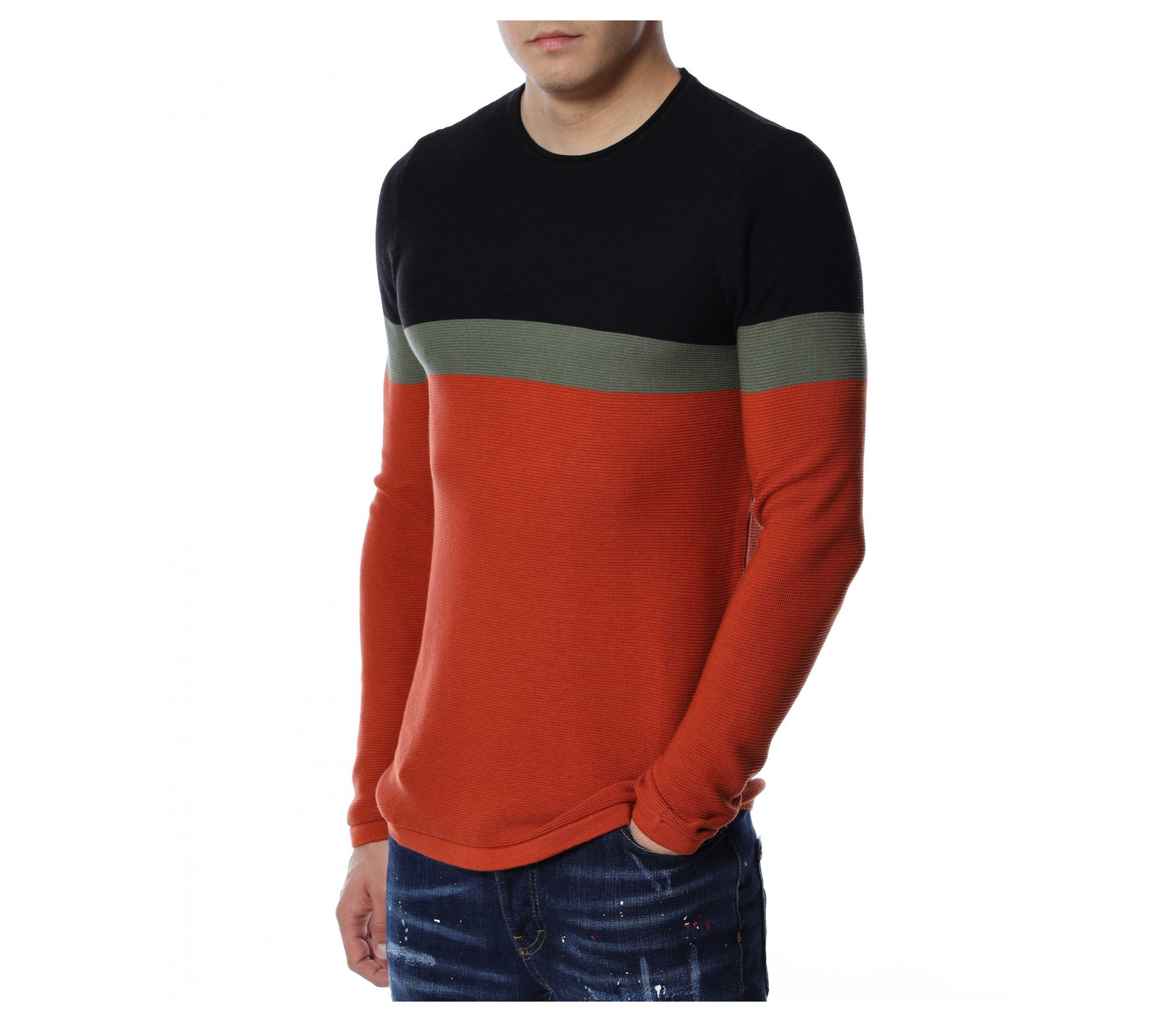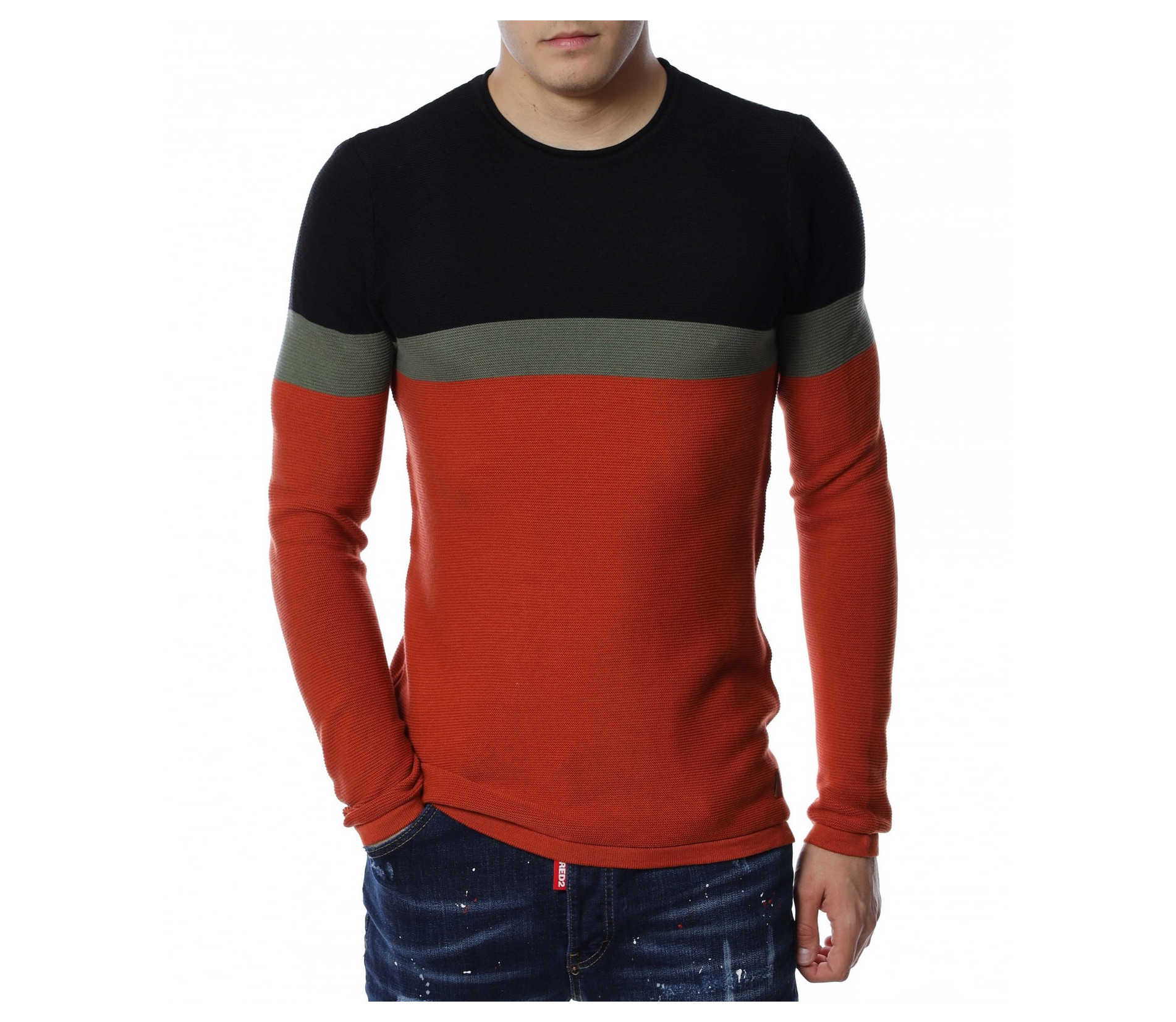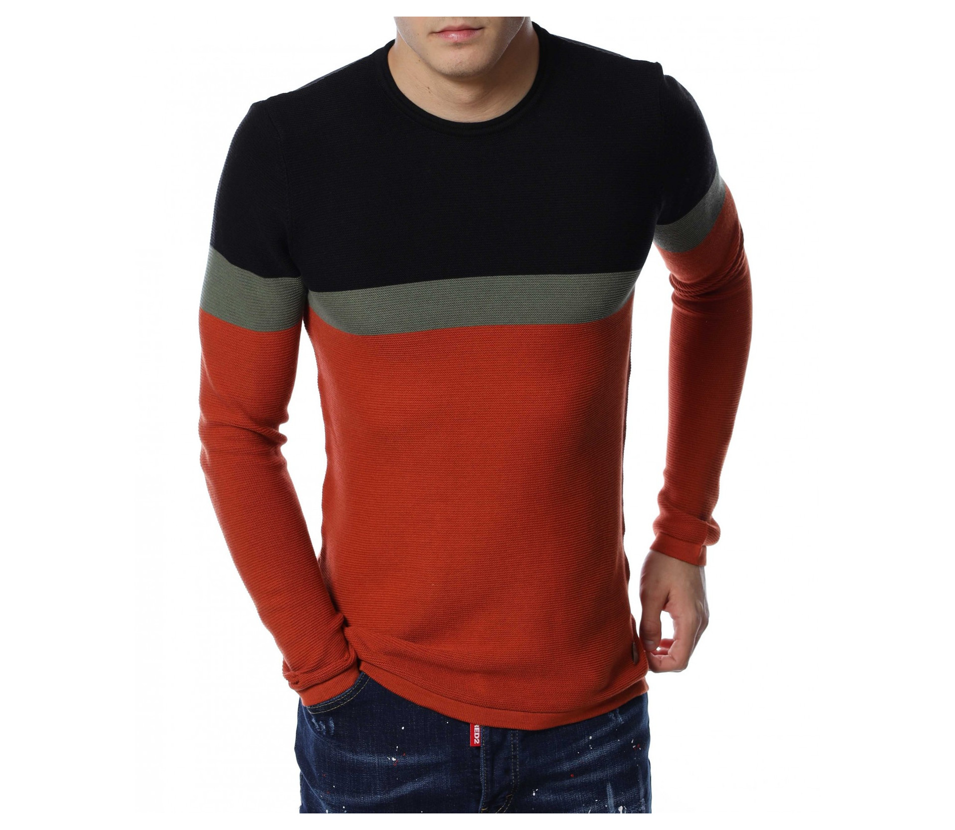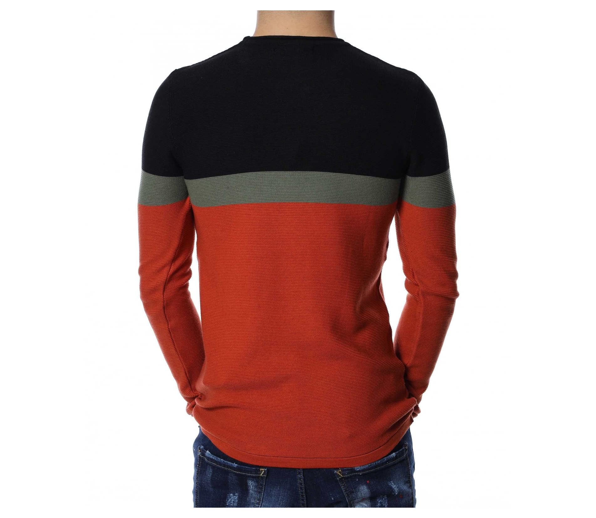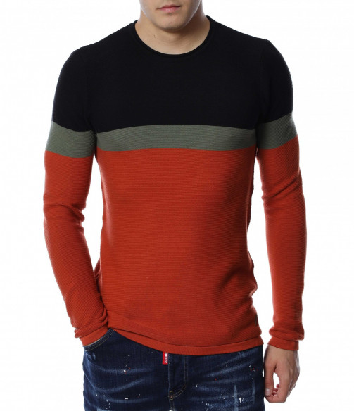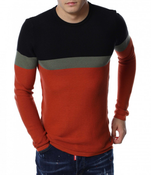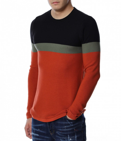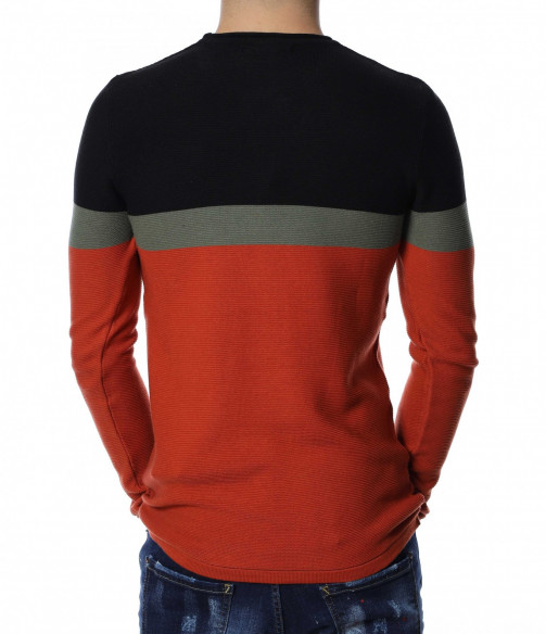Мъжки пуловер от тънко плетиво. Дизайнът е поверен на три цвята, като основният е по цялата дължина, а в предната част, в задната и при горната част на раменете са разположени цветни ленти. Деколтето е овално, кройката подчертава фигурата, а ластичните маншети придават завършен вид. Комбинирайте с кецове и дънки.