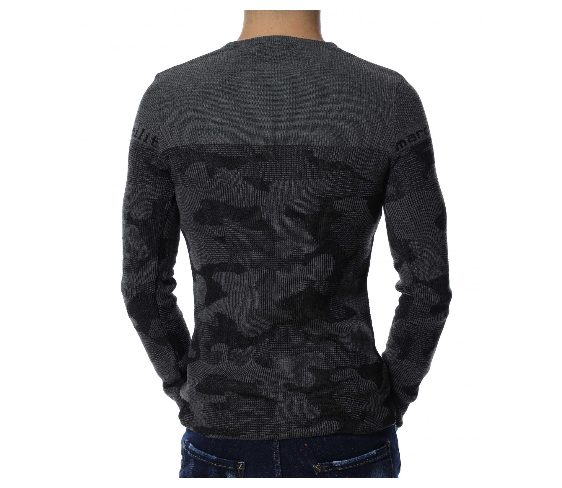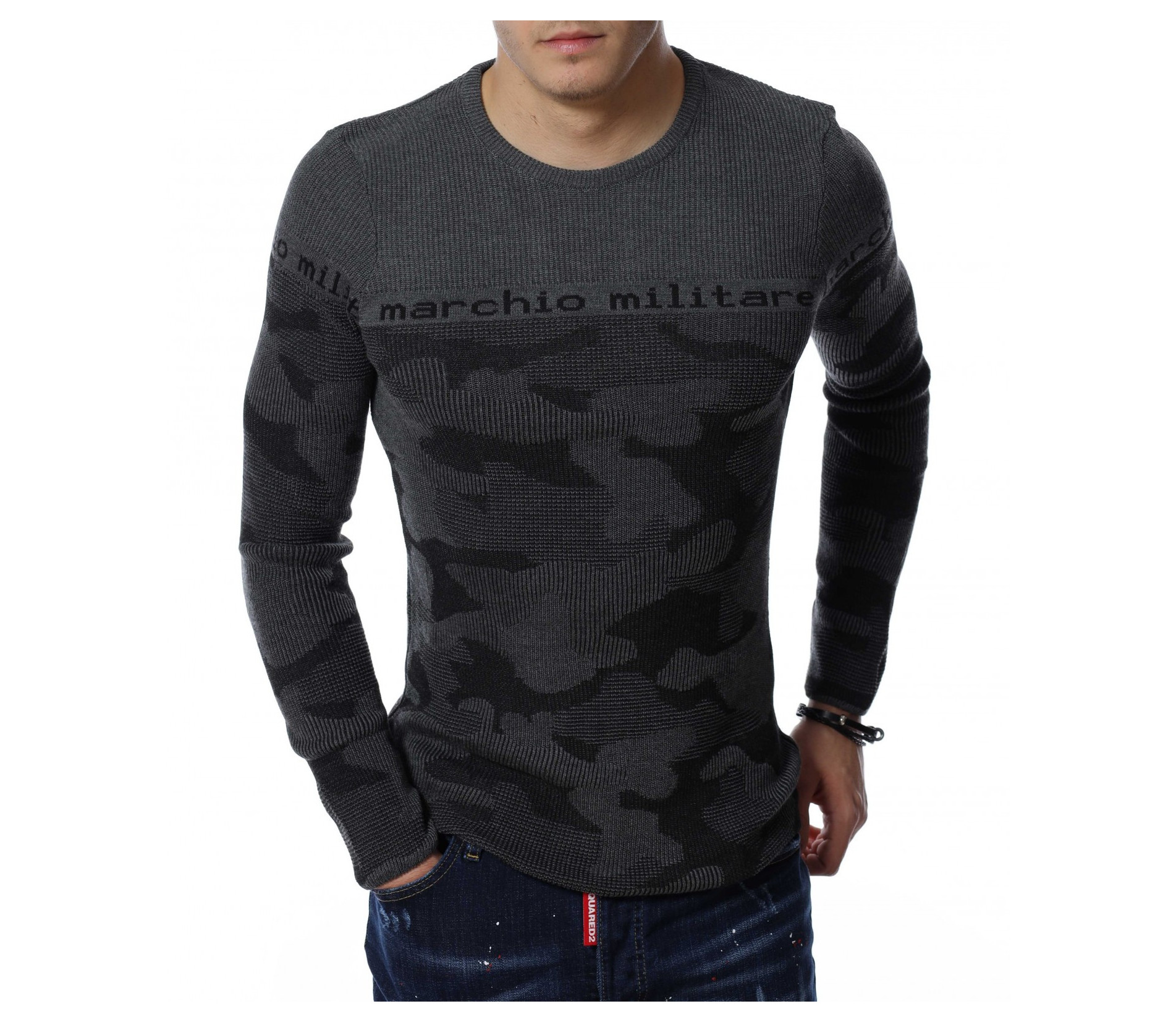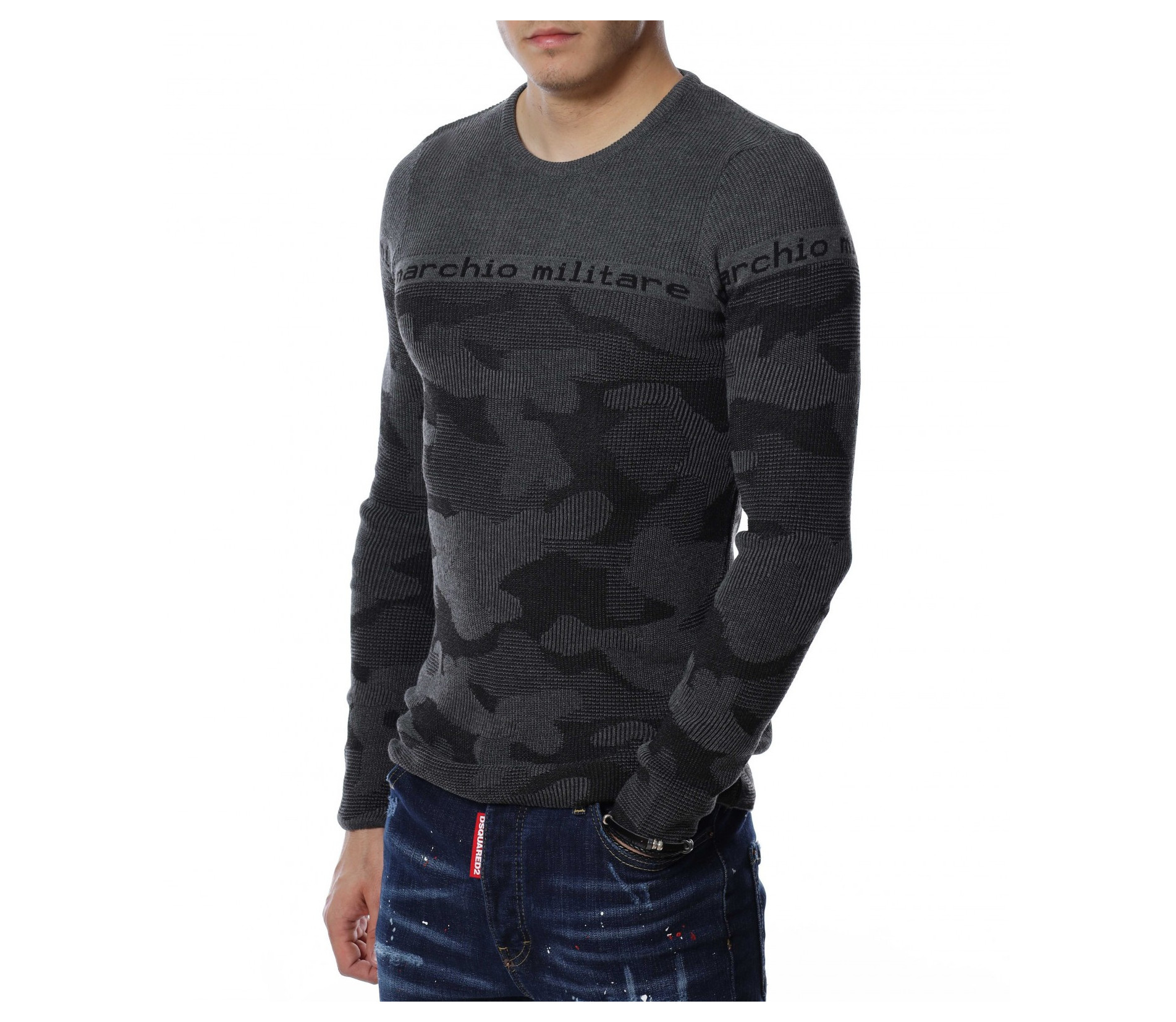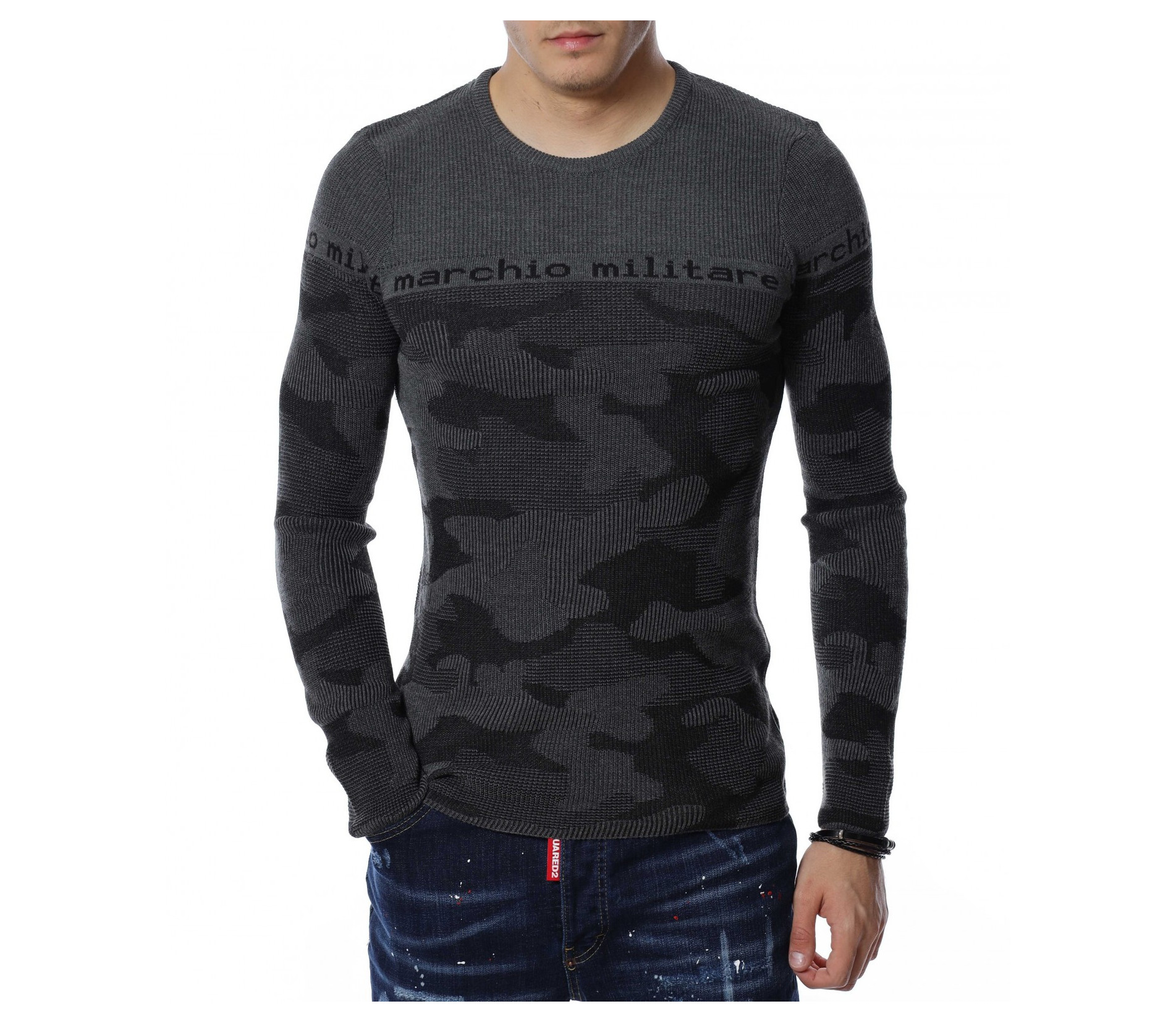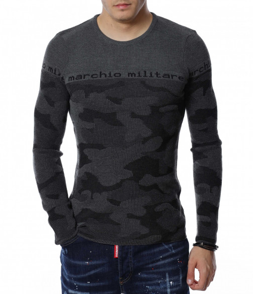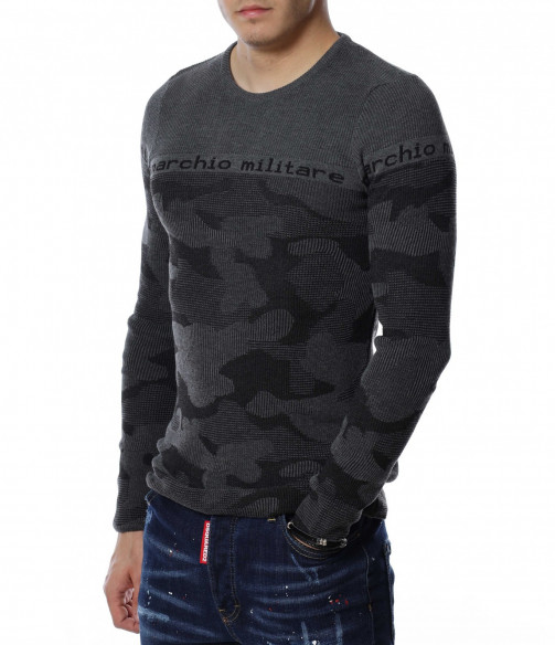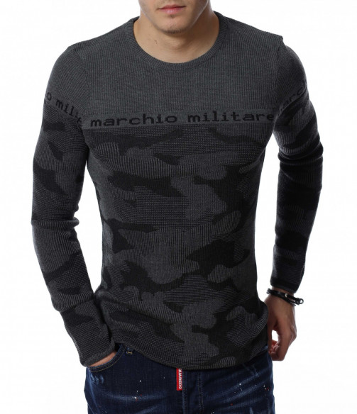 Мъжки пуловер от тънко плетиво с дълъг ръкав и камуфлажен десен. В предната част и при ръкавите е изобразен надпис \"marchio militare\". Деколтето е овално, а кройката следва формите на тялото. Дължината покрива колана, а меката материя осигурява на тялото мекота и комфорт.