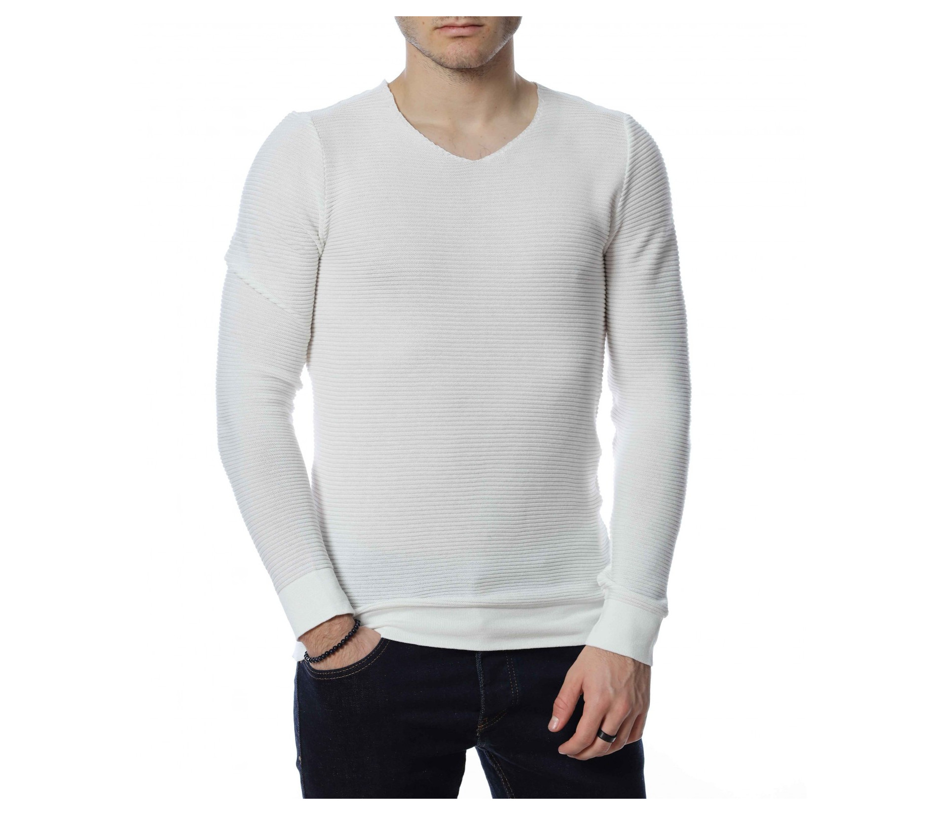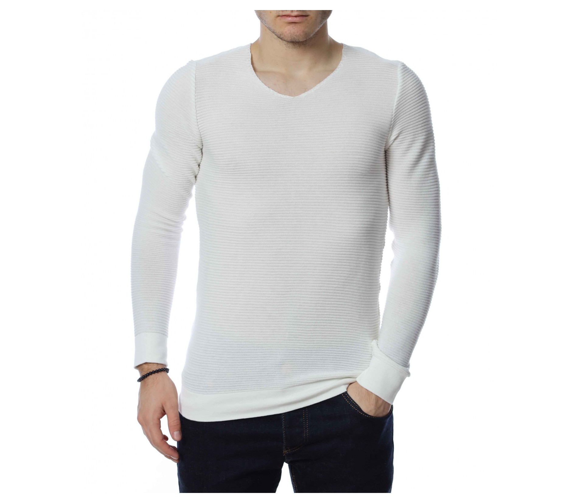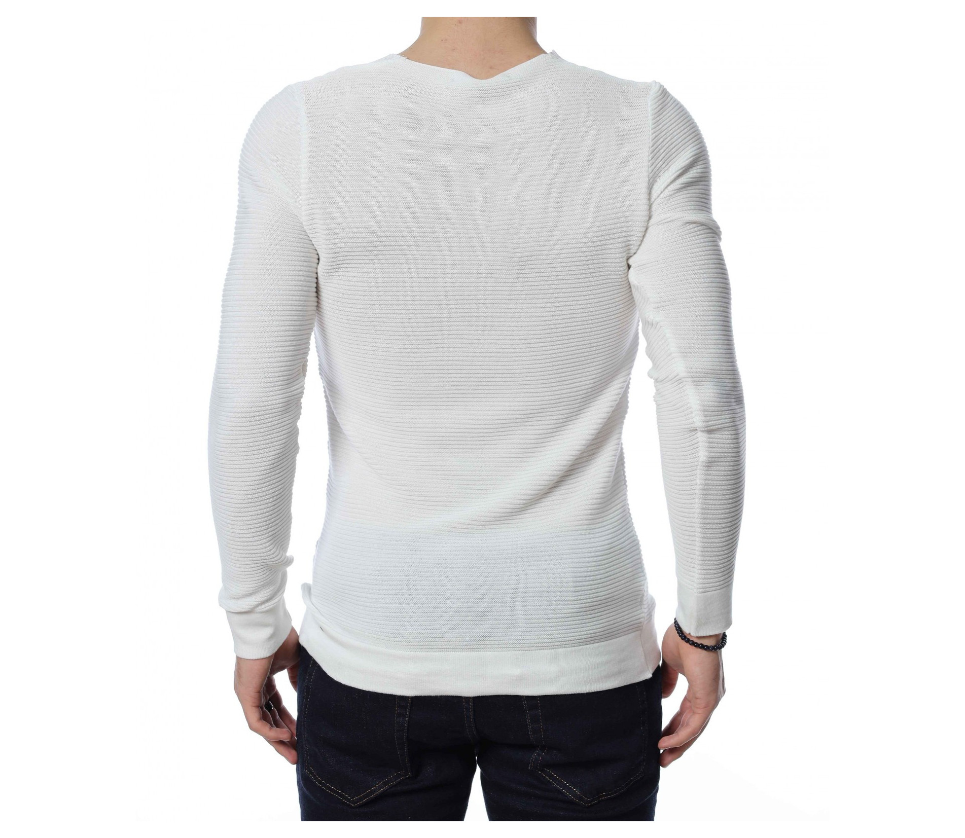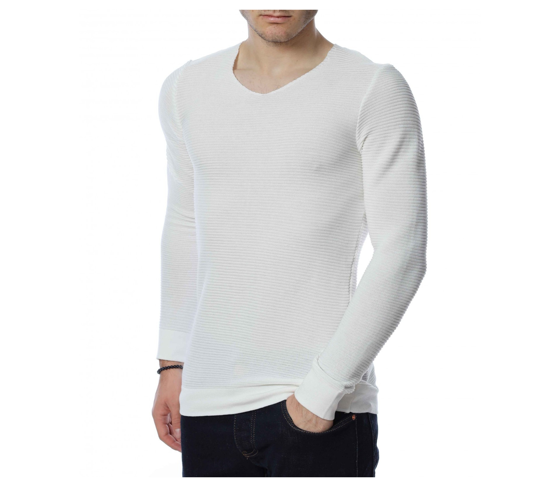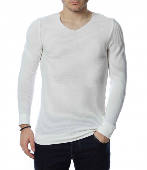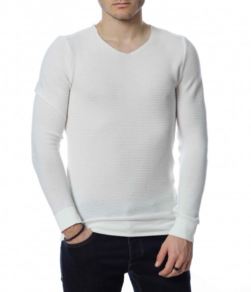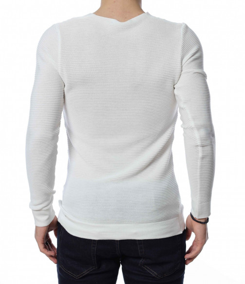 ОПИСАНИЕ НА ПРОДУКТА: Стилен мъжки пуловер в два класически цвята-черен и бял. По цялата дължина на модела има хоризонтални релефни райета, които перфектно завършват визията на блузата. Този модел пуловер е с вталена кройка и v-образно деколте. Дължината му е стандартна, в областта на ръкава и на талията моделът е с плетен ластик. В комбинация с дънки, спортни кецове и небрежен аксесоар, Вие получавате перфектна визия.
