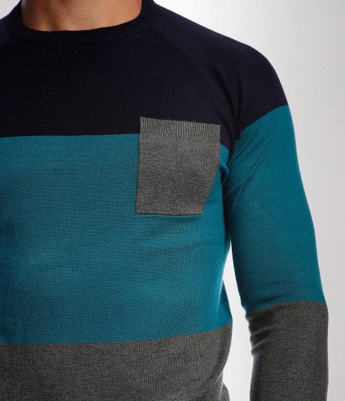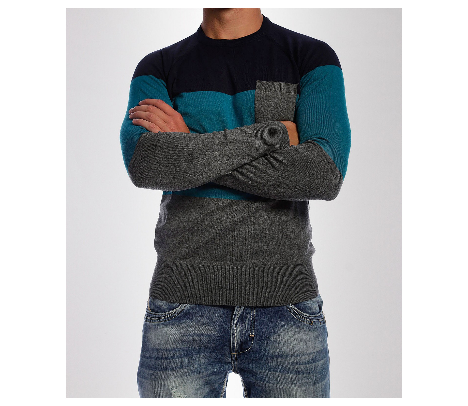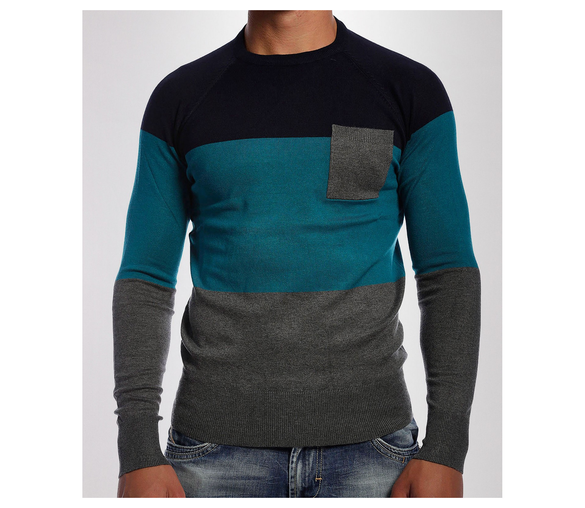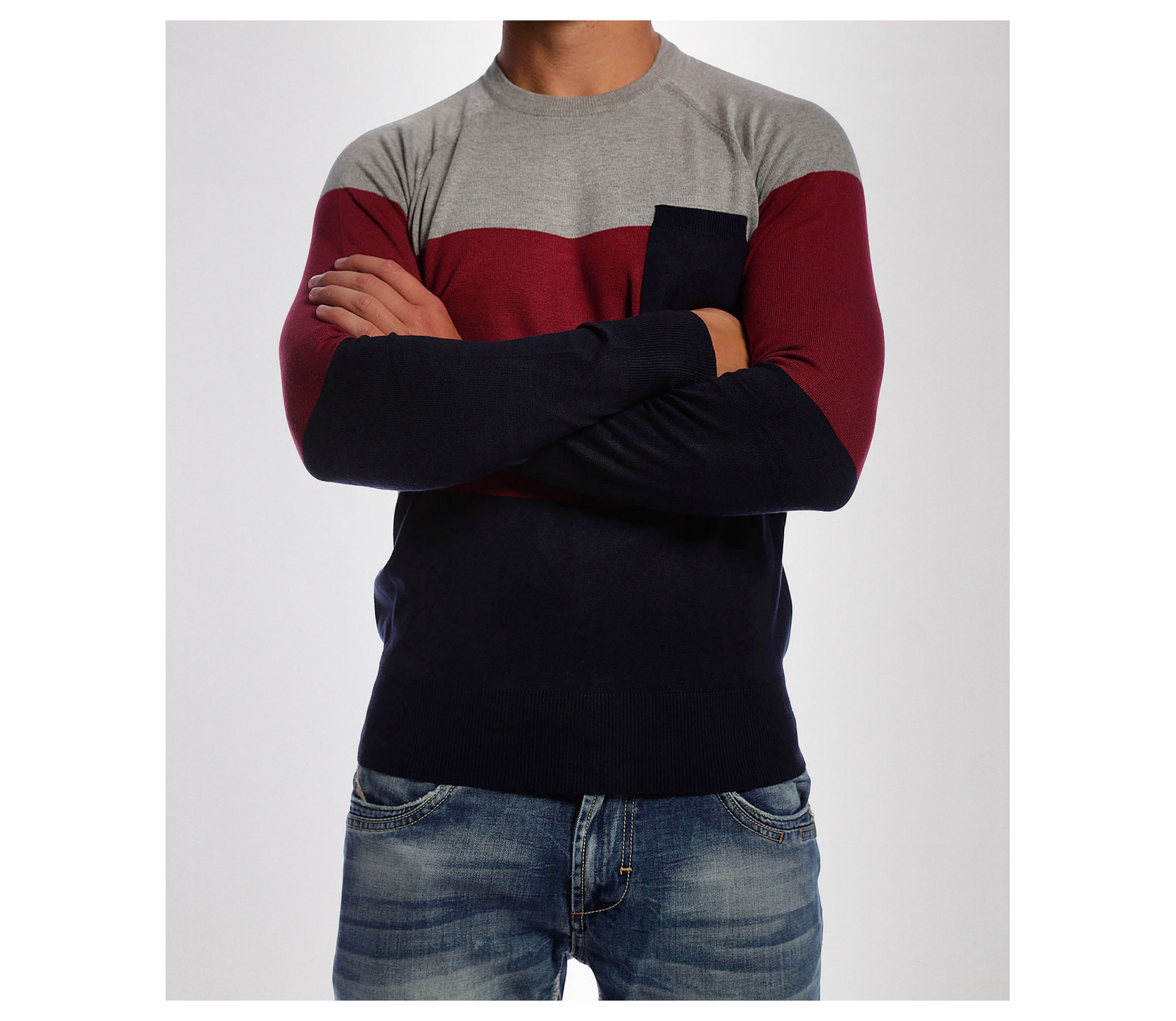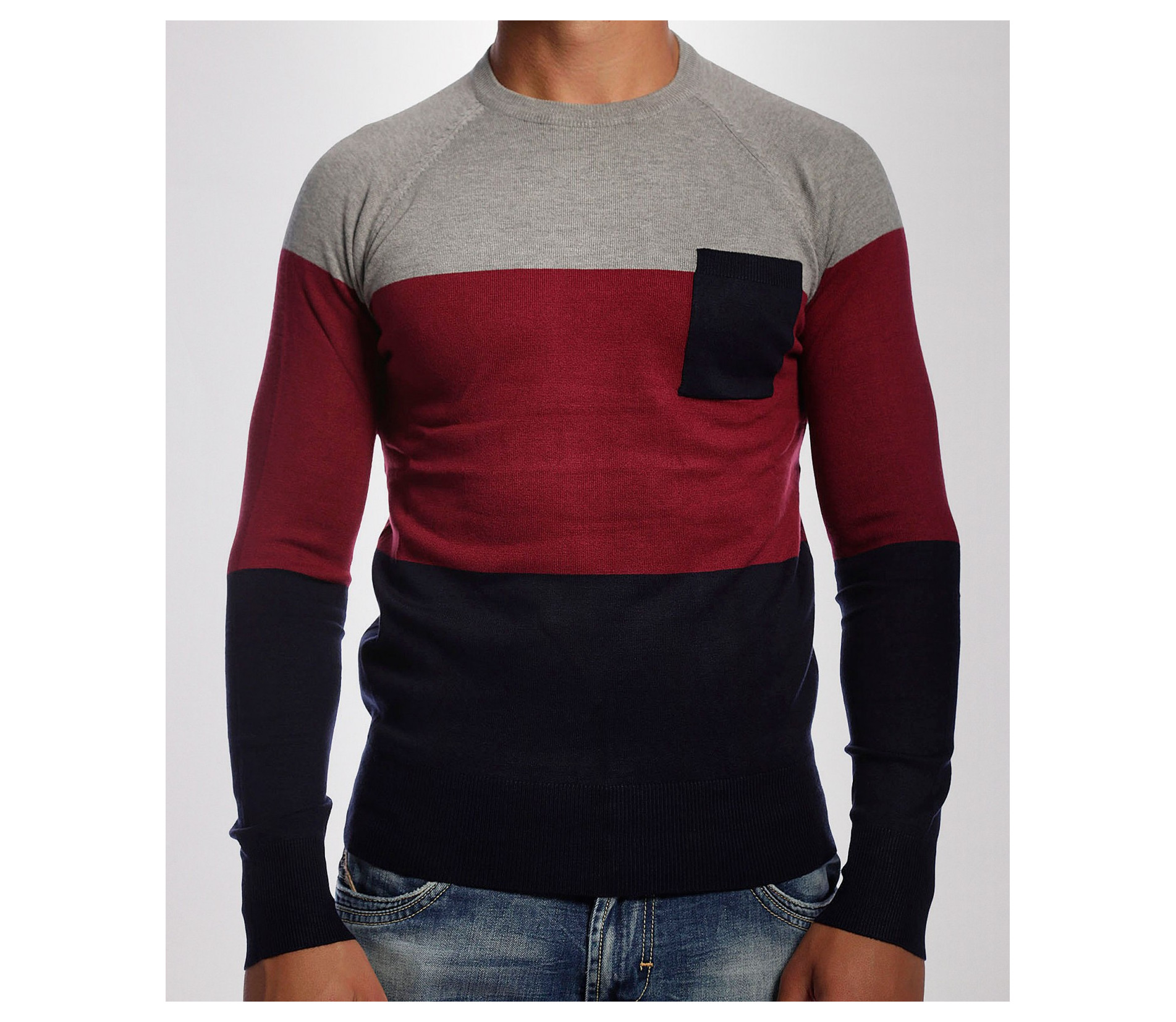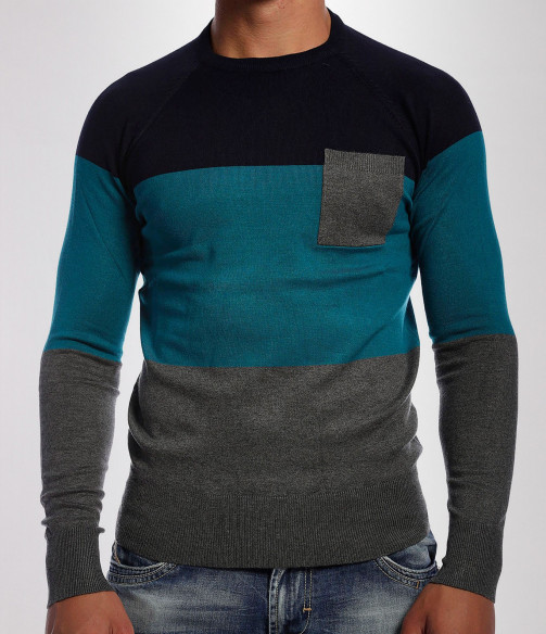 Описание на продукта: Стилен мъжки пуловер в три цвята. Пуловерът е втален по тялото и с овално деколте за удобство. В края на ръкавите и около талията се прибира с леки ластици. Свежо съчетание от цветове прави модела разчупен- сиво, синьо и тюркоазено или червено, сиво и синьо. В областа на гърдите пуловера има деликатно поставено джобче като акцент.Изработен от комбианция от материи- 78%изк.коприна,22%найлон за постигане на максимално удобство. При съчетание с дънки, стилен спотно-елегантен панталон,спортно сако,яке и аксесоар по Ваш вкус., получавате перфектен вид 100% привличащ погледите.