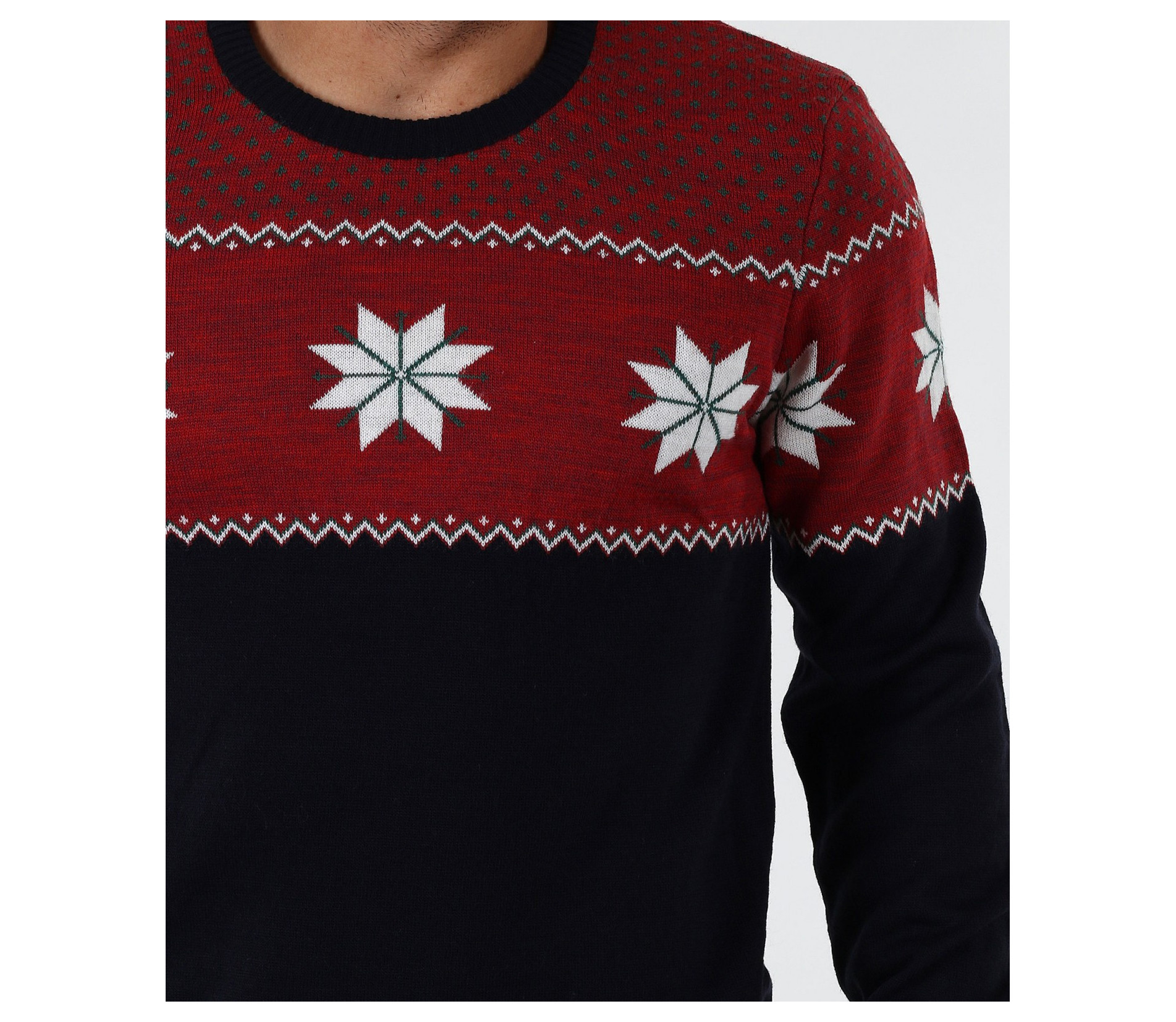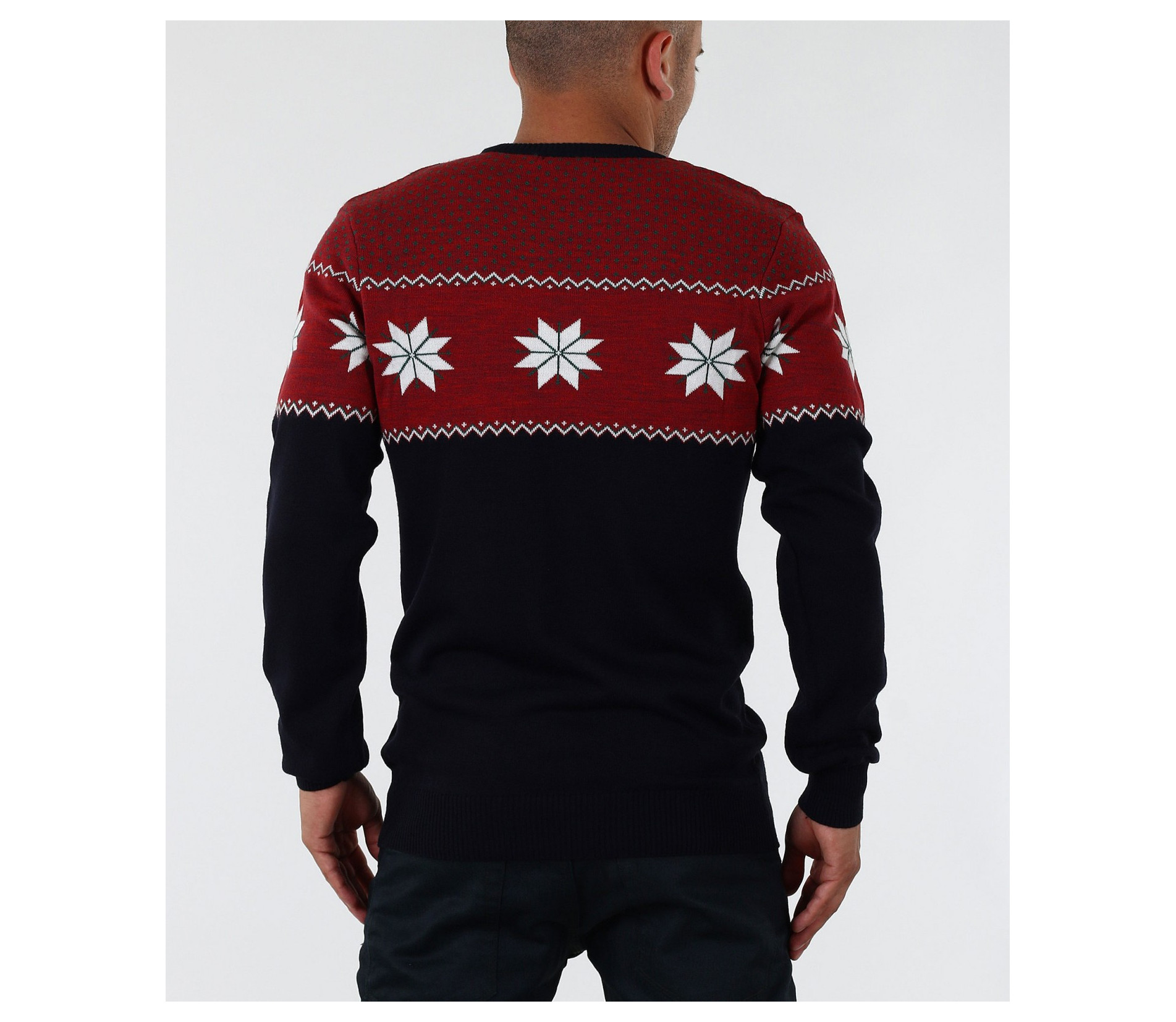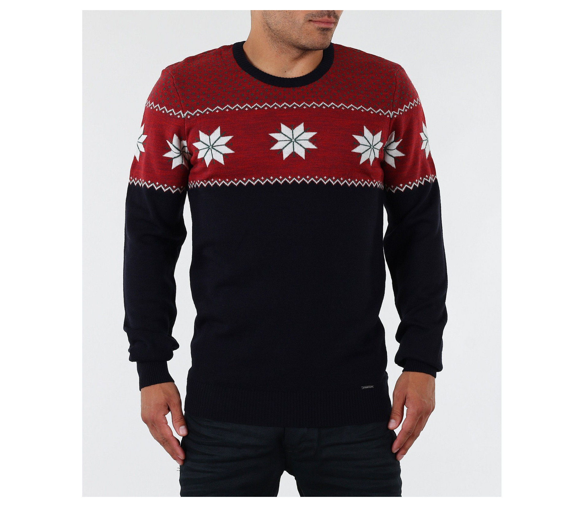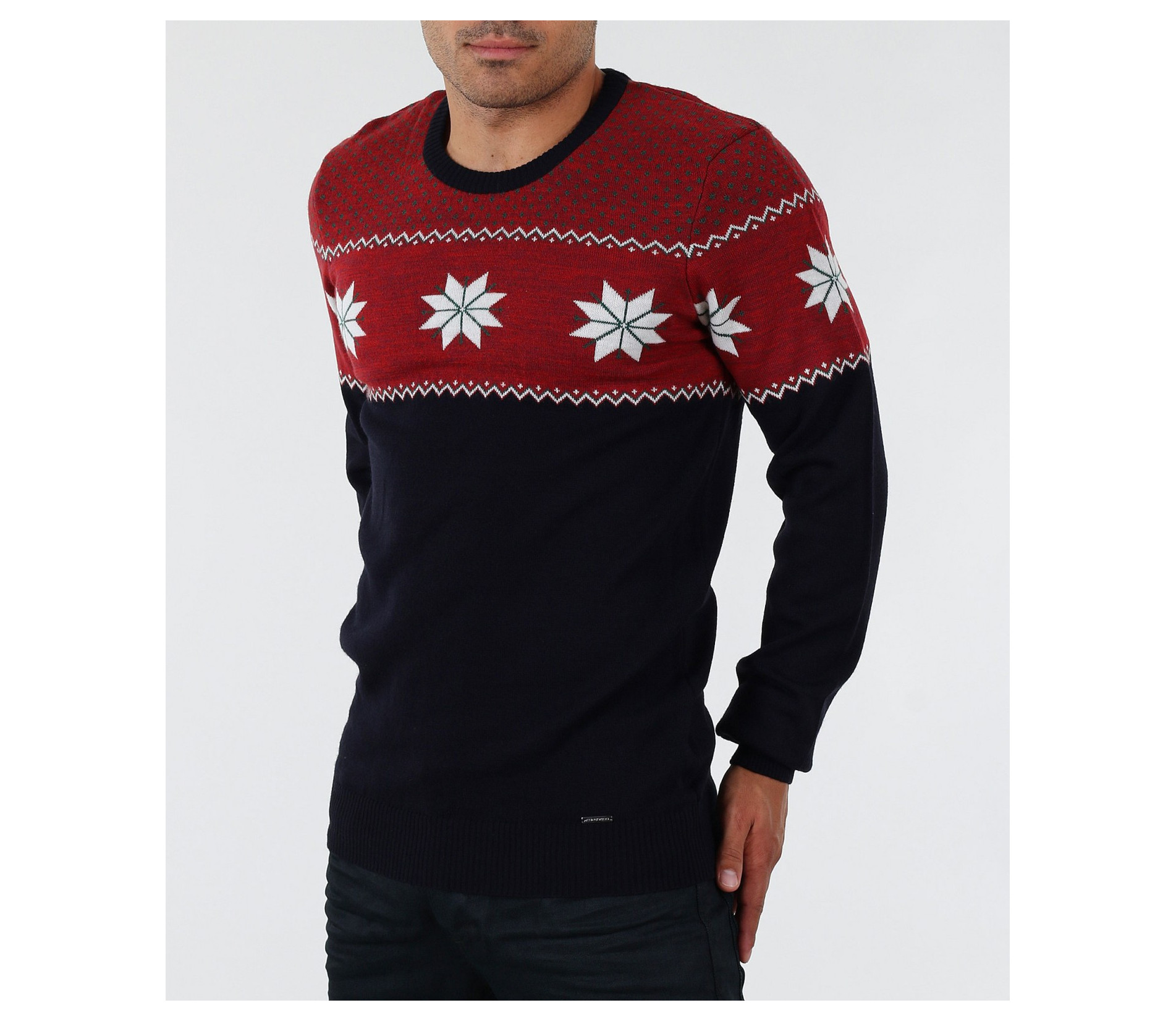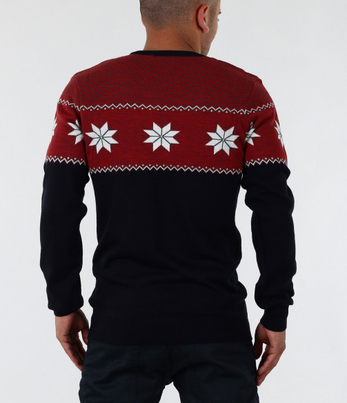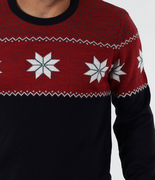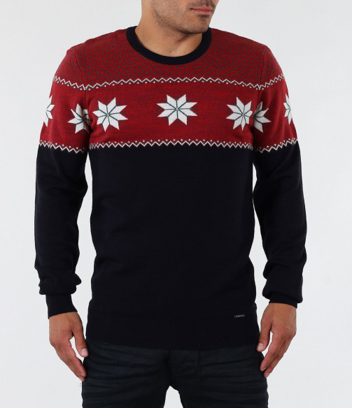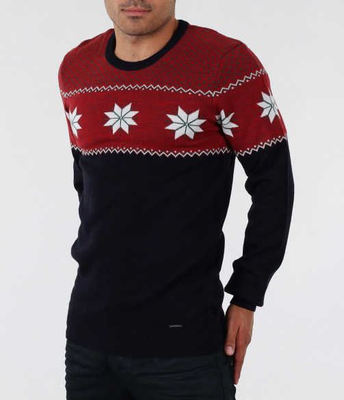 Описание на продукта: Стилен мъжки пуловер с интересен принт. В горната част моделът е декориран със свежи орнаменти в бял цвят, върху основа в червен цвят. Пуловерът в долната част е тъмно син, което перфектно контрастира с останалата част от модела. В областта на ръкавите и кръста има дебели ластици, които прибират модела по тялото. Кройката на пуловера е вталена с овално деколте и стандартна дължина. В комбинация с дънки или спортен панталон заедно с чифт топли кецове, получавате комофртна и стилна градска визия.
