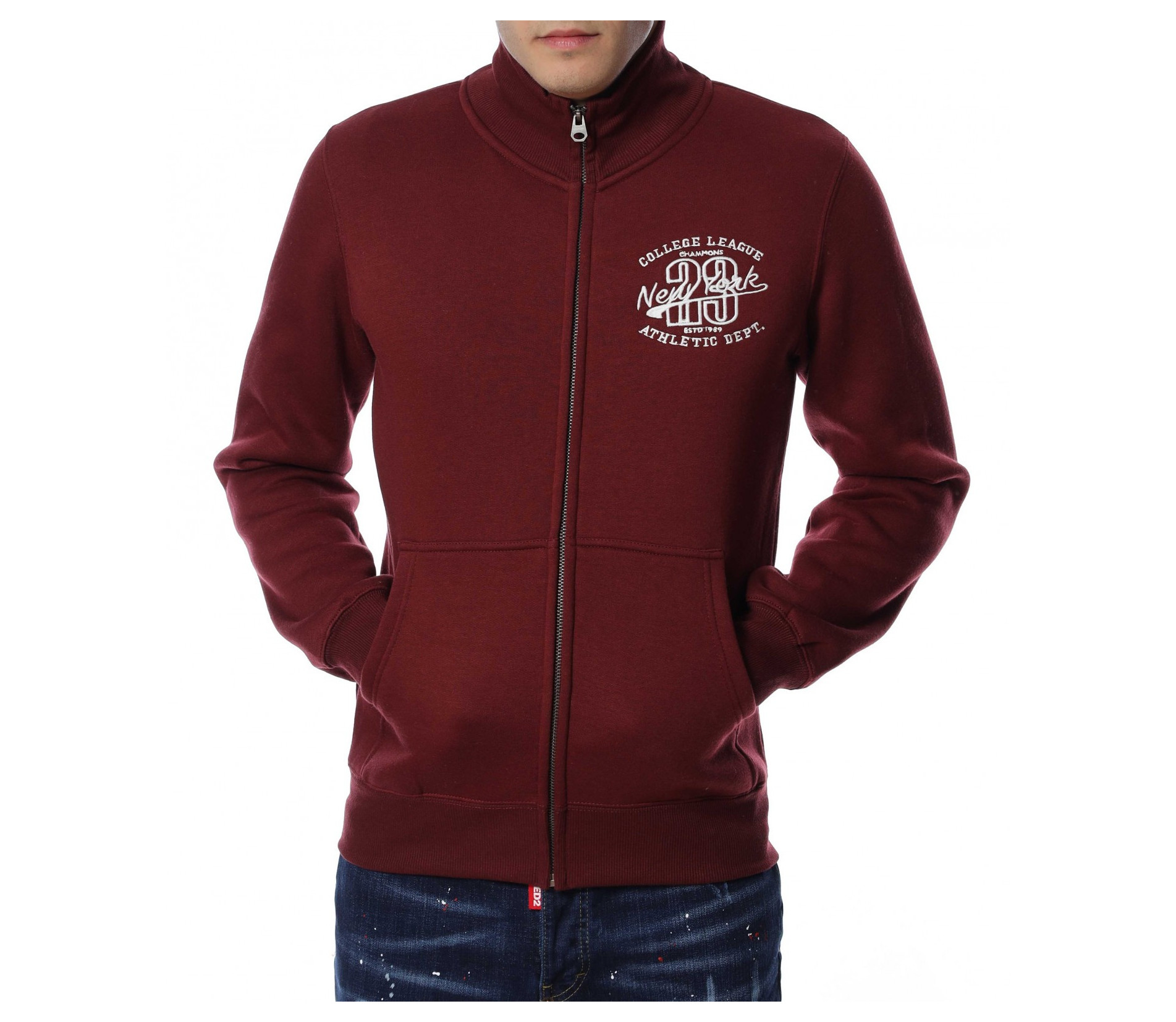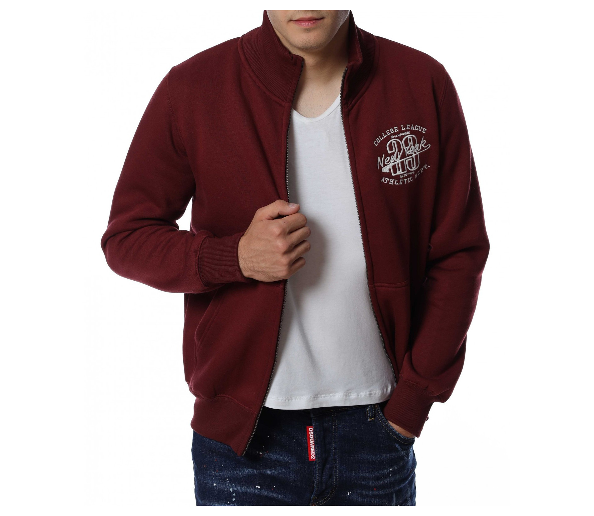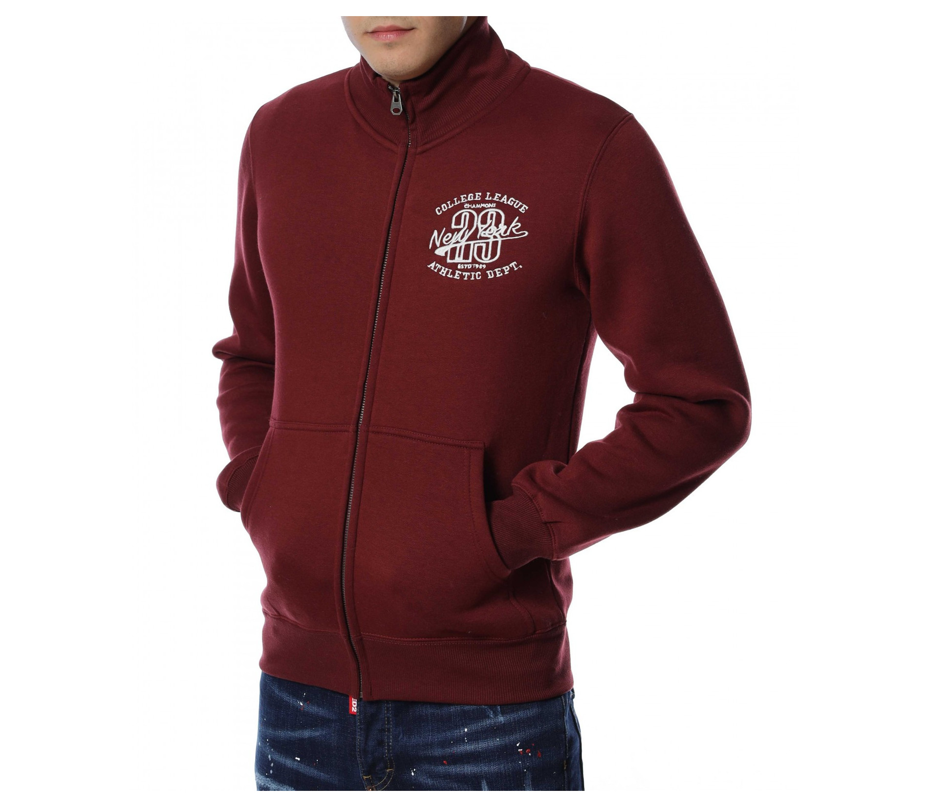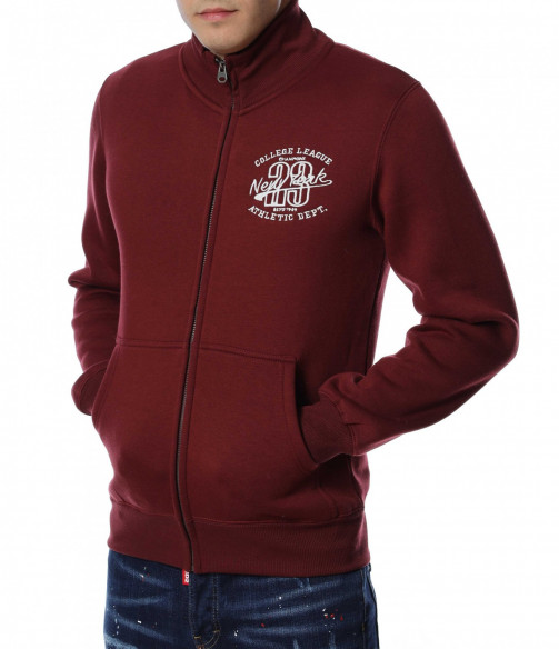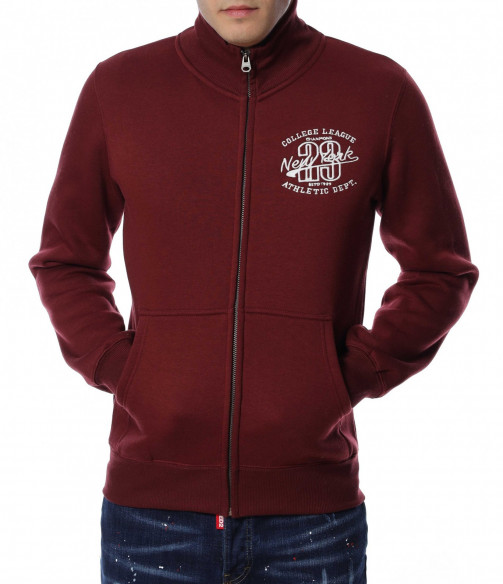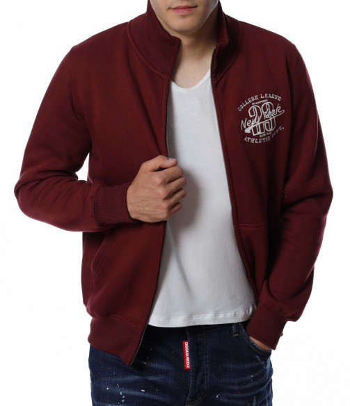 Мъжки суичер без качулка. Моделът е в едноцветен вариант, а в предната част забелязваме интересна бродерия, която придава акцент на модела. Закопчаването се състои в метален цип, а отстрани са добавени отворени джобове. Дължината покрива колана, а материята е мека и удобна. Комбинирайте с блуза и дънки.