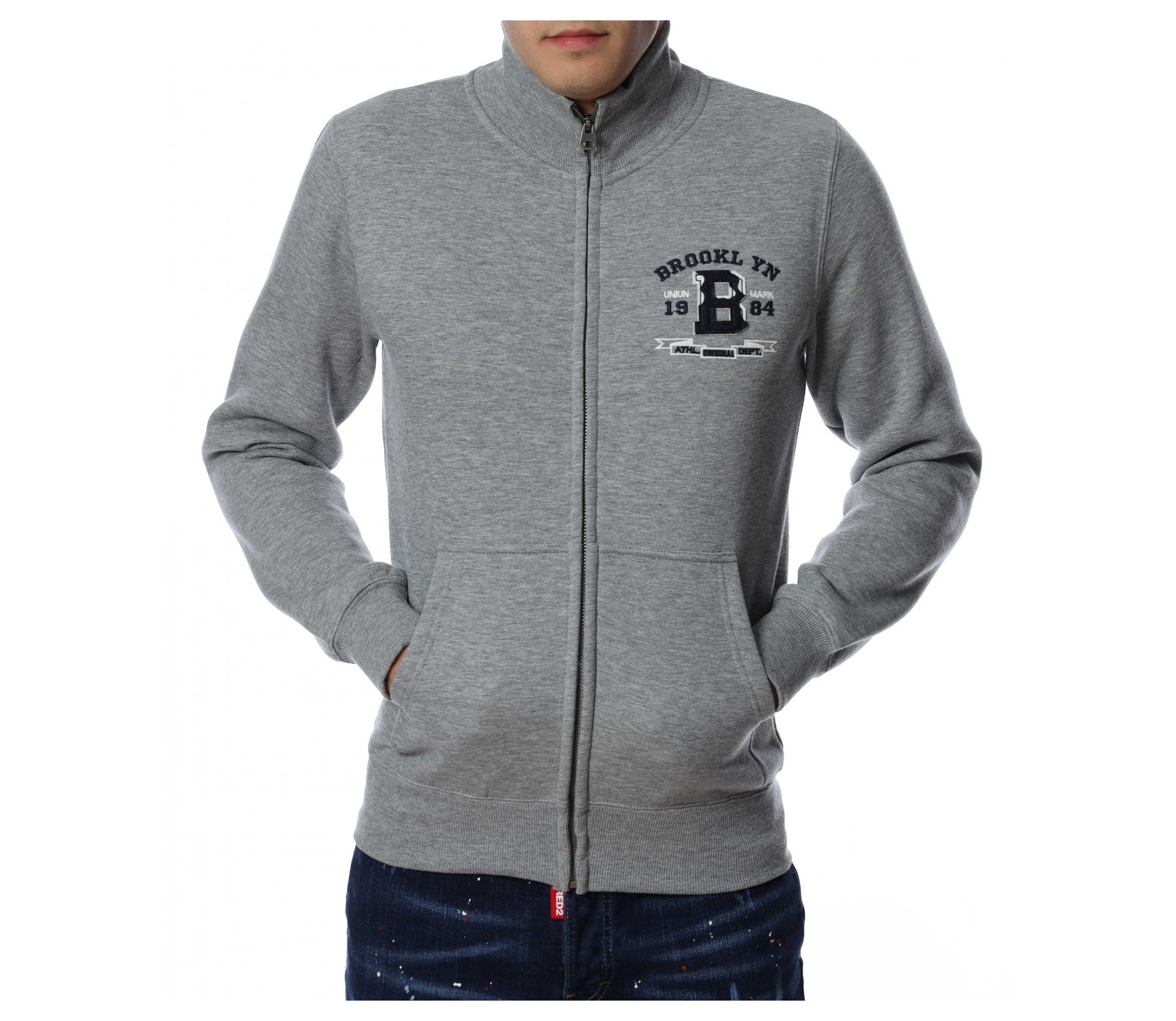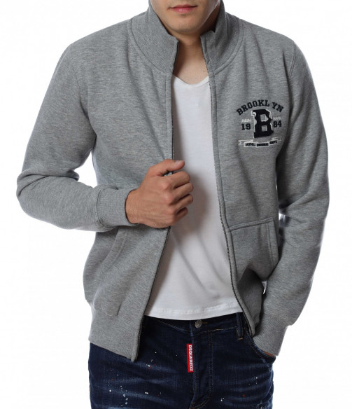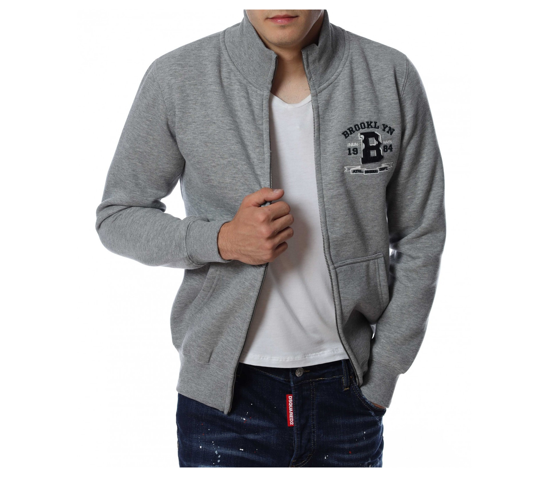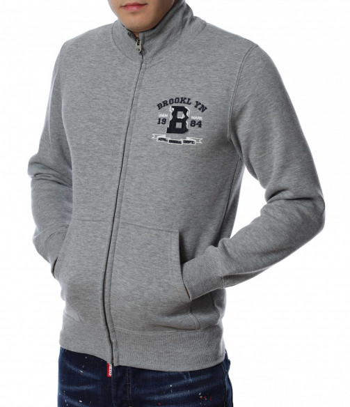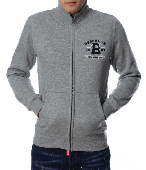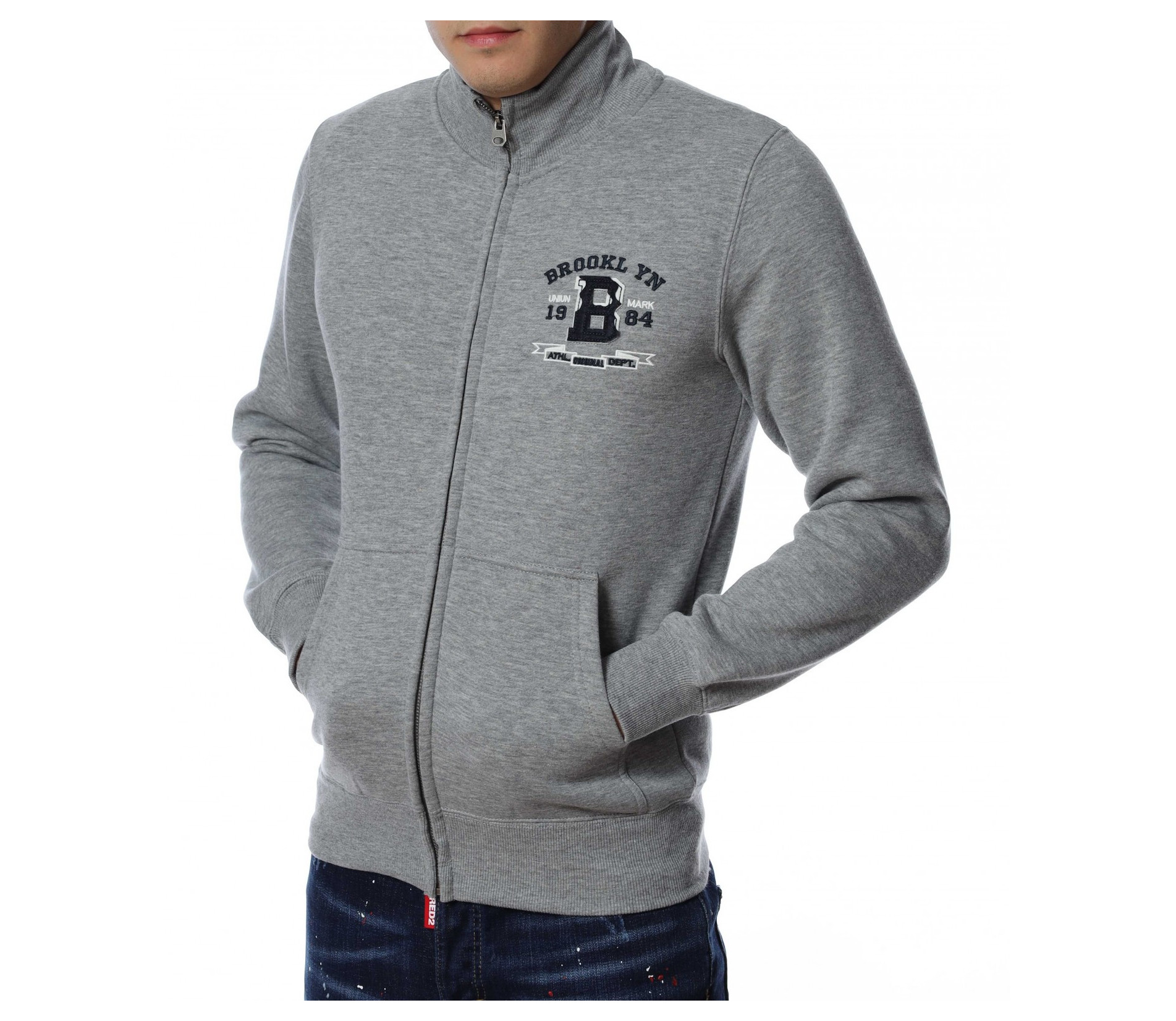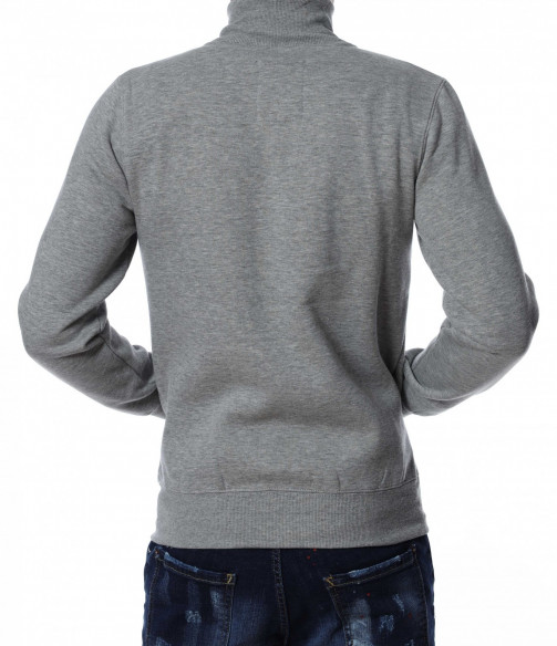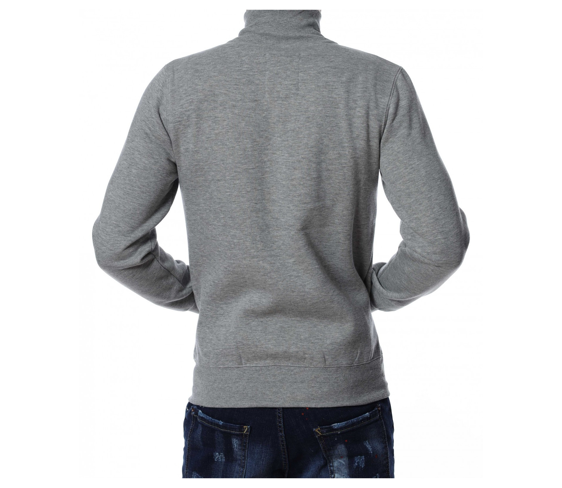 Мъжки суичер без качулка и с висока яка. Основата на дрехата е едноцветна и изчистена от много декорации и елементи. За акцент е поставена бродирана емблема, а в предната част разполага и сс два отворени джоба. Закопчаването се състои в метален цип, а дължината покрива колана. Комбинирайте с дънки или спортна долница.
