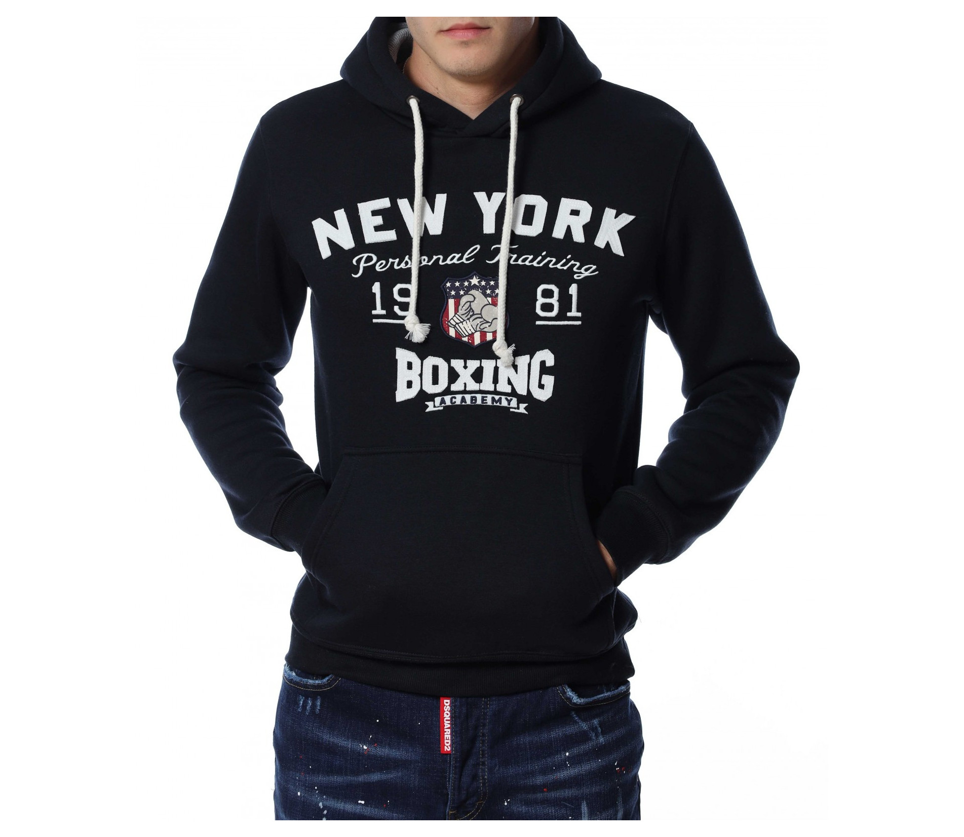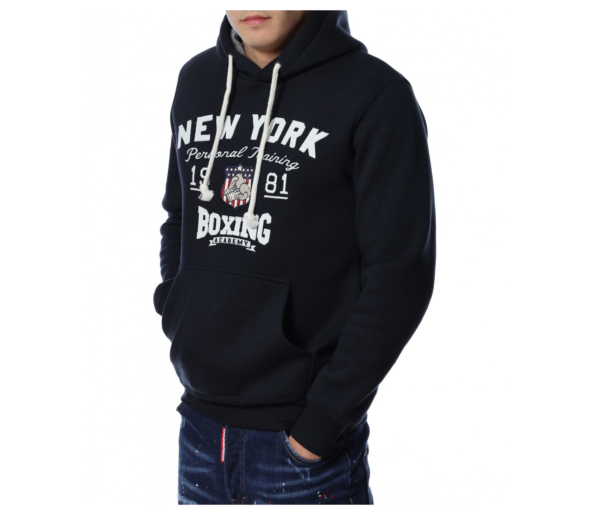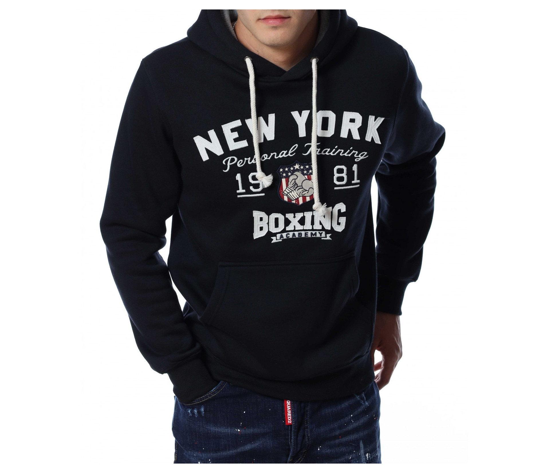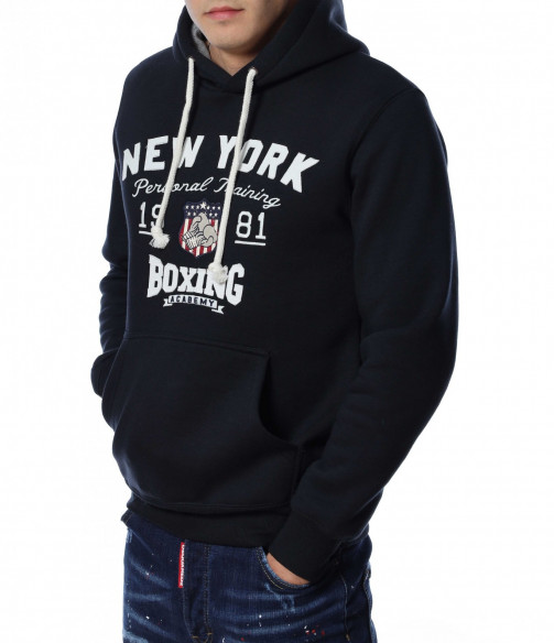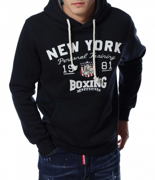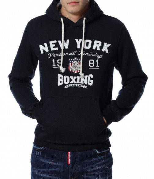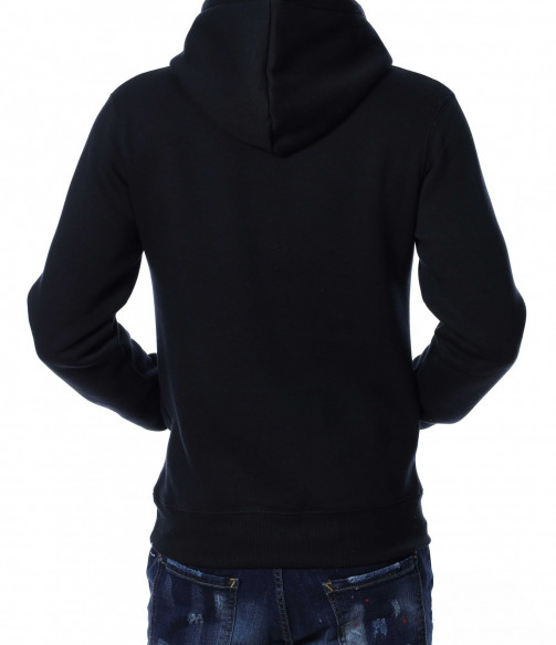 Мъжки, суичер в едноцветен вариант. В предната част са добавени забележиелни надписи, а в допълнение забелязваме и голям джоб с два отвора. Гърбът е в изчистен вариант. На качулката са добавени връзки, а дълбината покрива колана. Комбинирайте със спортна долница или дънки.