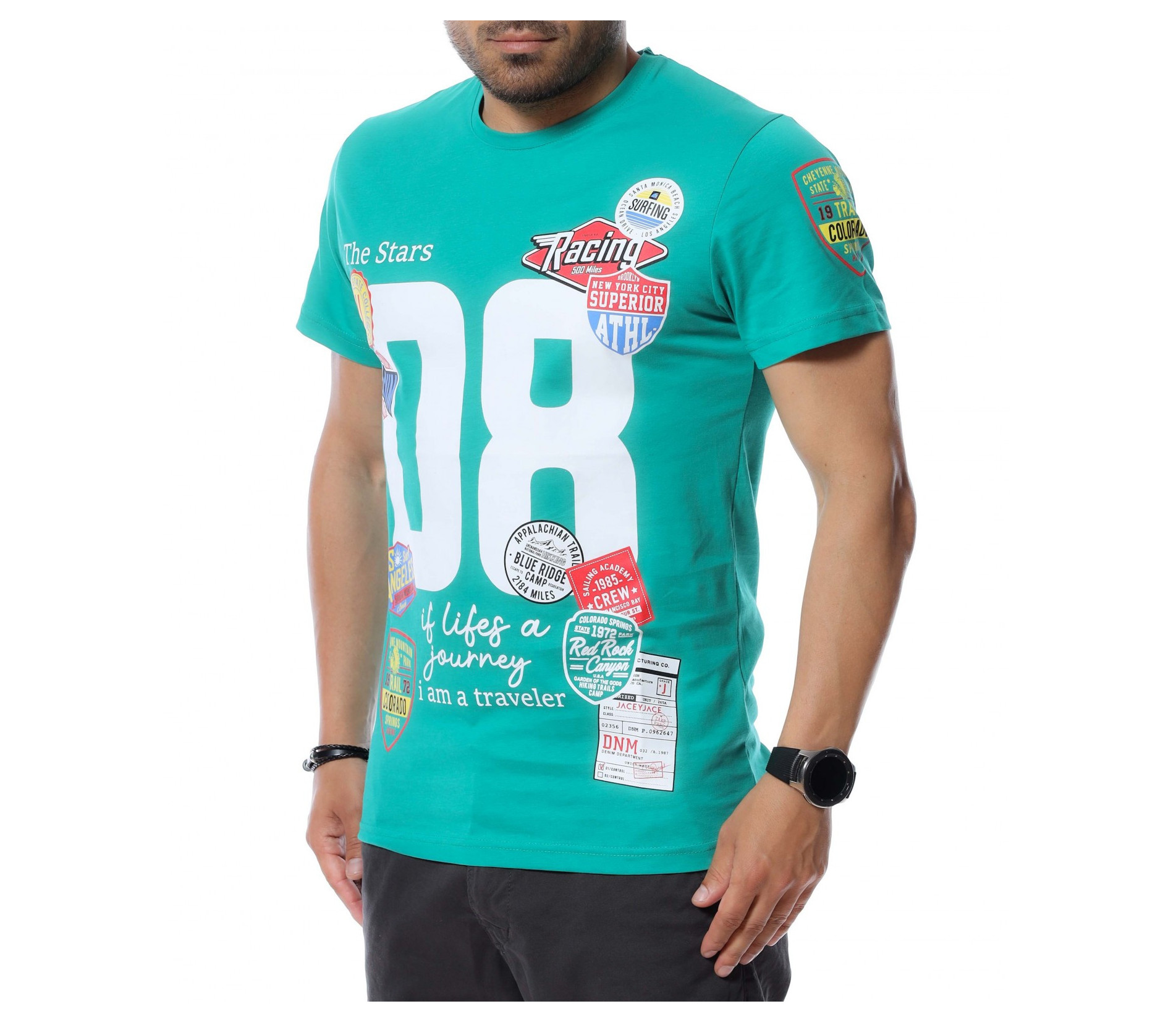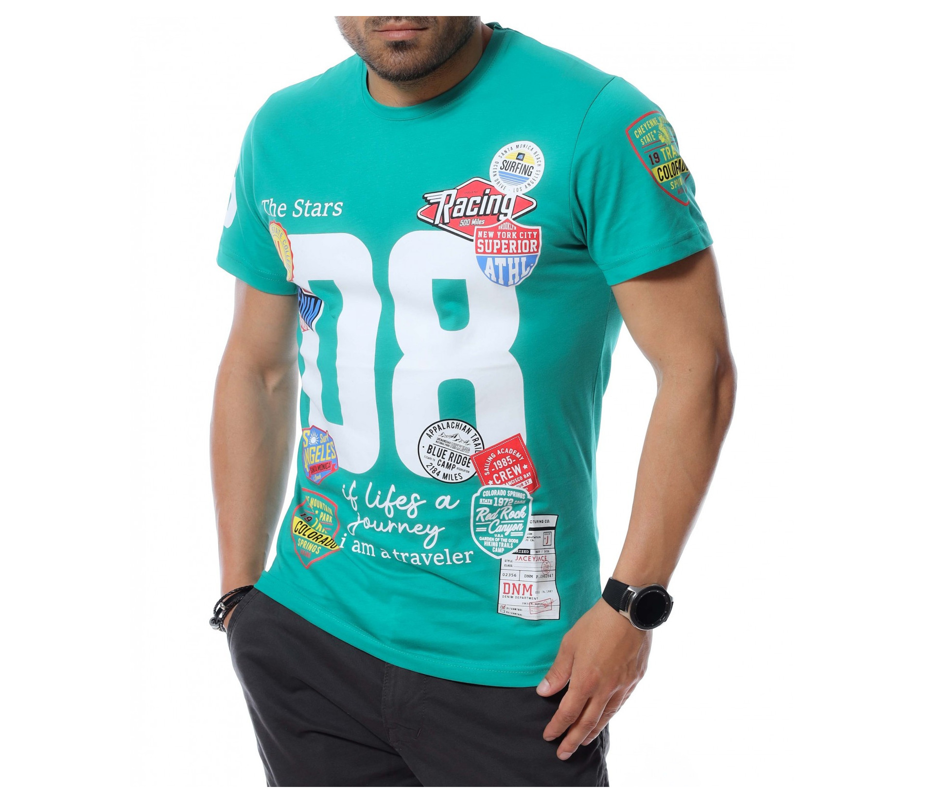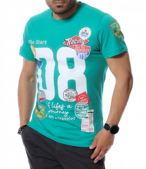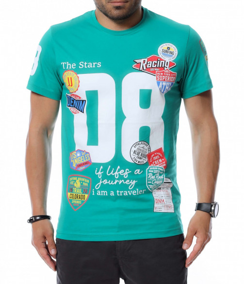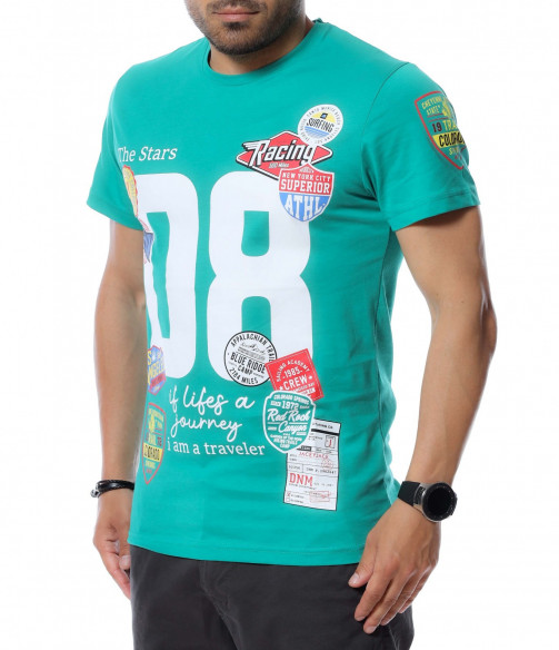Лятото е най-подходящото време да разчупите визията си и да освежите гардероба си с цветен модел тениска. Нашето предложение - едноцветна блуза с къс ръкав и ретро апликация в предната част - големи цифри, заобградени от малки лога. В допълнение към щампата забелязваме и бял надпис - Your life is journey, I am a traveler. На гърбът като декорация откриваме бяла лента. Дължината е стандартна, покриваща колана, а кройката следва линиите на тялото. Меката материя придава комфорт и лекота на движение. Комбинирате с дънки, къси панталони, кецове и любим аксесоар.