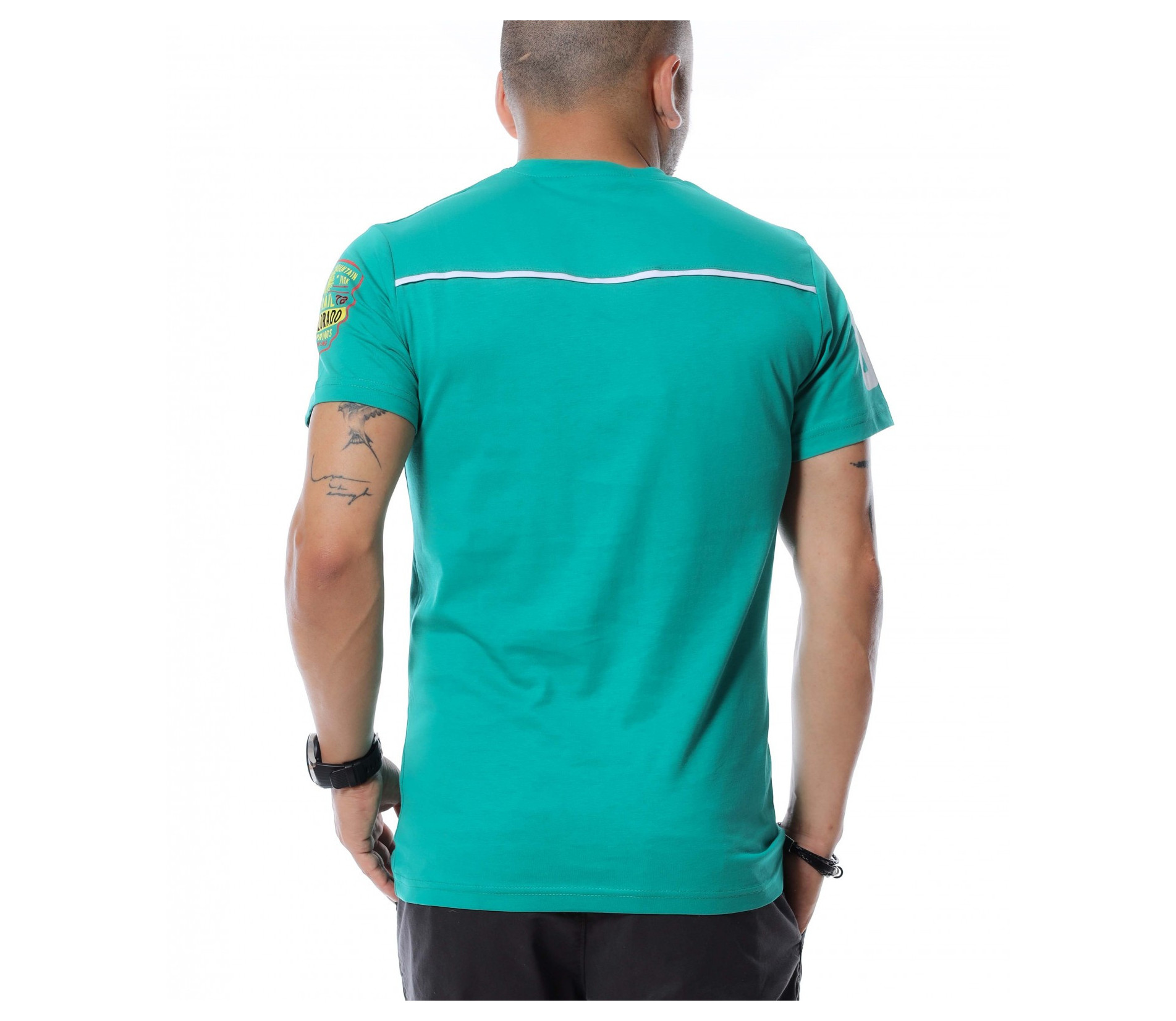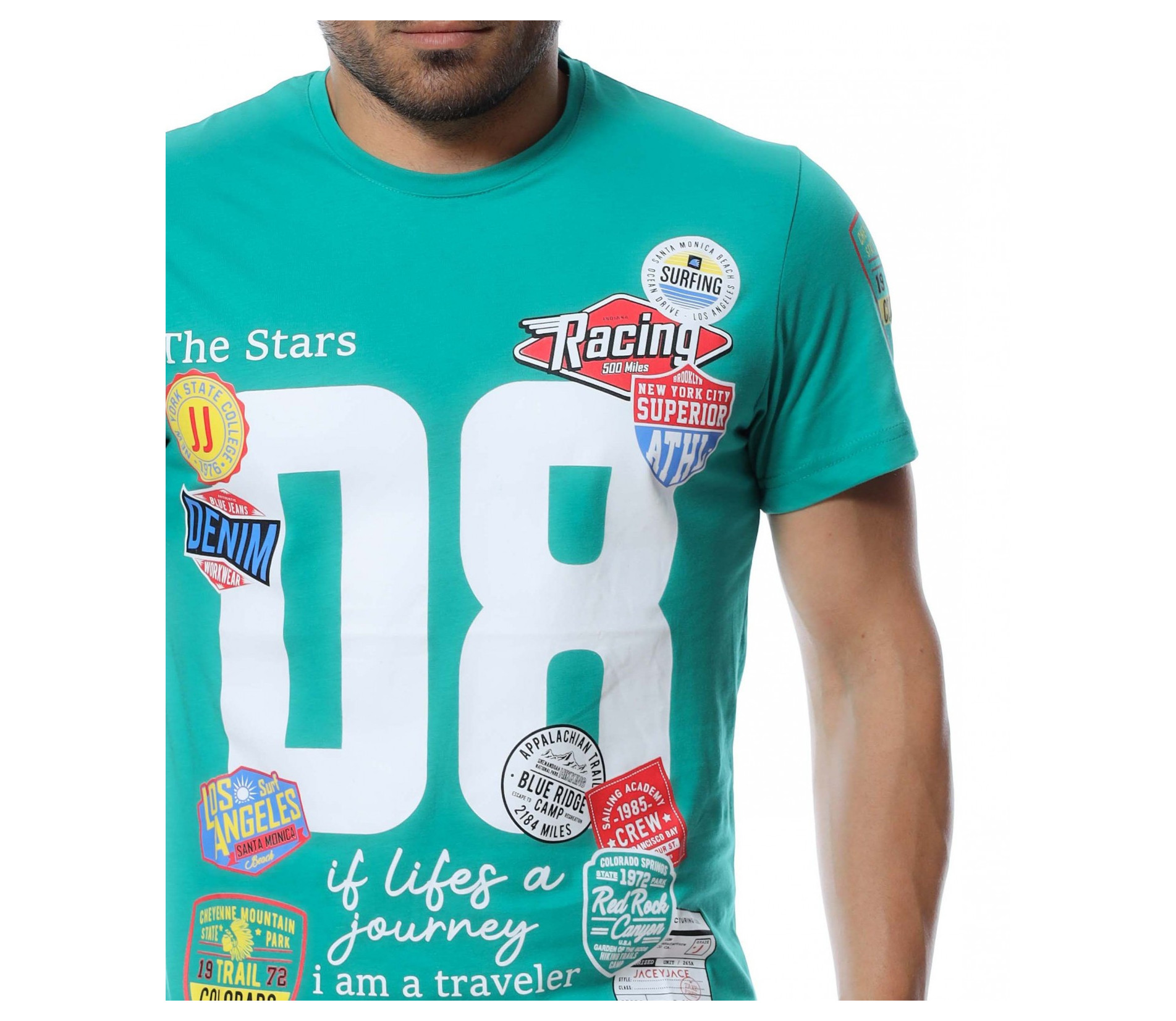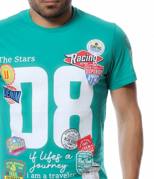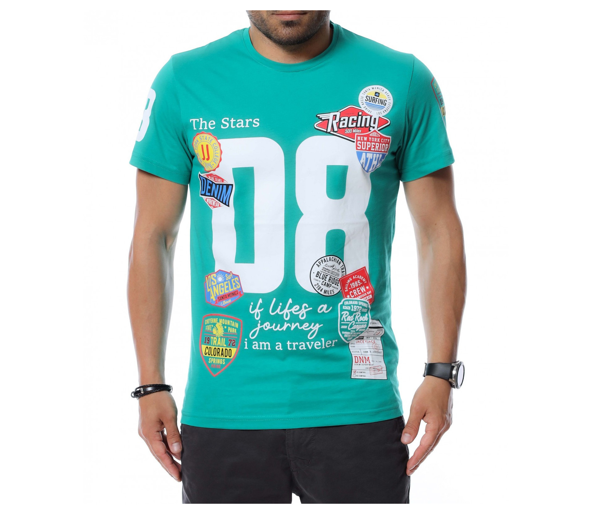 Лятото е най-подходящото време да разчупите визията си и да освежите гардероба си с цветен модел тениска. Нашето предложение - едноцветна блуза с къс ръкав и ретро апликация в предната част - големи цифри, заобградени от малки лога. В допълнение към щампата забелязваме и бял надпис - Your life is journey, I am a traveler. На гърбът като декорация откриваме бяла лента. Дължината е стандартна, покриваща колана, а кройката следва линиите на тялото. Меката материя придава комфорт и лекота на движение. Комбинирате с дънки, къси панталони, кецове и любим аксесоар.