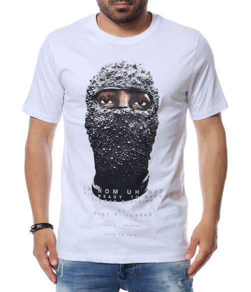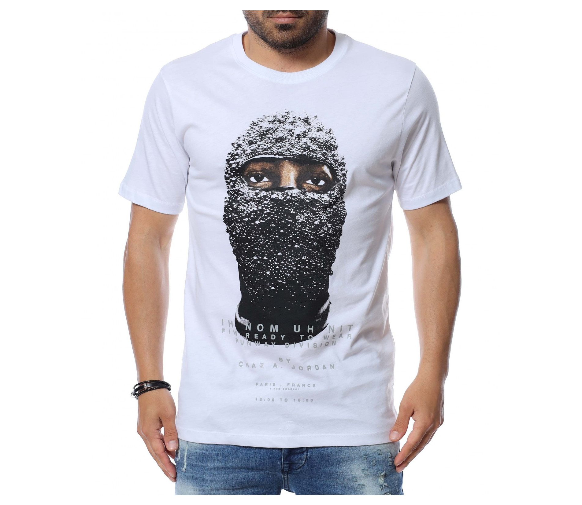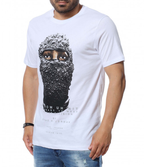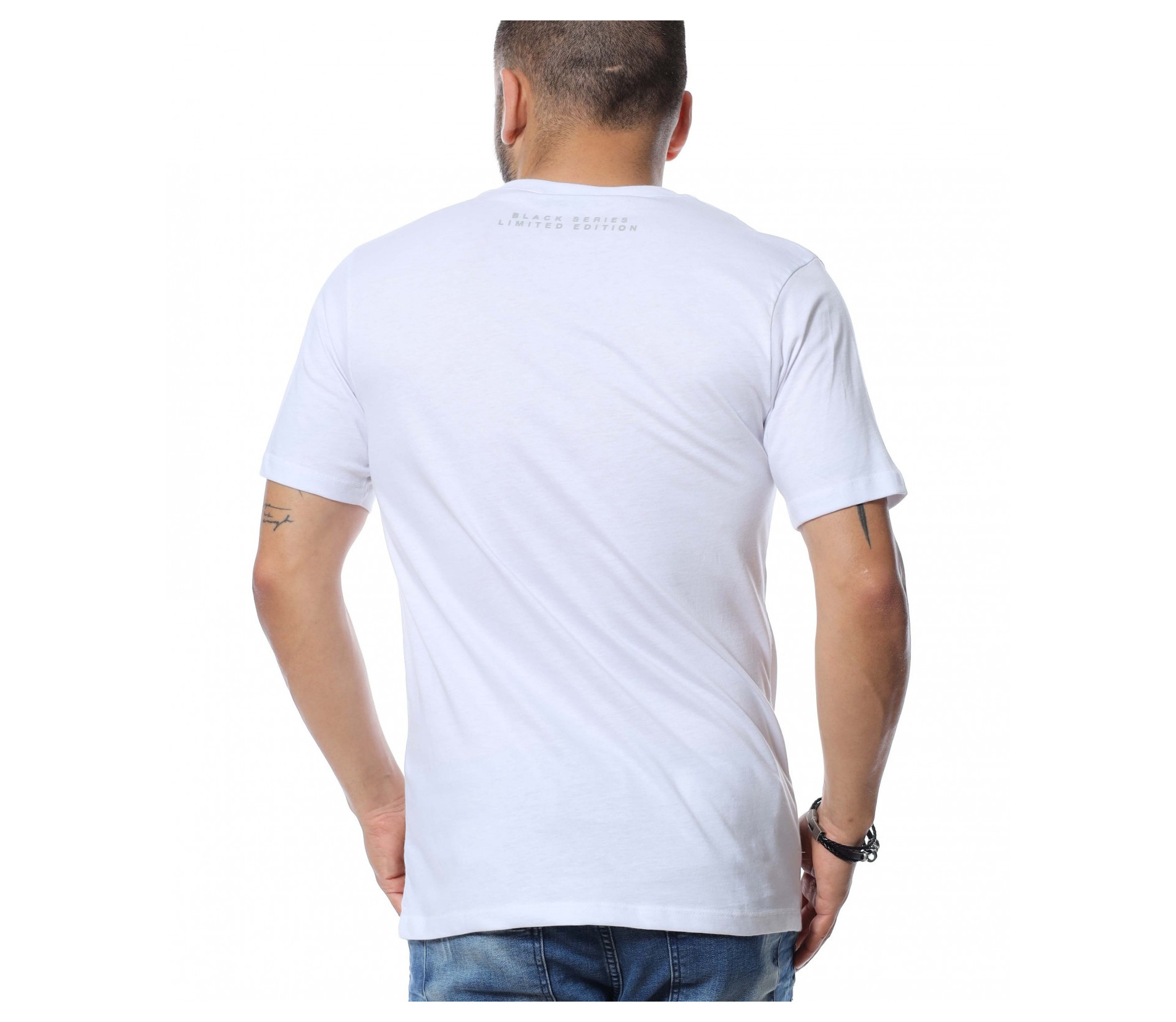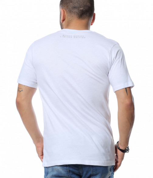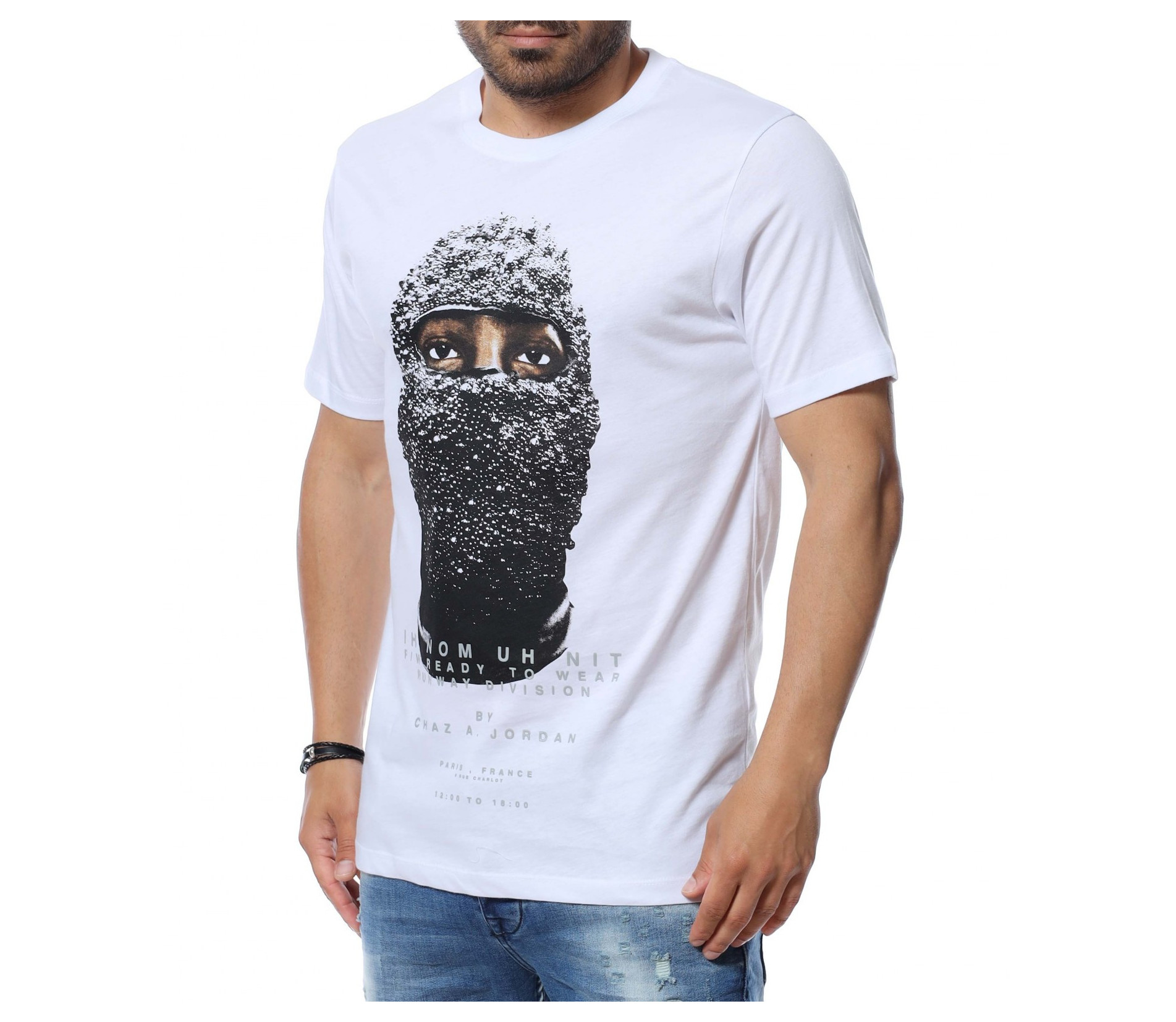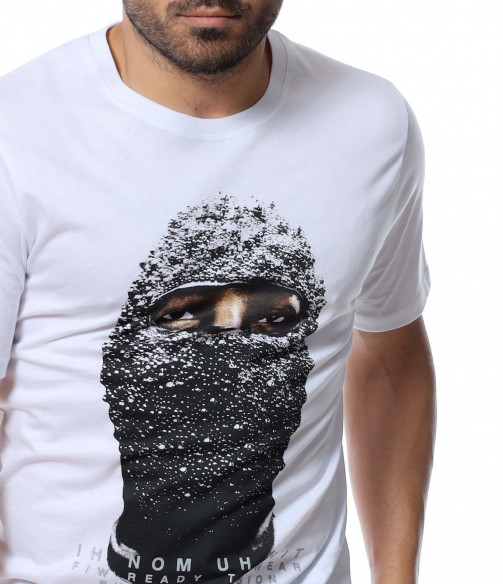 Мъжка блуза с къс ръкав и щампа. Основата е едноцветна, а в предната част е позиционирана апликация с човешки лик и надписи в допълнение. Задната част, под овлното деколте е добавен дребен текст. Тениската е с адаптираща се кройка и дължина, която покрива колана. Изработена от 100% мека, памучна материя. Комбинирайте с кецове, дънки и аксесоар.