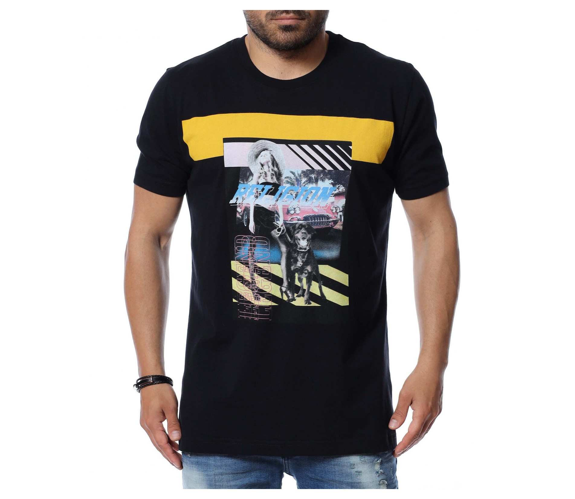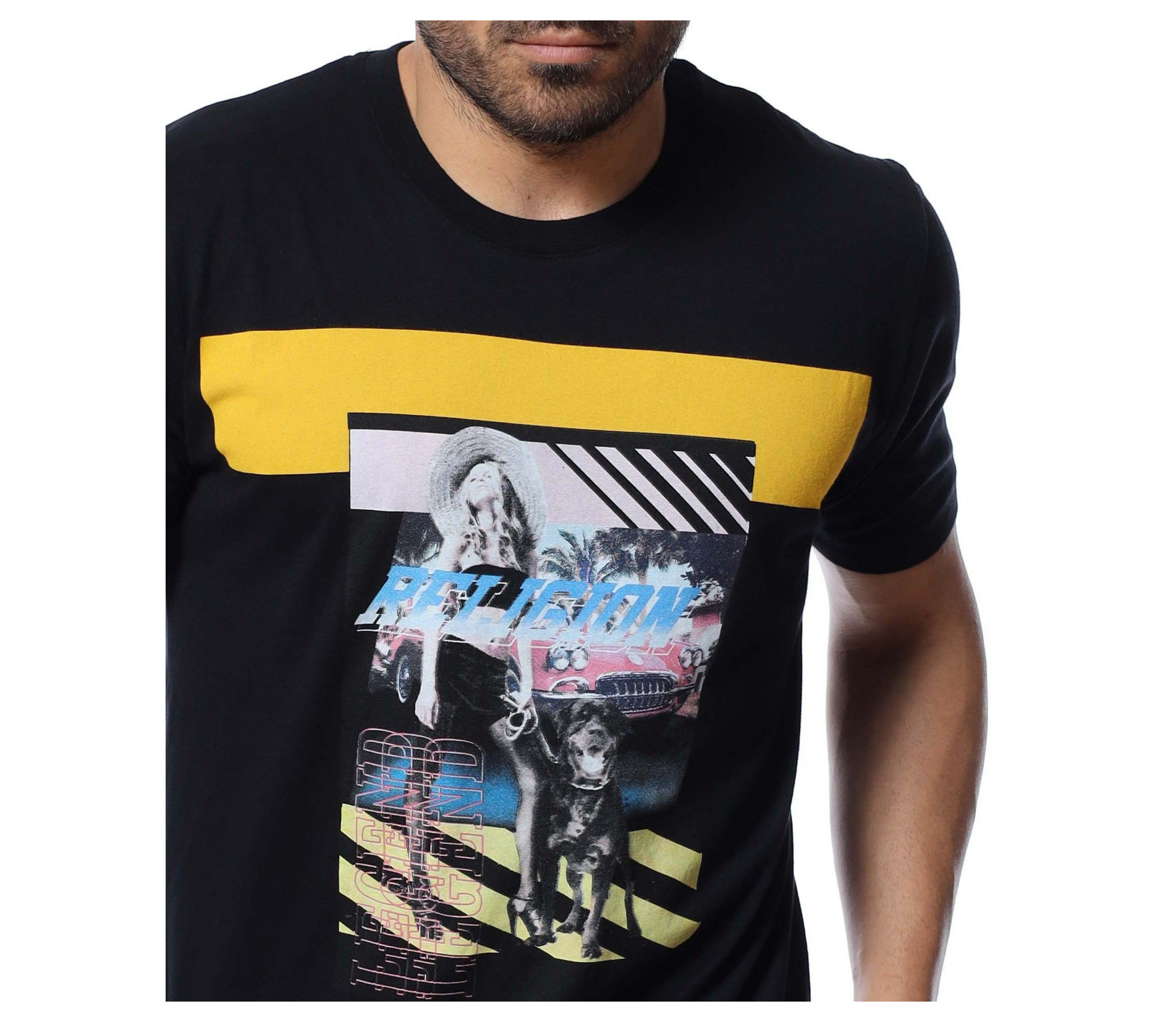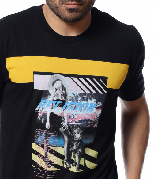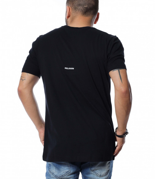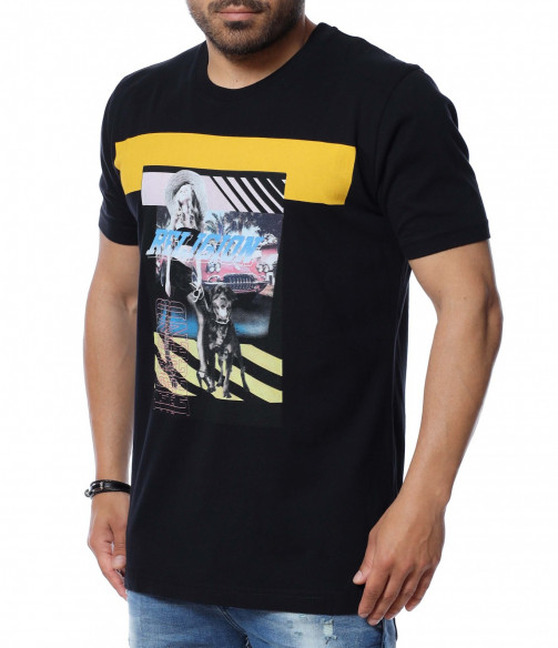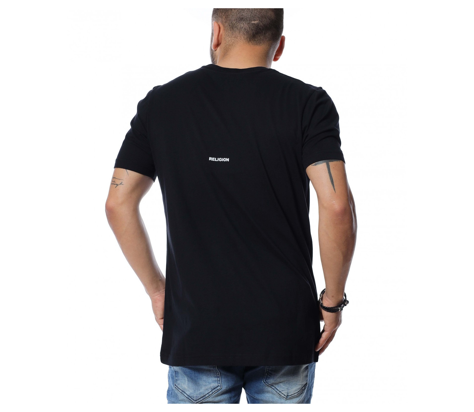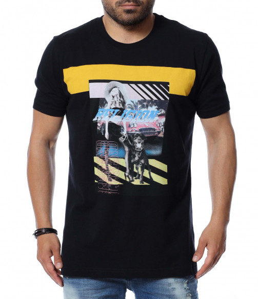 Мъжка блуза с къс ръкав и щампа. Основата на тениската е едноцветна, а в предната част е разположена апликация, под формата на изображение. На гърба е поставен дребен надпис като допълнителен детайл. Моделът е небрежно издължен, а кройката следва линиите на тялото. Изработена от мека, памучна материя. Комбинирайте с дънков панталон, кецове и любими аксесоари.