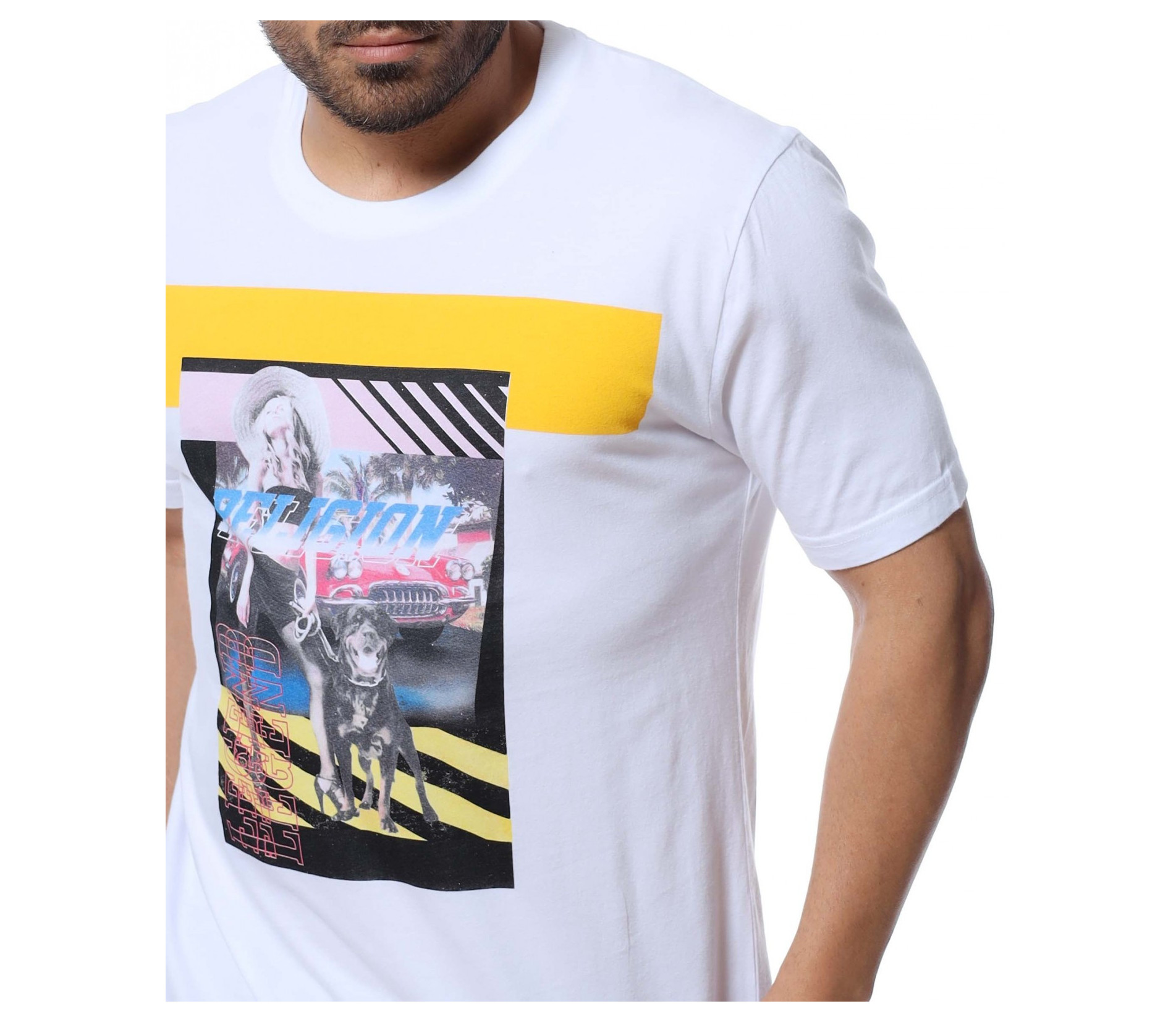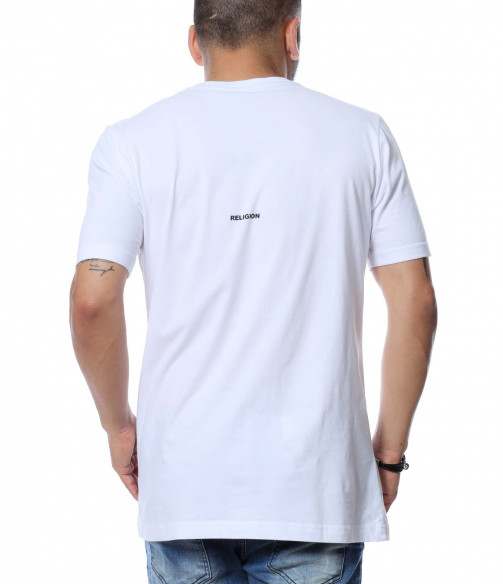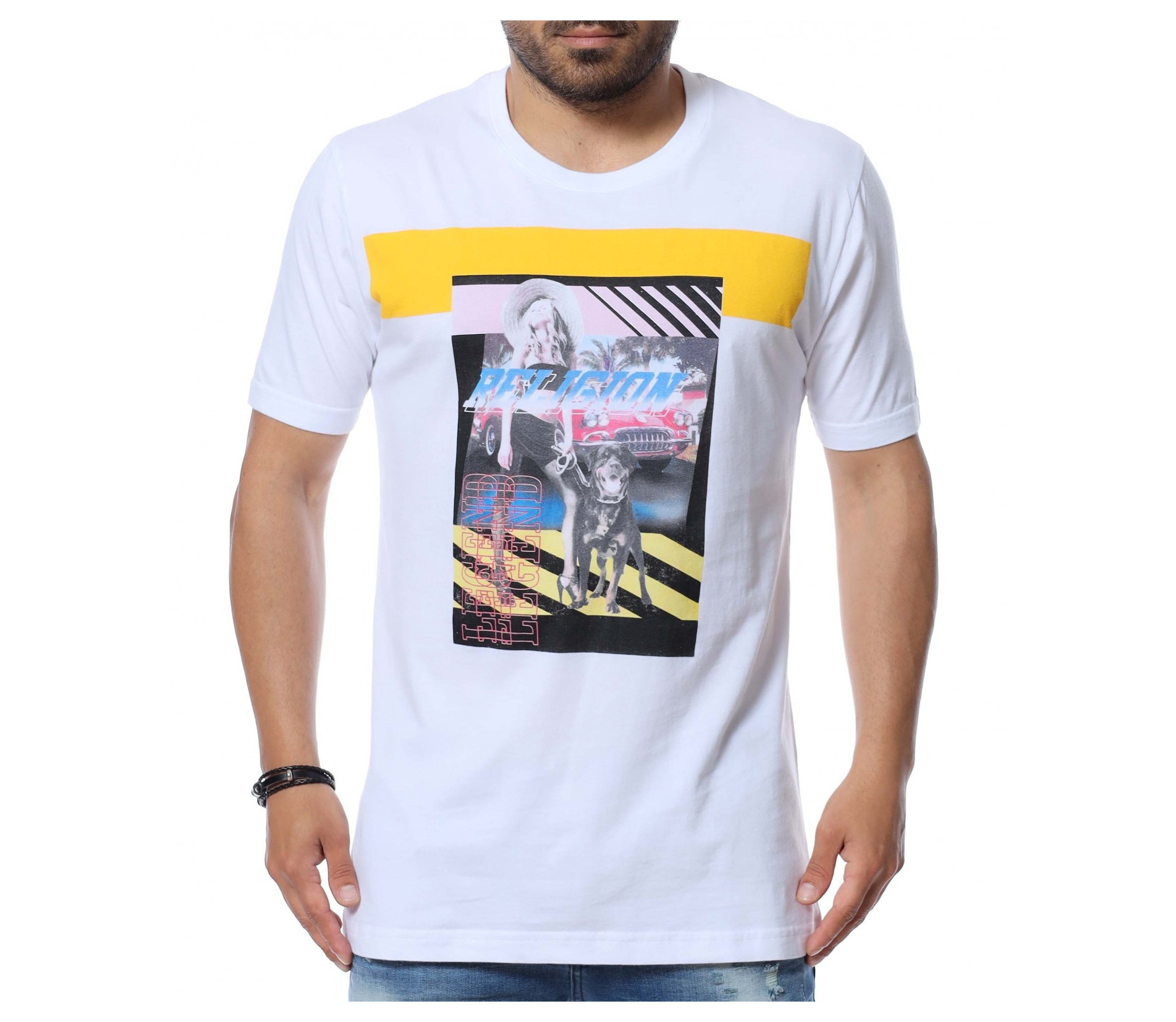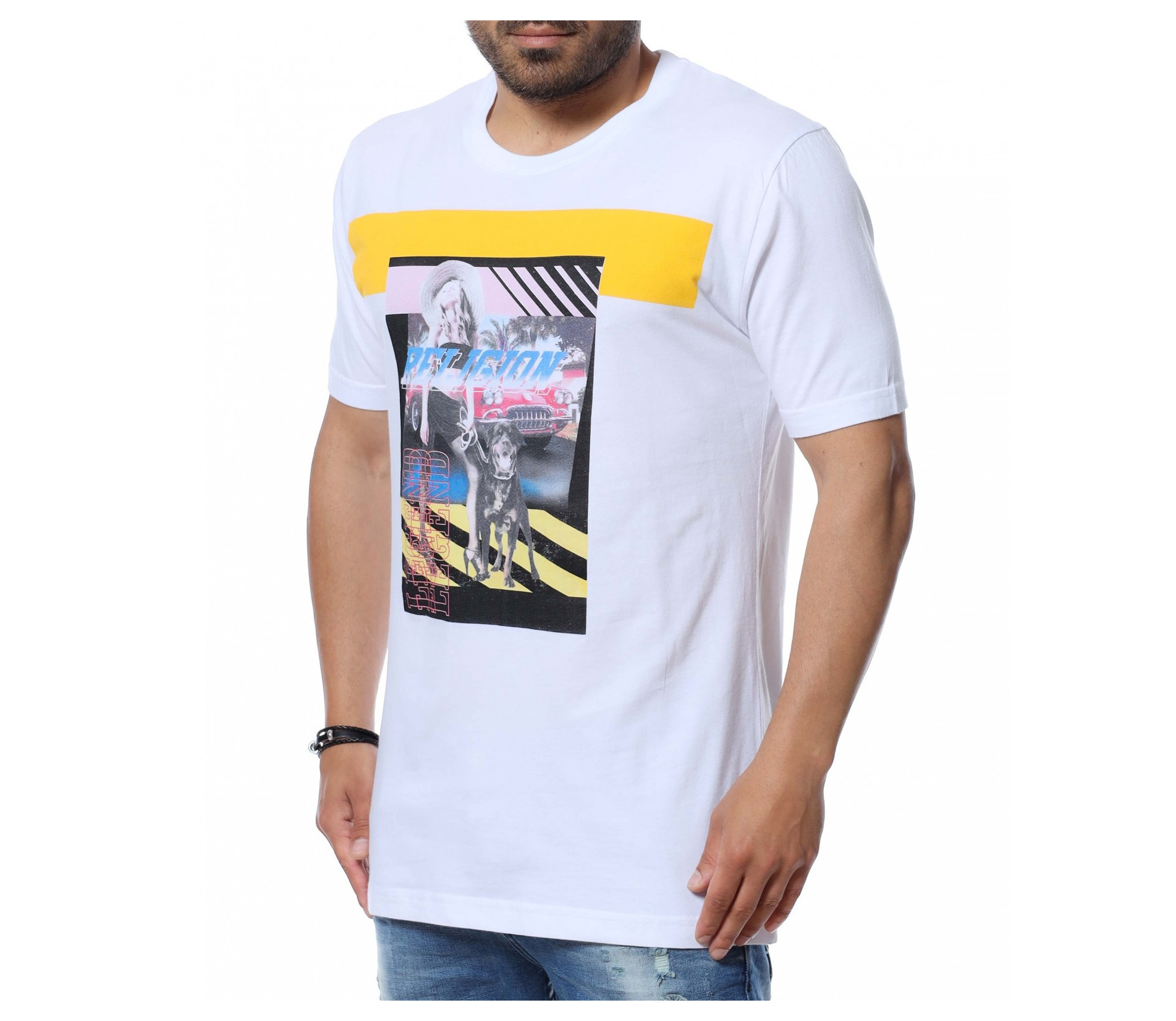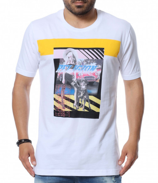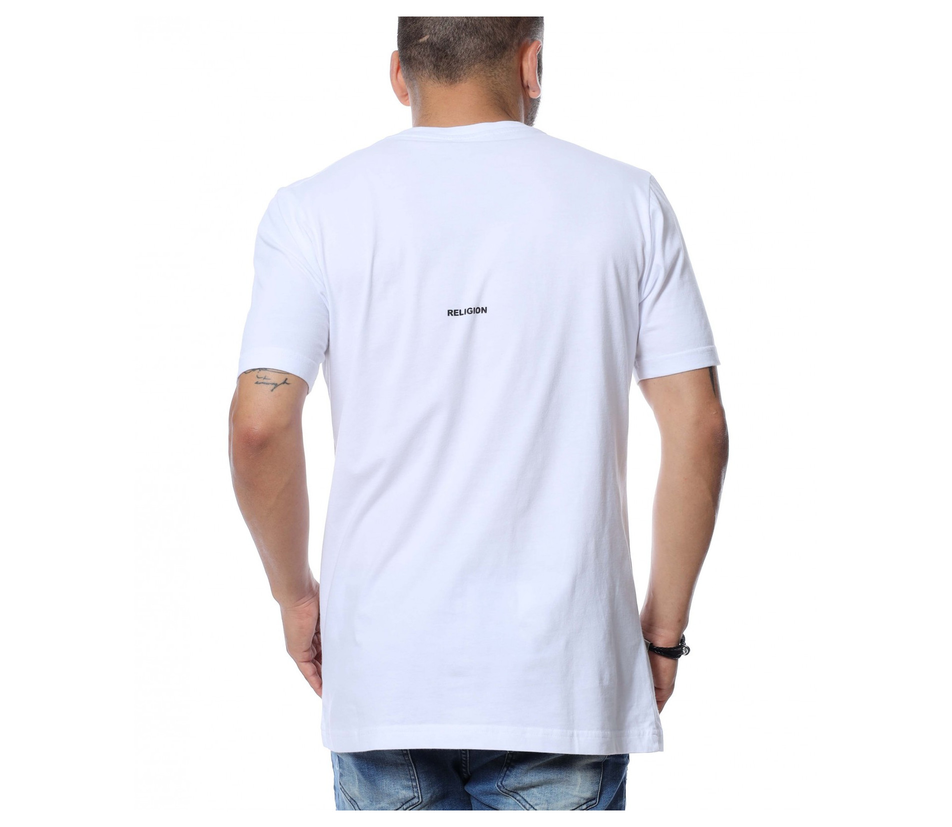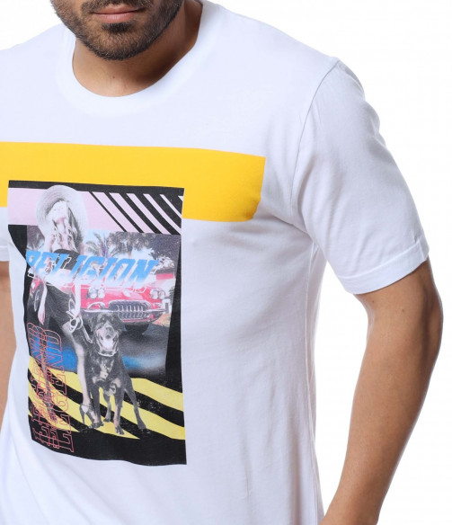 Мъжка блуза с къс ръкав и щампа. Основата на тениската е едноцветна, а в предната част е разположена апликация, под формата на изображение. На гърба е поставен дребен надпис като допълнителен детайл. Моделът е небрежно издължен, а кройката следва линиите на тялото. Изработена от мека, памучна материя. Комбинирайте с дънков панталон, кецове и любими аксесоари.
