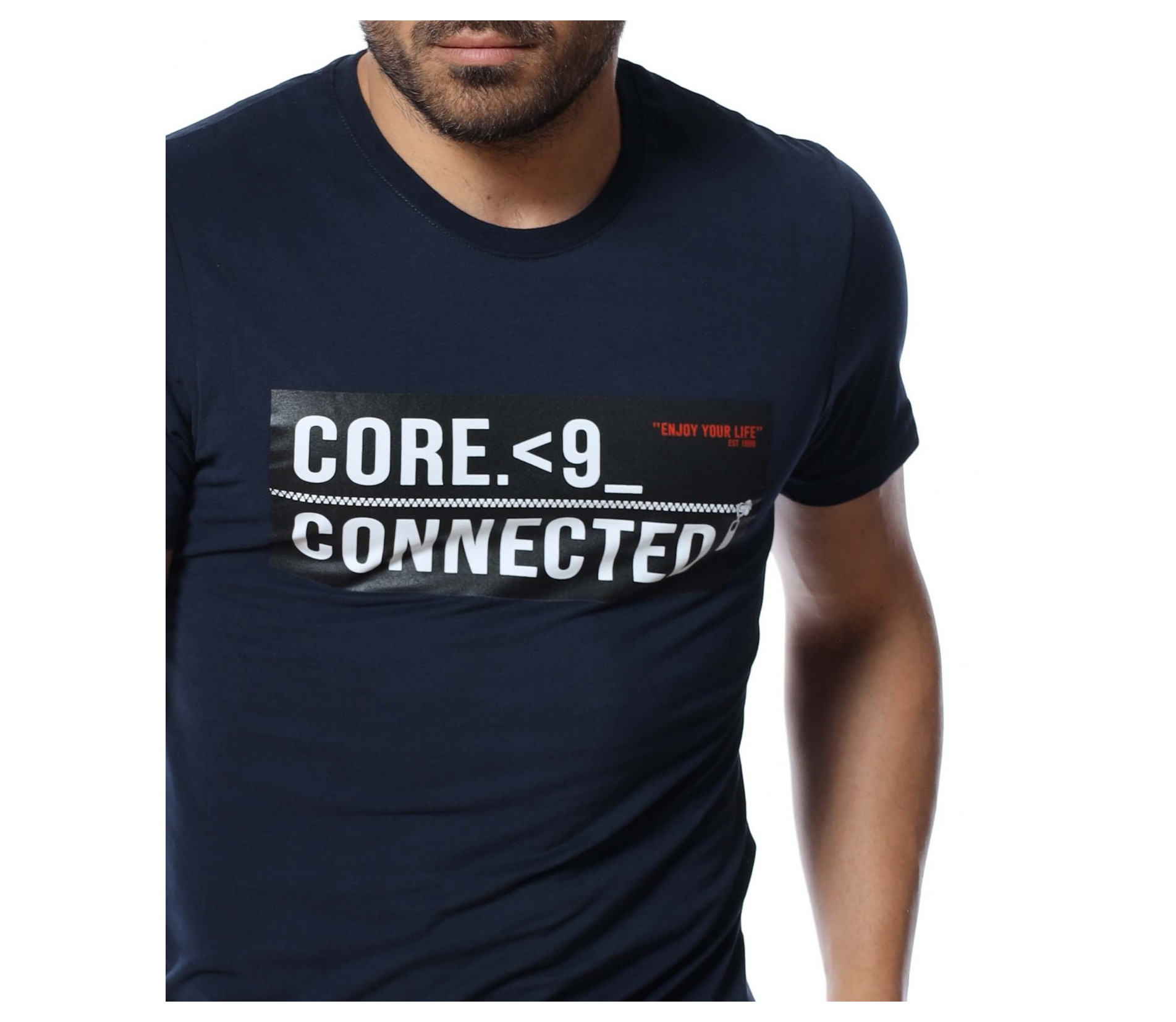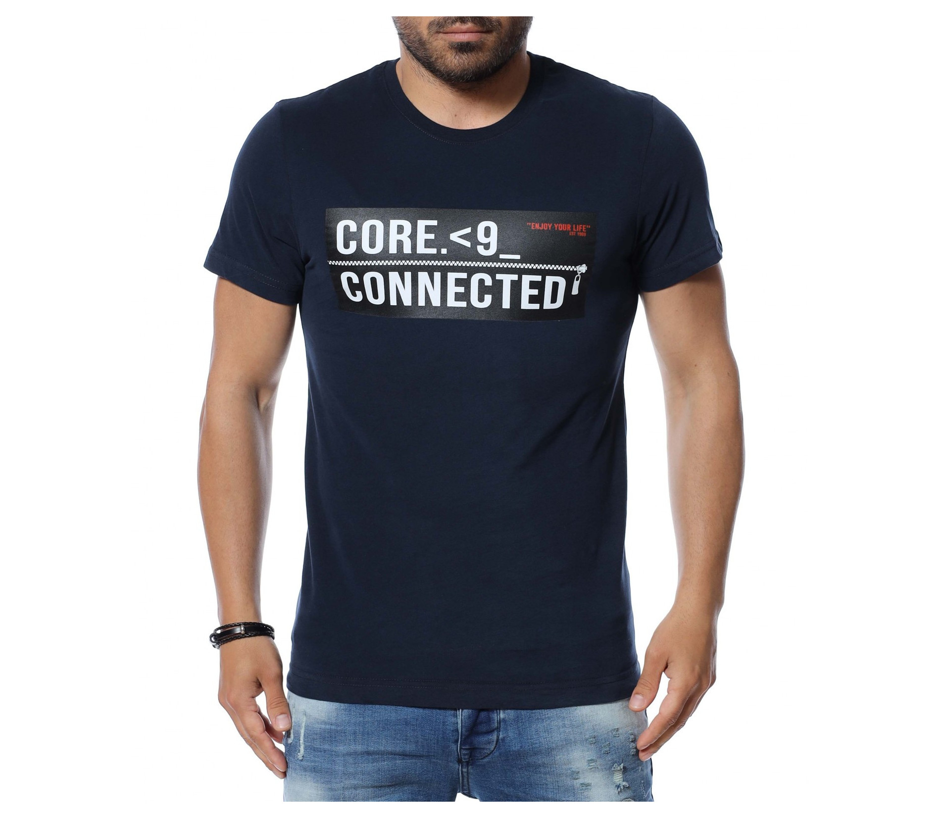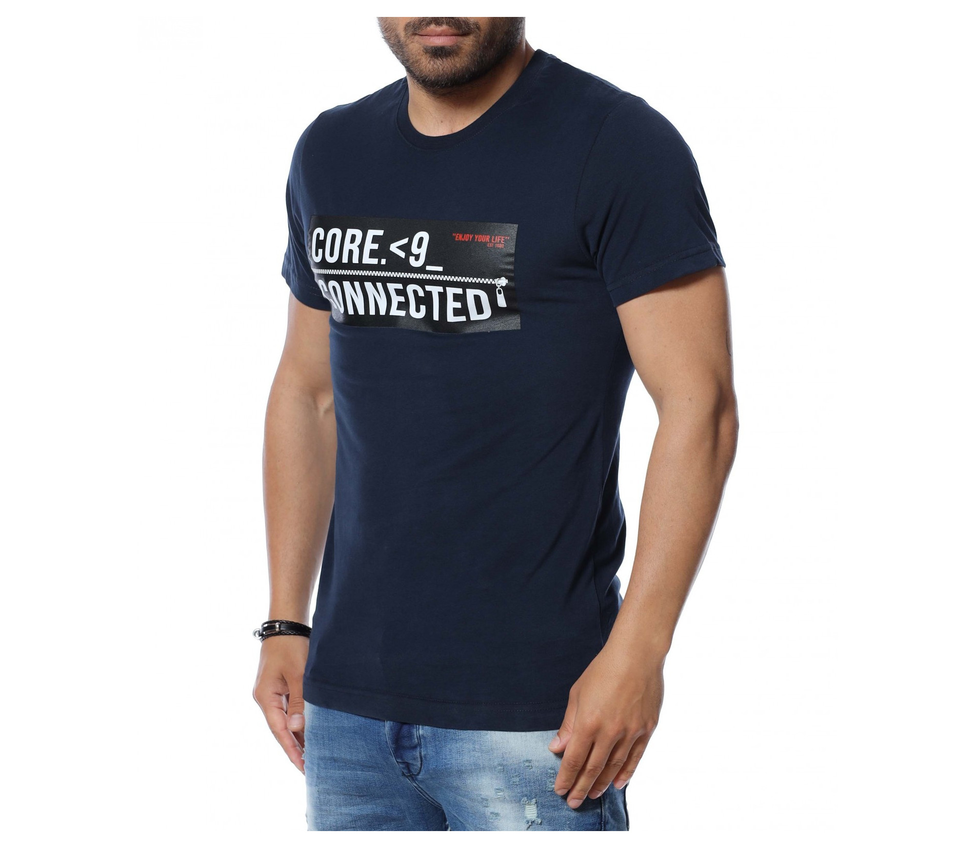 Мъжка блуза с къс ръкав и щампа. Основата на тениската е едноцветна, а в предната част по средата е позиционирана апликация с бели надписи върху черна основа. Дължината покрива колана. Кройката приляга на тялото. Изработена е от 100% мека, памучна материя. Комбинирайте с кецове, дънкови панталони и аксесоар.