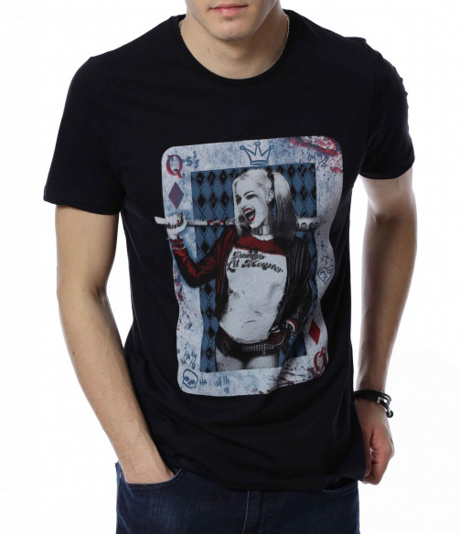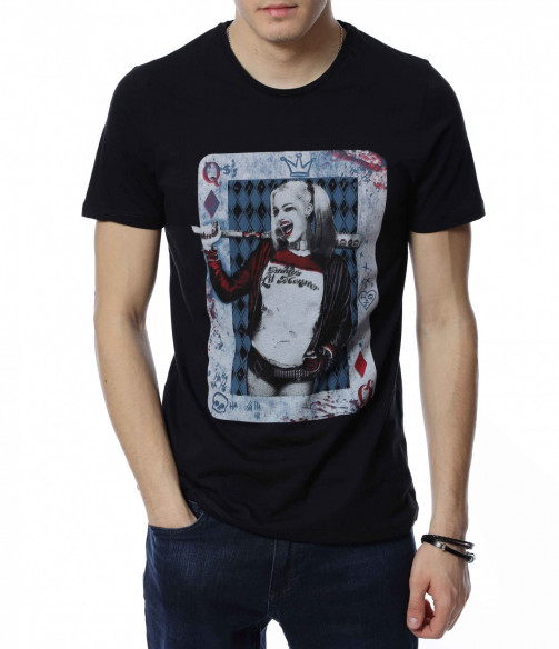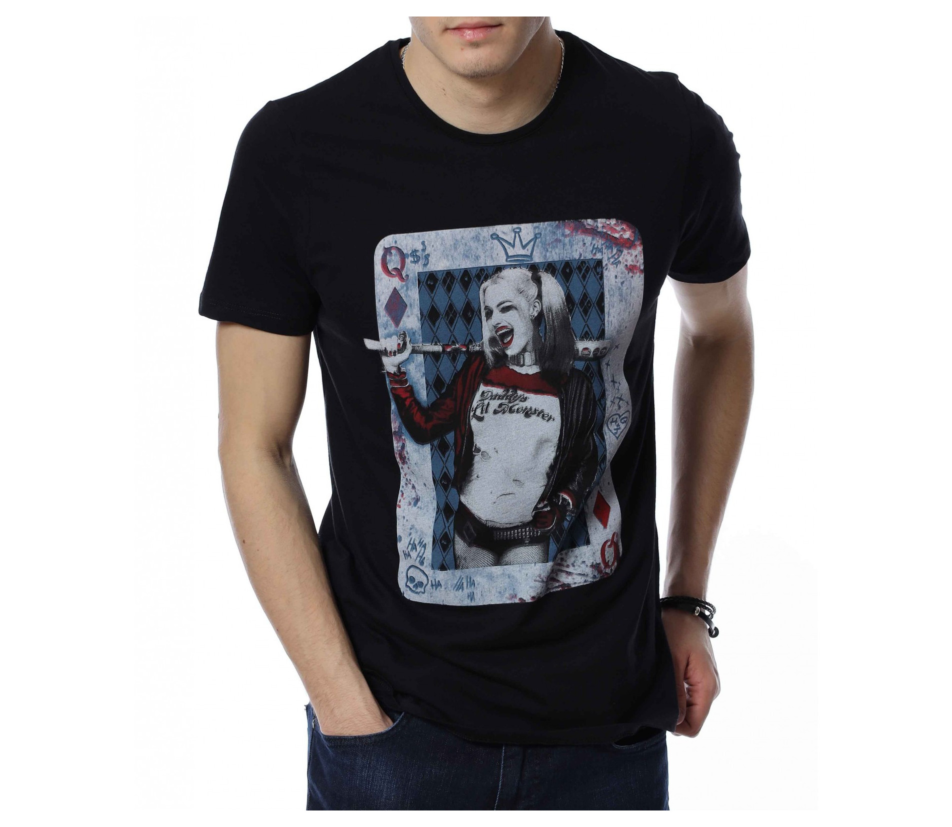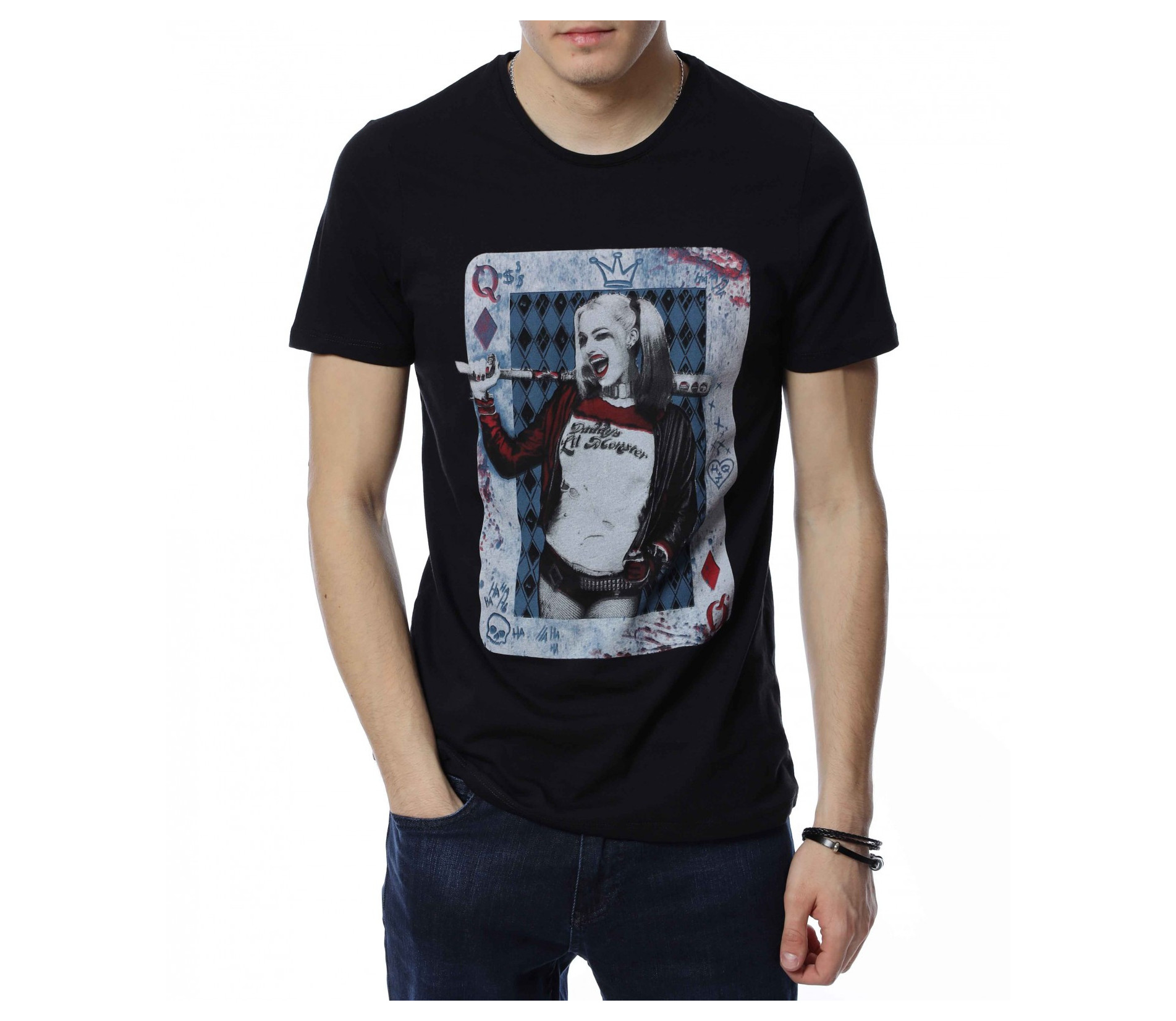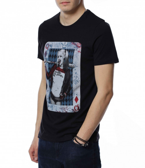 ОПИСАНИЕ НА ПРОДУКТА: Мъжка черна тениска с къс ръкав с актуална и различна щампа. Цялата лицева страна е заета от голяма щампа под формата на закачлива дама каро от тестето с карти. Атрактивна, но същевременно съдържаща много стил и елегантност, тази тениска е символ на ежедневния сет, смело подкрепена от изчистен гръб. Фланелката е с леко вталена и еластична кройка, перфектно пасваща на всяка мъжка фигура. Деколтето е с овална форма, стилно прибрано около врата. Тъмния и нюанс идеално се комбинира с дълги или къси панталони, удобни кецове и аксесоар по избор. Изгради своя собствен имидж, съгласуван с последните модни тенденции за сезона.