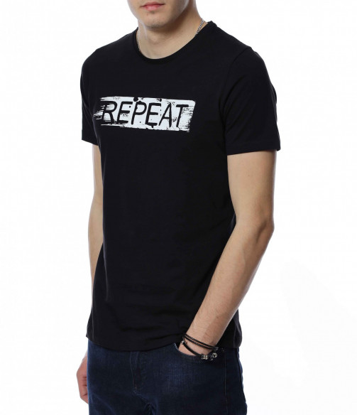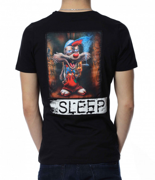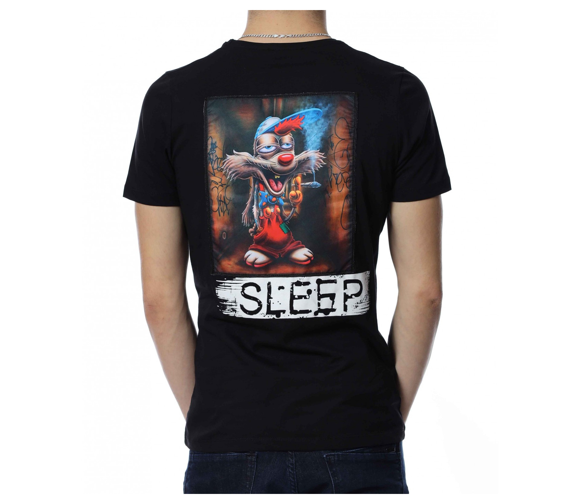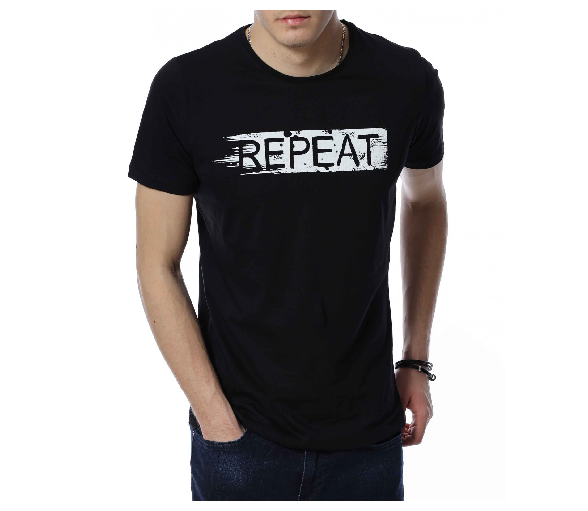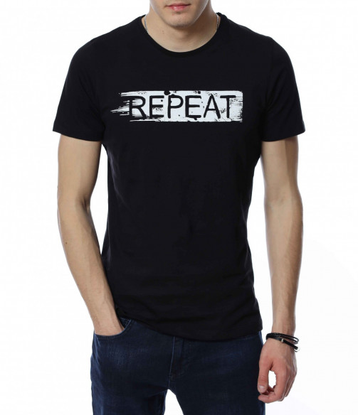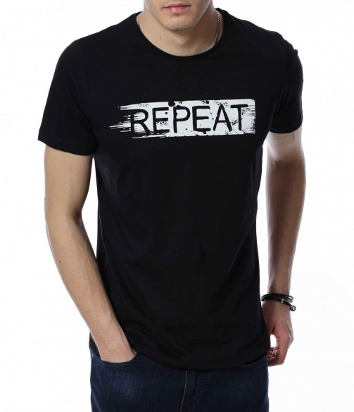 ОПИСАНИЕ НА ПРОДУКТА: Мъжка черна тениска с провокативна щампа. Представяме на вашето внимание уникален модел тишърт със закачливо послание. Цвета е традиционен, обхващащ черната гама. Първият раздвижващия елемент в дизайна е щампата, разположена върху лицевата страна на модела, а именно надпис REPEAT. Закачката в модела е запазена за гърба, където зашита голяма цветна апликация и надпис SLEEP. Кройката е леко вталена, създавайки непринуден мъжки образ. Заложи на ефектния стайлинг с провокираща погледите фланелка в класически аспект. Съчетай с дънки и кецове за един интересен външен вид.