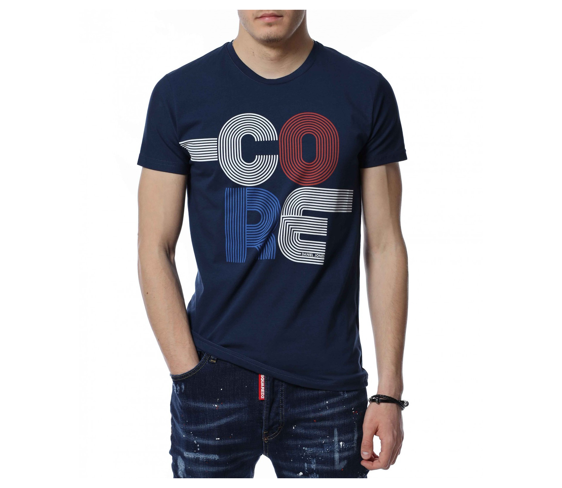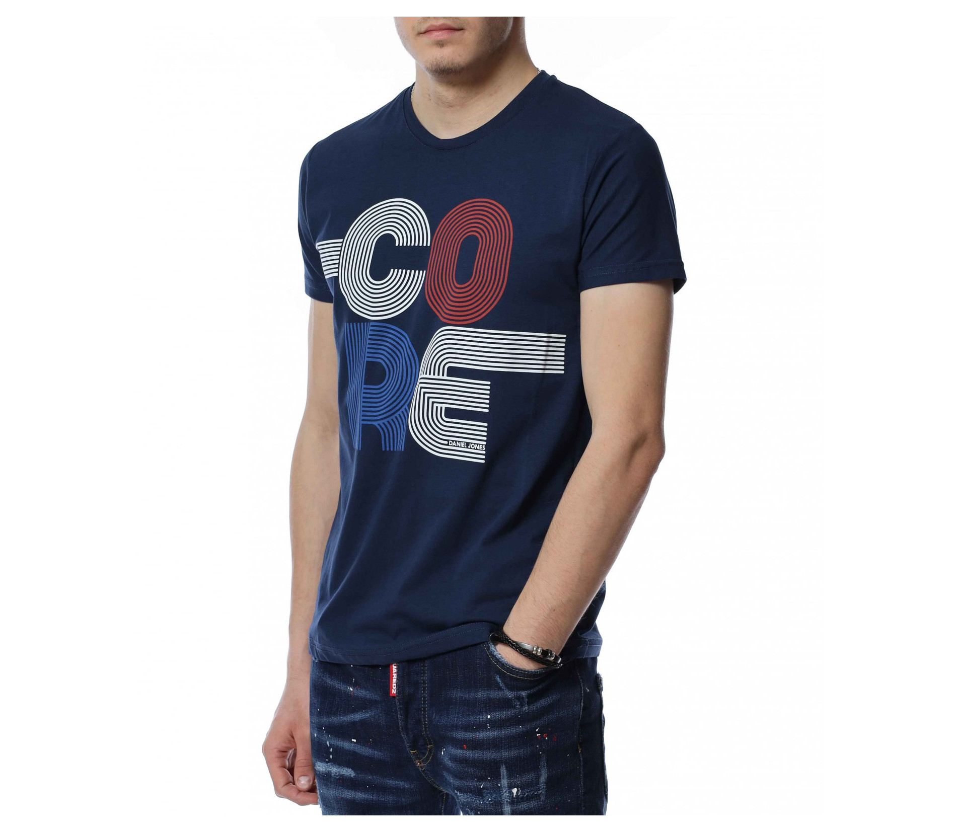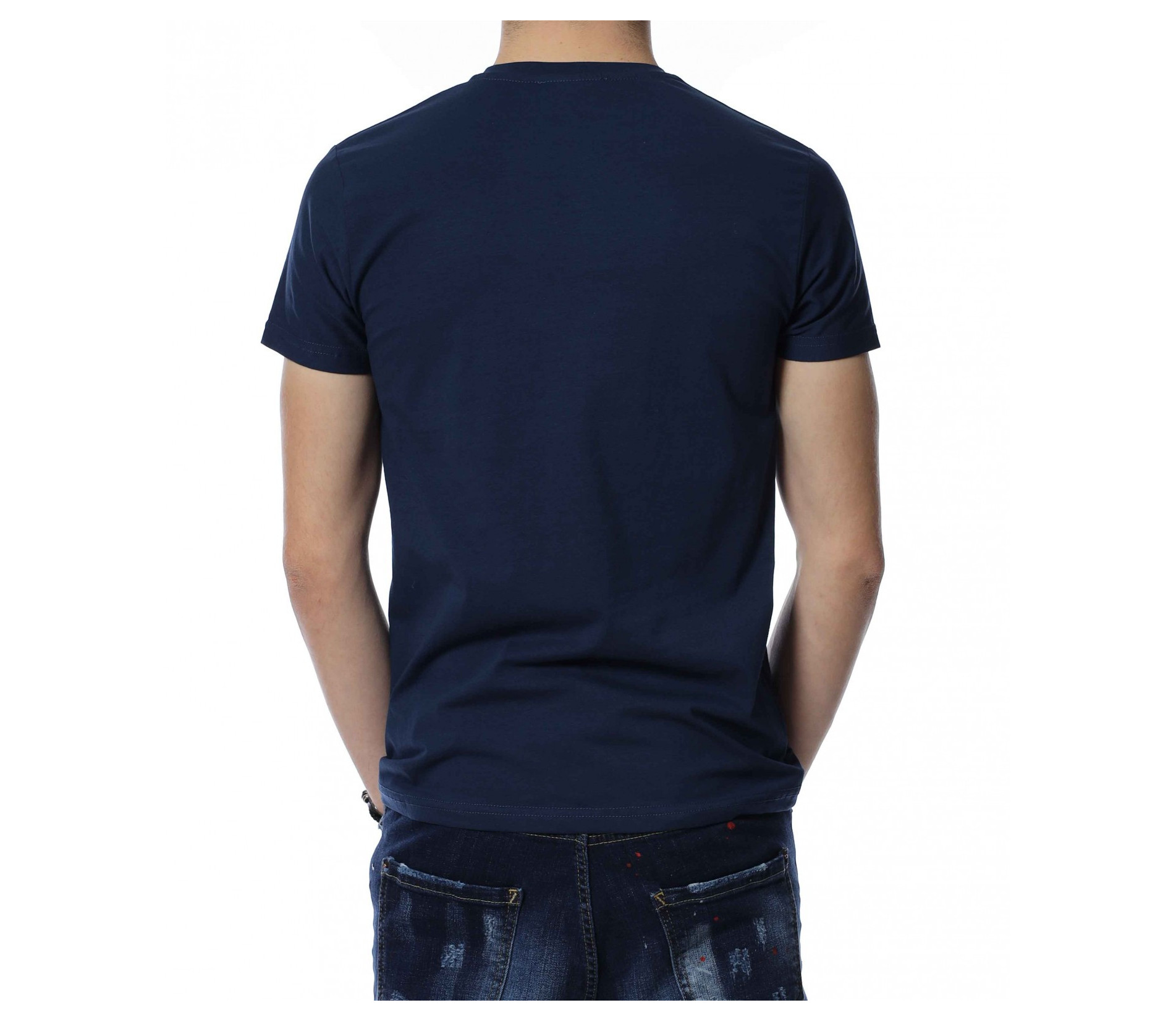 Памучна мъжка тениска, чиито дизайн е поверен изцяло на предизвикателството, облечено в комофрт. Външата част на фланелката представлява еднотонна основа, силно декорирана от едра щампа в централната предна част, излъччваща провокация и силен контраст. Макар и едра, декорацията е изпъстрена в семпли тонове, които придават още повече стил и баланс. Като финал и завършек на дизайна се явява леко вталената линия, допълнена от овално деколте, като цялата компилация е изработена от висок клас памучна материя. Бъете перфекционисти в избора на тениски, като започнете от цвета, избирайки между класическите.